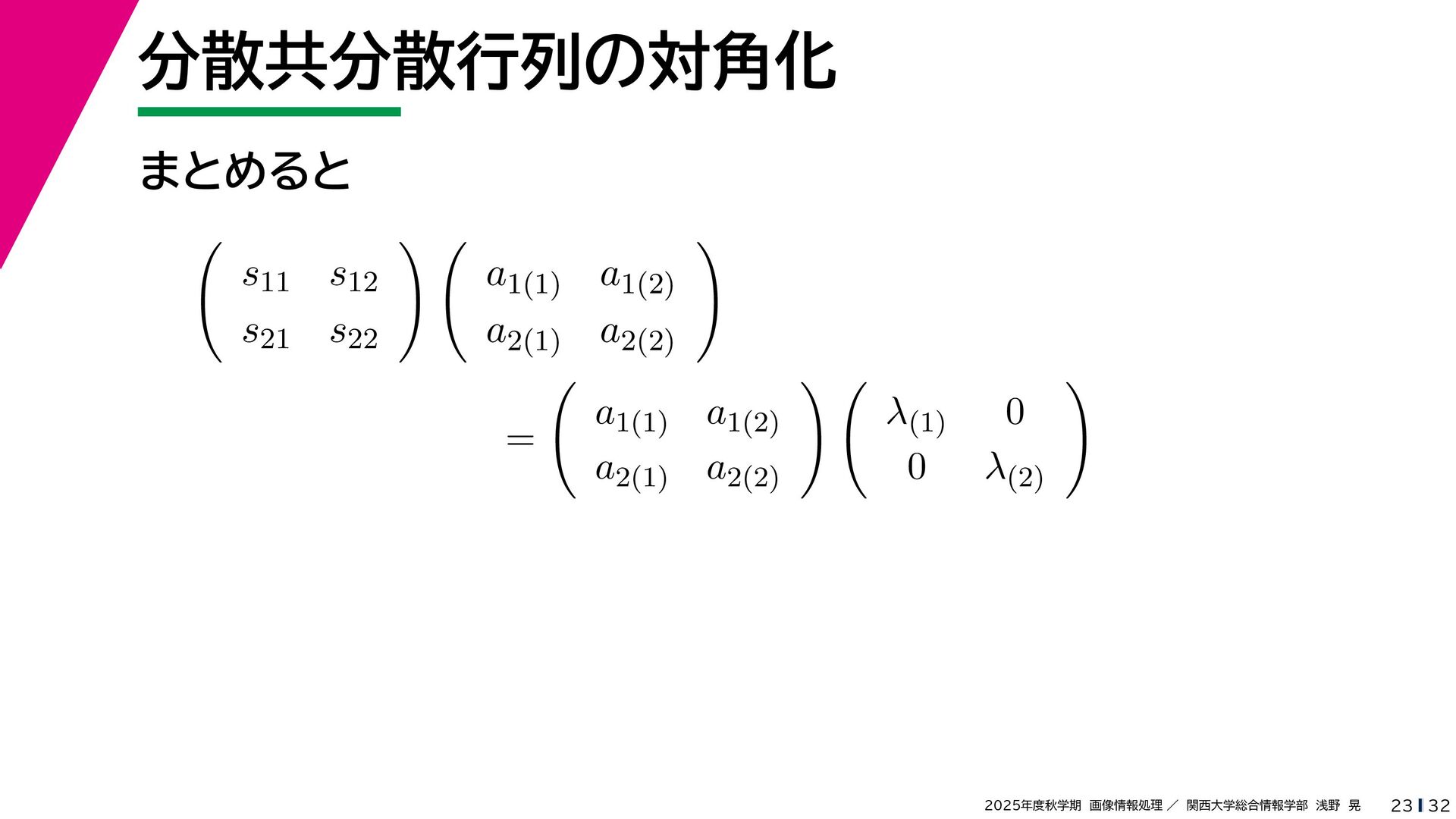 22. 32 2025年度秋学期 画像情報処理 / 関西大学総合情報学部 浅野 晃 分散共分散行列の対角化 23 まとめると つまり s11 s12 s21