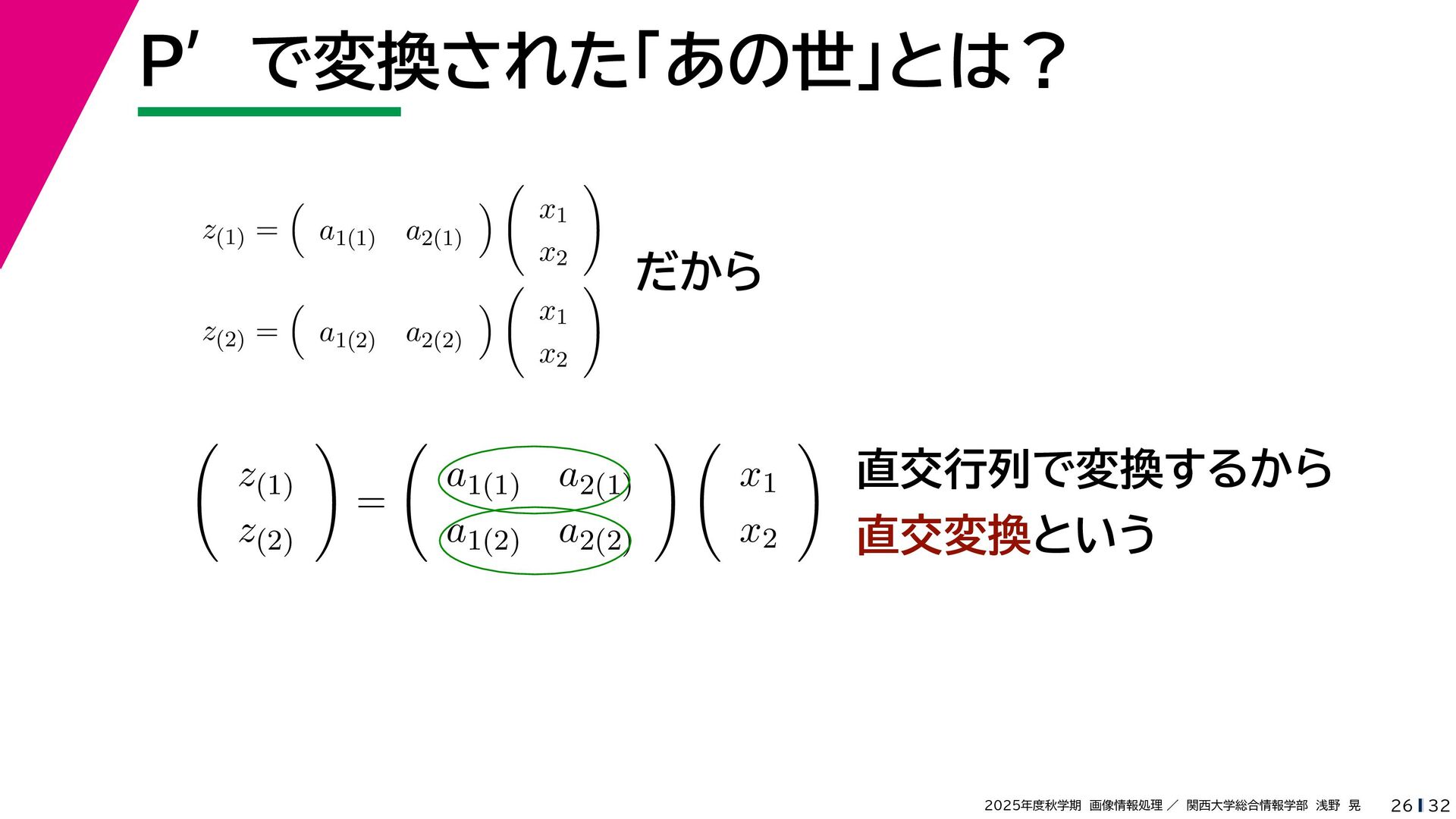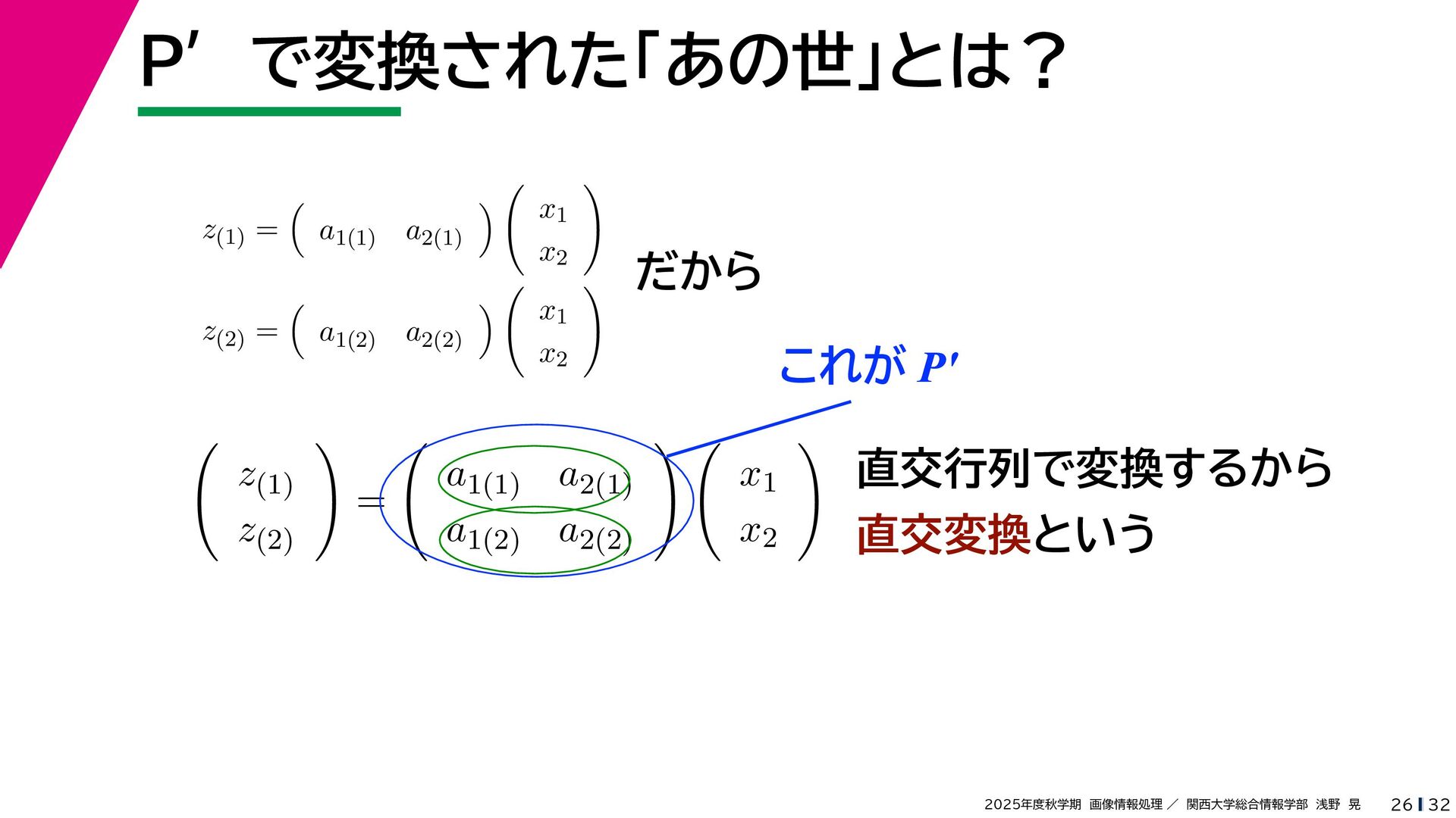 26. 32 2025年度秋学期 画像情報処理 / 関西大学総合情報学部 浅野 晃 P′で変換された「あの世」とは? 26 だから z(1) = a1(1) a2(1)