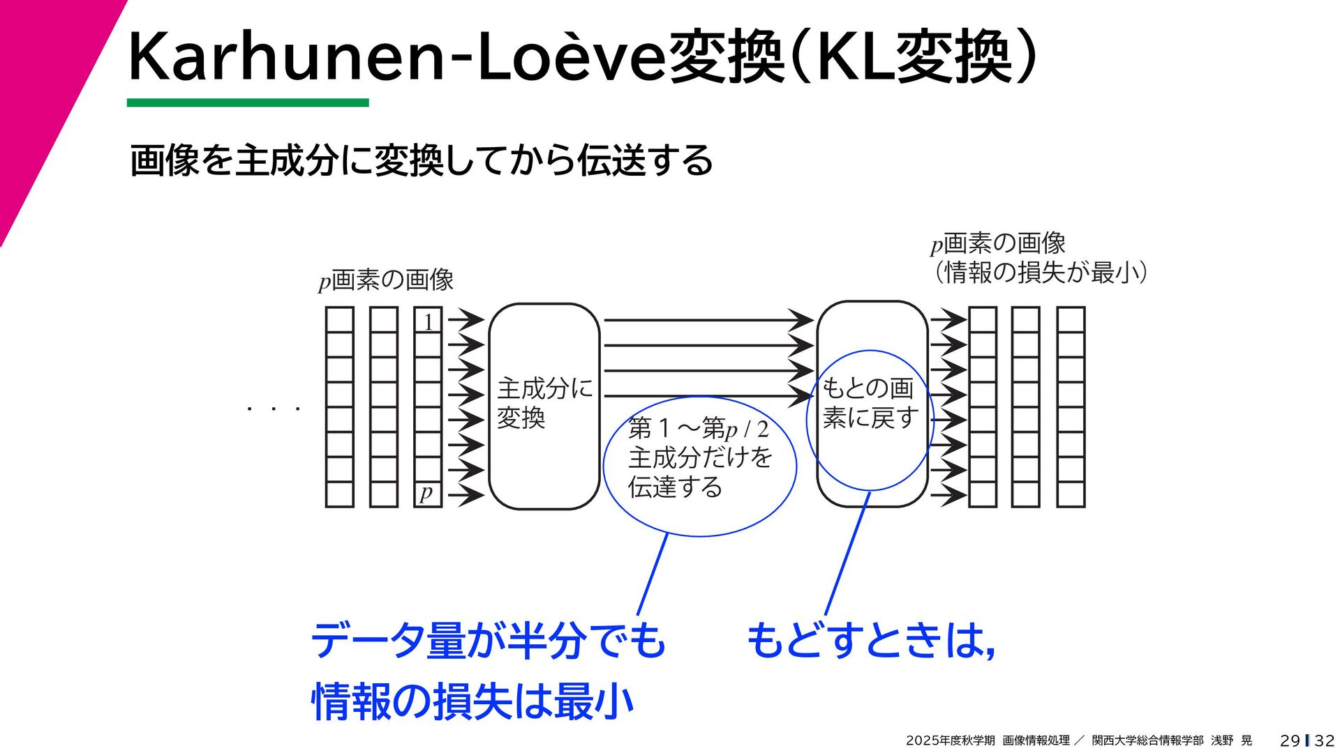 35. 32 2025年度秋学期 画像情報処理 / 関西大学総合情報学部 浅野 晃 Karhunen-Loève変換(KL変換) 29 画像を主成分に変換してから伝送する p画素の画像 1 p 第1~第p