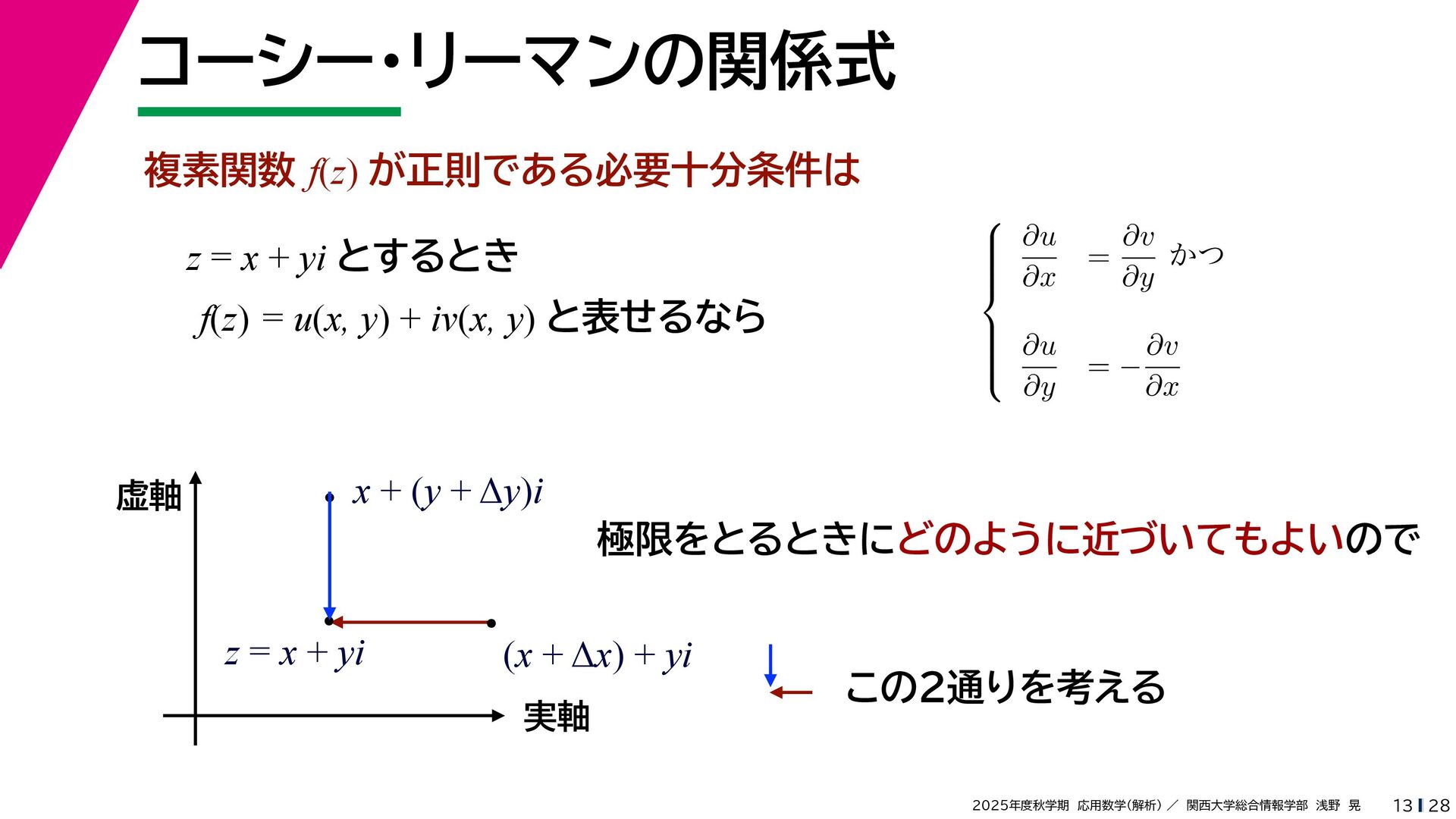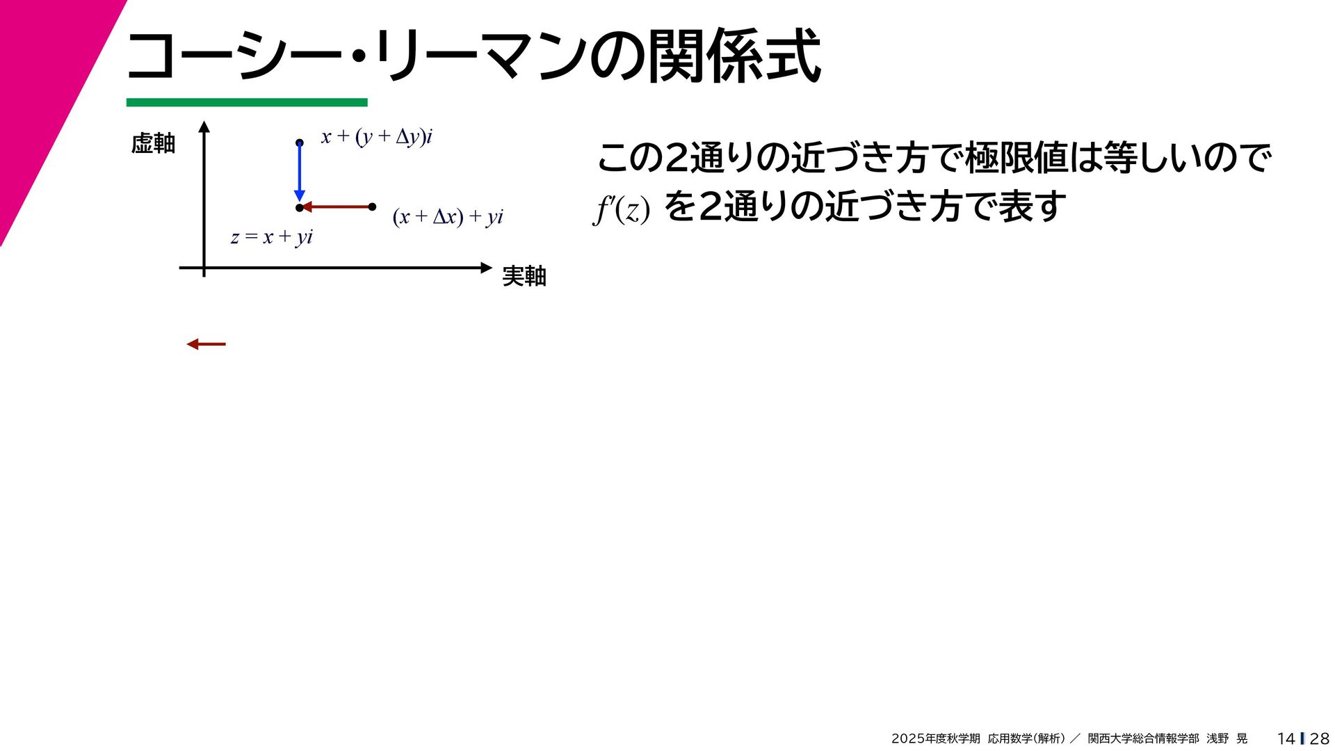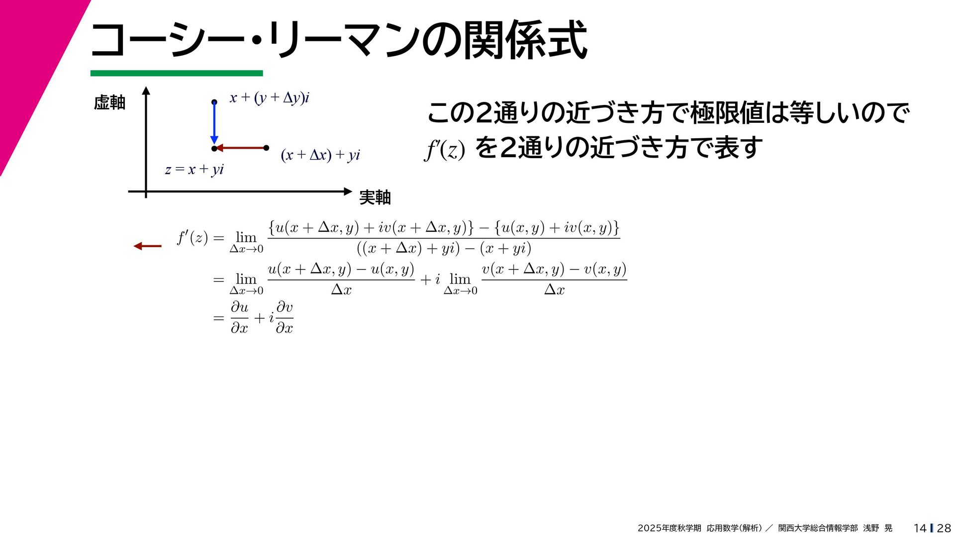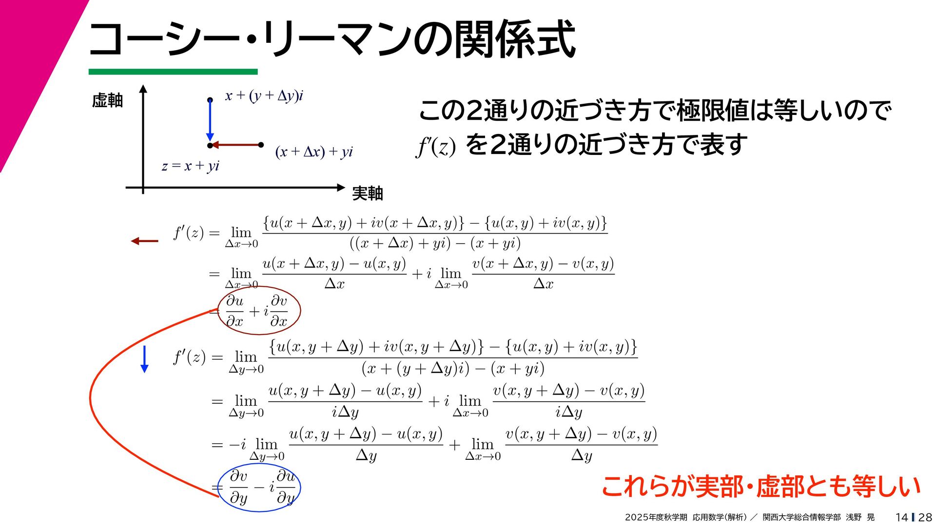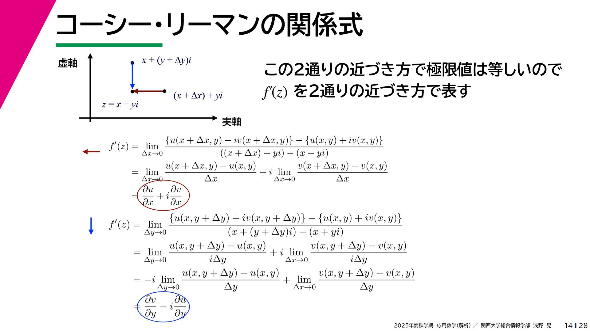 + yi (x + Δx) + yi x + (y + Δy)i この2通りの近づき方で極限値は等しいので を2通りの近づき方で表す f′ (z) f′(z) = lim ∆x→0 {u(x + ∆x, y) + iv(x + ∆x, y)} − {u(x, y) + iv(x, y)} ((x + ∆x) + yi) − (x + yi) = lim ∆x→0 u(x + ∆x, y) − u(x, y) ∆x + i lim ∆x→0 v(x + ∆x, y) − v(x, y) ∆x = ∂u ∂x + i ∂v ∂x f′(z) = lim ∆y→0 {u(x, y + ∆y) + iv(x, y + ∆y)} − {u(x, y) + iv(x, y)} (x + (y + ∆y)i) − (x + yi) = lim ∆y→0 u(x, y + ∆y) − u(x, y) i∆y + i lim ∆x→0 v(x, y + ∆y) − v(x, y) i∆y = −i lim ∆y→0 u(x, y + ∆y) − u(x, y) ∆y + lim ∆x→0 v(x, y + ∆y) − v(x, y) ∆y = ∂v ∂y − i ∂u ∂y これらが実部・虚部とも等しい