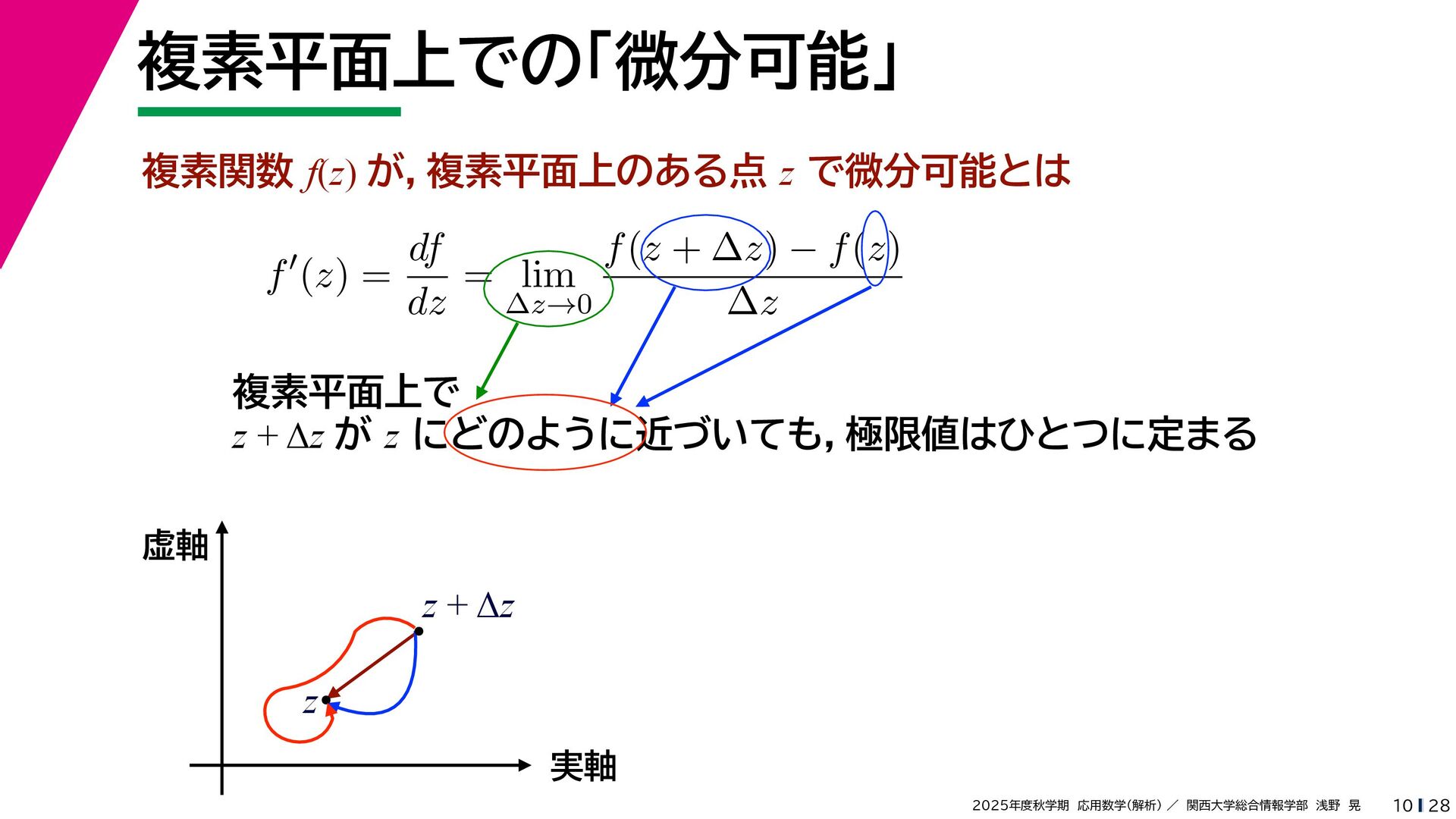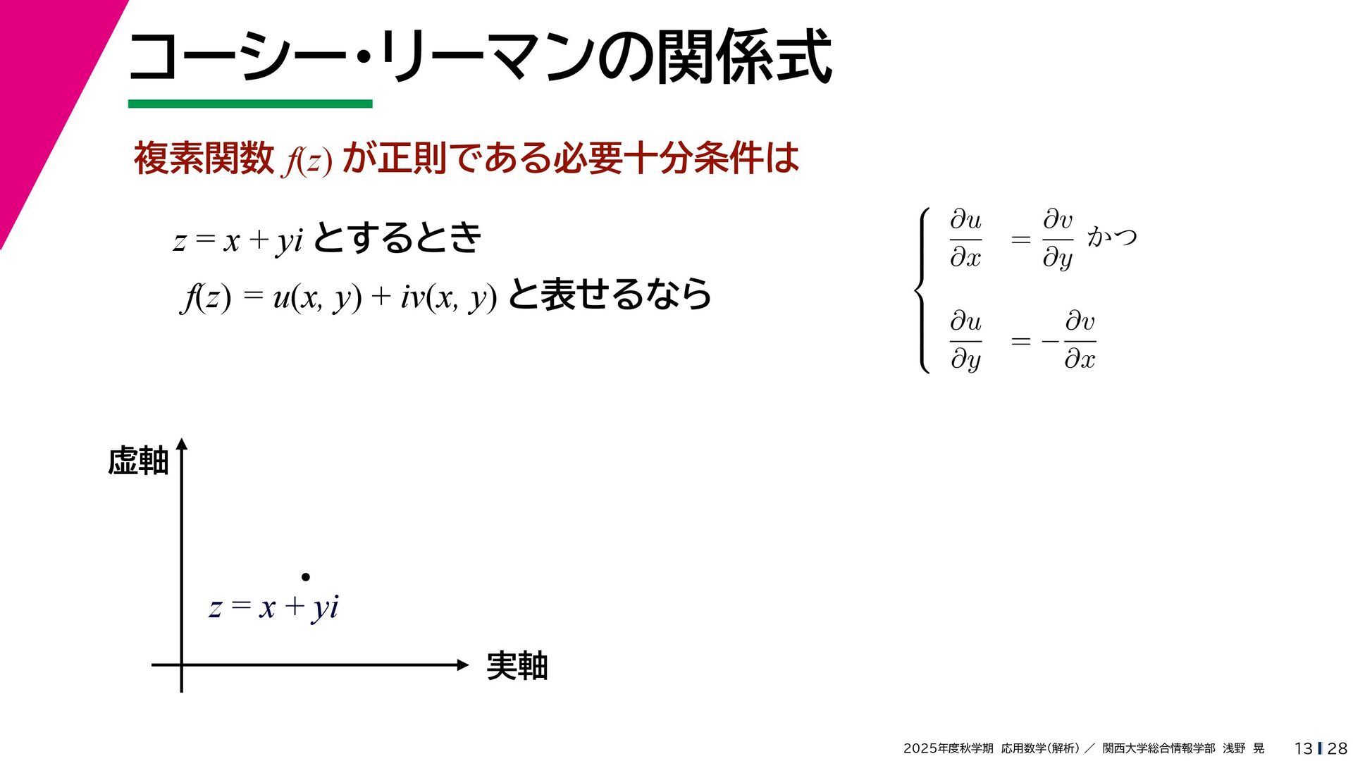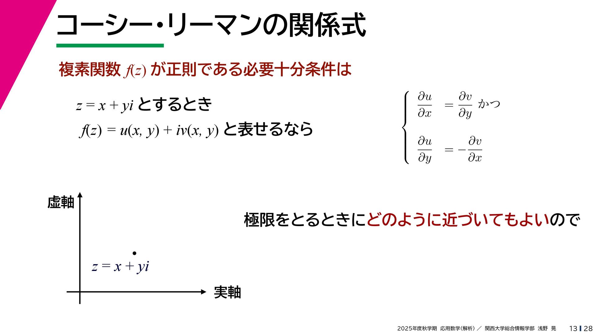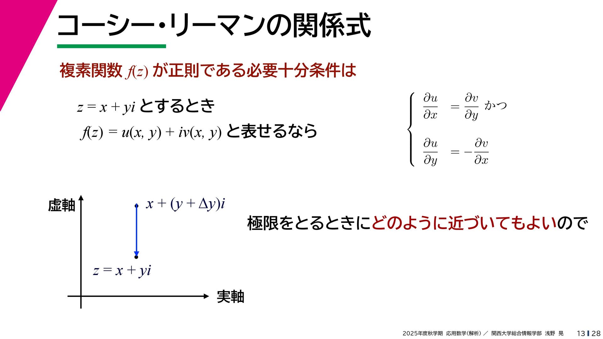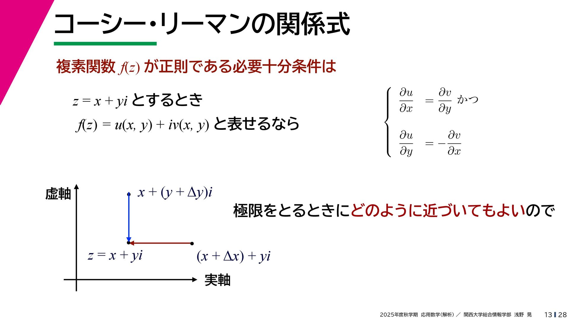 + yi (x + Δx) + yi x + (y + Δy)i この2通りの近づき方で極限値は等しいので を2通りの近づき方で表す f′ (z) f′(z) = lim ∆x→0 {u(x + ∆x, y) + iv(x + ∆x, y)} − {u(x, y) + iv(x, y)} ((x + ∆x) + yi) − (x + yi) = lim ∆x→0 u(x + ∆x, y) − u(x, y) ∆x + i lim ∆x→0 v(x + ∆x, y) − v(x, y) ∆x = ∂u ∂x + i ∂v ∂x f′(z) = lim ∆y→0 {u(x, y + ∆y) + iv(x, y + ∆y)} − {u(x, y) + iv(x, y)} (x + (y + ∆y)i) − (x + yi) = lim ∆y→0 u(x, y + ∆y) − u(x, y) i∆y + i lim ∆x→0 v(x, y + ∆y) − v(x, y) i∆y = −i lim ∆y→0 u(x, y + ∆y) − u(x, y) ∆y + lim ∆x→0 v(x, y + ∆y) − v(x, y) ∆y = ∂v ∂y − i ∂u ∂y これらが実部・虚部とも等しい