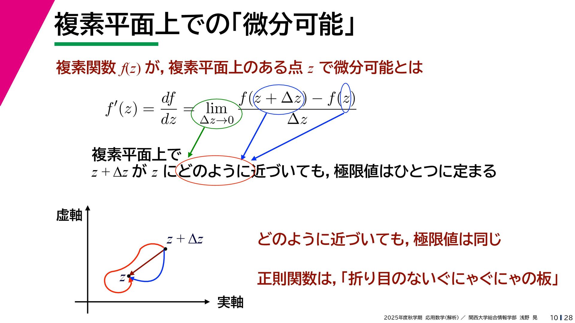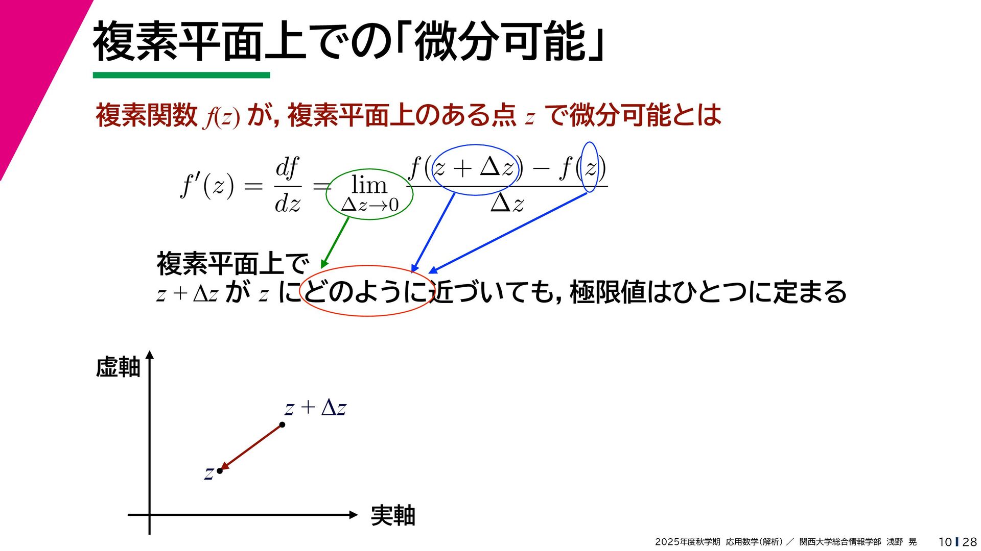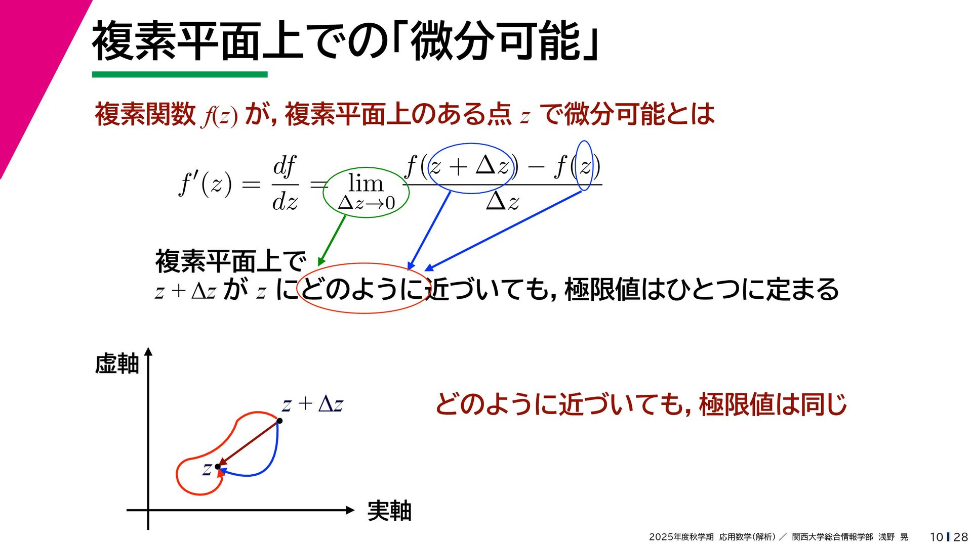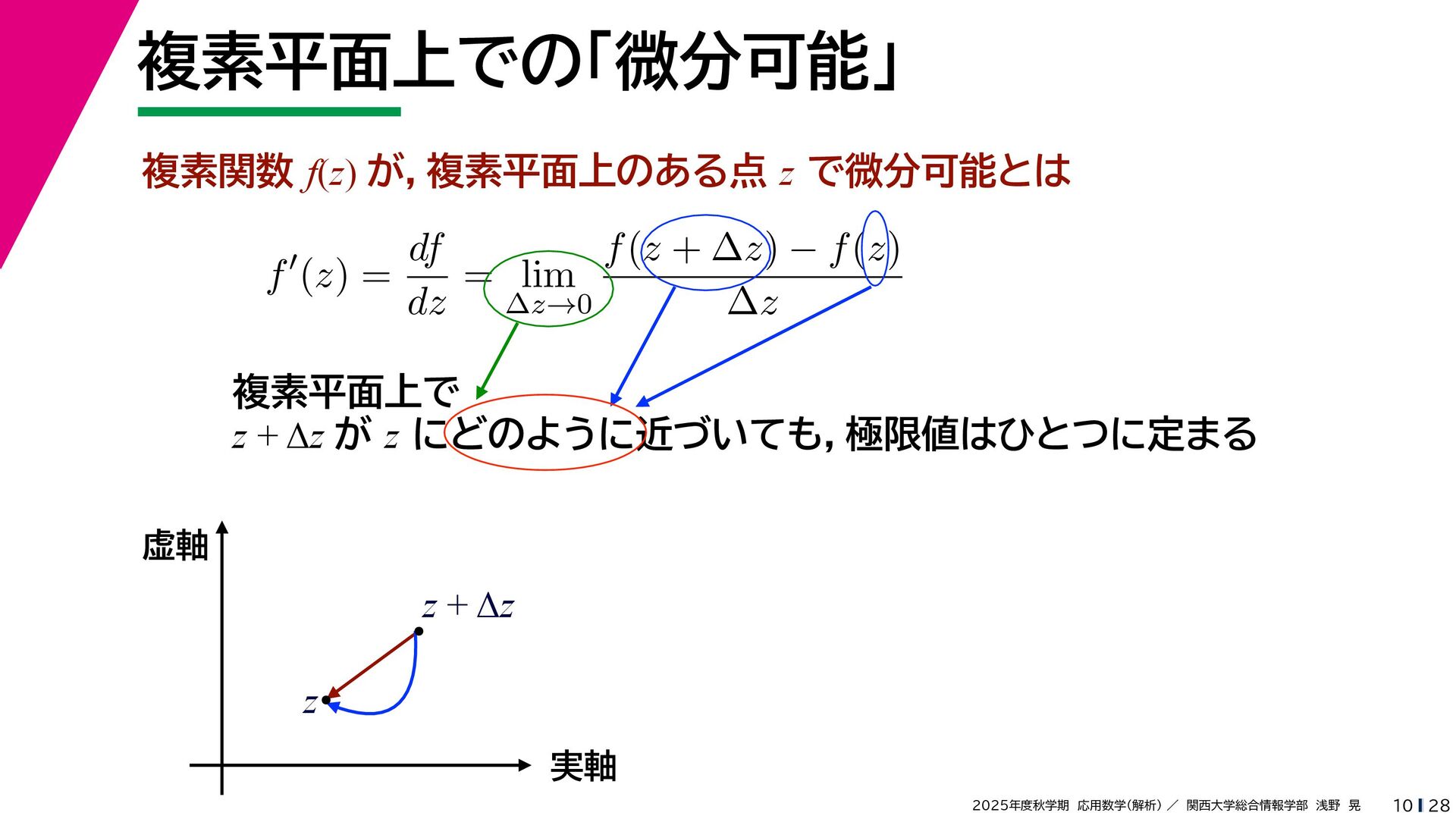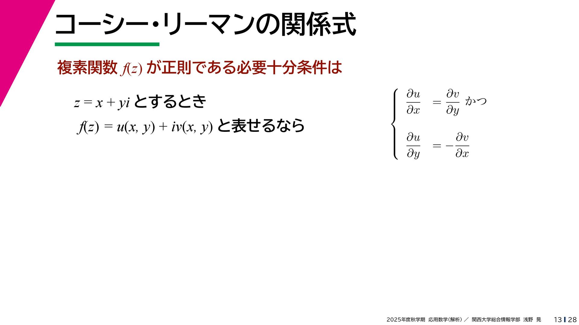 + yi (x + Δx) + yi x + (y + Δy)i この2通りの近づき方で極限値は等しいので を2通りの近づき方で表す f′ (z) f′(z) = lim ∆x→0 {u(x + ∆x, y) + iv(x + ∆x, y)} − {u(x, y) + iv(x, y)} ((x + ∆x) + yi) − (x + yi) = lim ∆x→0 u(x + ∆x, y) − u(x, y) ∆x + i lim ∆x→0 v(x + ∆x, y) − v(x, y) ∆x = ∂u ∂x + i ∂v ∂x f′(z) = lim ∆y→0 {u(x, y + ∆y) + iv(x, y + ∆y)} − {u(x, y) + iv(x, y)} (x + (y + ∆y)i) − (x + yi) = lim ∆y→0 u(x, y + ∆y) − u(x, y) i∆y + i lim ∆x→0 v(x, y + ∆y) − v(x, y) i∆y = −i lim ∆y→0 u(x, y + ∆y) − u(x, y) ∆y + lim ∆x→0 v(x, y + ∆y) − v(x, y) ∆y = ∂v ∂y − i ∂u ∂y これらが実部・虚部とも等しい