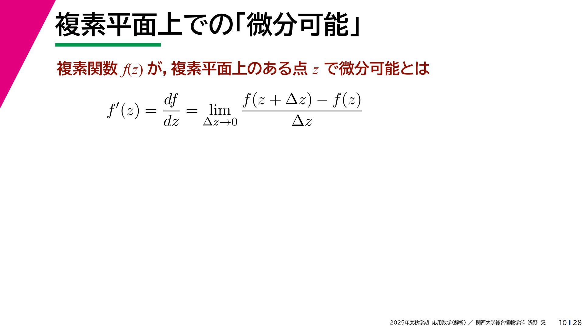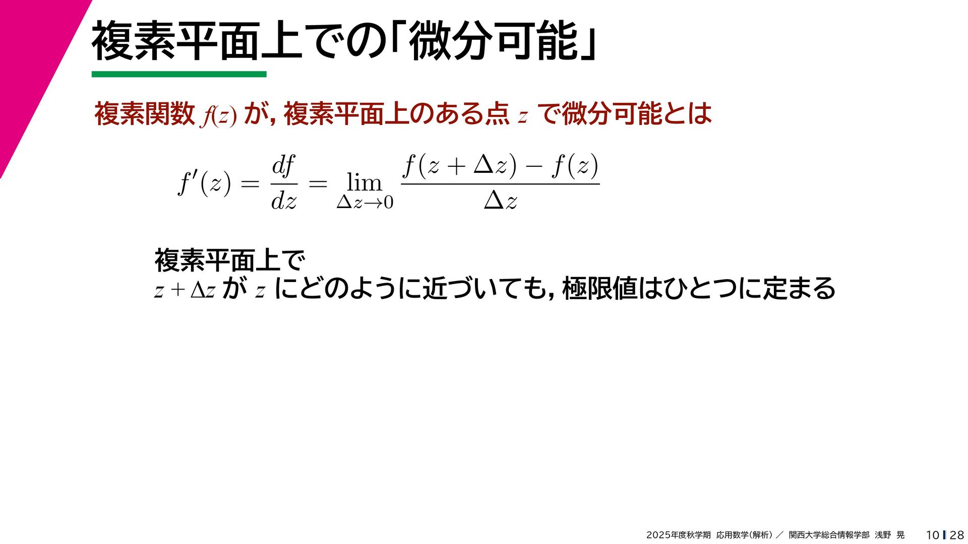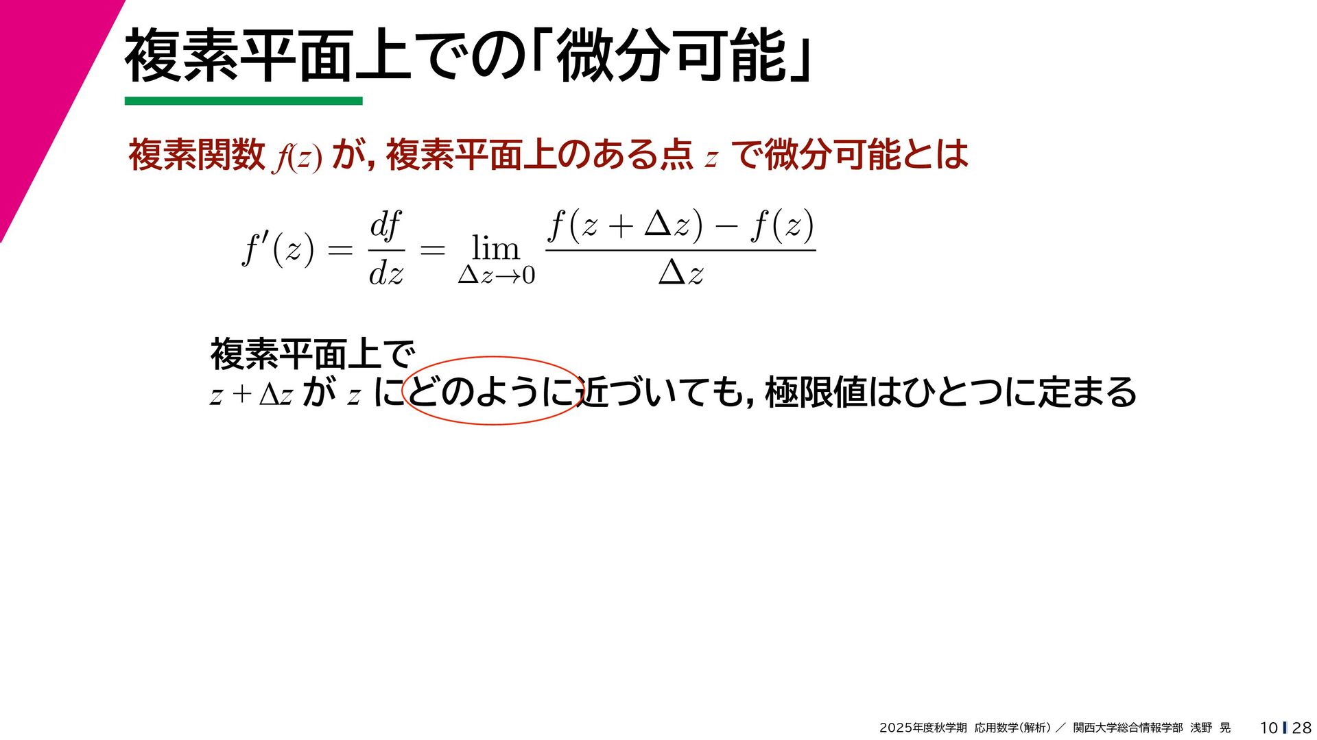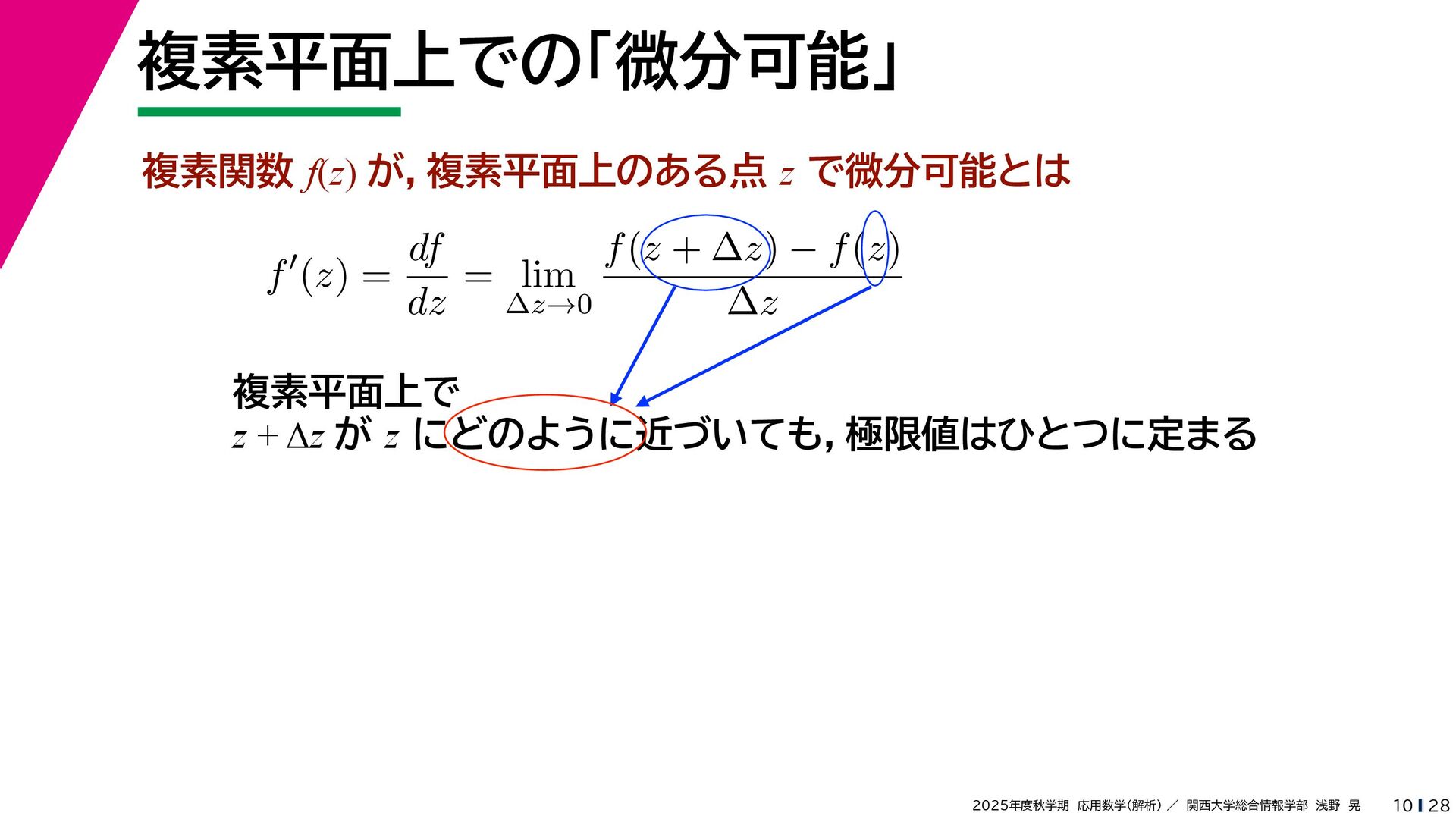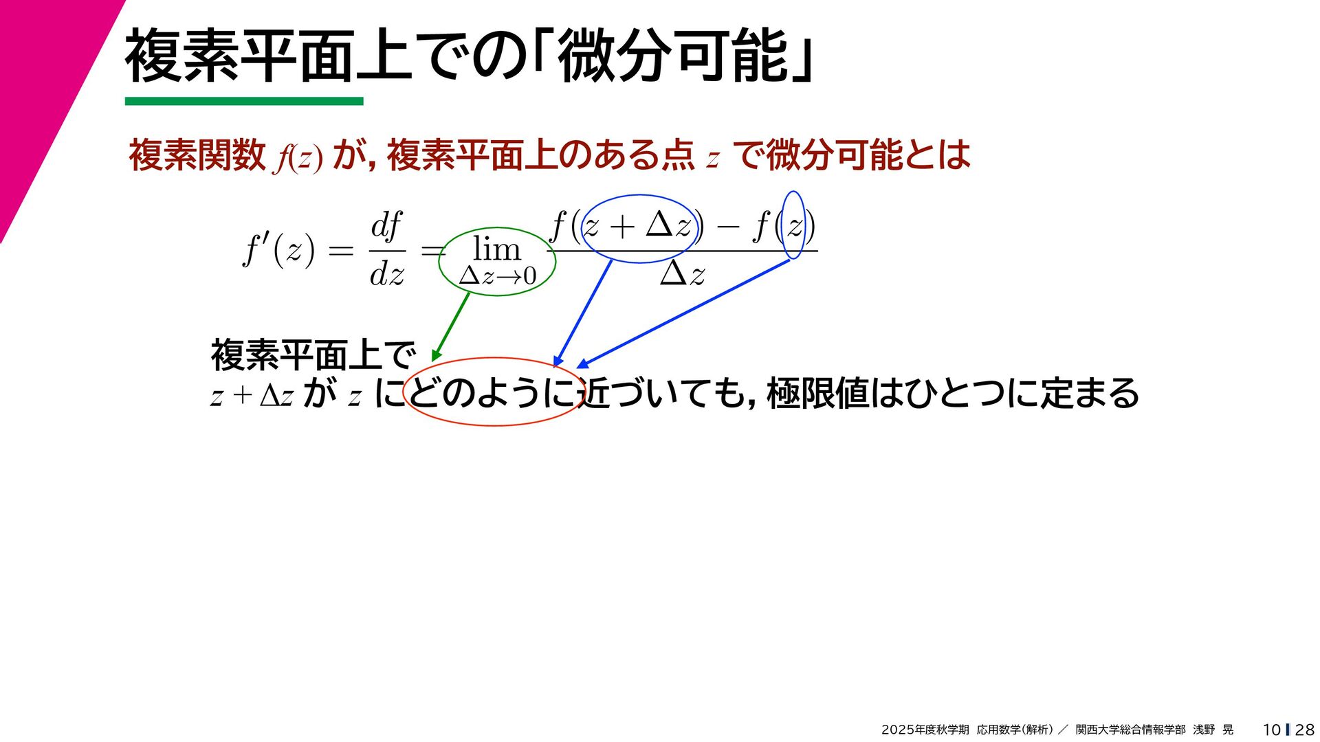 + yi (x + Δx) + yi x + (y + Δy)i この2通りの近づき方で極限値は等しいので を2通りの近づき方で表す f′ (z) f′(z) = lim ∆x→0 {u(x + ∆x, y) + iv(x + ∆x, y)} − {u(x, y) + iv(x, y)} ((x + ∆x) + yi) − (x + yi) = lim ∆x→0 u(x + ∆x, y) − u(x, y) ∆x + i lim ∆x→0 v(x + ∆x, y) − v(x, y) ∆x = ∂u ∂x + i ∂v ∂x f′(z) = lim ∆y→0 {u(x, y + ∆y) + iv(x, y + ∆y)} − {u(x, y) + iv(x, y)} (x + (y + ∆y)i) − (x + yi) = lim ∆y→0 u(x, y + ∆y) − u(x, y) i∆y + i lim ∆x→0 v(x, y + ∆y) − v(x, y) i∆y = −i lim ∆y→0 u(x, y + ∆y) − u(x, y) ∆y + lim ∆x→0 v(x, y + ∆y) − v(x, y) ∆y = ∂v ∂y − i ∂u ∂y これらが実部・虚部とも等しい