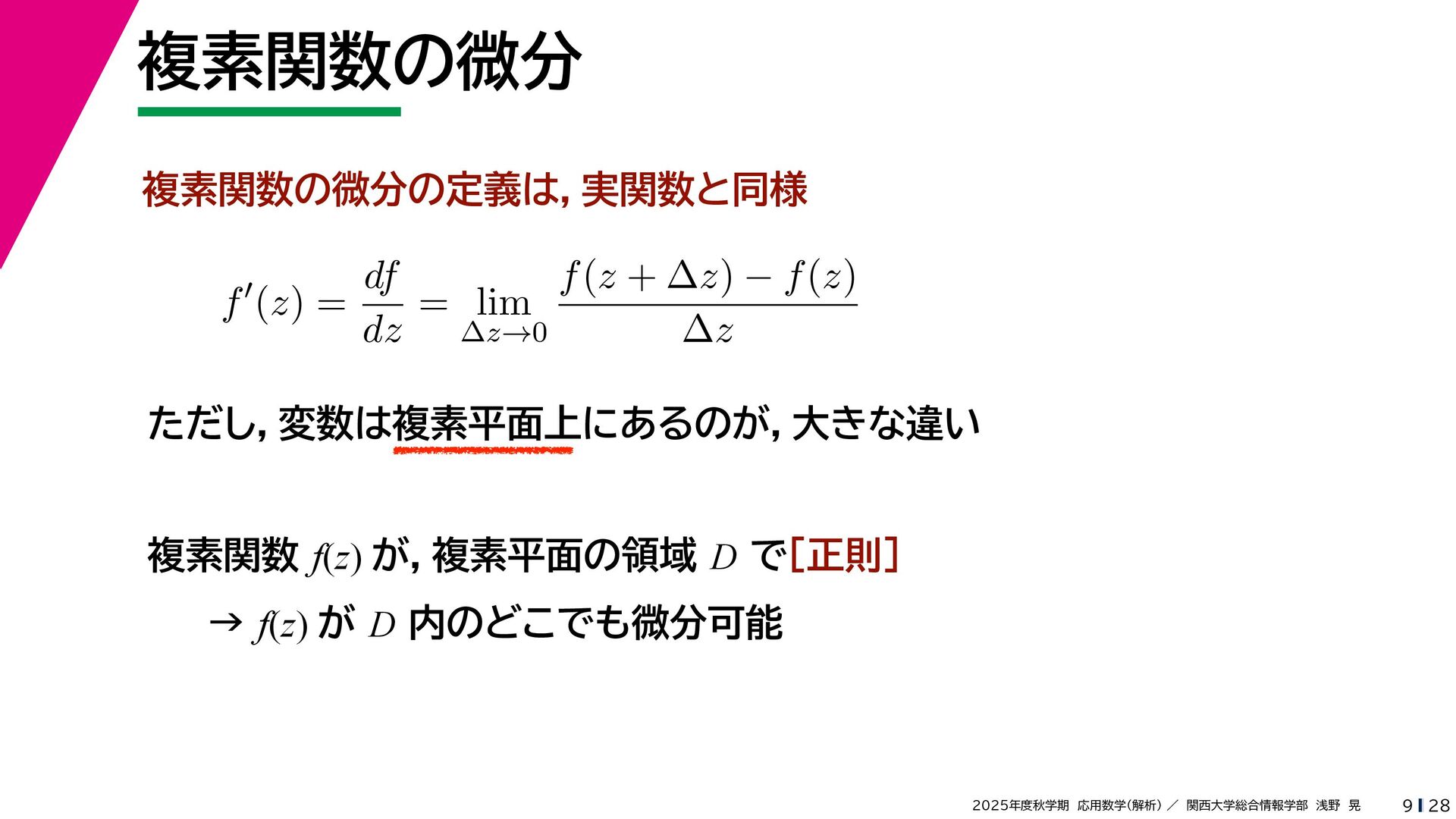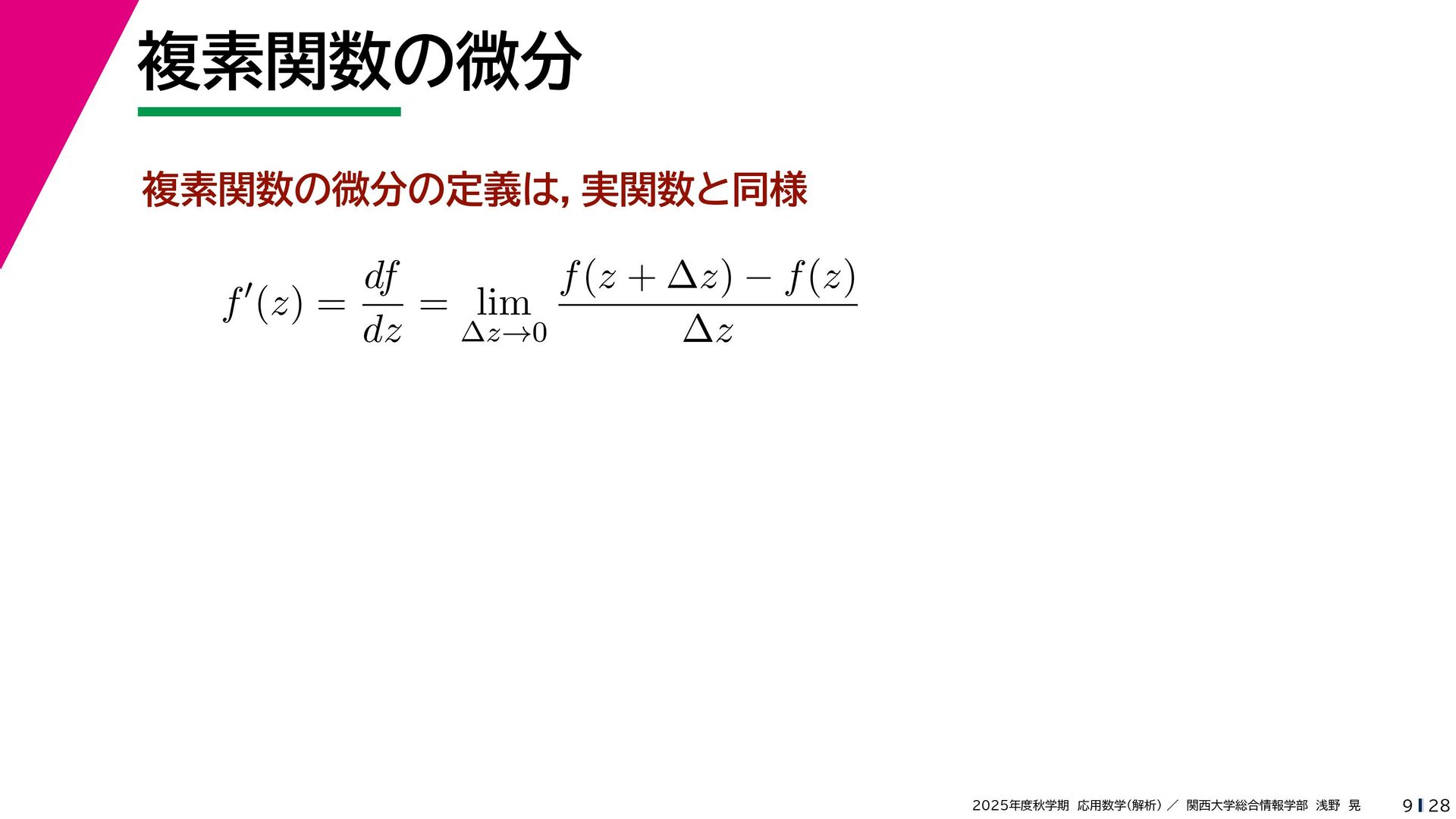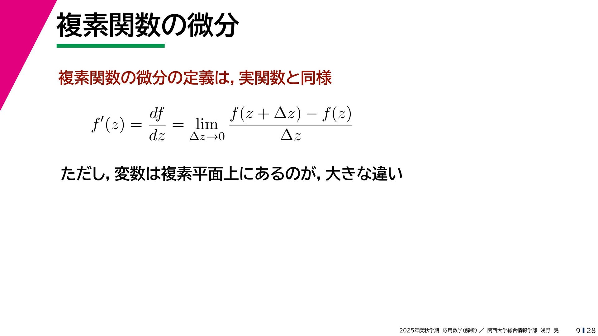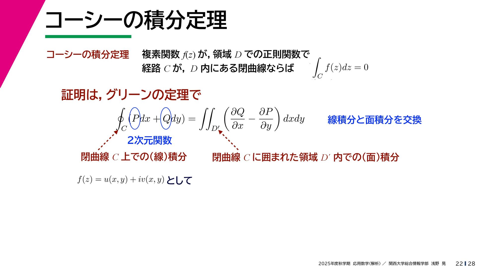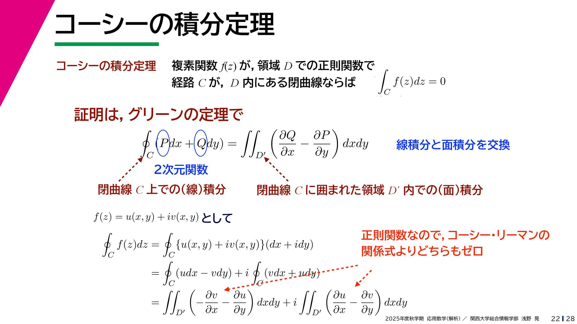 + yi (x + Δx) + yi x + (y + Δy)i この2通りの近づき方で極限値は等しいので を2通りの近づき方で表す f′ (z) f′(z) = lim ∆x→0 {u(x + ∆x, y) + iv(x + ∆x, y)} − {u(x, y) + iv(x, y)} ((x + ∆x) + yi) − (x + yi) = lim ∆x→0 u(x + ∆x, y) − u(x, y) ∆x + i lim ∆x→0 v(x + ∆x, y) − v(x, y) ∆x = ∂u ∂x + i ∂v ∂x f′(z) = lim ∆y→0 {u(x, y + ∆y) + iv(x, y + ∆y)} − {u(x, y) + iv(x, y)} (x + (y + ∆y)i) − (x + yi) = lim ∆y→0 u(x, y + ∆y) − u(x, y) i∆y + i lim ∆x→0 v(x, y + ∆y) − v(x, y) i∆y = −i lim ∆y→0 u(x, y + ∆y) − u(x, y) ∆y + lim ∆x→0 v(x, y + ∆y) − v(x, y) ∆y = ∂v ∂y − i ∂u ∂y これらが実部・虚部とも等しい