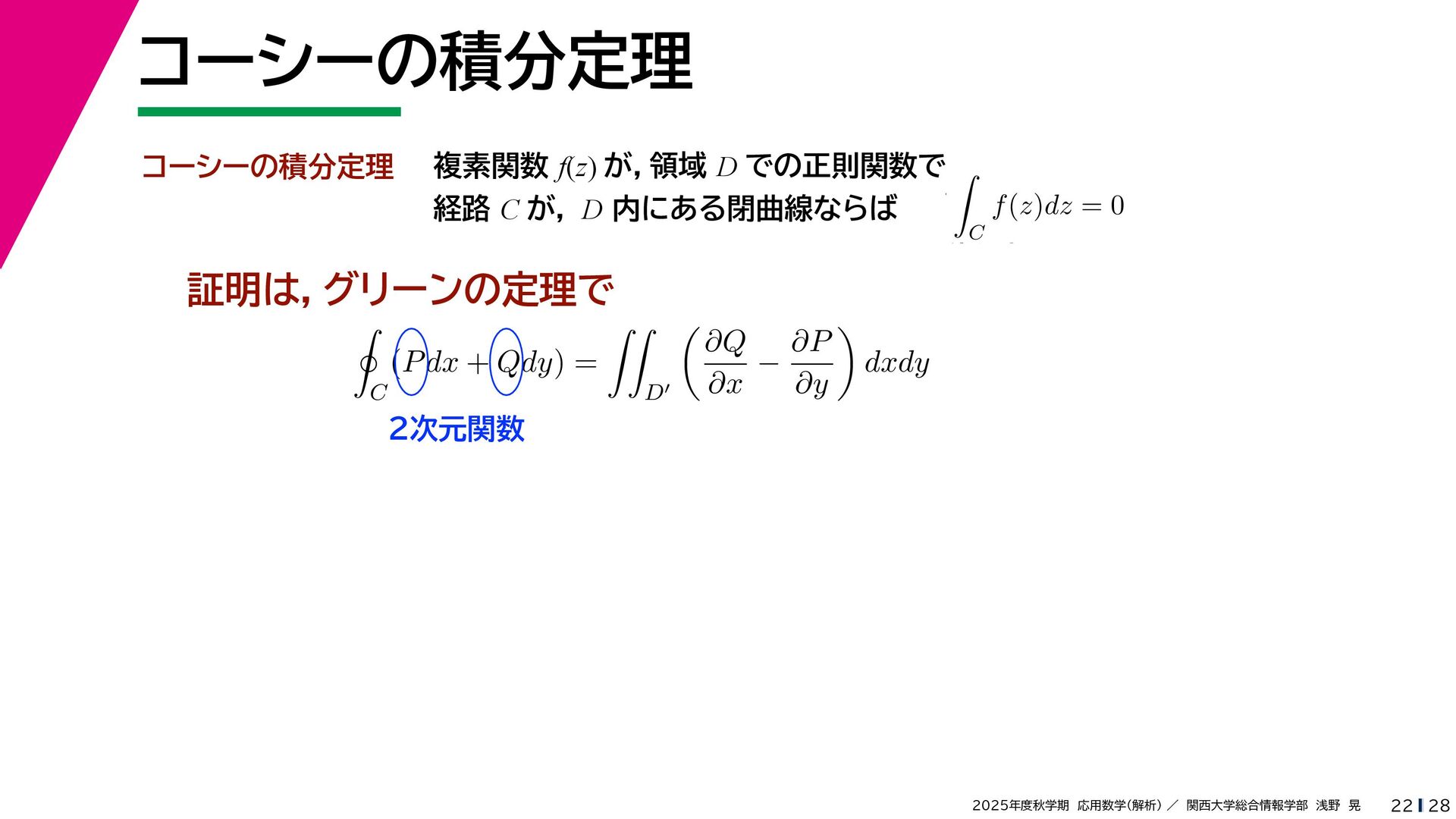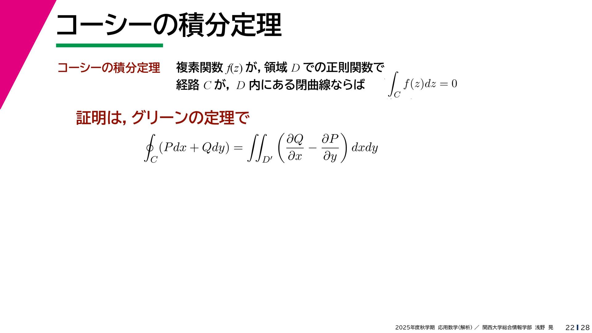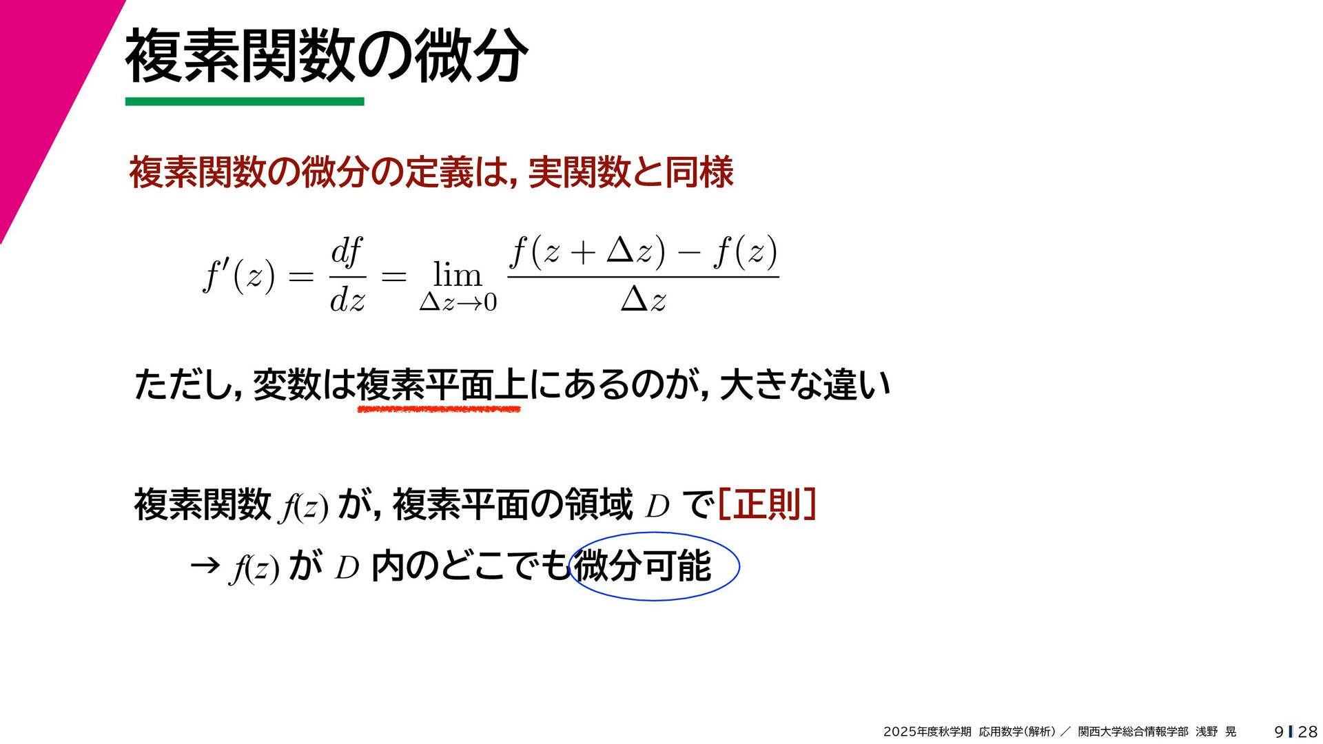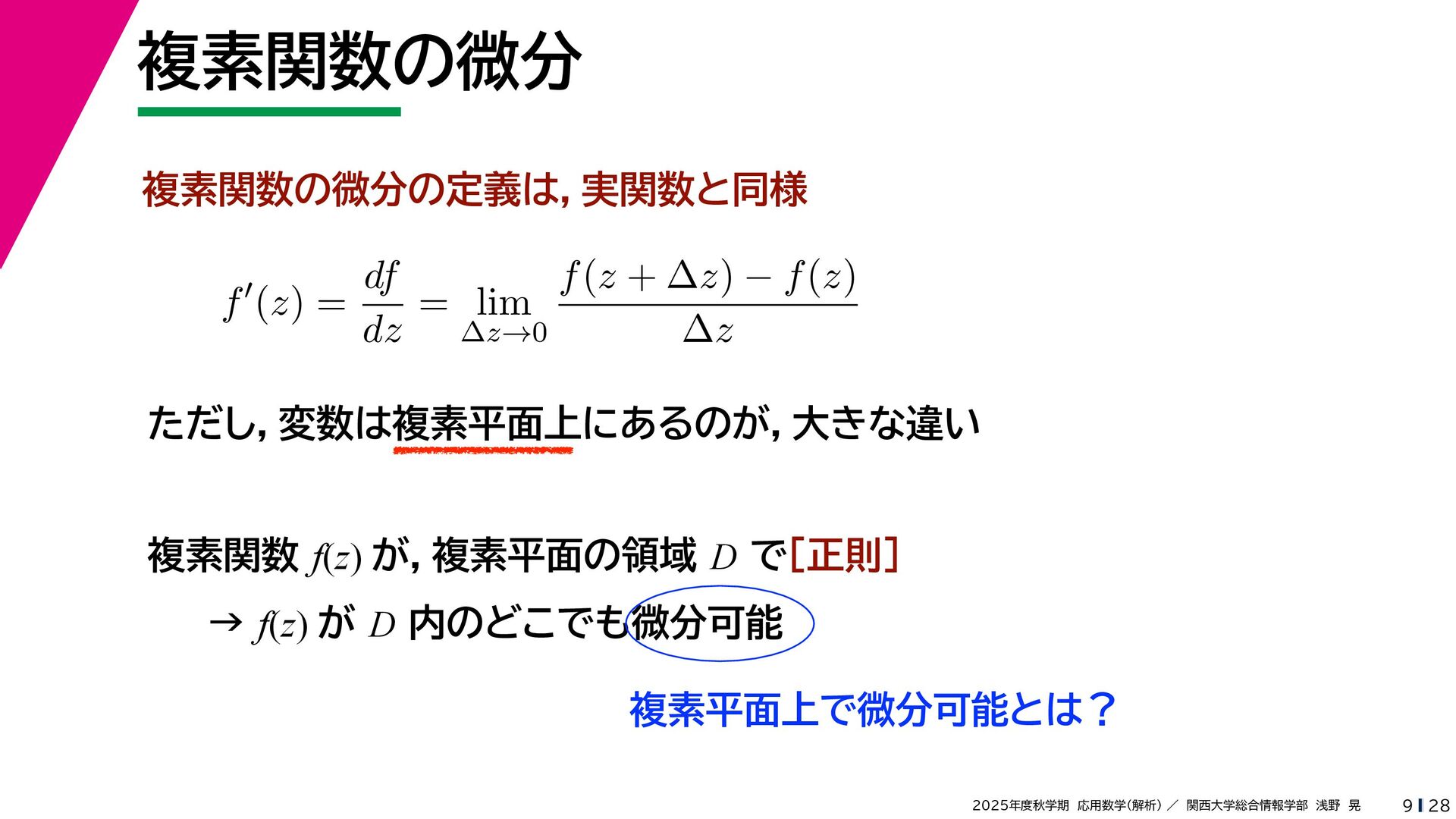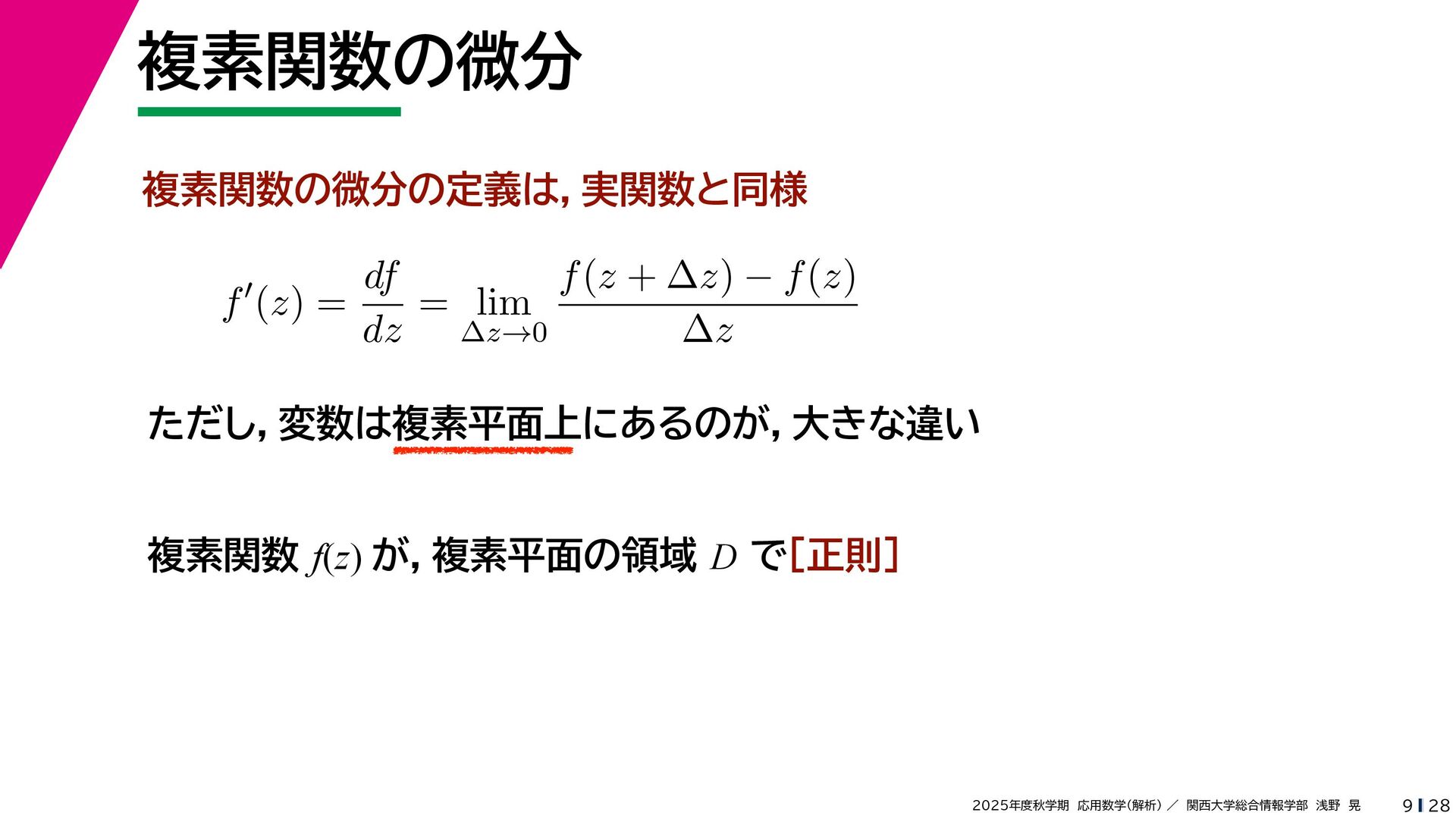 + yi (x + Δx) + yi x + (y + Δy)i この2通りの近づき方で極限値は等しいので を2通りの近づき方で表す f′ (z) f′(z) = lim ∆x→0 {u(x + ∆x, y) + iv(x + ∆x, y)} − {u(x, y) + iv(x, y)} ((x + ∆x) + yi) − (x + yi) = lim ∆x→0 u(x + ∆x, y) − u(x, y) ∆x + i lim ∆x→0 v(x + ∆x, y) − v(x, y) ∆x = ∂u ∂x + i ∂v ∂x f′(z) = lim ∆y→0 {u(x, y + ∆y) + iv(x, y + ∆y)} − {u(x, y) + iv(x, y)} (x + (y + ∆y)i) − (x + yi) = lim ∆y→0 u(x, y + ∆y) − u(x, y) i∆y + i lim ∆x→0 v(x, y + ∆y) − v(x, y) i∆y = −i lim ∆y→0 u(x, y + ∆y) − u(x, y) ∆y + lim ∆x→0 v(x, y + ∆y) − v(x, y) ∆y = ∂v ∂y − i ∂u ∂y これらが実部・虚部とも等しい