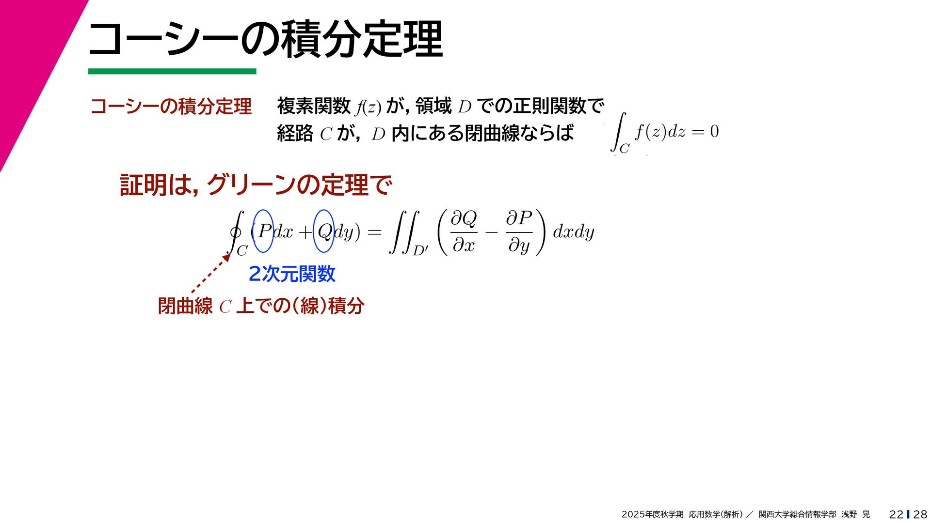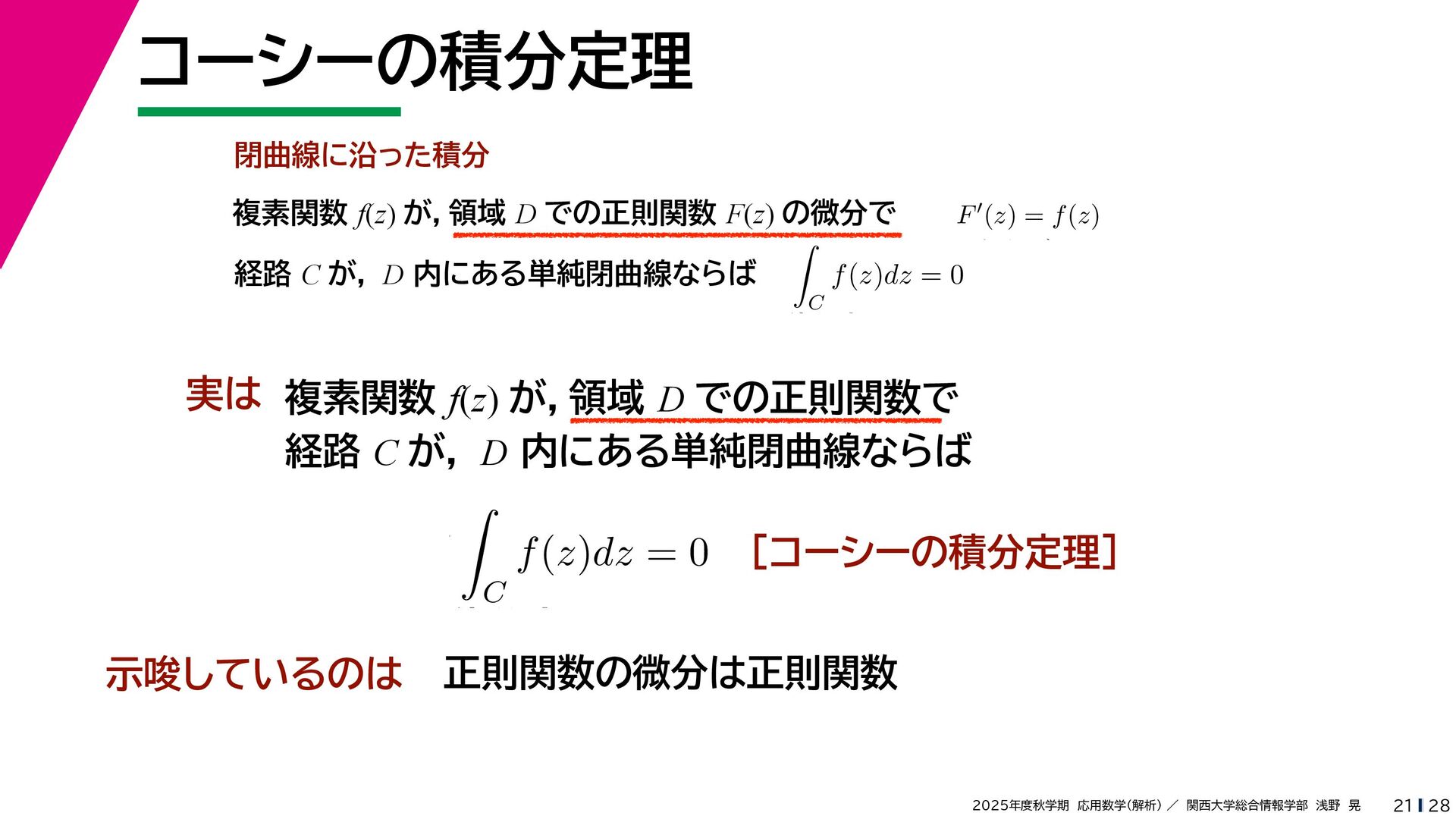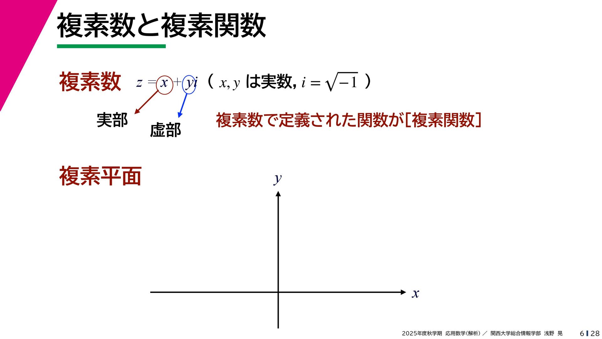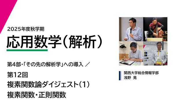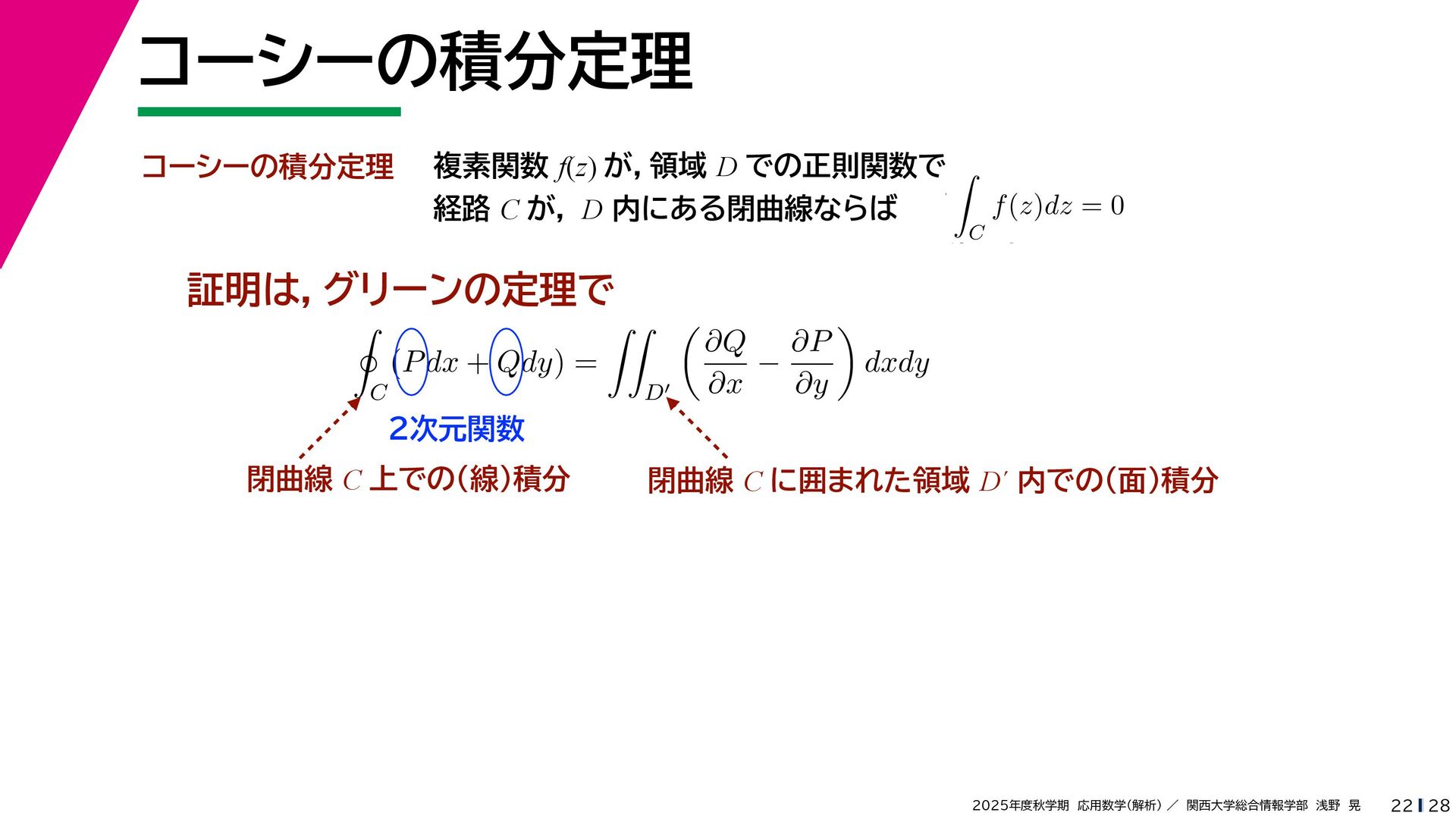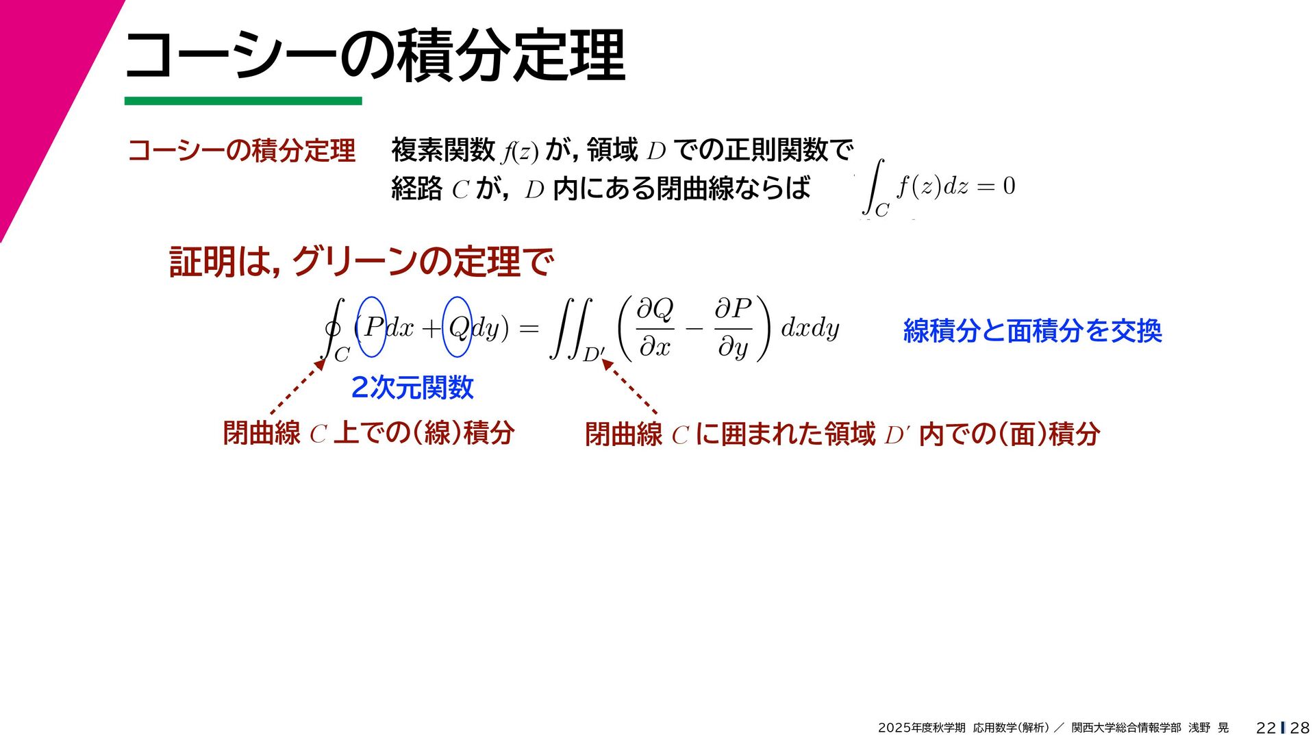 + yi (x + Δx) + yi x + (y + Δy)i この2通りの近づき方で極限値は等しいので を2通りの近づき方で表す f′ (z) f′(z) = lim ∆x→0 {u(x + ∆x, y) + iv(x + ∆x, y)} − {u(x, y) + iv(x, y)} ((x + ∆x) + yi) − (x + yi) = lim ∆x→0 u(x + ∆x, y) − u(x, y) ∆x + i lim ∆x→0 v(x + ∆x, y) − v(x, y) ∆x = ∂u ∂x + i ∂v ∂x f′(z) = lim ∆y→0 {u(x, y + ∆y) + iv(x, y + ∆y)} − {u(x, y) + iv(x, y)} (x + (y + ∆y)i) − (x + yi) = lim ∆y→0 u(x, y + ∆y) − u(x, y) i∆y + i lim ∆x→0 v(x, y + ∆y) − v(x, y) i∆y = −i lim ∆y→0 u(x, y + ∆y) − u(x, y) ∆y + lim ∆x→0 v(x, y + ∆y) − v(x, y) ∆y = ∂v ∂y − i ∂u ∂y これらが実部・虚部とも等しい