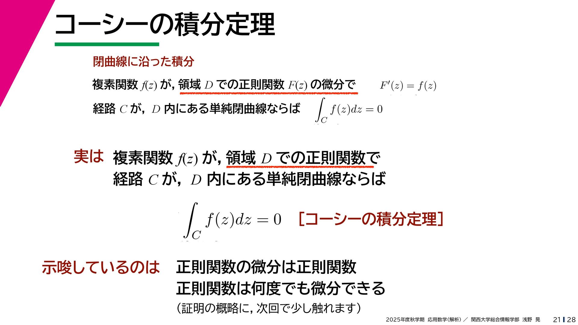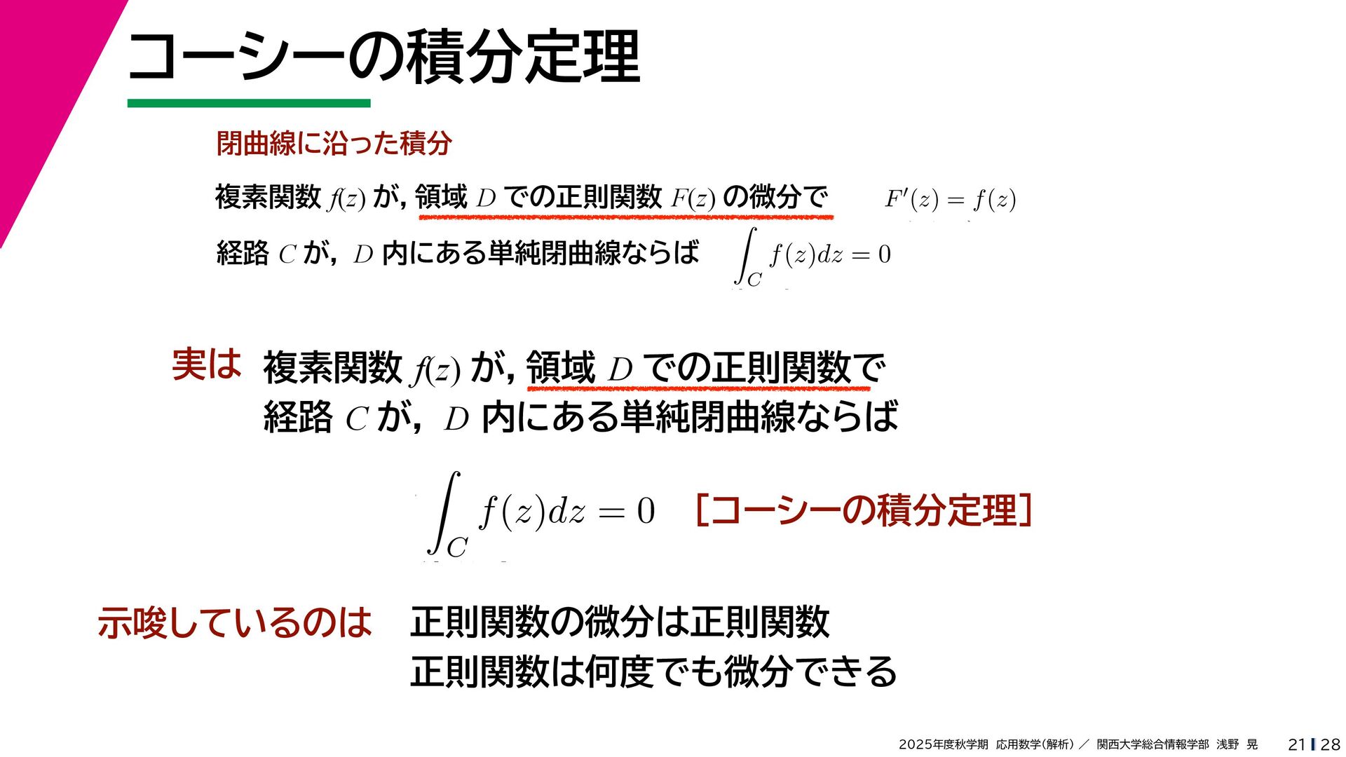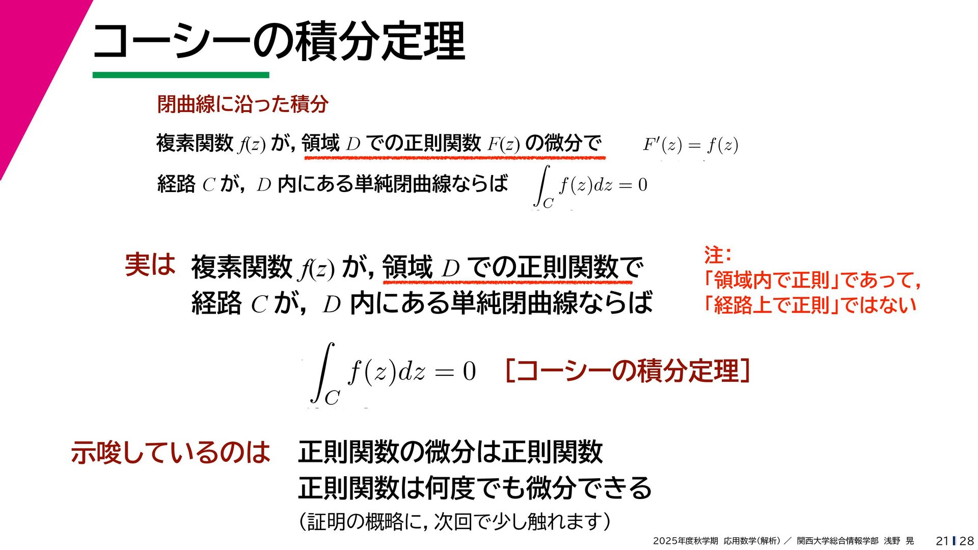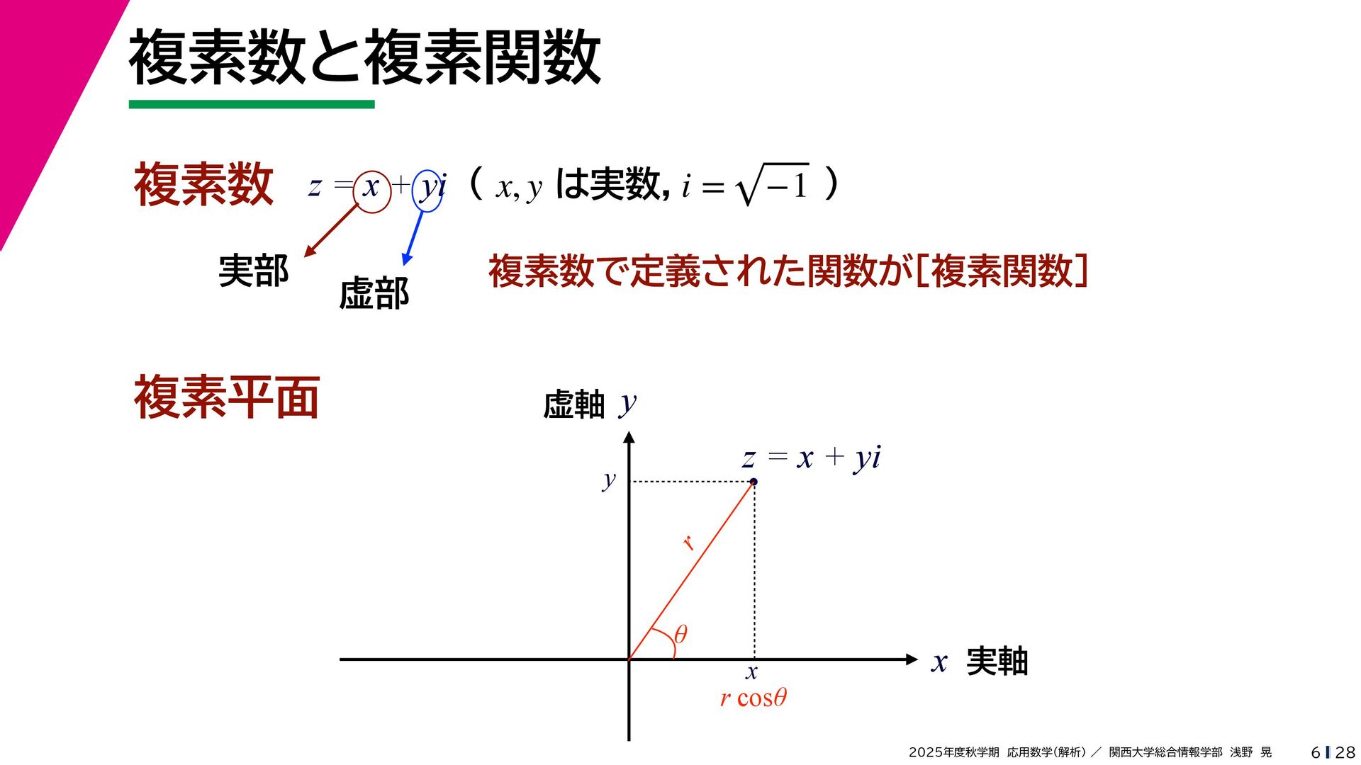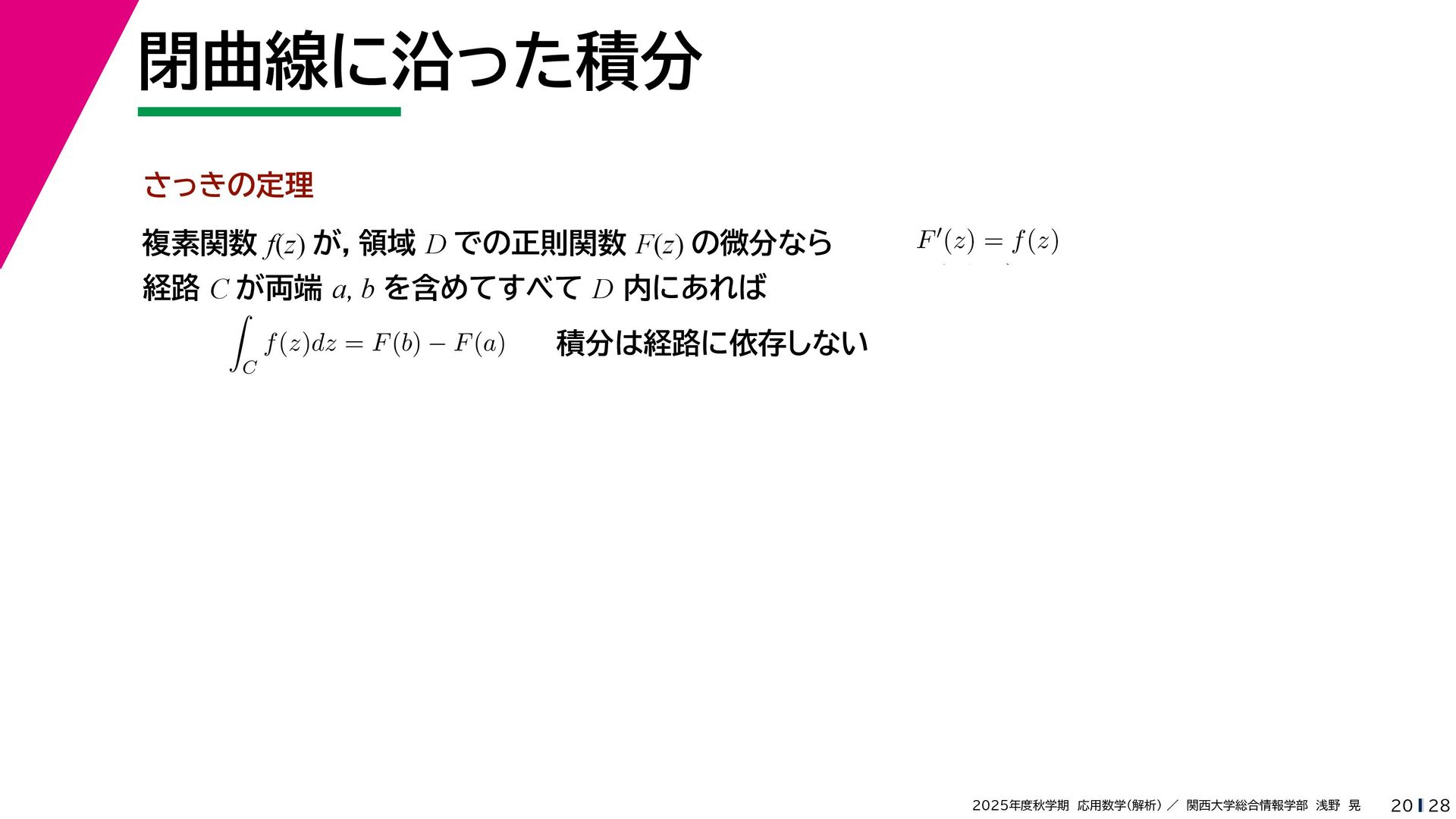 + yi (x + Δx) + yi x + (y + Δy)i この2通りの近づき方で極限値は等しいので を2通りの近づき方で表す f′ (z) f′(z) = lim ∆x→0 {u(x + ∆x, y) + iv(x + ∆x, y)} − {u(x, y) + iv(x, y)} ((x + ∆x) + yi) − (x + yi) = lim ∆x→0 u(x + ∆x, y) − u(x, y) ∆x + i lim ∆x→0 v(x + ∆x, y) − v(x, y) ∆x = ∂u ∂x + i ∂v ∂x f′(z) = lim ∆y→0 {u(x, y + ∆y) + iv(x, y + ∆y)} − {u(x, y) + iv(x, y)} (x + (y + ∆y)i) − (x + yi) = lim ∆y→0 u(x, y + ∆y) − u(x, y) i∆y + i lim ∆x→0 v(x, y + ∆y) − v(x, y) i∆y = −i lim ∆y→0 u(x, y + ∆y) − u(x, y) ∆y + lim ∆x→0 v(x, y + ∆y) − v(x, y) ∆y = ∂v ∂y − i ∂u ∂y これらが実部・虚部とも等しい