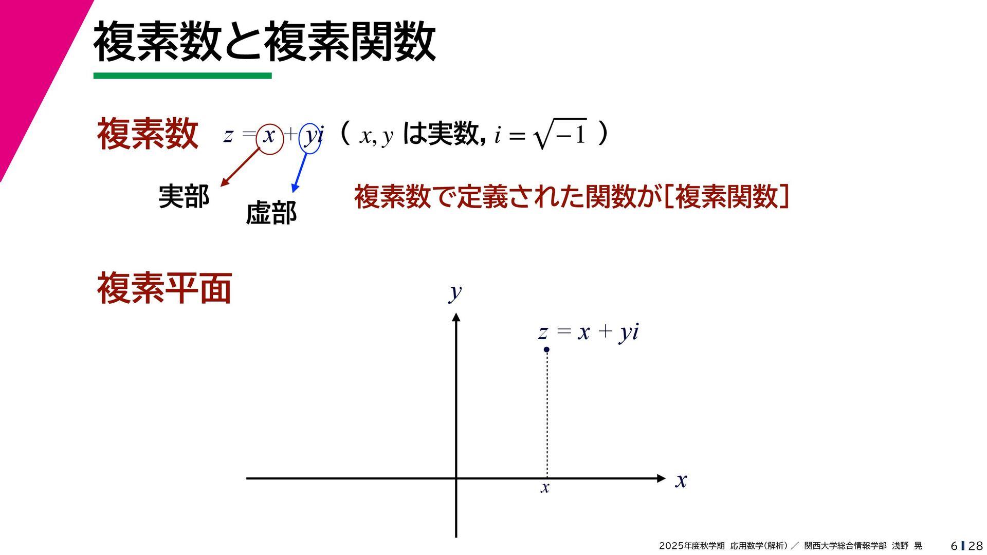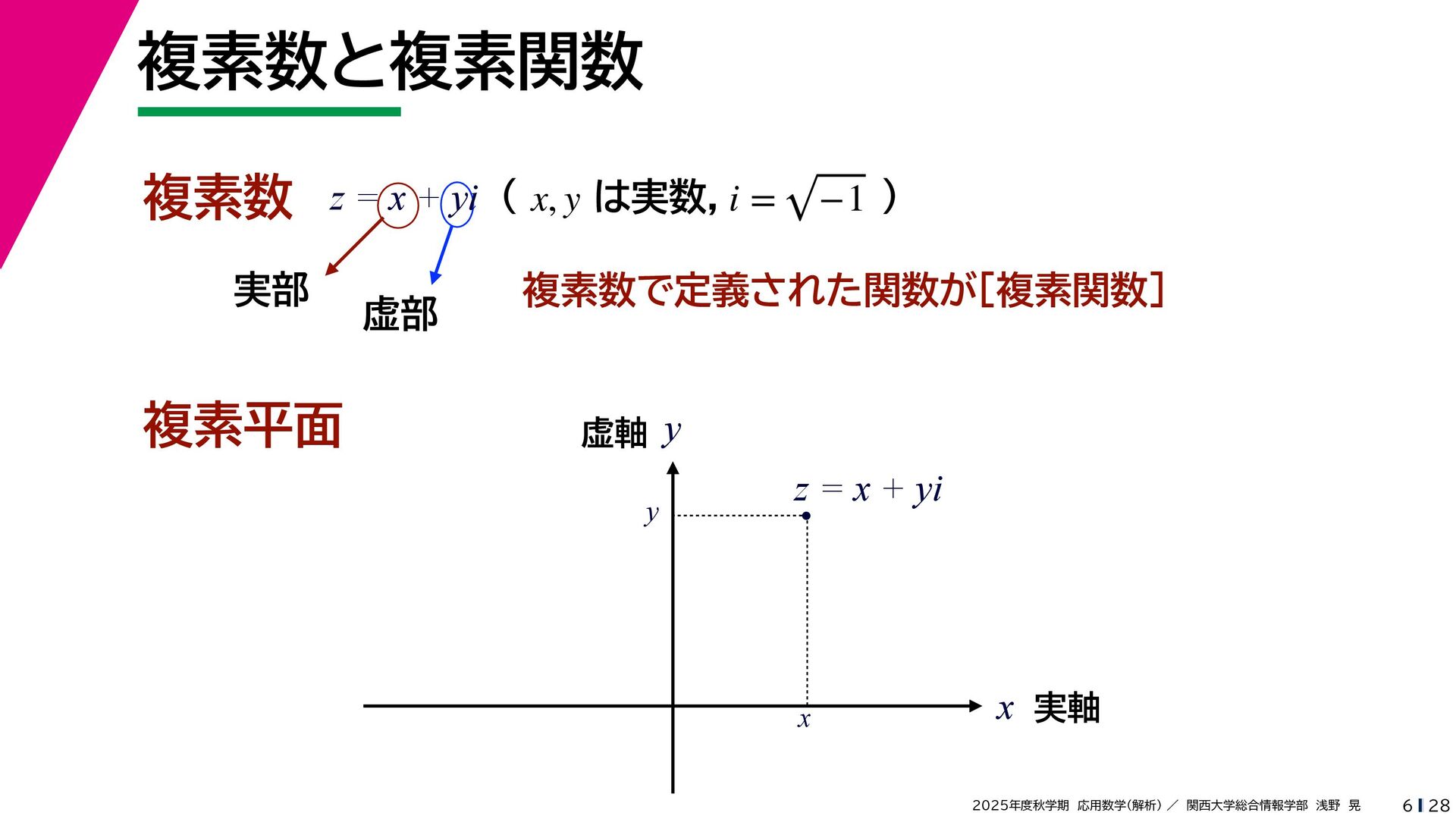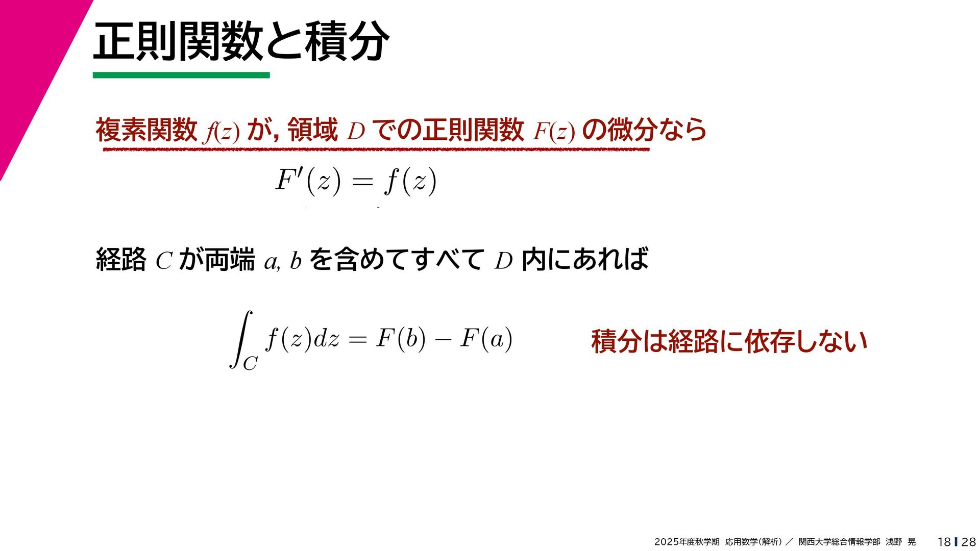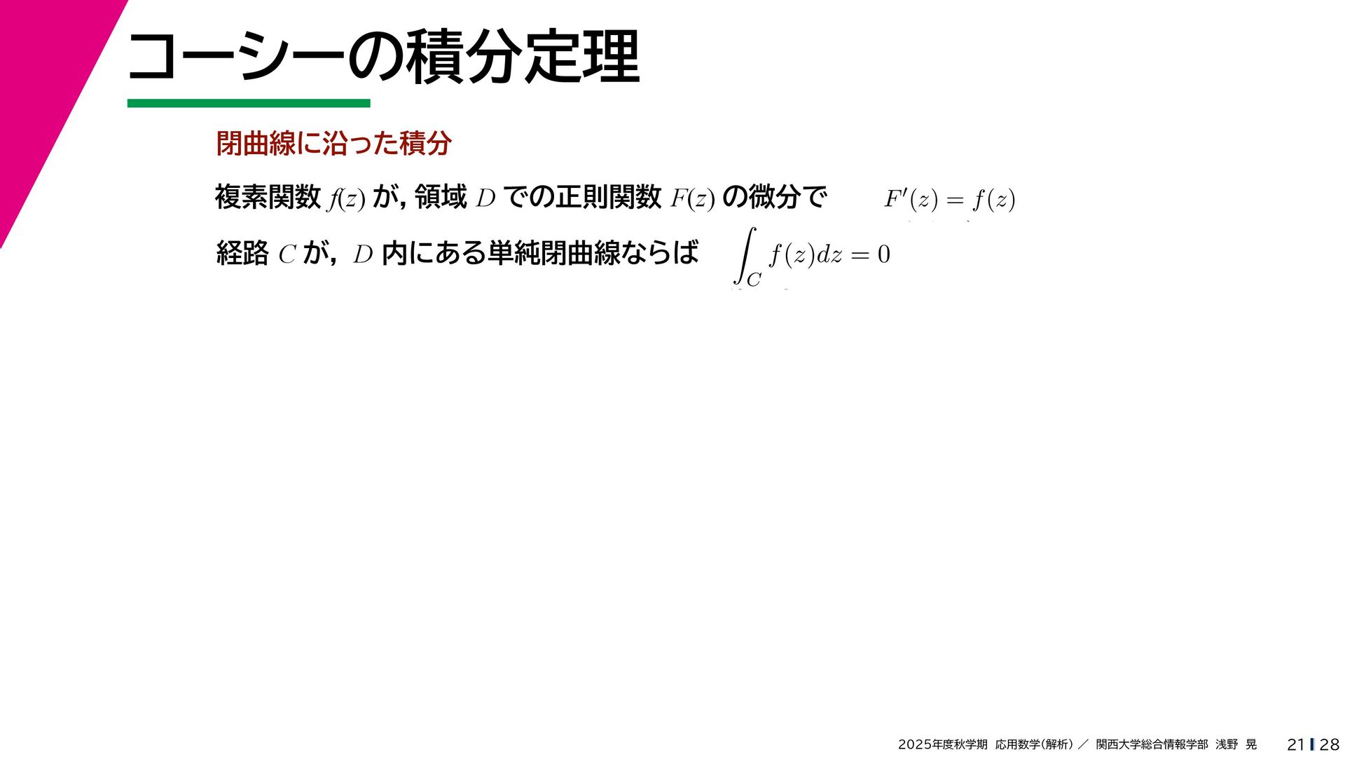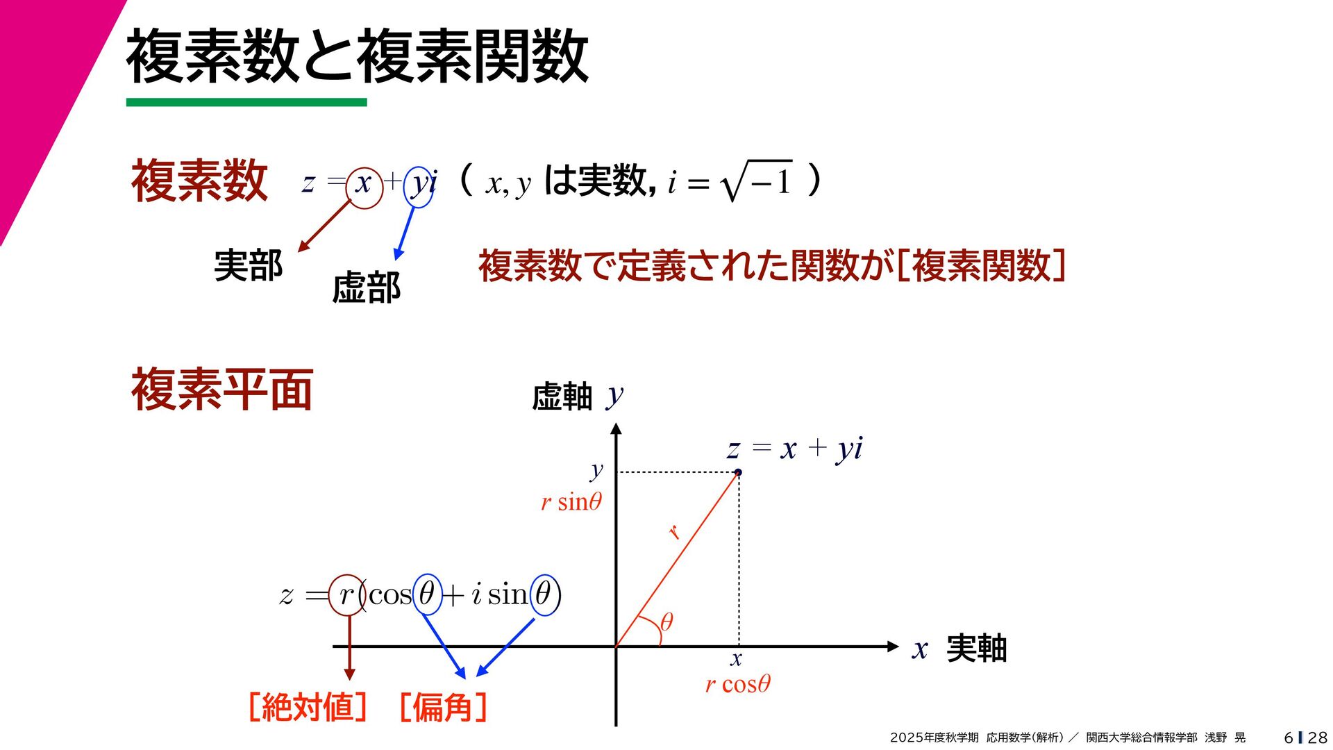 + yi (x + Δx) + yi x + (y + Δy)i この2通りの近づき方で極限値は等しいので を2通りの近づき方で表す f′ (z) f′(z) = lim ∆x→0 {u(x + ∆x, y) + iv(x + ∆x, y)} − {u(x, y) + iv(x, y)} ((x + ∆x) + yi) − (x + yi) = lim ∆x→0 u(x + ∆x, y) − u(x, y) ∆x + i lim ∆x→0 v(x + ∆x, y) − v(x, y) ∆x = ∂u ∂x + i ∂v ∂x f′(z) = lim ∆y→0 {u(x, y + ∆y) + iv(x, y + ∆y)} − {u(x, y) + iv(x, y)} (x + (y + ∆y)i) − (x + yi) = lim ∆y→0 u(x, y + ∆y) − u(x, y) i∆y + i lim ∆x→0 v(x, y + ∆y) − v(x, y) i∆y = −i lim ∆y→0 u(x, y + ∆y) − u(x, y) ∆y + lim ∆x→0 v(x, y + ∆y) − v(x, y) ∆y = ∂v ∂y − i ∂u ∂y これらが実部・虚部とも等しい