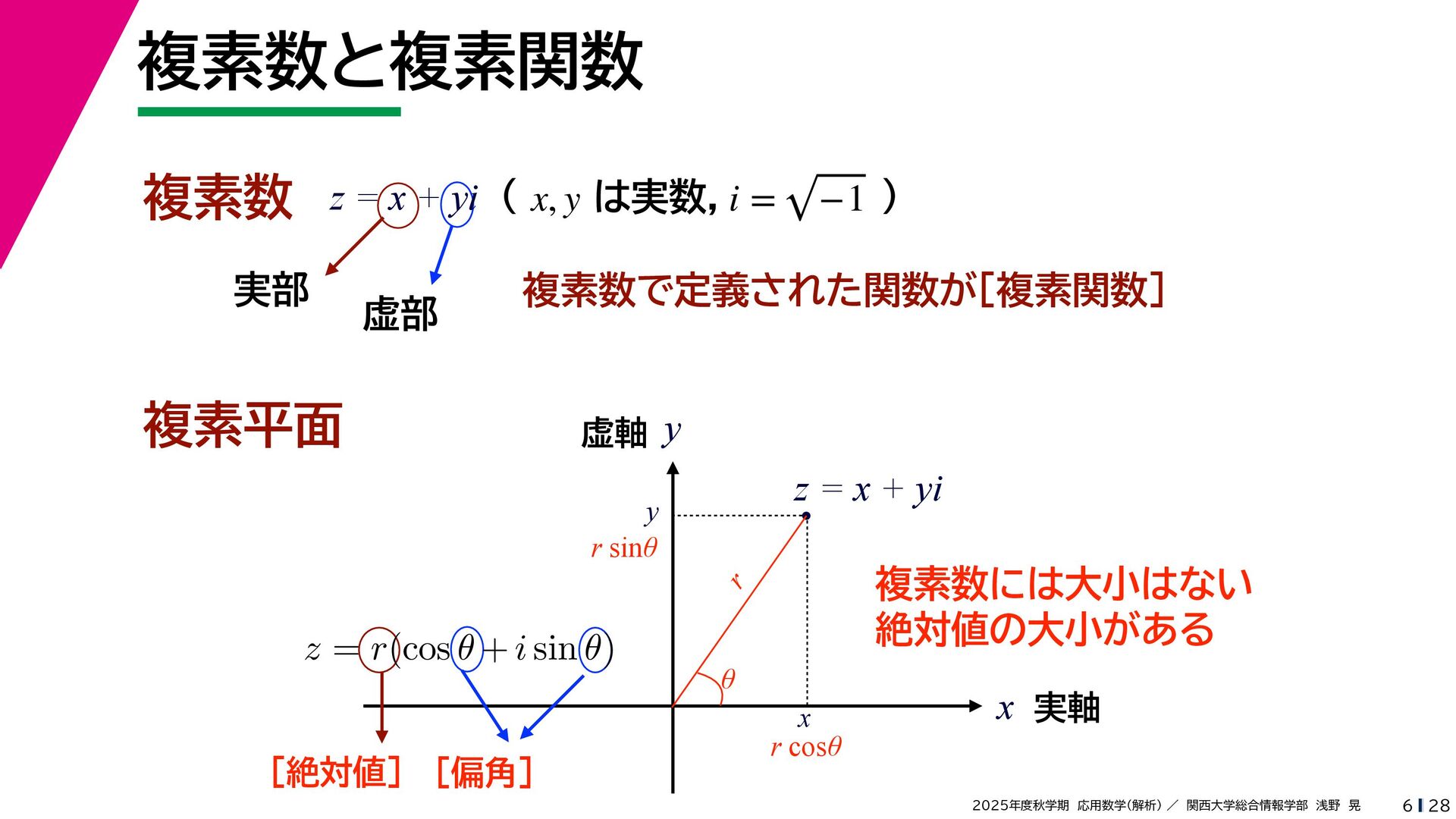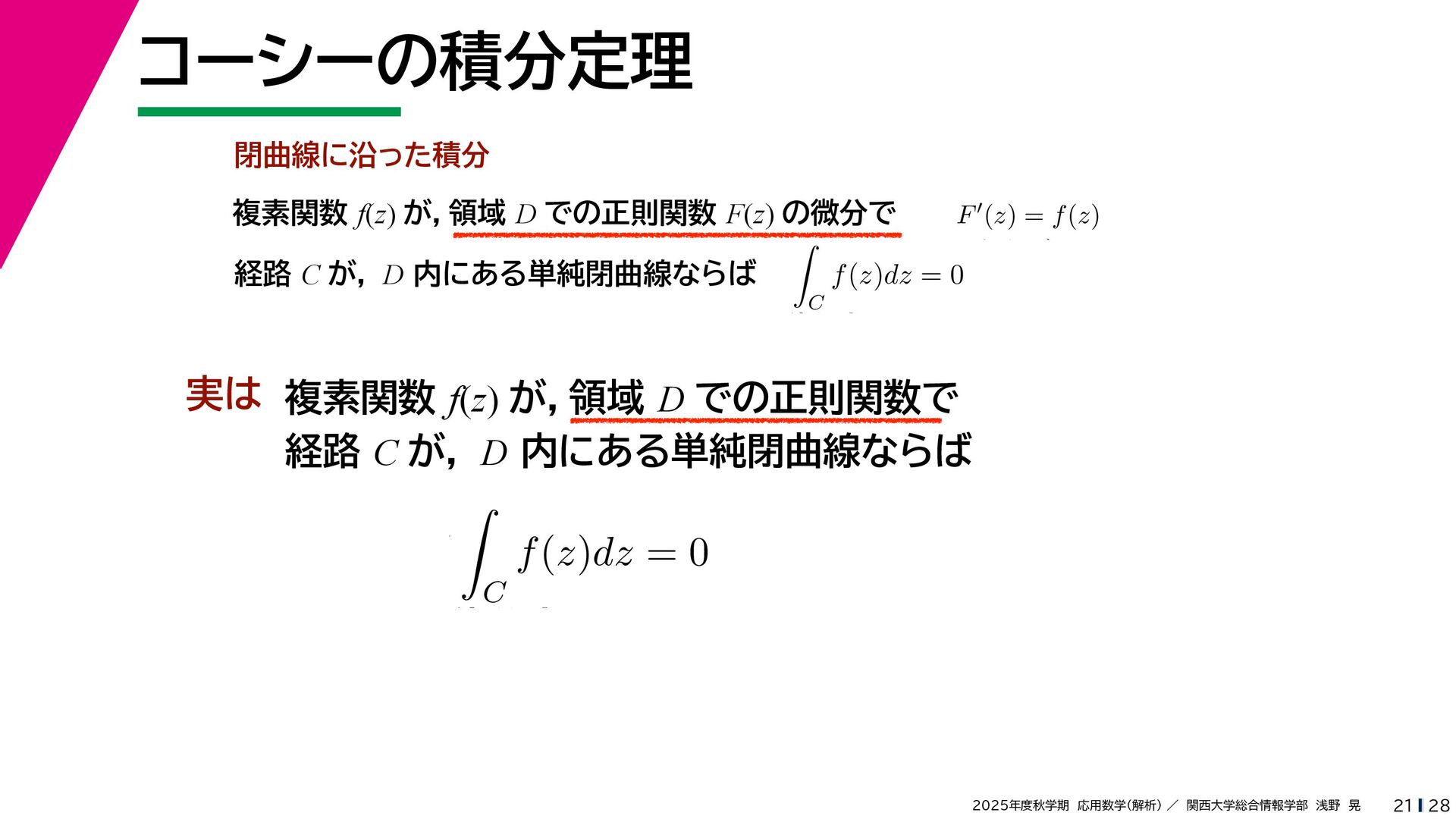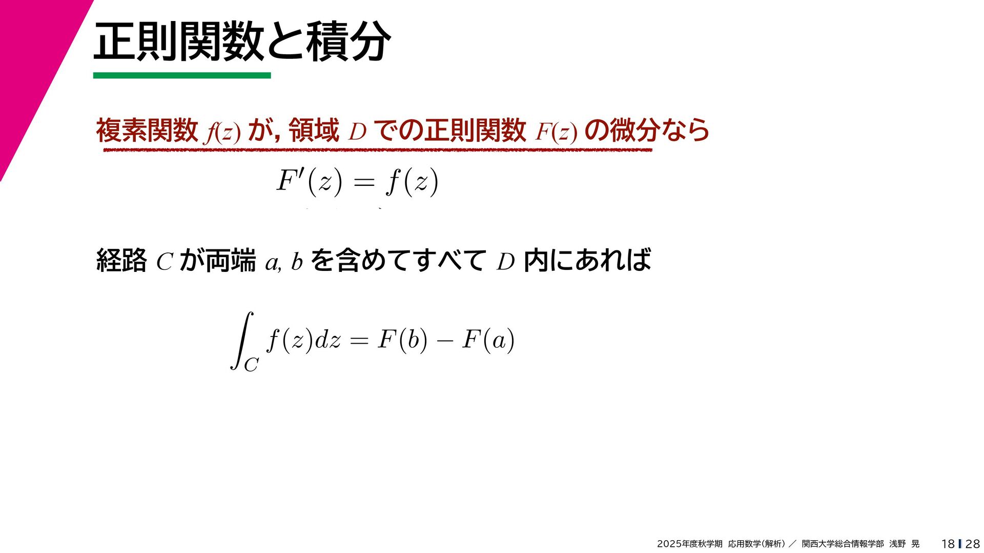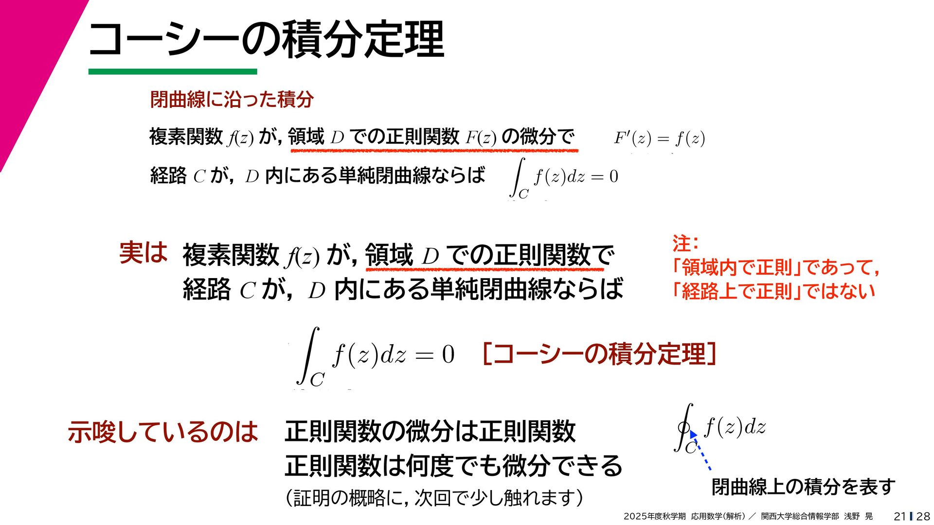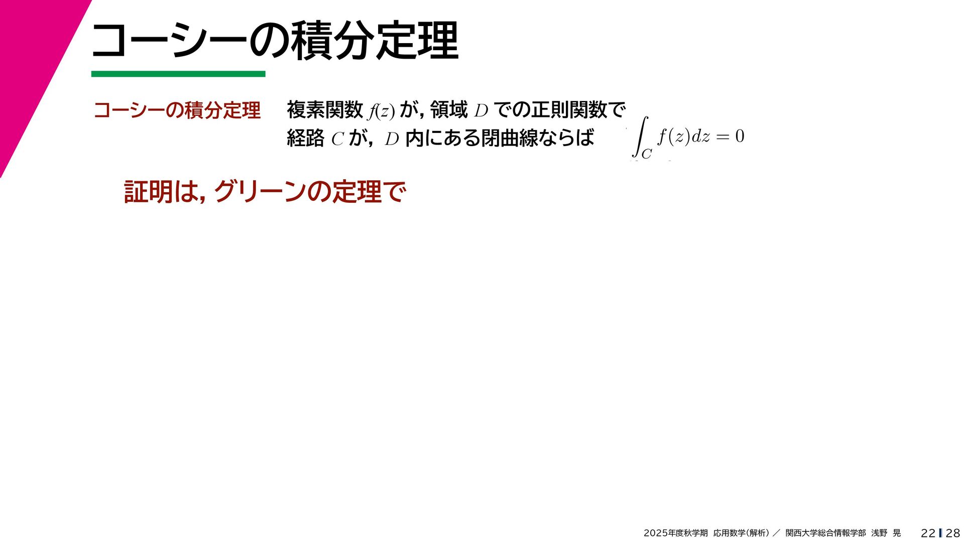 + yi (x + Δx) + yi x + (y + Δy)i この2通りの近づき方で極限値は等しいので を2通りの近づき方で表す f′ (z) f′(z) = lim ∆x→0 {u(x + ∆x, y) + iv(x + ∆x, y)} − {u(x, y) + iv(x, y)} ((x + ∆x) + yi) − (x + yi) = lim ∆x→0 u(x + ∆x, y) − u(x, y) ∆x + i lim ∆x→0 v(x + ∆x, y) − v(x, y) ∆x = ∂u ∂x + i ∂v ∂x f′(z) = lim ∆y→0 {u(x, y + ∆y) + iv(x, y + ∆y)} − {u(x, y) + iv(x, y)} (x + (y + ∆y)i) − (x + yi) = lim ∆y→0 u(x, y + ∆y) − u(x, y) i∆y + i lim ∆x→0 v(x, y + ∆y) − v(x, y) i∆y = −i lim ∆y→0 u(x, y + ∆y) − u(x, y) ∆y + lim ∆x→0 v(x, y + ∆y) − v(x, y) ∆y = ∂v ∂y − i ∂u ∂y これらが実部・虚部とも等しい