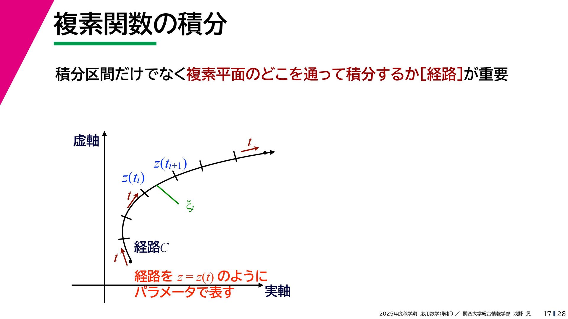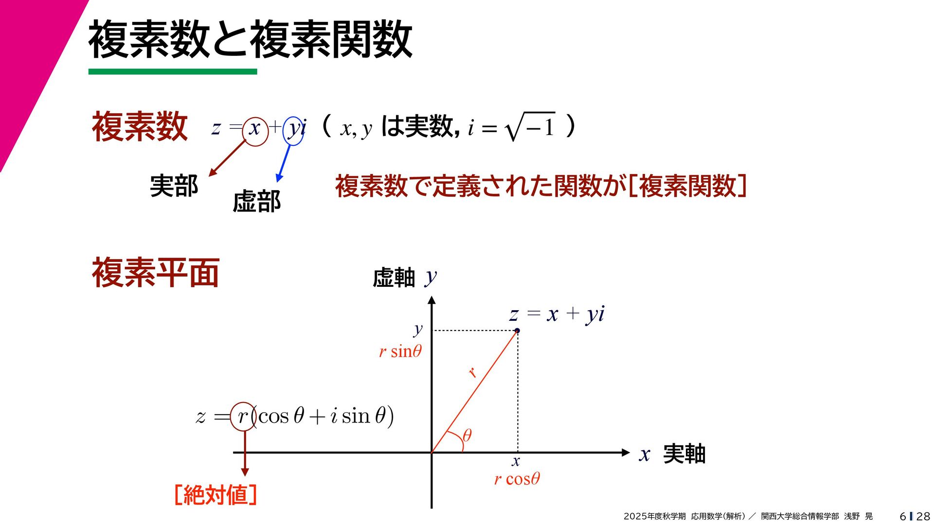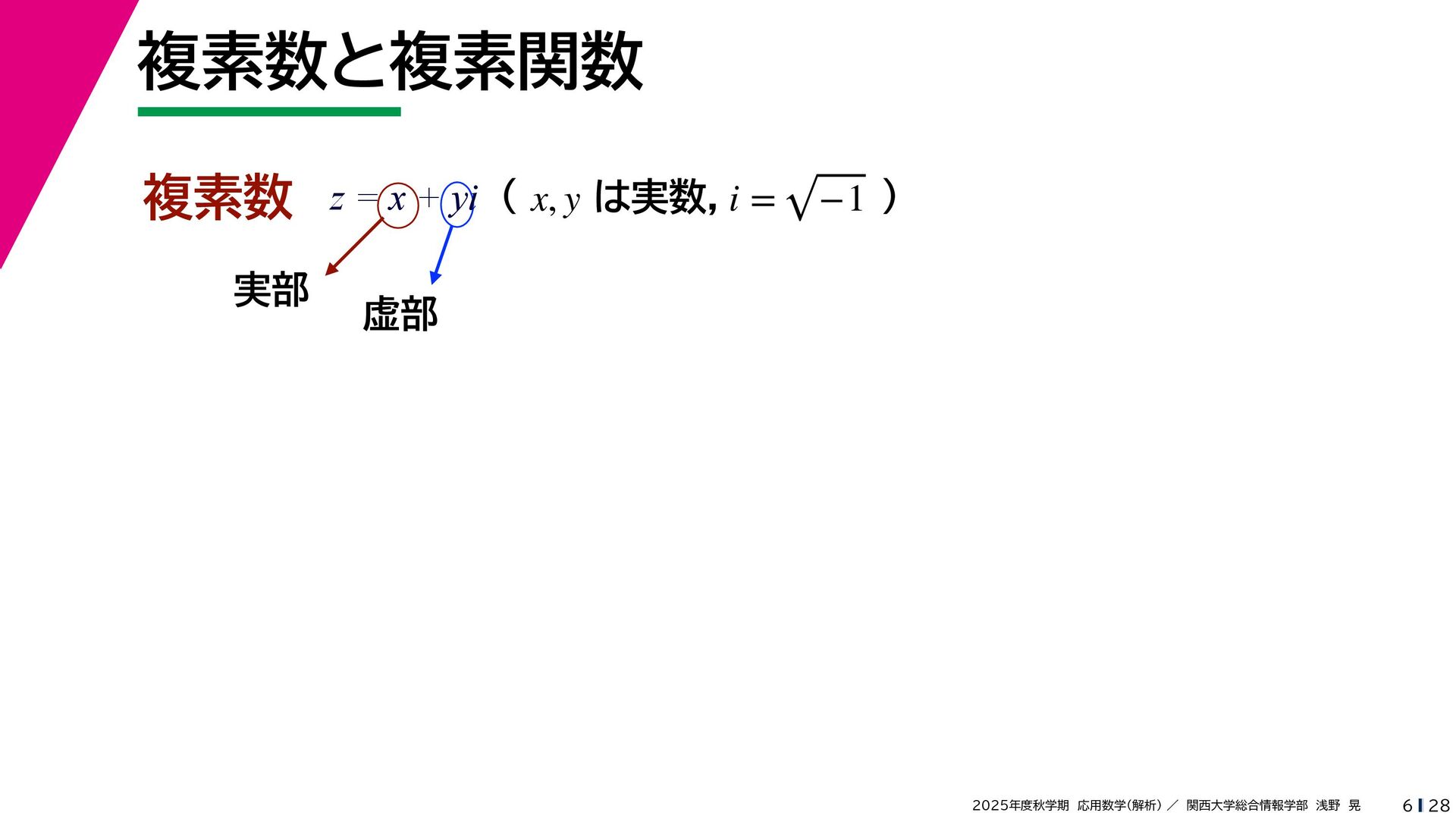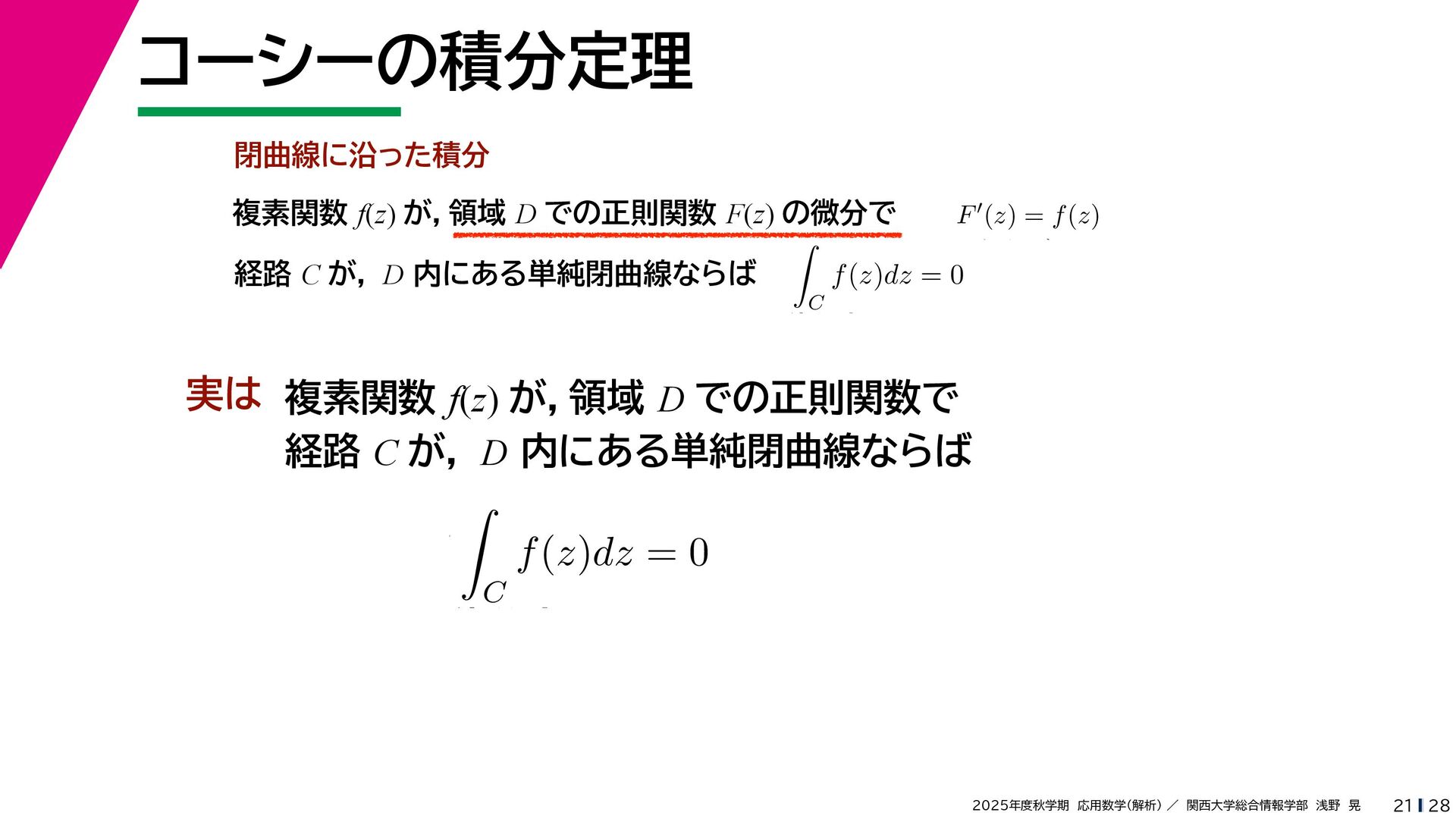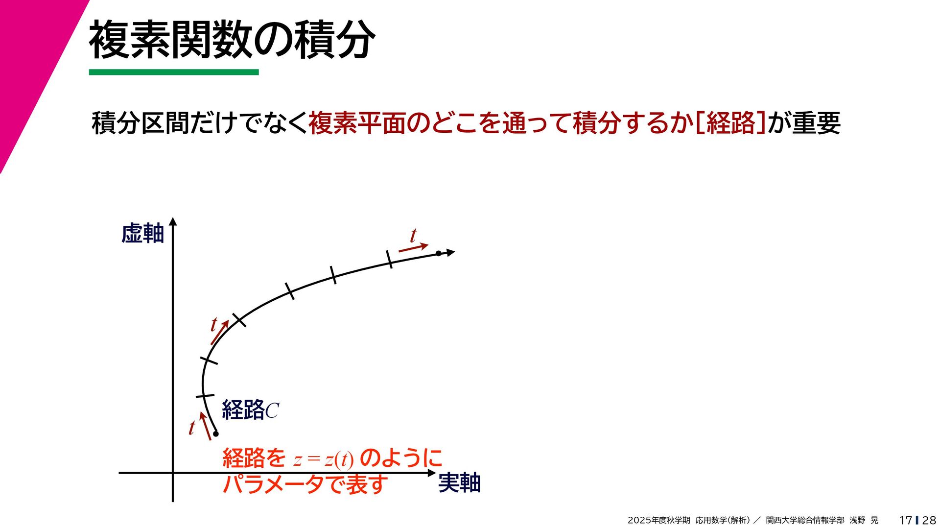 + yi (x + Δx) + yi x + (y + Δy)i この2通りの近づき方で極限値は等しいので を2通りの近づき方で表す f′ (z) f′(z) = lim ∆x→0 {u(x + ∆x, y) + iv(x + ∆x, y)} − {u(x, y) + iv(x, y)} ((x + ∆x) + yi) − (x + yi) = lim ∆x→0 u(x + ∆x, y) − u(x, y) ∆x + i lim ∆x→0 v(x + ∆x, y) − v(x, y) ∆x = ∂u ∂x + i ∂v ∂x f′(z) = lim ∆y→0 {u(x, y + ∆y) + iv(x, y + ∆y)} − {u(x, y) + iv(x, y)} (x + (y + ∆y)i) − (x + yi) = lim ∆y→0 u(x, y + ∆y) − u(x, y) i∆y + i lim ∆x→0 v(x, y + ∆y) − v(x, y) i∆y = −i lim ∆y→0 u(x, y + ∆y) − u(x, y) ∆y + lim ∆x→0 v(x, y + ∆y) − v(x, y) ∆y = ∂v ∂y − i ∂u ∂y これらが実部・虚部とも等しい