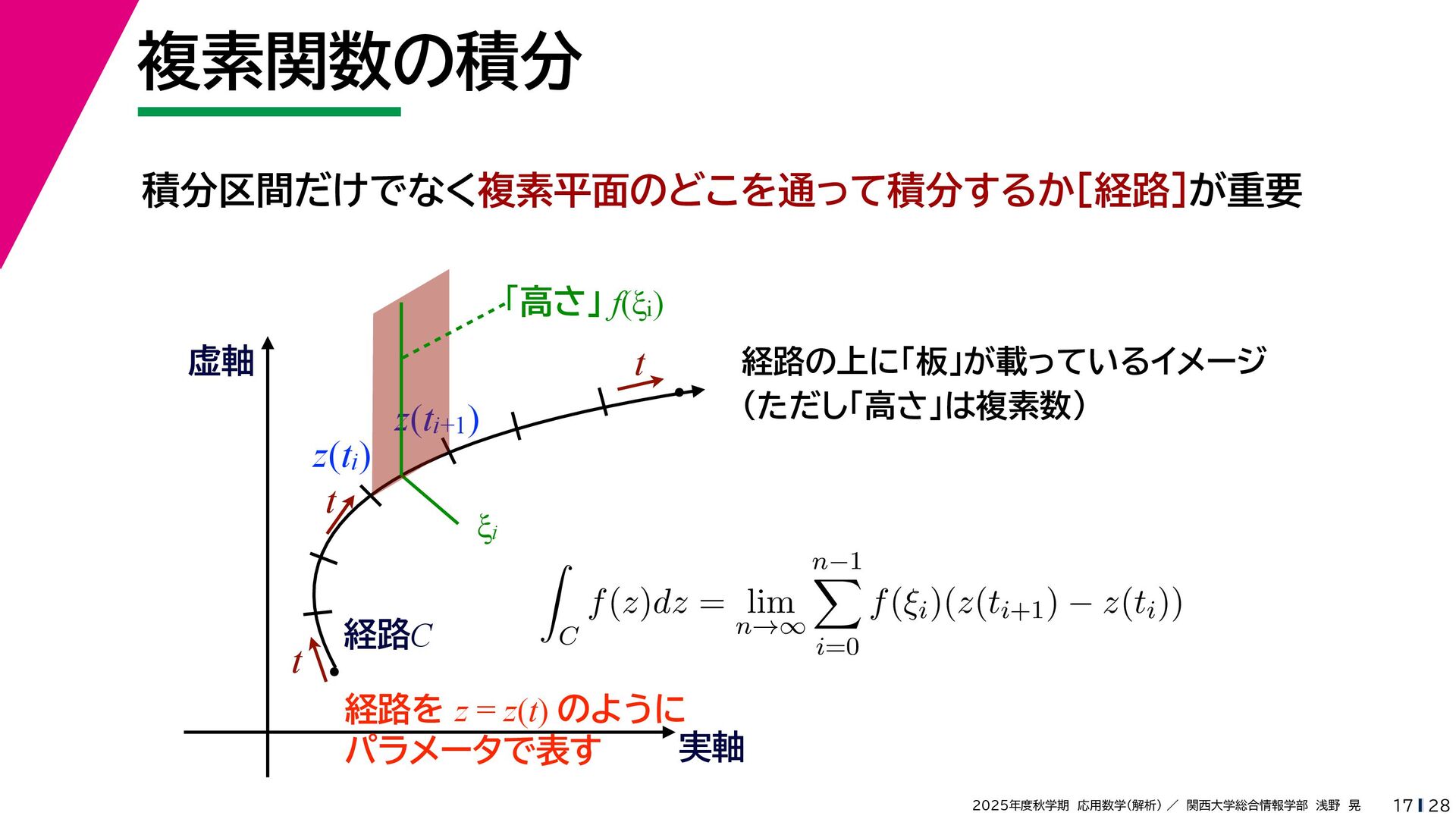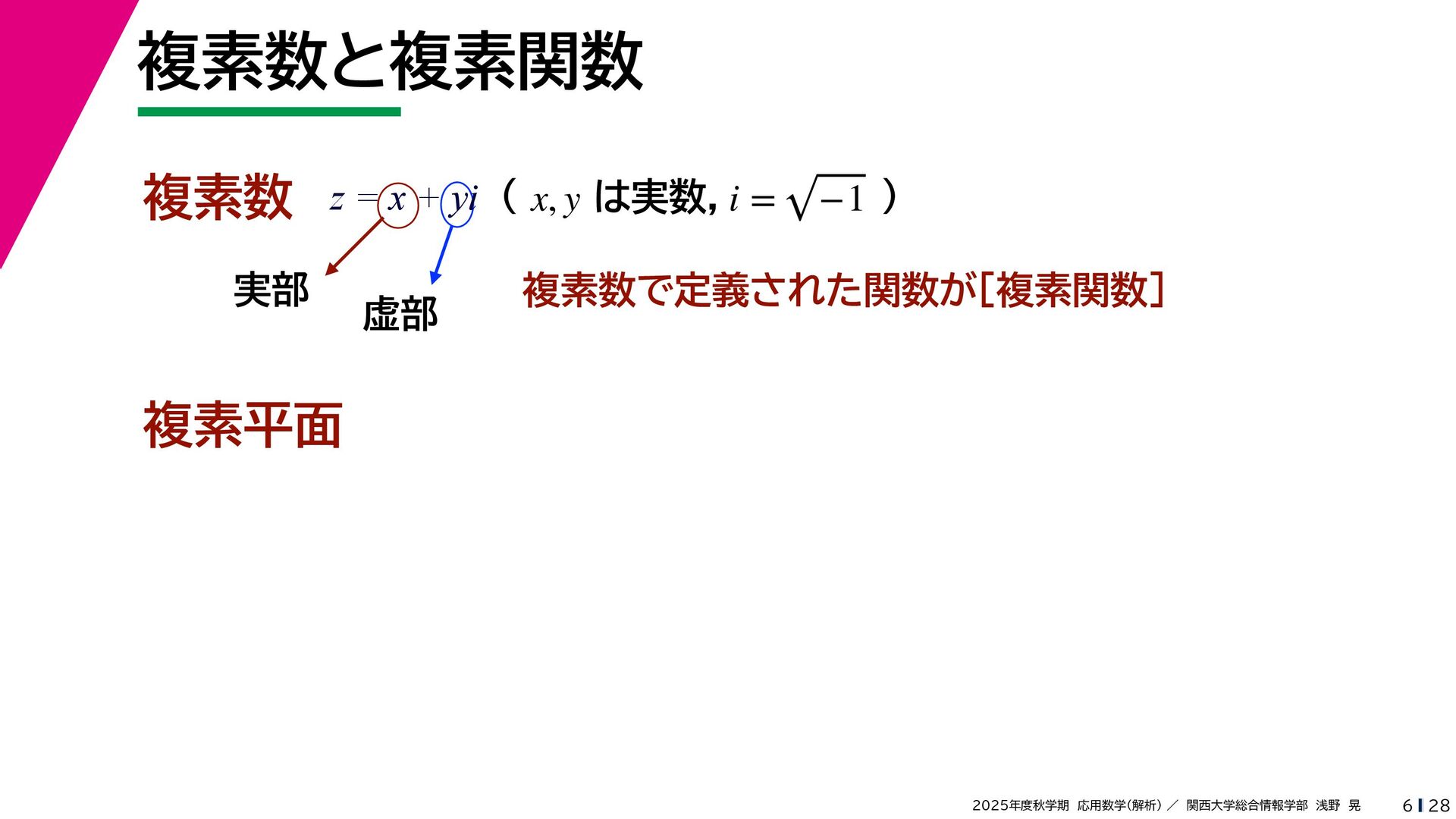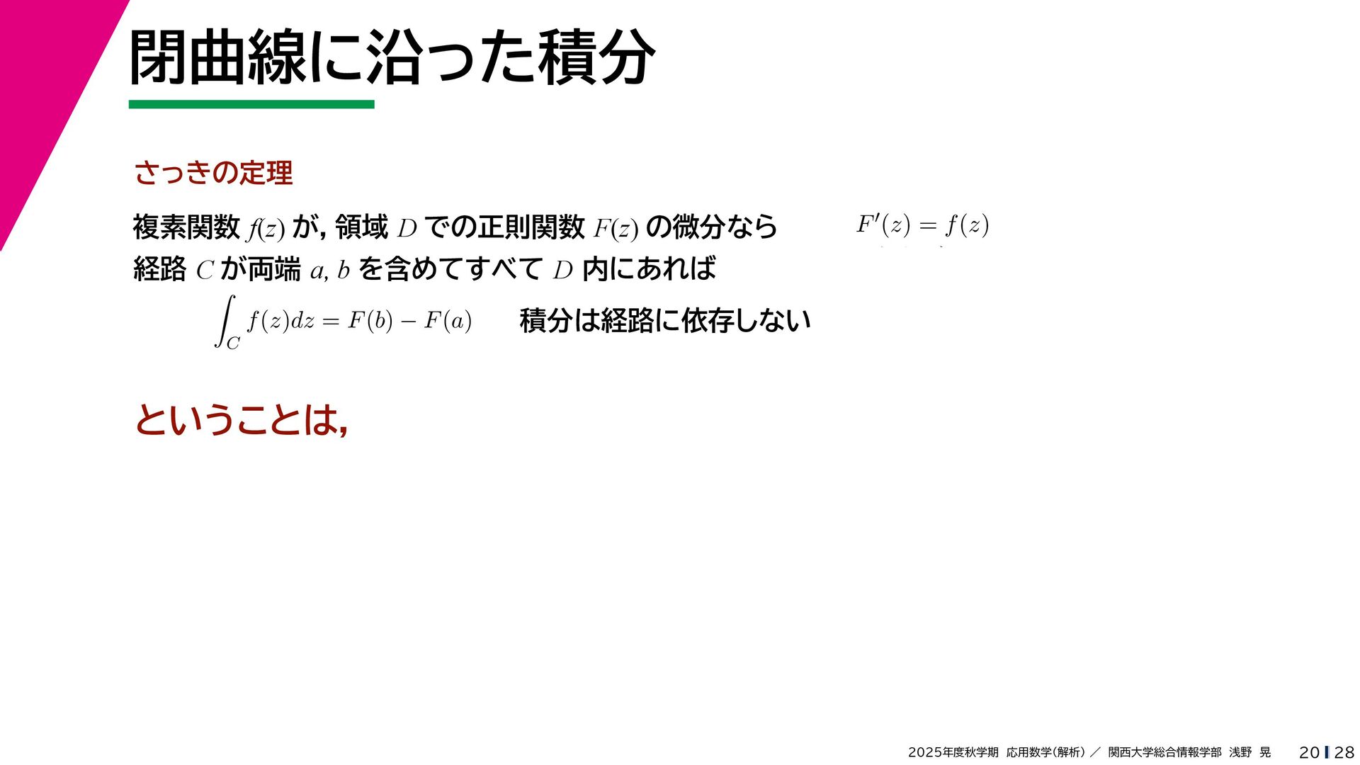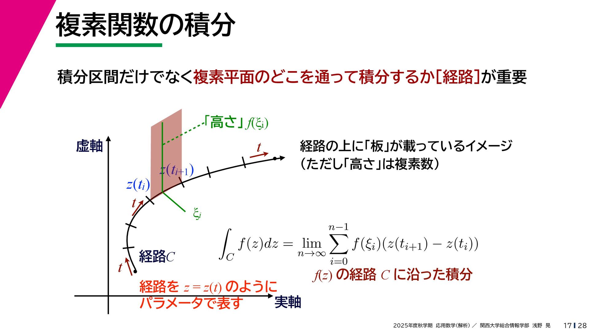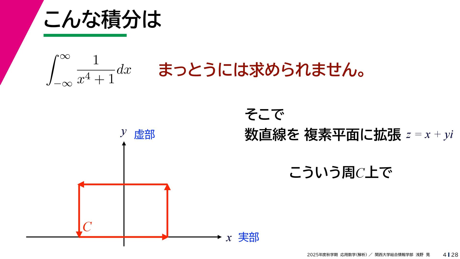 + yi (x + Δx) + yi x + (y + Δy)i この2通りの近づき方で極限値は等しいので を2通りの近づき方で表す f′ (z) f′(z) = lim ∆x→0 {u(x + ∆x, y) + iv(x + ∆x, y)} − {u(x, y) + iv(x, y)} ((x + ∆x) + yi) − (x + yi) = lim ∆x→0 u(x + ∆x, y) − u(x, y) ∆x + i lim ∆x→0 v(x + ∆x, y) − v(x, y) ∆x = ∂u ∂x + i ∂v ∂x f′(z) = lim ∆y→0 {u(x, y + ∆y) + iv(x, y + ∆y)} − {u(x, y) + iv(x, y)} (x + (y + ∆y)i) − (x + yi) = lim ∆y→0 u(x, y + ∆y) − u(x, y) i∆y + i lim ∆x→0 v(x, y + ∆y) − v(x, y) i∆y = −i lim ∆y→0 u(x, y + ∆y) − u(x, y) ∆y + lim ∆x→0 v(x, y + ∆y) − v(x, y) ∆y = ∂v ∂y − i ∂u ∂y これらが実部・虚部とも等しい