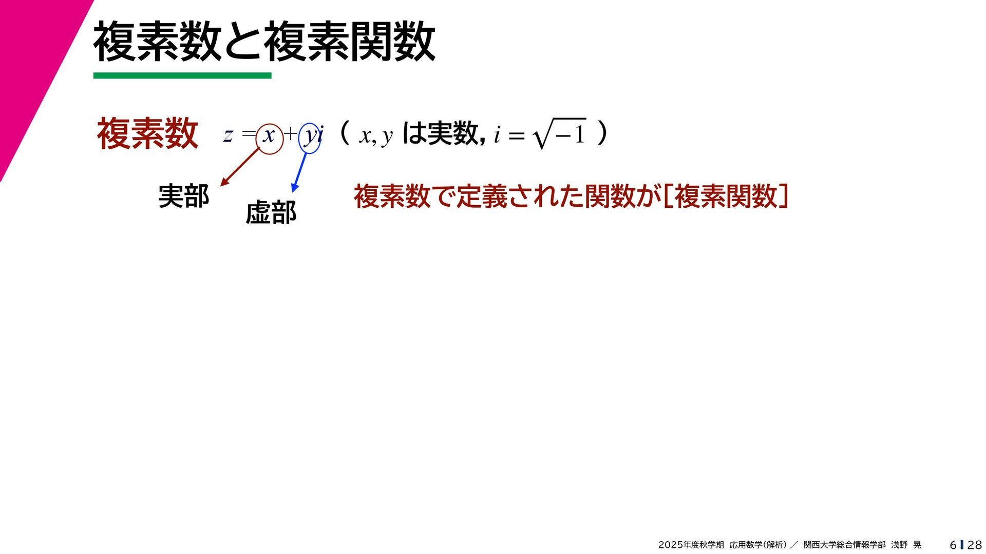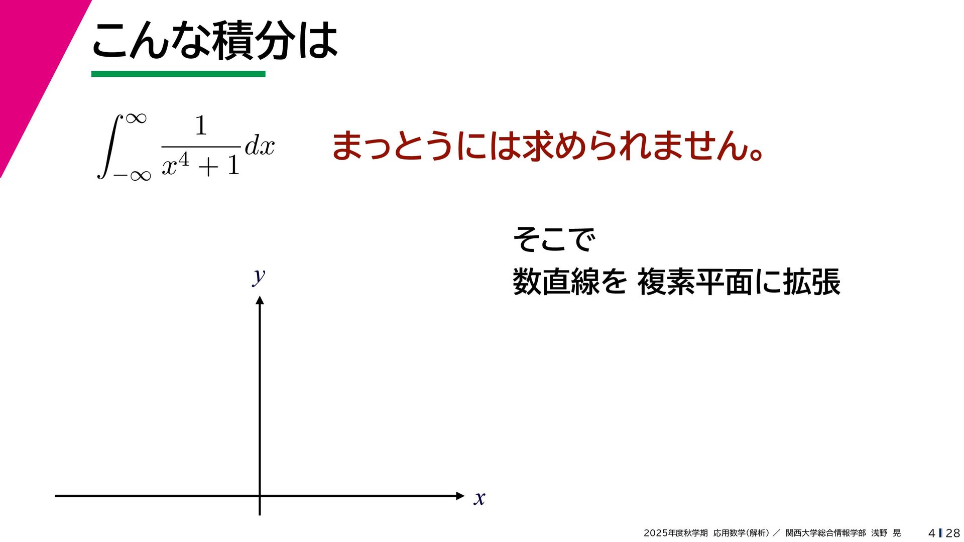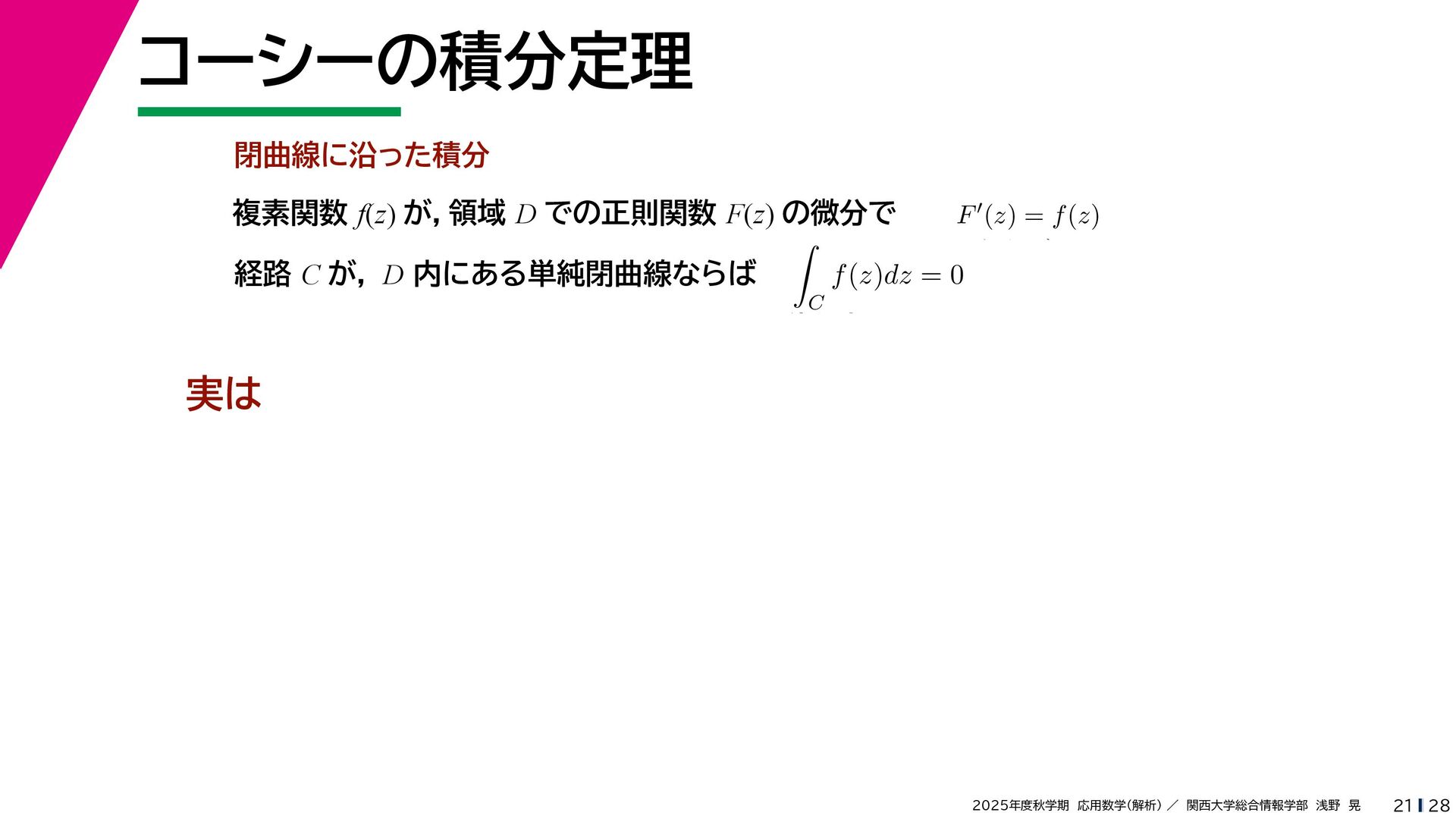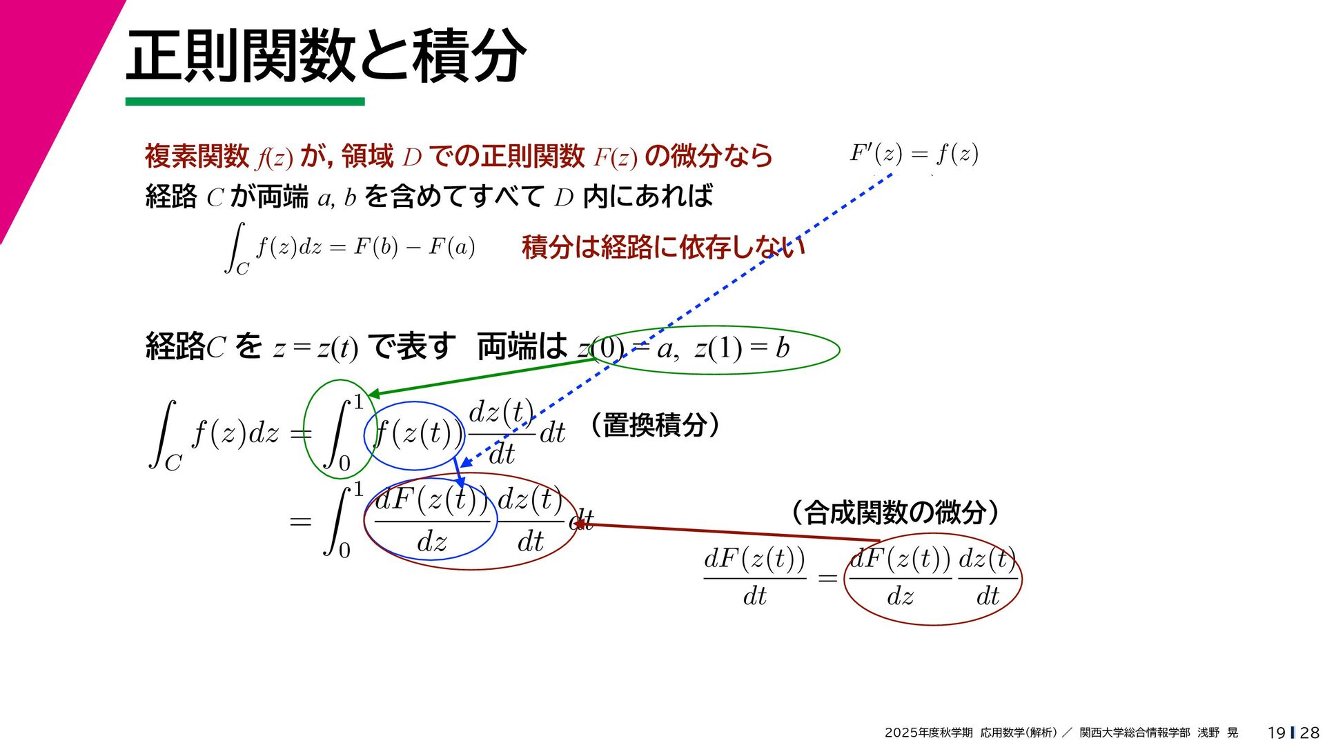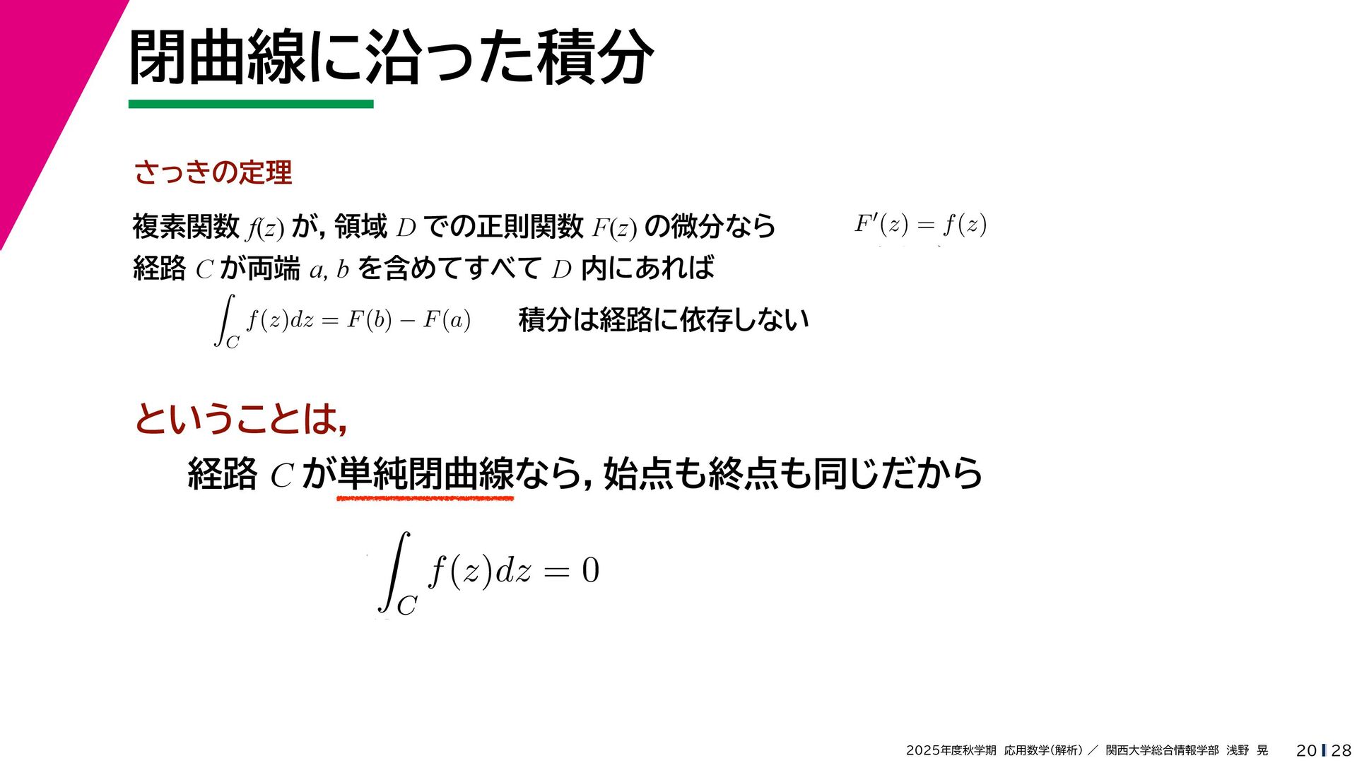 + yi (x + Δx) + yi x + (y + Δy)i この2通りの近づき方で極限値は等しいので を2通りの近づき方で表す f′ (z) f′(z) = lim ∆x→0 {u(x + ∆x, y) + iv(x + ∆x, y)} − {u(x, y) + iv(x, y)} ((x + ∆x) + yi) − (x + yi) = lim ∆x→0 u(x + ∆x, y) − u(x, y) ∆x + i lim ∆x→0 v(x + ∆x, y) − v(x, y) ∆x = ∂u ∂x + i ∂v ∂x f′(z) = lim ∆y→0 {u(x, y + ∆y) + iv(x, y + ∆y)} − {u(x, y) + iv(x, y)} (x + (y + ∆y)i) − (x + yi) = lim ∆y→0 u(x, y + ∆y) − u(x, y) i∆y + i lim ∆x→0 v(x, y + ∆y) − v(x, y) i∆y = −i lim ∆y→0 u(x, y + ∆y) − u(x, y) ∆y + lim ∆x→0 v(x, y + ∆y) − v(x, y) ∆y = ∂v ∂y − i ∂u ∂y これらが実部・虚部とも等しい