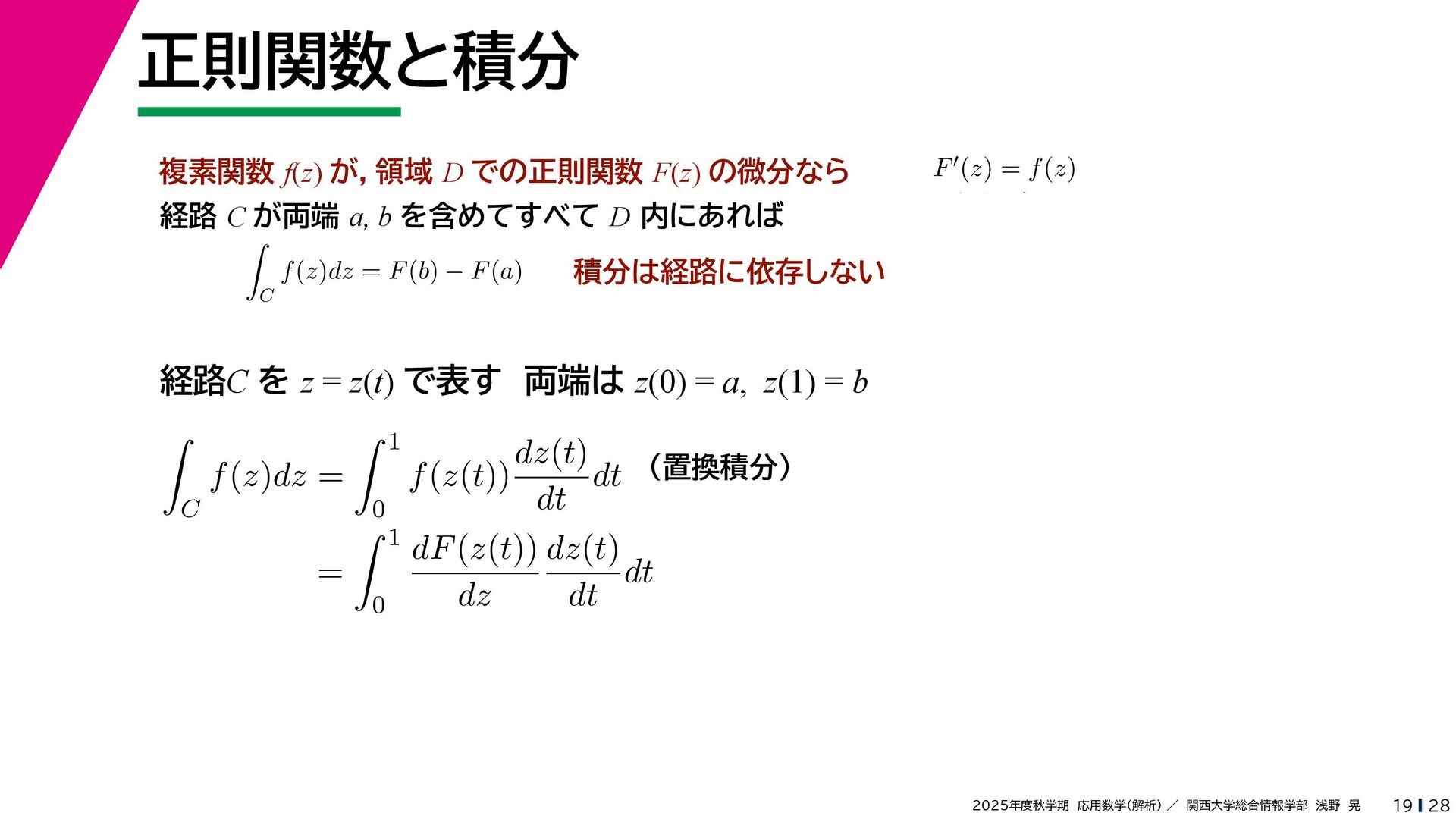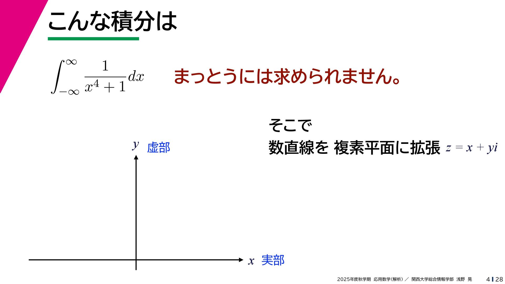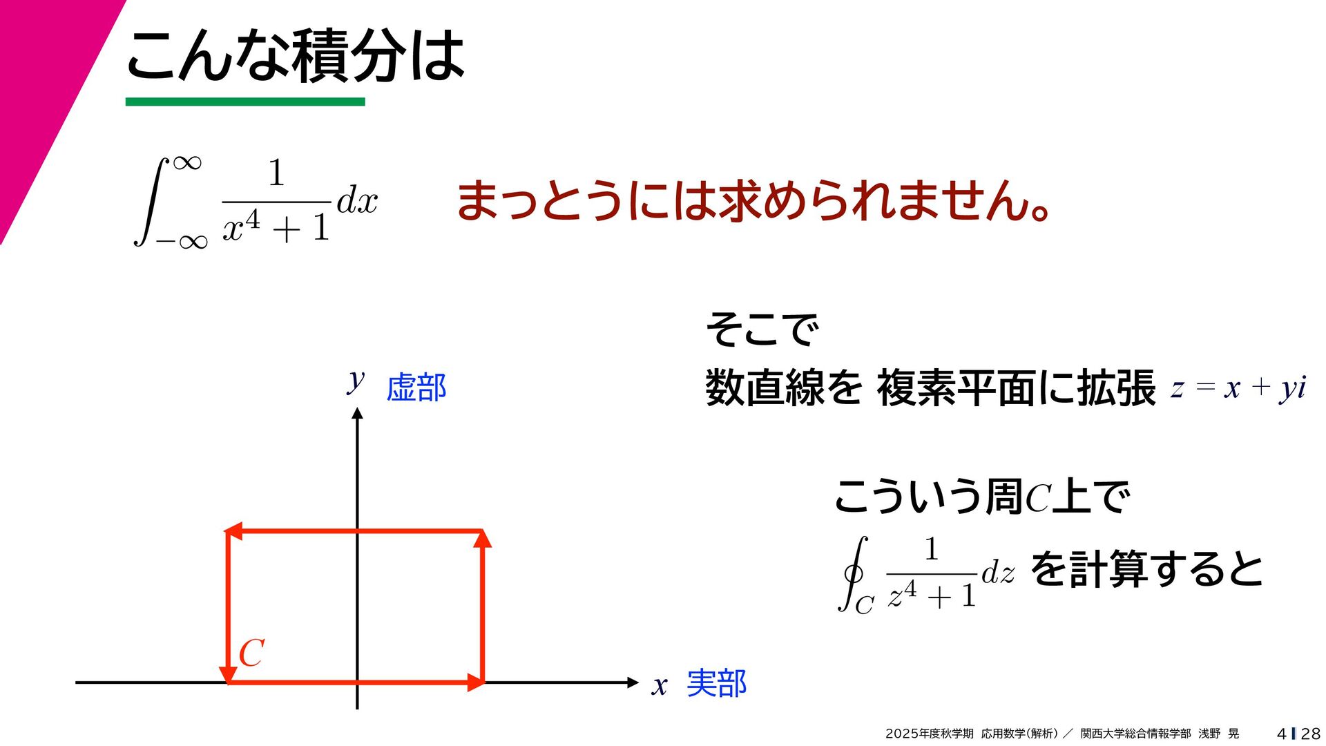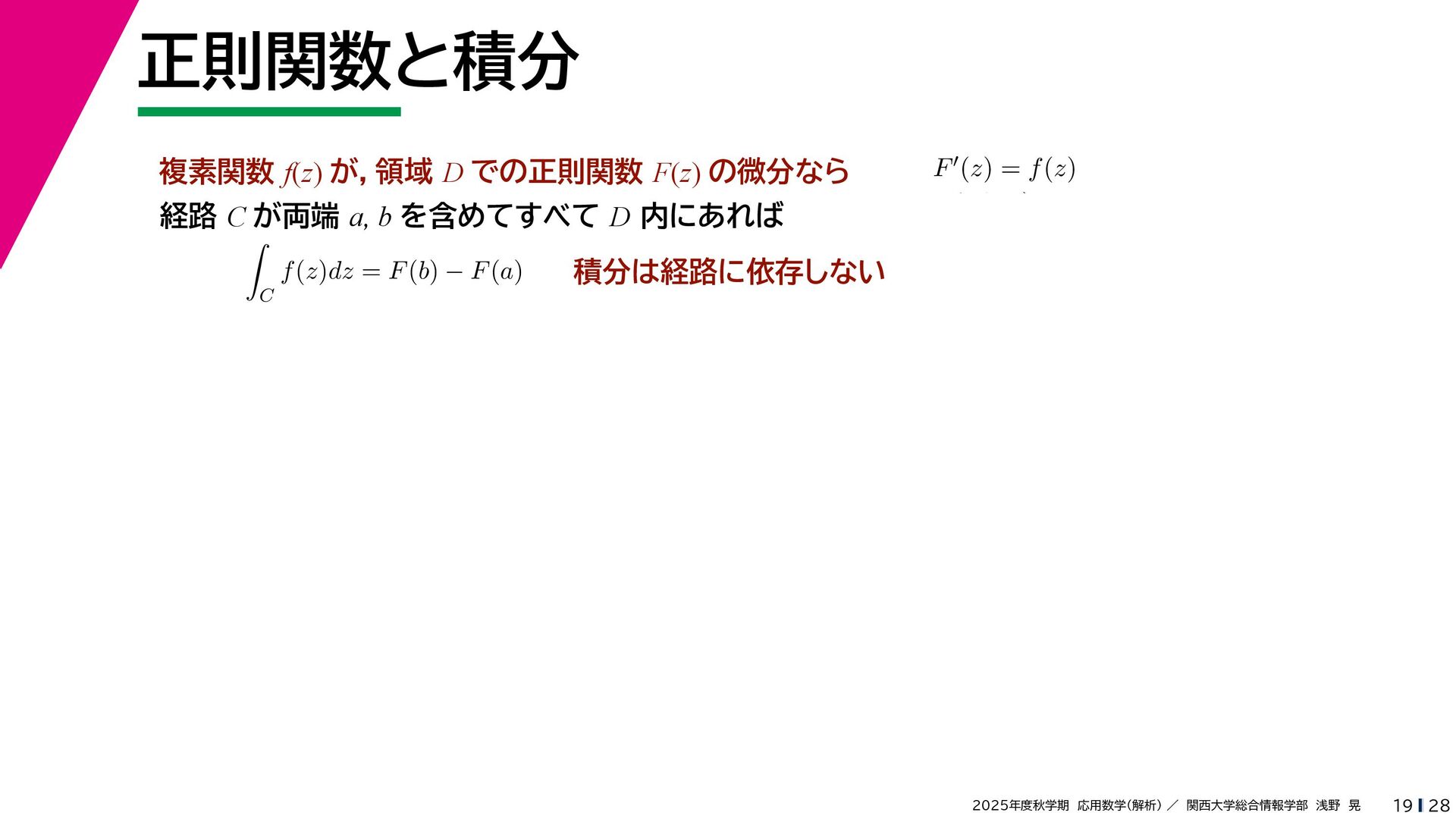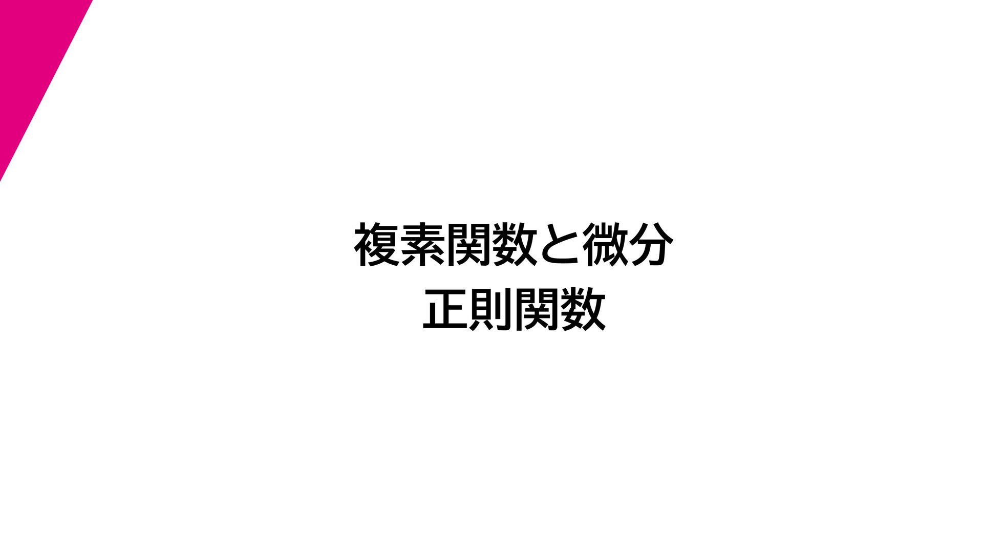 + yi (x + Δx) + yi x + (y + Δy)i この2通りの近づき方で極限値は等しいので を2通りの近づき方で表す f′ (z) f′(z) = lim ∆x→0 {u(x + ∆x, y) + iv(x + ∆x, y)} − {u(x, y) + iv(x, y)} ((x + ∆x) + yi) − (x + yi) = lim ∆x→0 u(x + ∆x, y) − u(x, y) ∆x + i lim ∆x→0 v(x + ∆x, y) − v(x, y) ∆x = ∂u ∂x + i ∂v ∂x f′(z) = lim ∆y→0 {u(x, y + ∆y) + iv(x, y + ∆y)} − {u(x, y) + iv(x, y)} (x + (y + ∆y)i) − (x + yi) = lim ∆y→0 u(x, y + ∆y) − u(x, y) i∆y + i lim ∆x→0 v(x, y + ∆y) − v(x, y) i∆y = −i lim ∆y→0 u(x, y + ∆y) − u(x, y) ∆y + lim ∆x→0 v(x, y + ∆y) − v(x, y) ∆y = ∂v ∂y − i ∂u ∂y これらが実部・虚部とも等しい