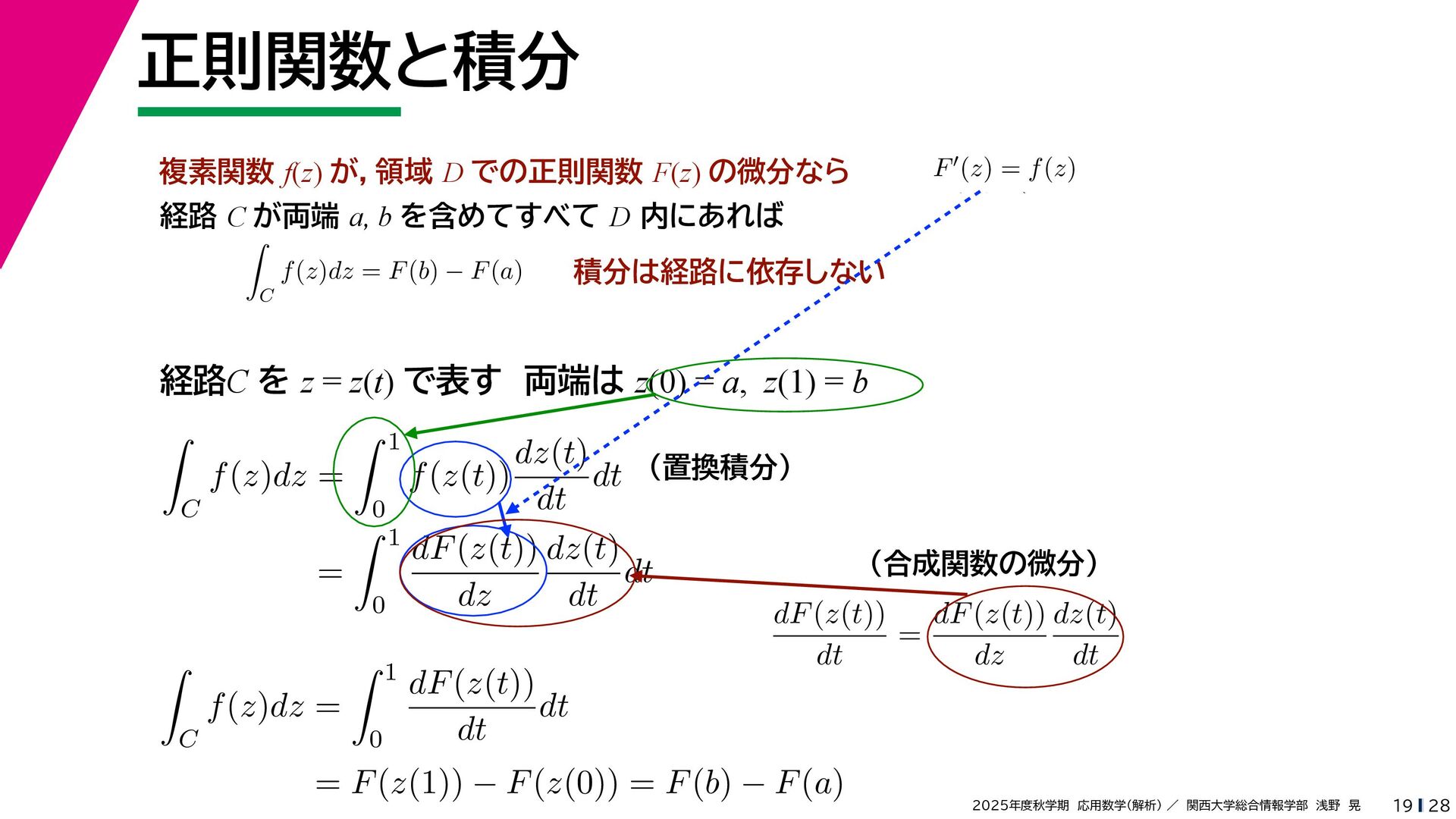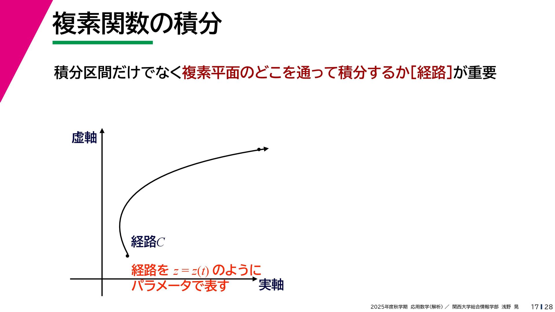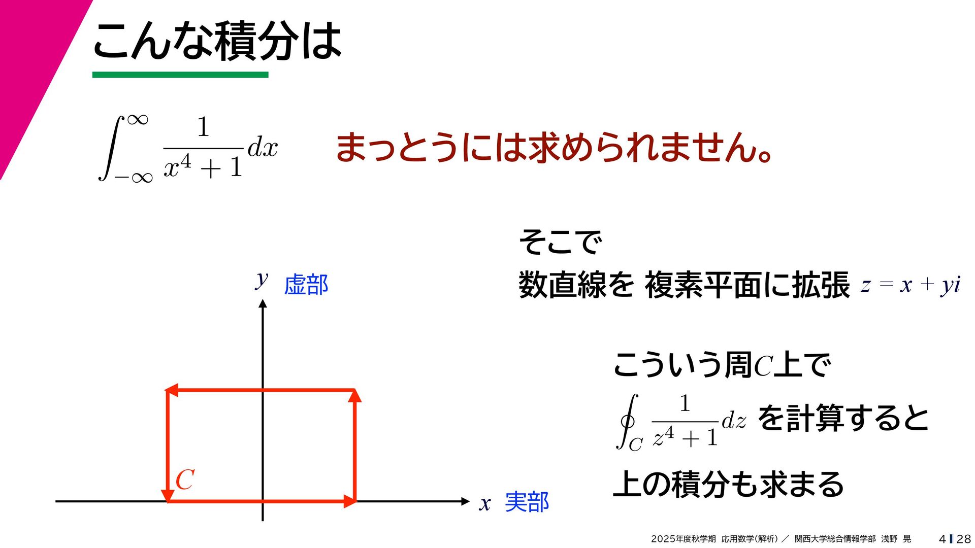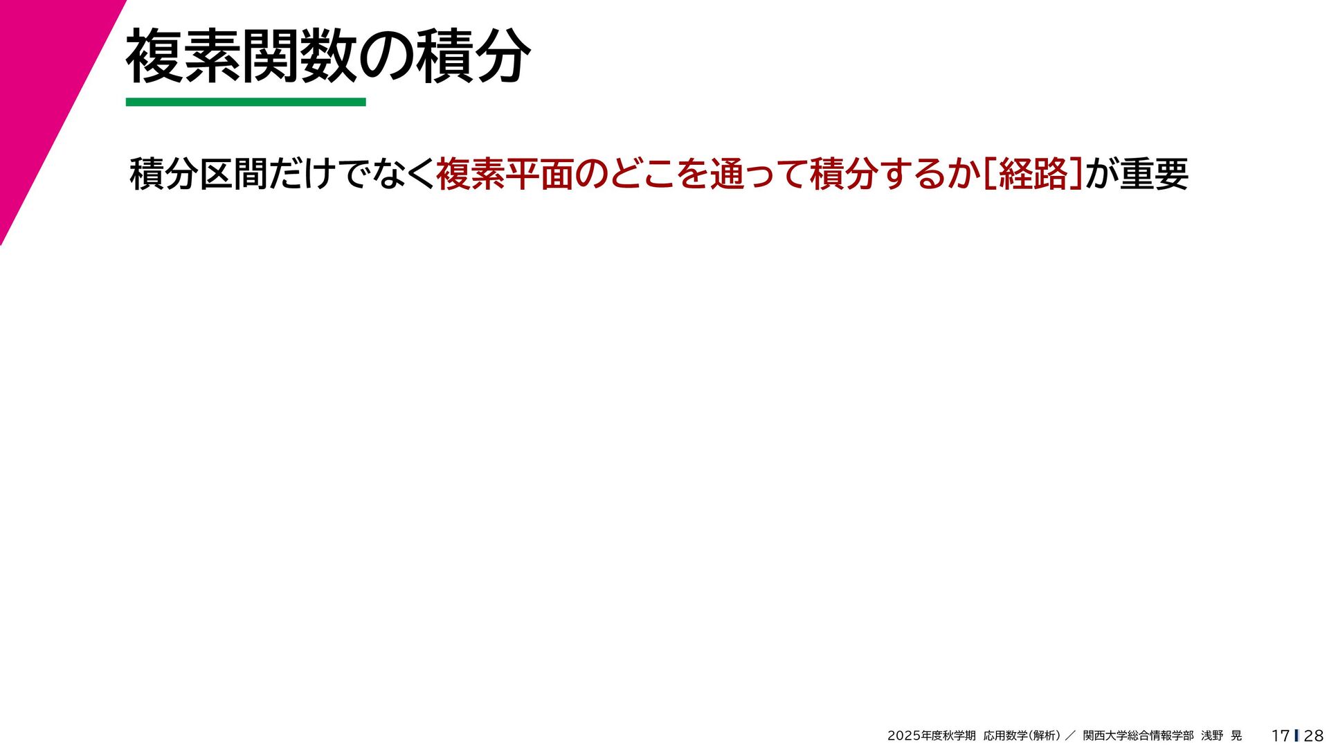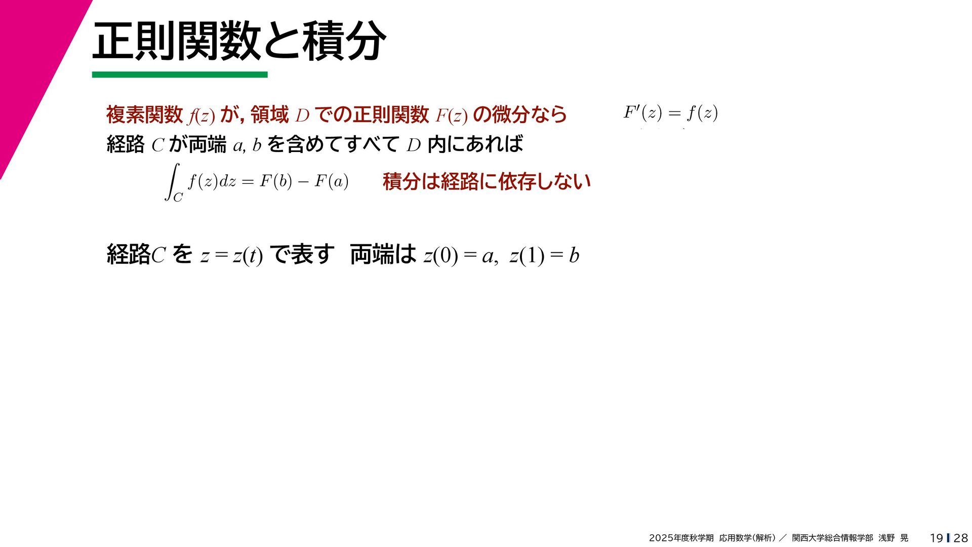 + yi (x + Δx) + yi x + (y + Δy)i この2通りの近づき方で極限値は等しいので を2通りの近づき方で表す f′ (z) f′(z) = lim ∆x→0 {u(x + ∆x, y) + iv(x + ∆x, y)} − {u(x, y) + iv(x, y)} ((x + ∆x) + yi) − (x + yi) = lim ∆x→0 u(x + ∆x, y) − u(x, y) ∆x + i lim ∆x→0 v(x + ∆x, y) − v(x, y) ∆x = ∂u ∂x + i ∂v ∂x f′(z) = lim ∆y→0 {u(x, y + ∆y) + iv(x, y + ∆y)} − {u(x, y) + iv(x, y)} (x + (y + ∆y)i) − (x + yi) = lim ∆y→0 u(x, y + ∆y) − u(x, y) i∆y + i lim ∆x→0 v(x, y + ∆y) − v(x, y) i∆y = −i lim ∆y→0 u(x, y + ∆y) − u(x, y) ∆y + lim ∆x→0 v(x, y + ∆y) − v(x, y) ∆y = ∂v ∂y − i ∂u ∂y これらが実部・虚部とも等しい