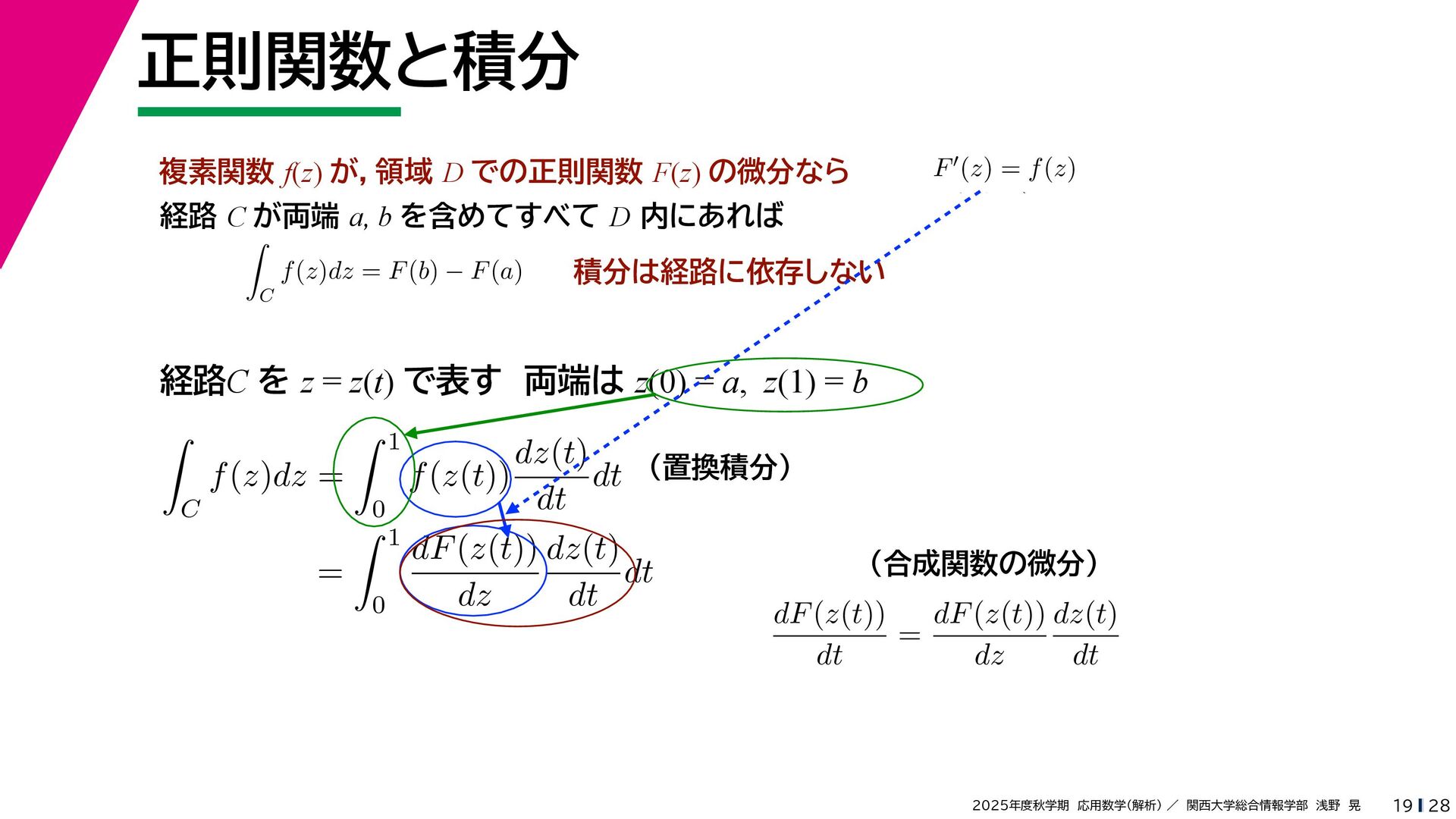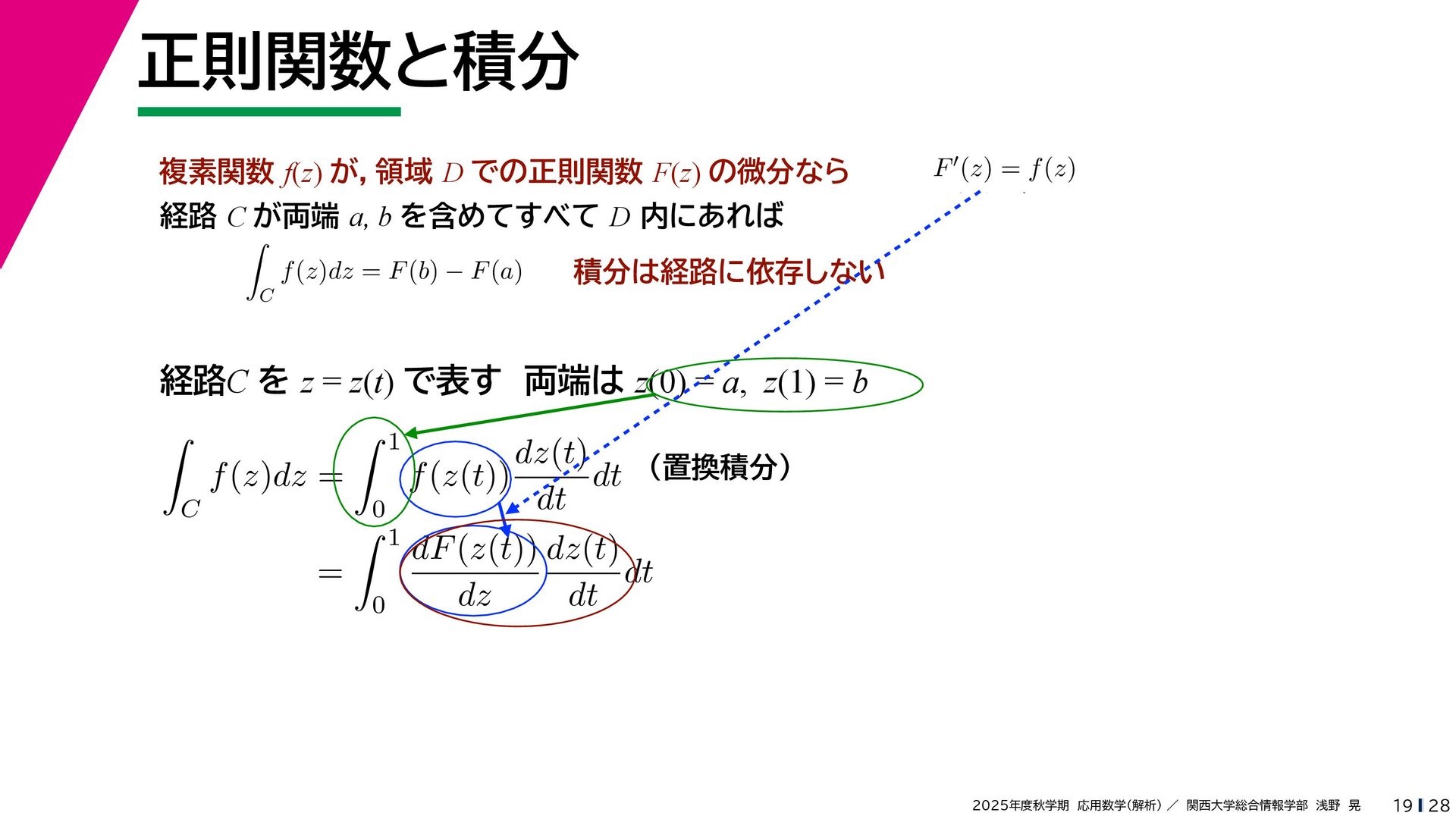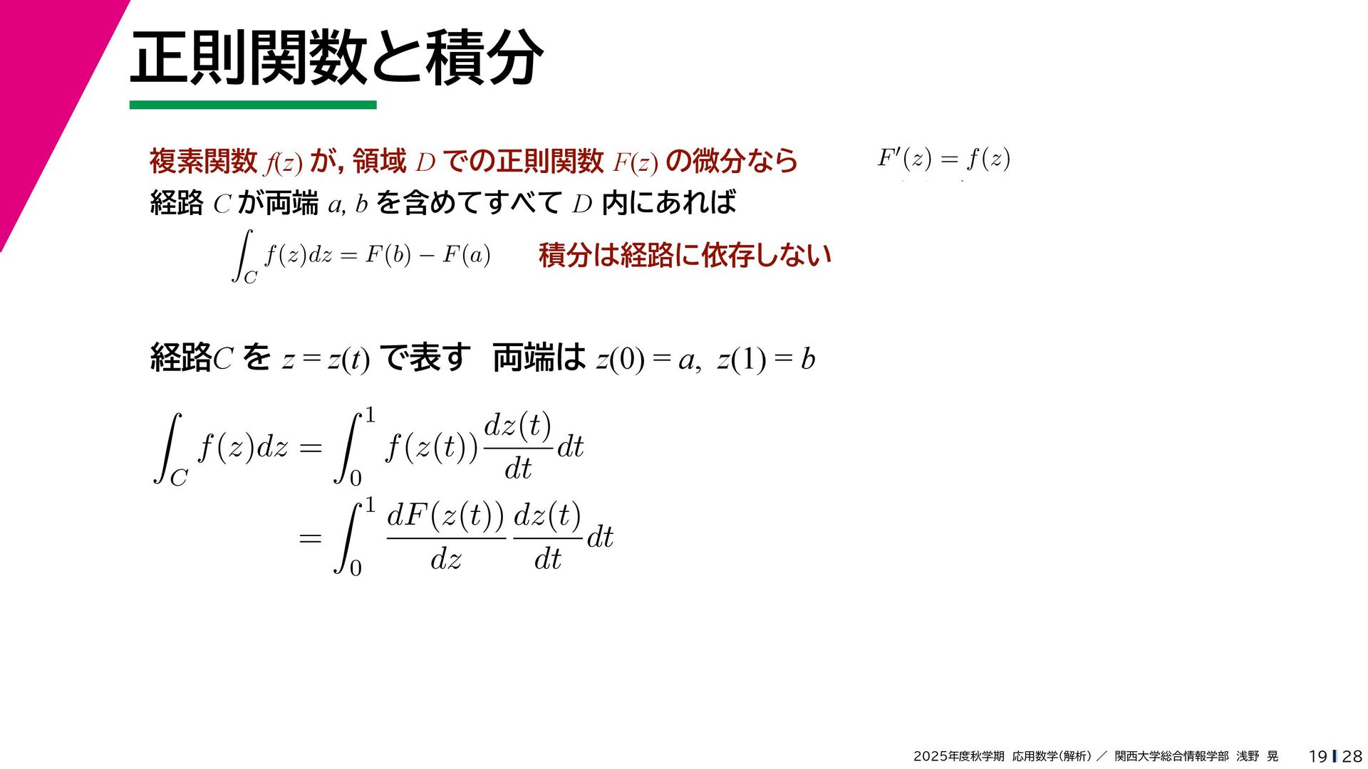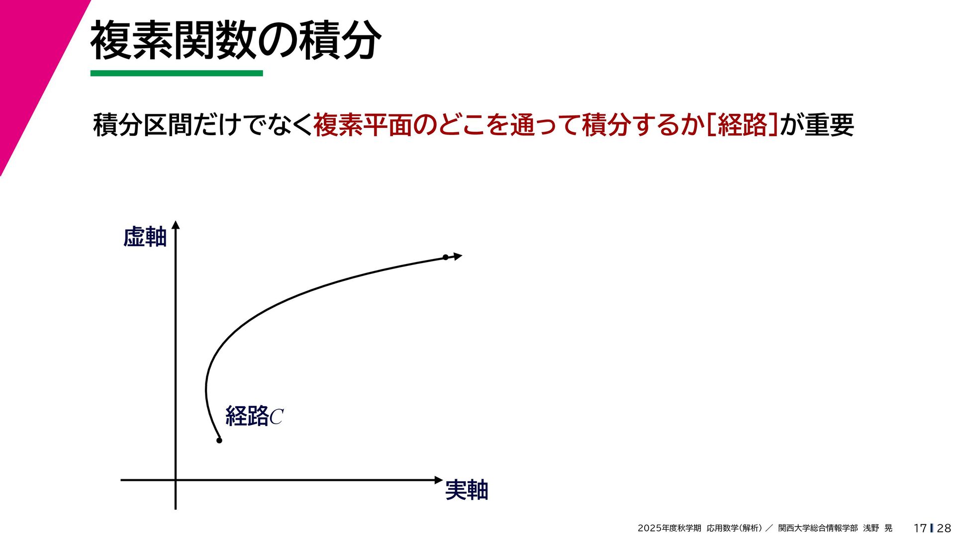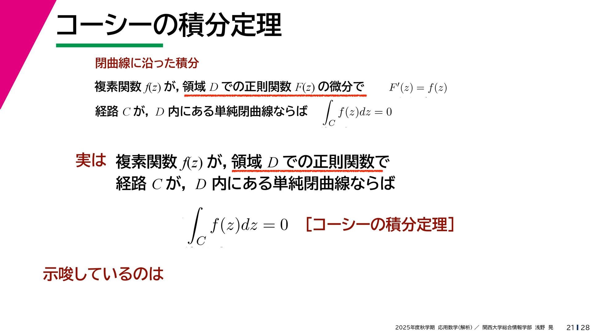 + yi (x + Δx) + yi x + (y + Δy)i この2通りの近づき方で極限値は等しいので を2通りの近づき方で表す f′ (z) f′(z) = lim ∆x→0 {u(x + ∆x, y) + iv(x + ∆x, y)} − {u(x, y) + iv(x, y)} ((x + ∆x) + yi) − (x + yi) = lim ∆x→0 u(x + ∆x, y) − u(x, y) ∆x + i lim ∆x→0 v(x + ∆x, y) − v(x, y) ∆x = ∂u ∂x + i ∂v ∂x f′(z) = lim ∆y→0 {u(x, y + ∆y) + iv(x, y + ∆y)} − {u(x, y) + iv(x, y)} (x + (y + ∆y)i) − (x + yi) = lim ∆y→0 u(x, y + ∆y) − u(x, y) i∆y + i lim ∆x→0 v(x, y + ∆y) − v(x, y) i∆y = −i lim ∆y→0 u(x, y + ∆y) − u(x, y) ∆y + lim ∆x→0 v(x, y + ∆y) − v(x, y) ∆y = ∂v ∂y − i ∂u ∂y これらが実部・虚部とも等しい