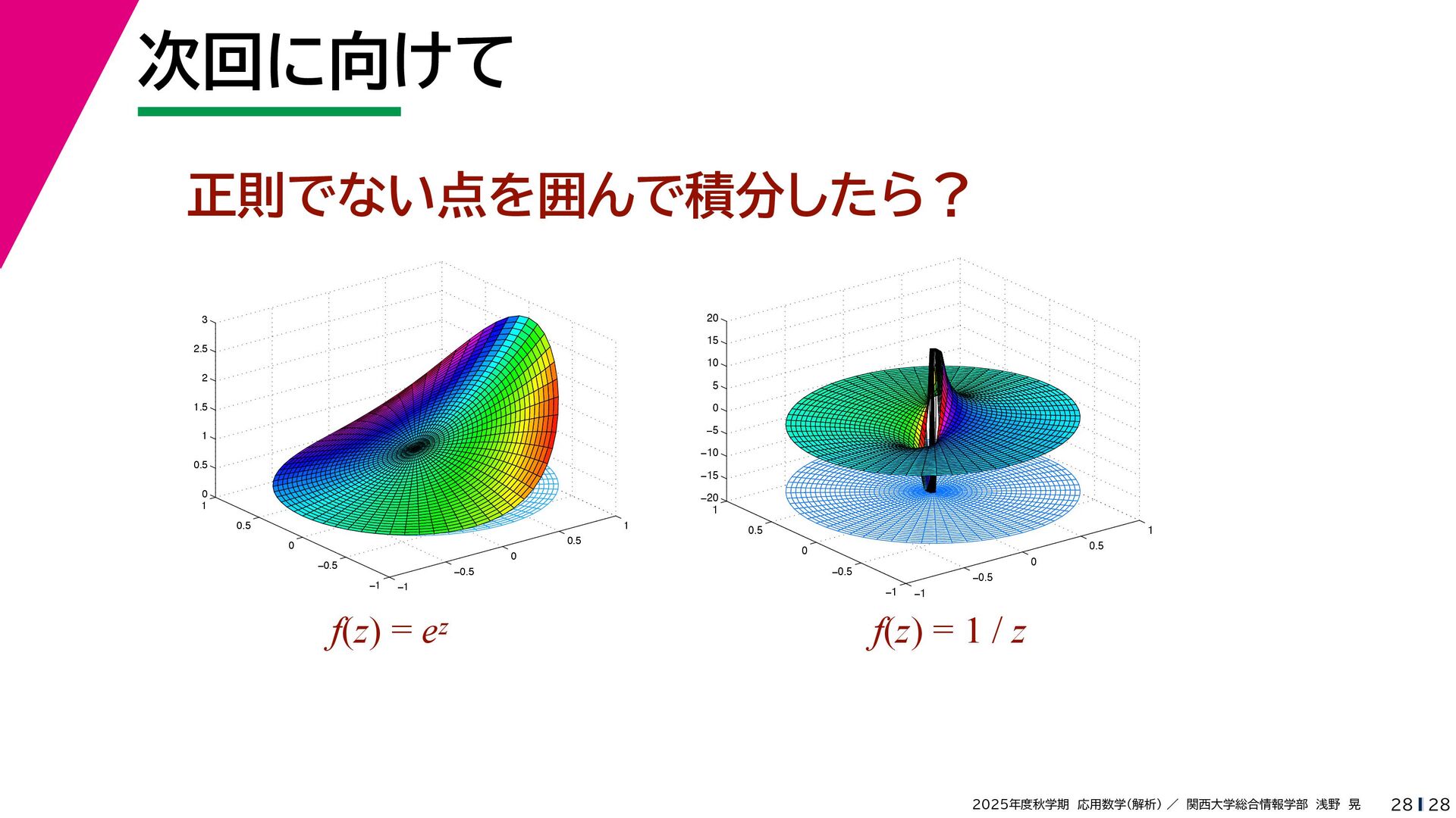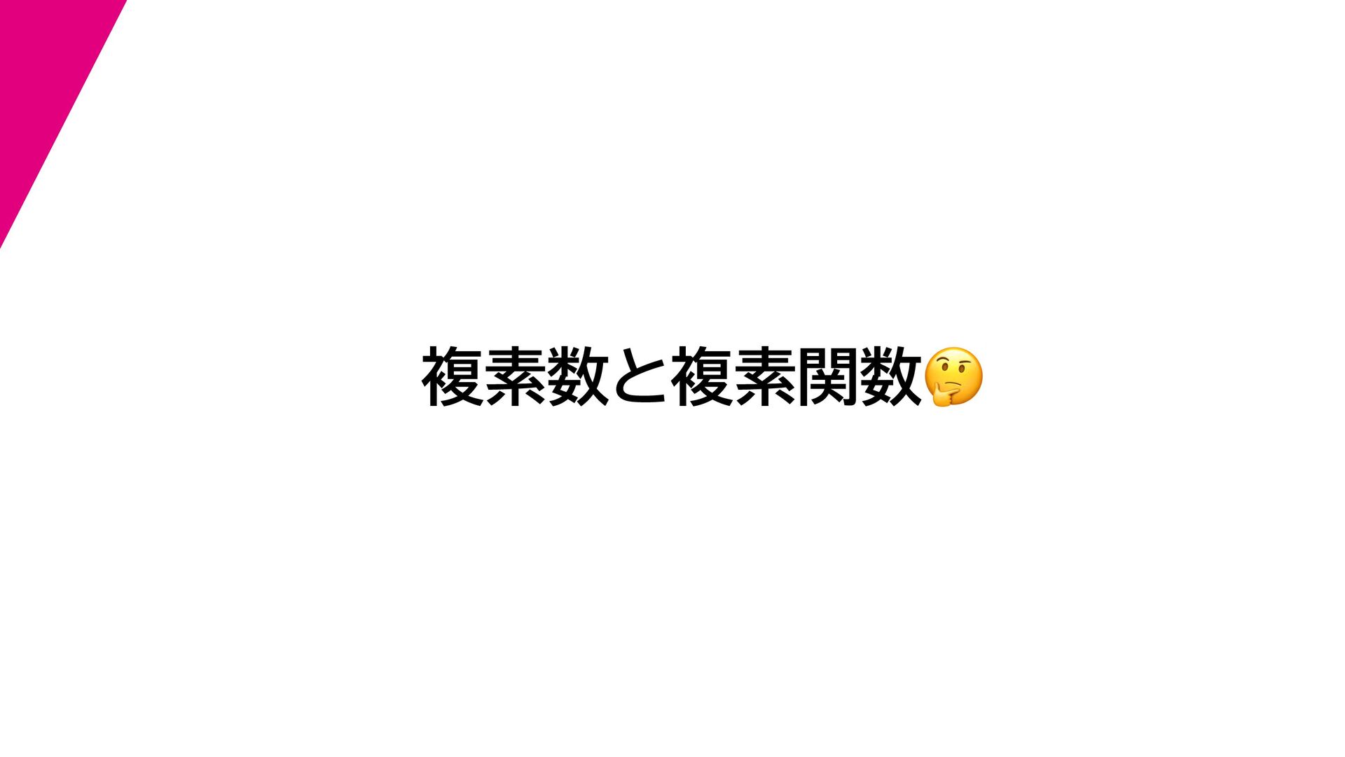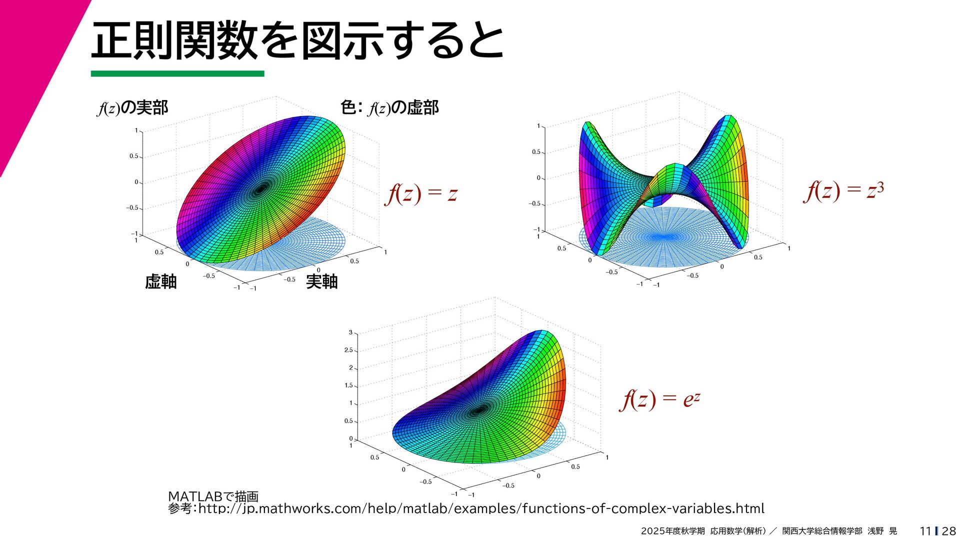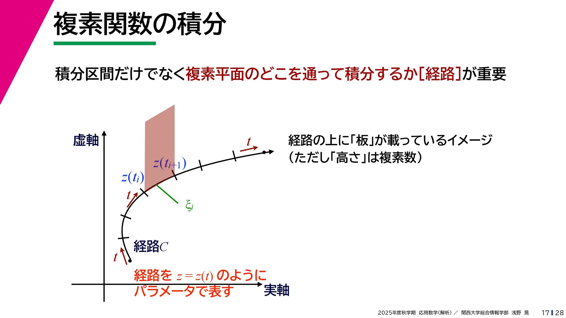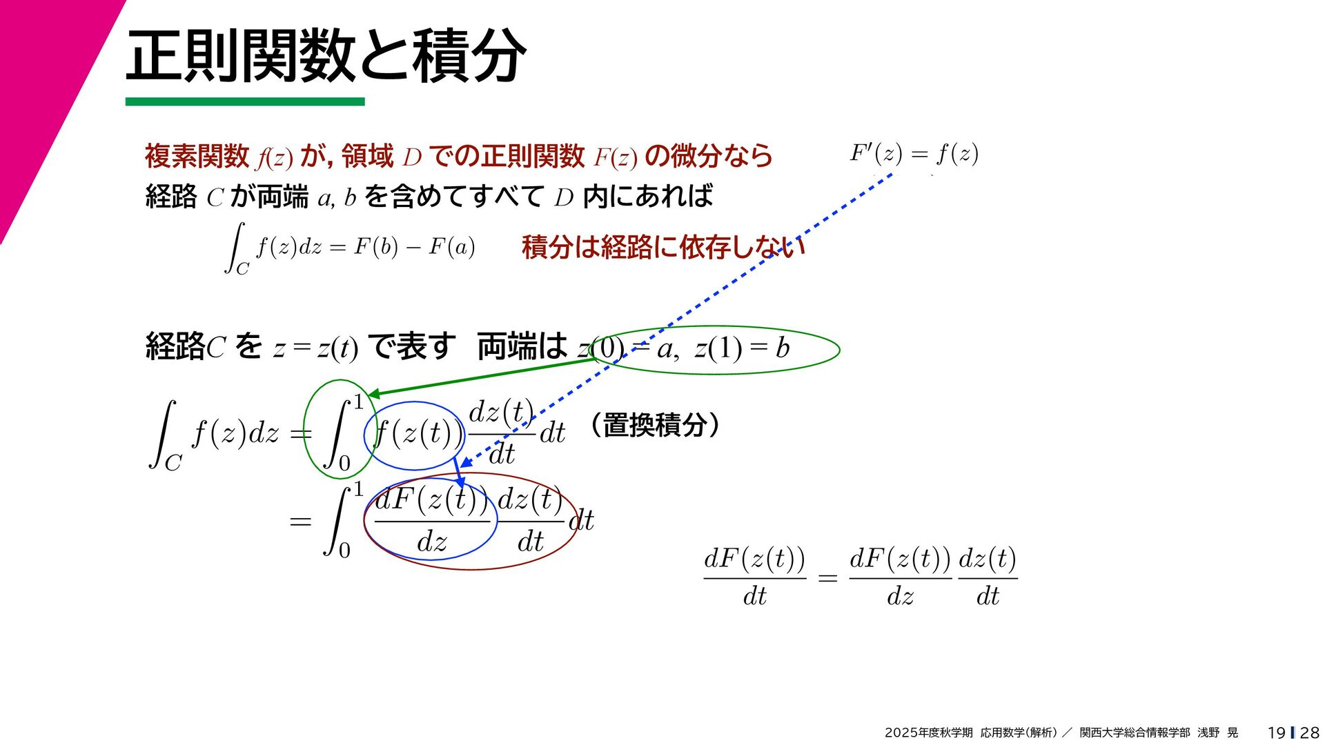 + yi (x + Δx) + yi x + (y + Δy)i この2通りの近づき方で極限値は等しいので を2通りの近づき方で表す f′ (z) f′(z) = lim ∆x→0 {u(x + ∆x, y) + iv(x + ∆x, y)} − {u(x, y) + iv(x, y)} ((x + ∆x) + yi) − (x + yi) = lim ∆x→0 u(x + ∆x, y) − u(x, y) ∆x + i lim ∆x→0 v(x + ∆x, y) − v(x, y) ∆x = ∂u ∂x + i ∂v ∂x f′(z) = lim ∆y→0 {u(x, y + ∆y) + iv(x, y + ∆y)} − {u(x, y) + iv(x, y)} (x + (y + ∆y)i) − (x + yi) = lim ∆y→0 u(x, y + ∆y) − u(x, y) i∆y + i lim ∆x→0 v(x, y + ∆y) − v(x, y) i∆y = −i lim ∆y→0 u(x, y + ∆y) − u(x, y) ∆y + lim ∆x→0 v(x, y + ∆y) − v(x, y) ∆y = ∂v ∂y − i ∂u ∂y これらが実部・虚部とも等しい