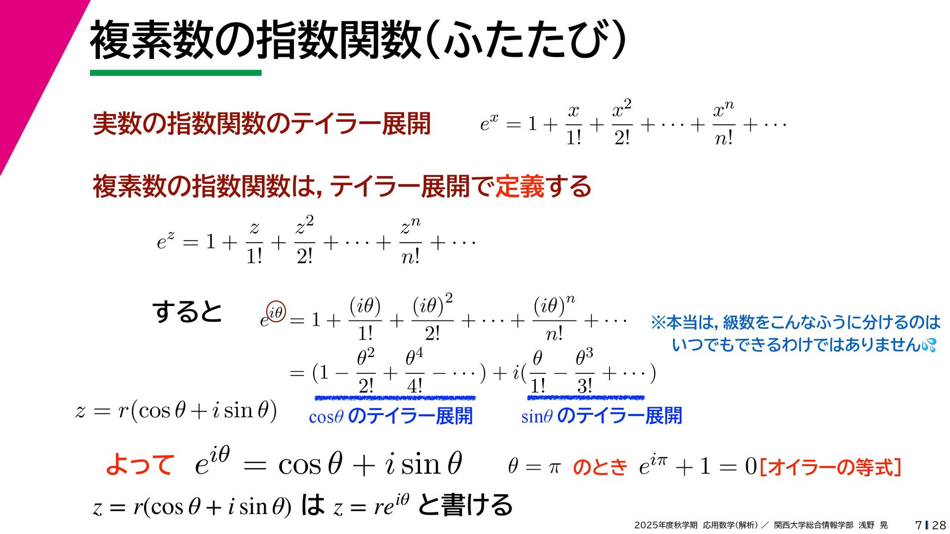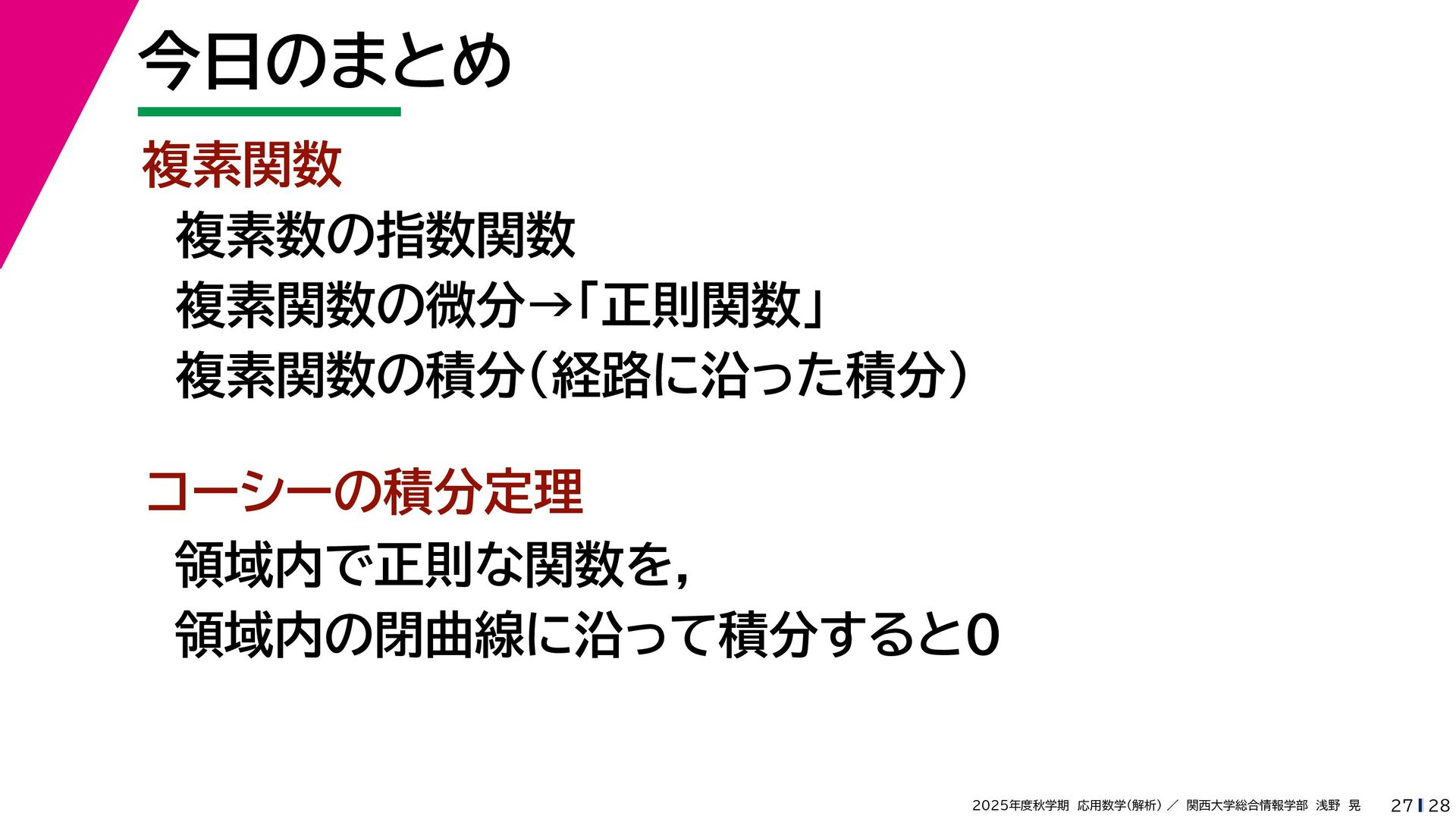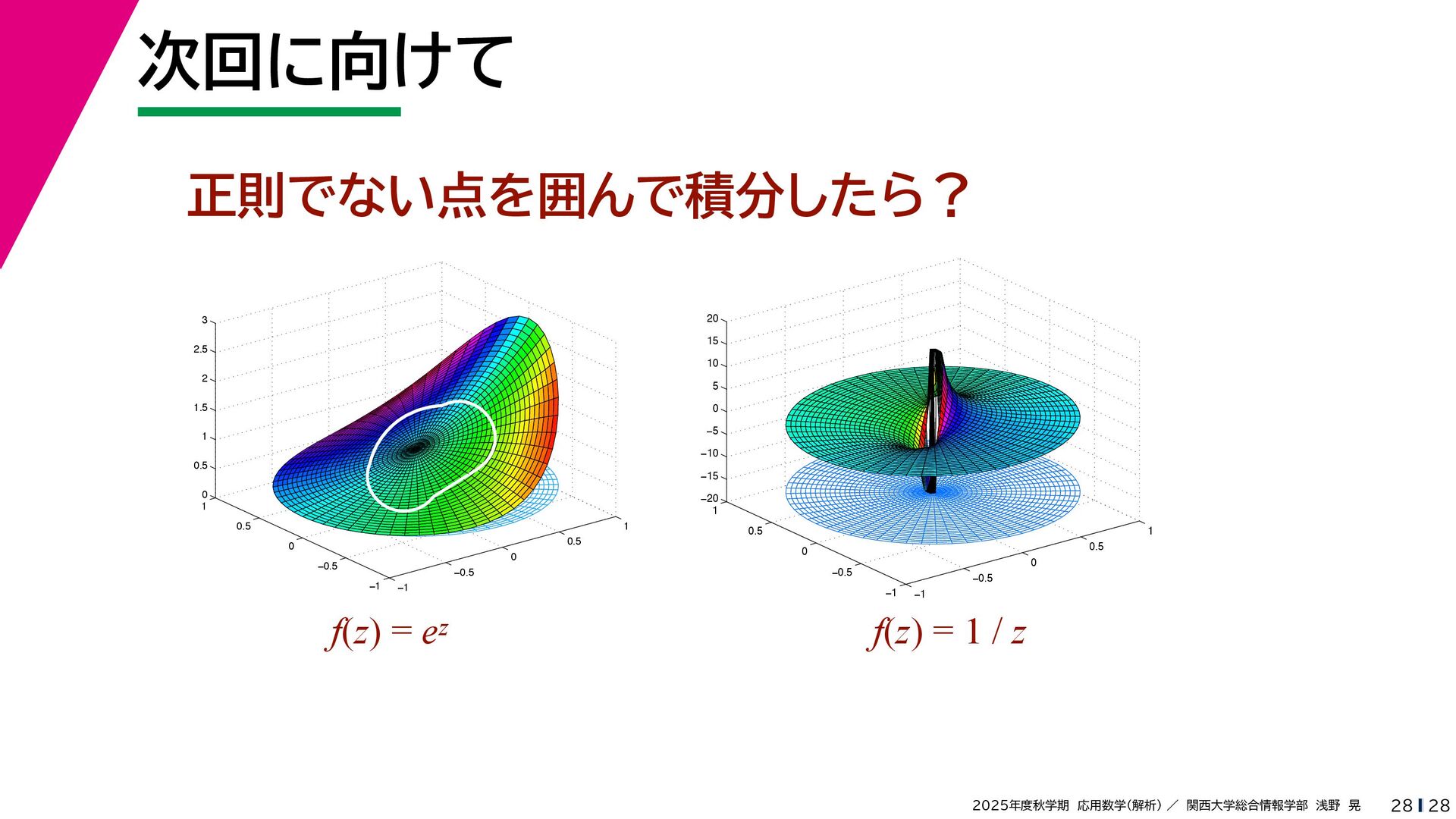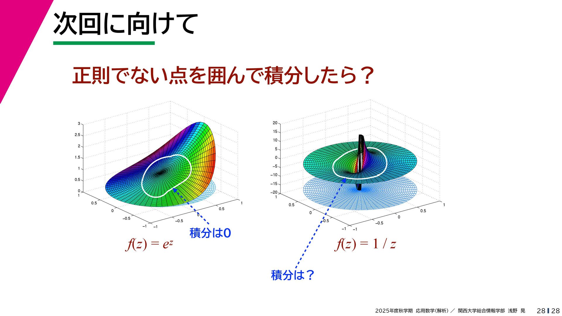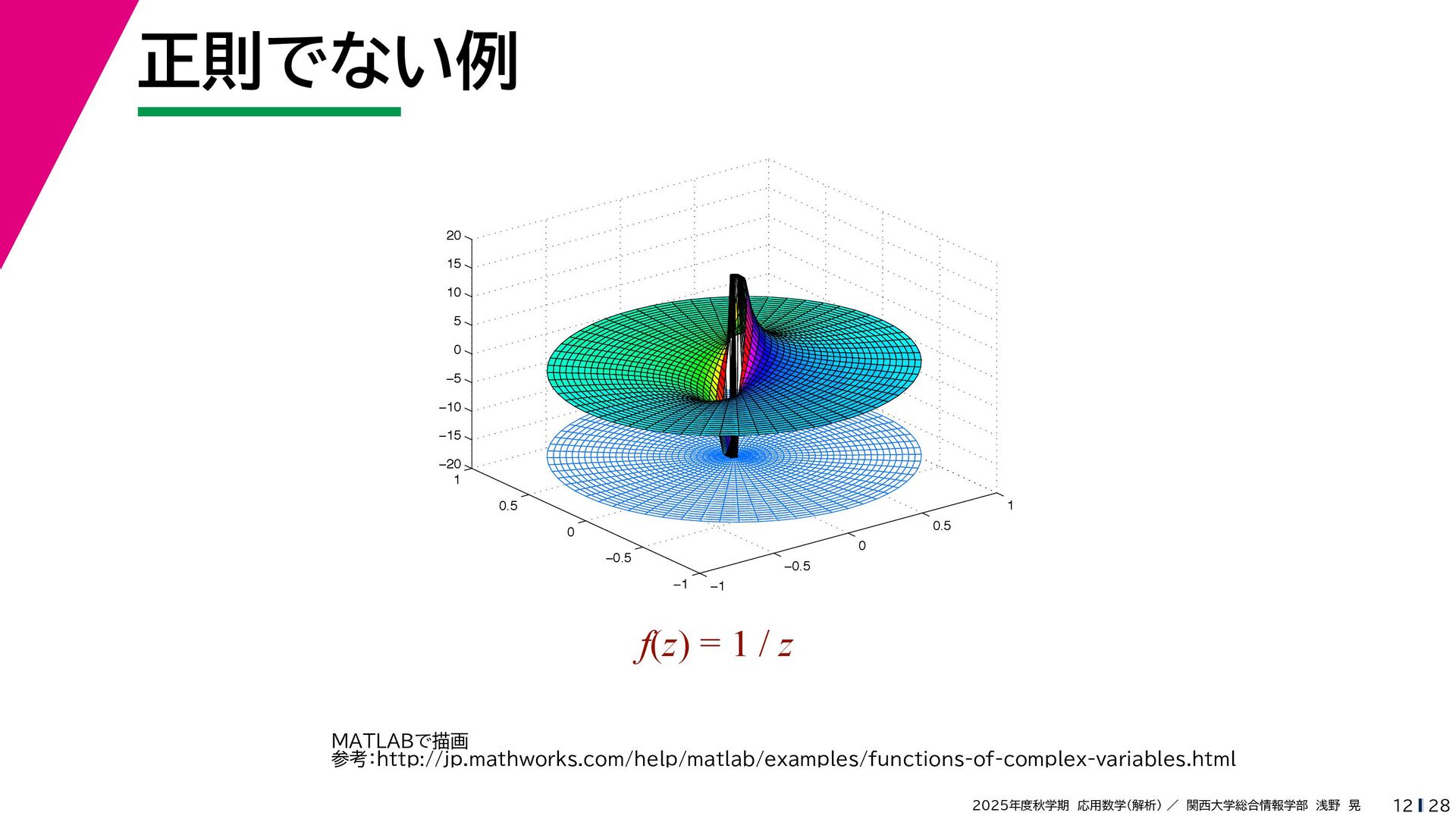 + yi (x + Δx) + yi x + (y + Δy)i この2通りの近づき方で極限値は等しいので を2通りの近づき方で表す f′ (z) f′(z) = lim ∆x→0 {u(x + ∆x, y) + iv(x + ∆x, y)} − {u(x, y) + iv(x, y)} ((x + ∆x) + yi) − (x + yi) = lim ∆x→0 u(x + ∆x, y) − u(x, y) ∆x + i lim ∆x→0 v(x + ∆x, y) − v(x, y) ∆x = ∂u ∂x + i ∂v ∂x f′(z) = lim ∆y→0 {u(x, y + ∆y) + iv(x, y + ∆y)} − {u(x, y) + iv(x, y)} (x + (y + ∆y)i) − (x + yi) = lim ∆y→0 u(x, y + ∆y) − u(x, y) i∆y + i lim ∆x→0 v(x, y + ∆y) − v(x, y) i∆y = −i lim ∆y→0 u(x, y + ∆y) − u(x, y) ∆y + lim ∆x→0 v(x, y + ∆y) − v(x, y) ∆y = ∂v ∂y − i ∂u ∂y これらが実部・虚部とも等しい