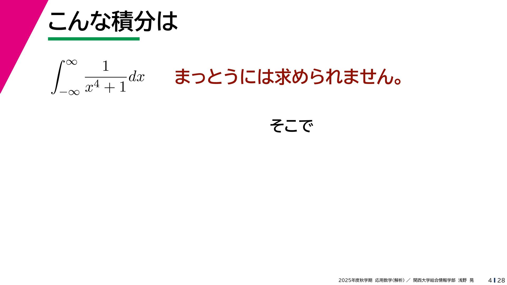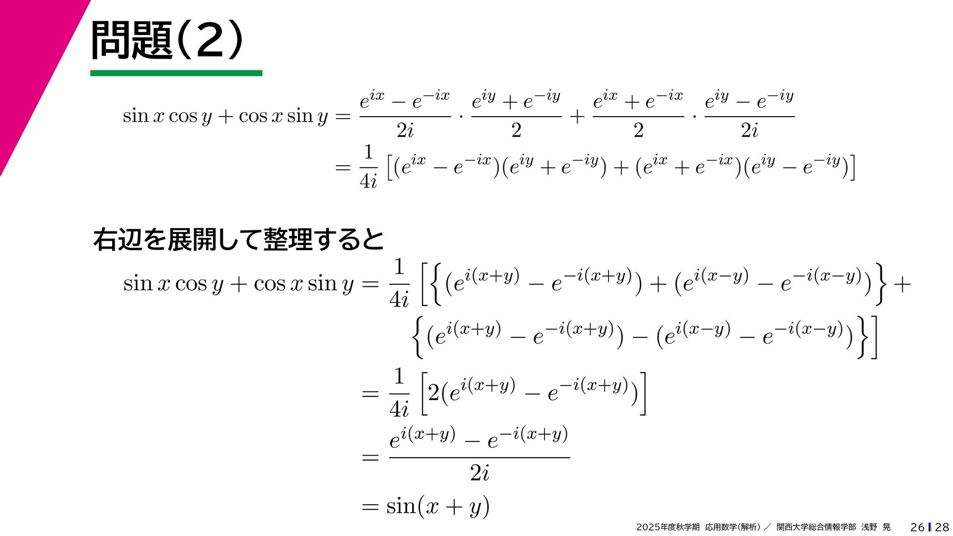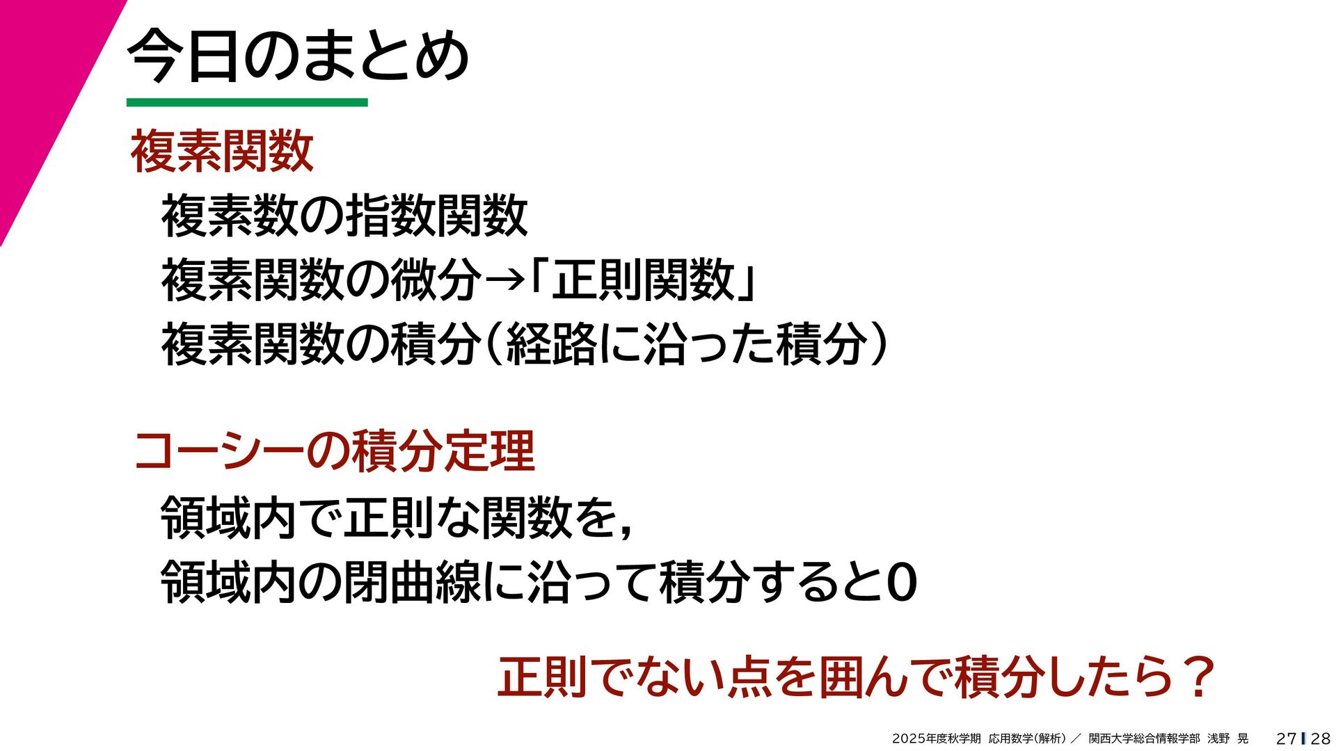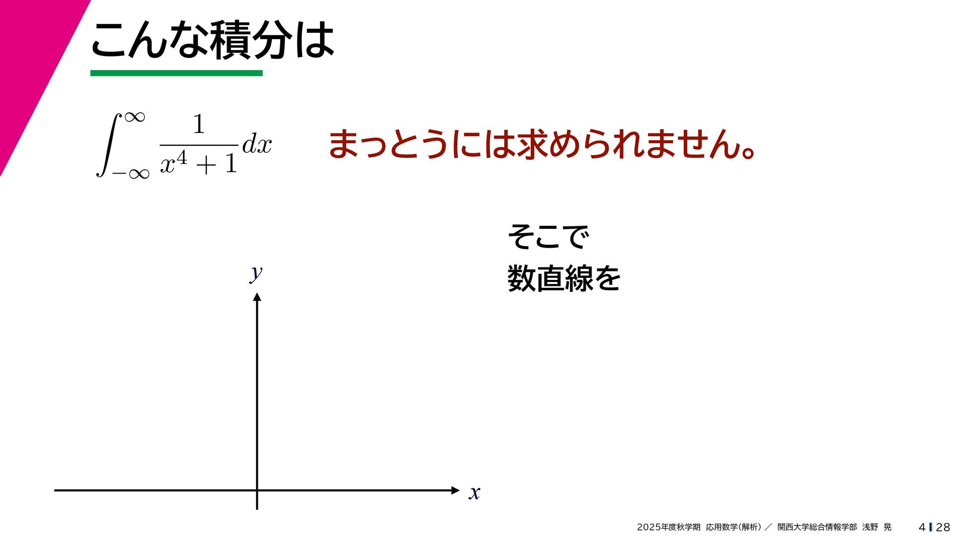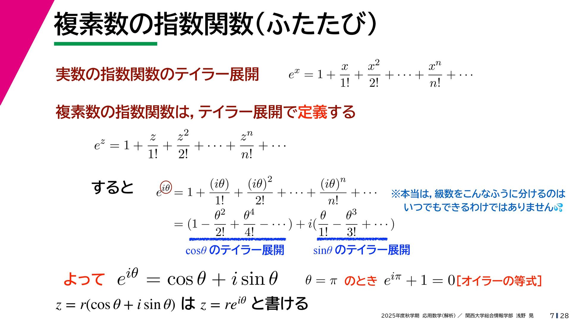 + yi (x + Δx) + yi x + (y + Δy)i この2通りの近づき方で極限値は等しいので を2通りの近づき方で表す f′ (z) f′(z) = lim ∆x→0 {u(x + ∆x, y) + iv(x + ∆x, y)} − {u(x, y) + iv(x, y)} ((x + ∆x) + yi) − (x + yi) = lim ∆x→0 u(x + ∆x, y) − u(x, y) ∆x + i lim ∆x→0 v(x + ∆x, y) − v(x, y) ∆x = ∂u ∂x + i ∂v ∂x f′(z) = lim ∆y→0 {u(x, y + ∆y) + iv(x, y + ∆y)} − {u(x, y) + iv(x, y)} (x + (y + ∆y)i) − (x + yi) = lim ∆y→0 u(x, y + ∆y) − u(x, y) i∆y + i lim ∆x→0 v(x, y + ∆y) − v(x, y) i∆y = −i lim ∆y→0 u(x, y + ∆y) − u(x, y) ∆y + lim ∆x→0 v(x, y + ∆y) − v(x, y) ∆y = ∂v ∂y − i ∂u ∂y これらが実部・虚部とも等しい
