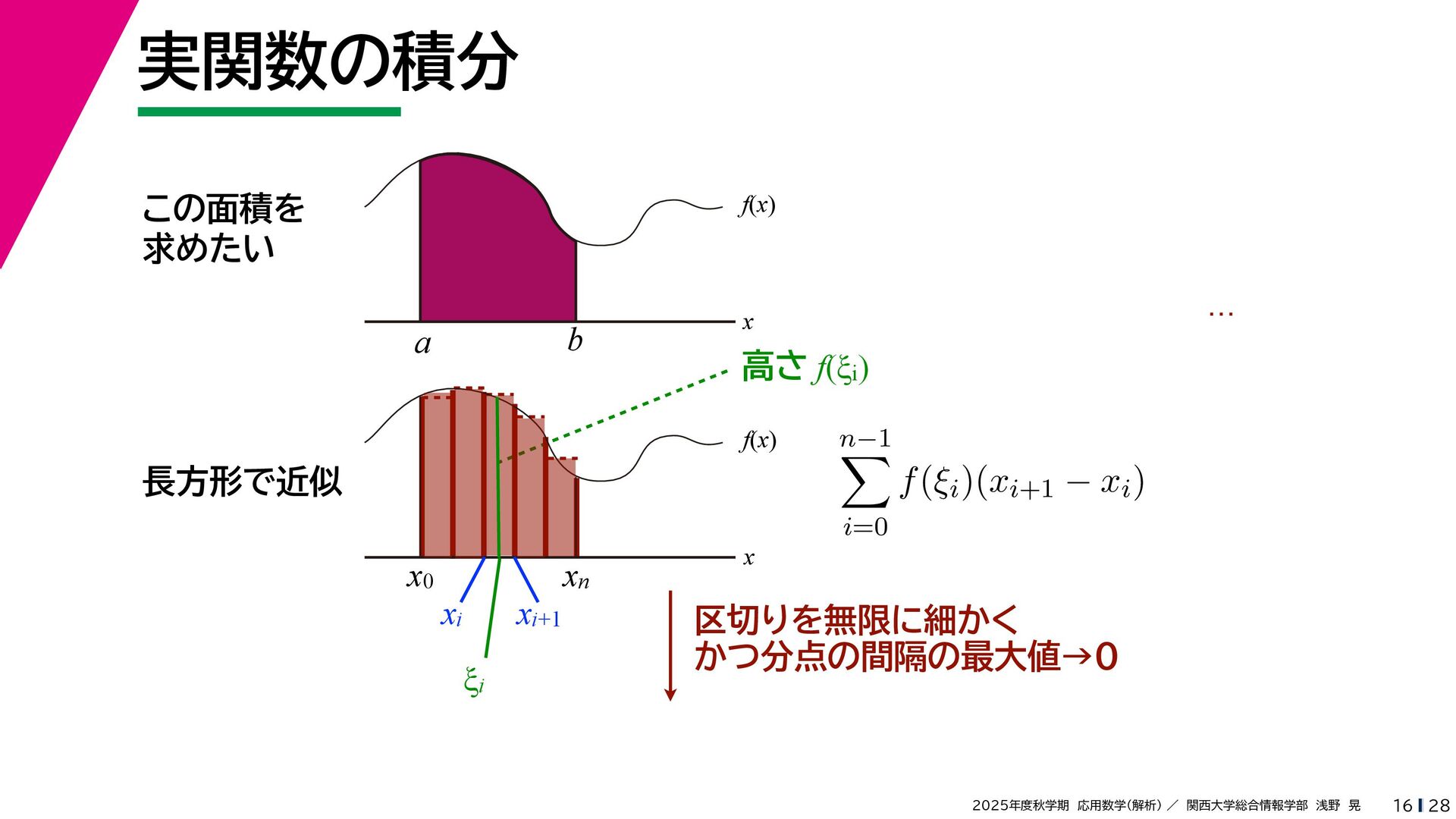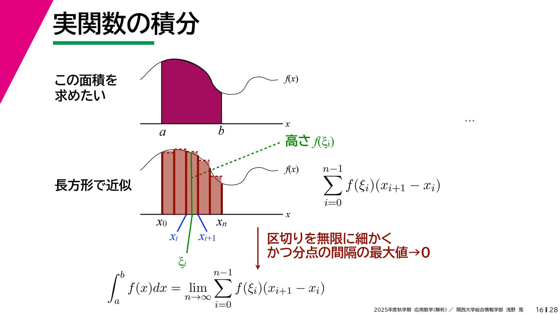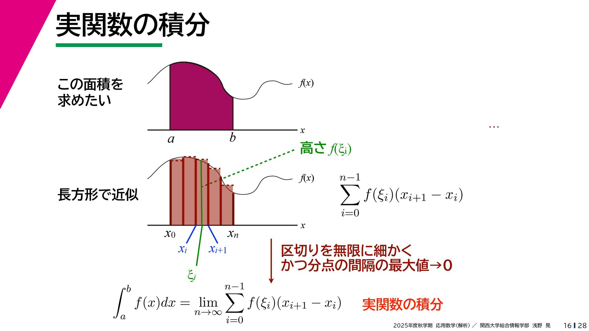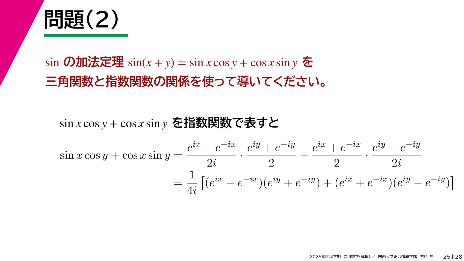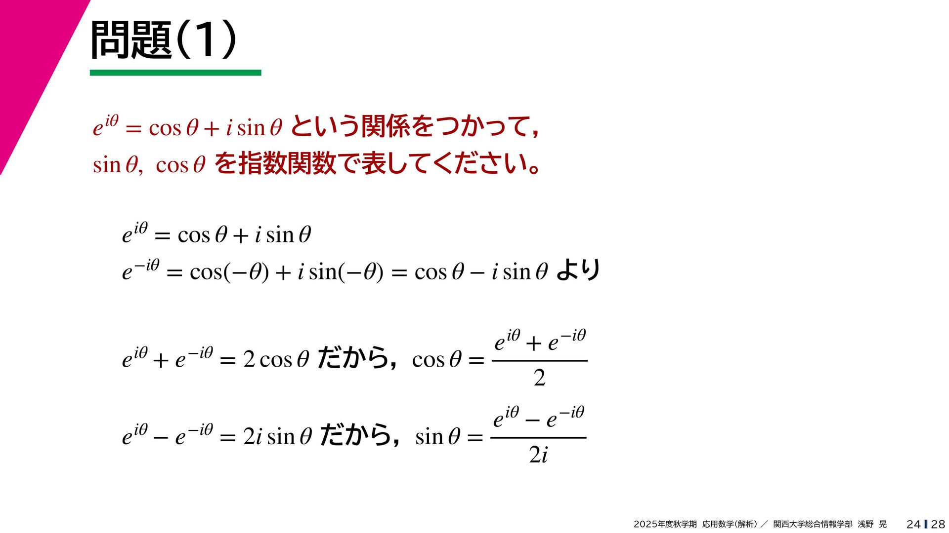 + yi (x + Δx) + yi x + (y + Δy)i この2通りの近づき方で極限値は等しいので を2通りの近づき方で表す f′ (z) f′(z) = lim ∆x→0 {u(x + ∆x, y) + iv(x + ∆x, y)} − {u(x, y) + iv(x, y)} ((x + ∆x) + yi) − (x + yi) = lim ∆x→0 u(x + ∆x, y) − u(x, y) ∆x + i lim ∆x→0 v(x + ∆x, y) − v(x, y) ∆x = ∂u ∂x + i ∂v ∂x f′(z) = lim ∆y→0 {u(x, y + ∆y) + iv(x, y + ∆y)} − {u(x, y) + iv(x, y)} (x + (y + ∆y)i) − (x + yi) = lim ∆y→0 u(x, y + ∆y) − u(x, y) i∆y + i lim ∆x→0 v(x, y + ∆y) − v(x, y) i∆y = −i lim ∆y→0 u(x, y + ∆y) − u(x, y) ∆y + lim ∆x→0 v(x, y + ∆y) − v(x, y) ∆y = ∂v ∂y − i ∂u ∂y これらが実部・虚部とも等しい