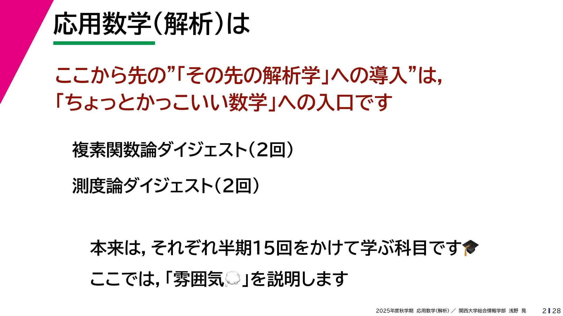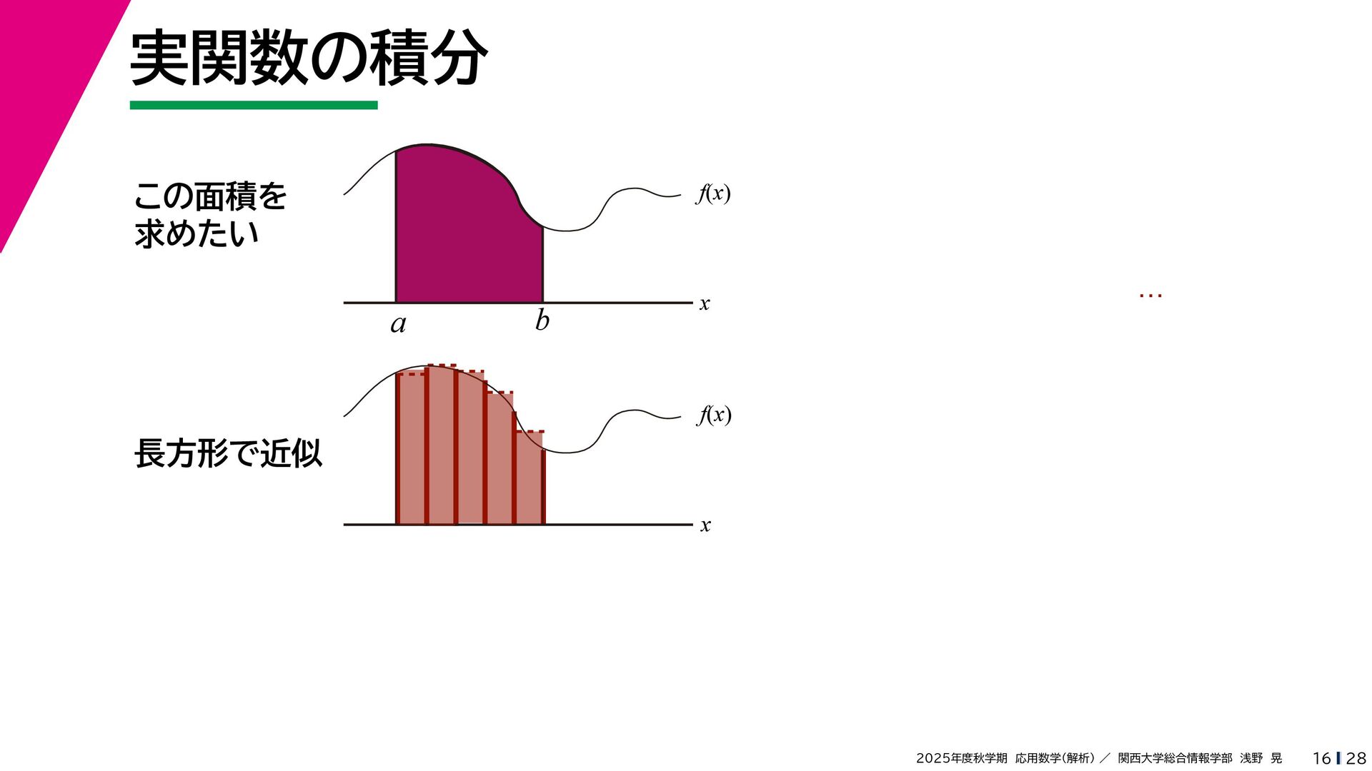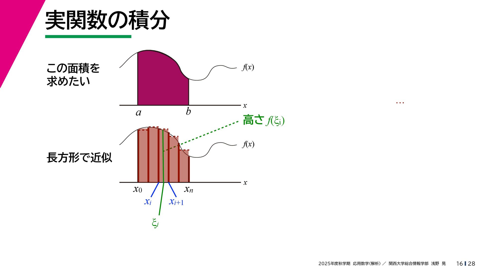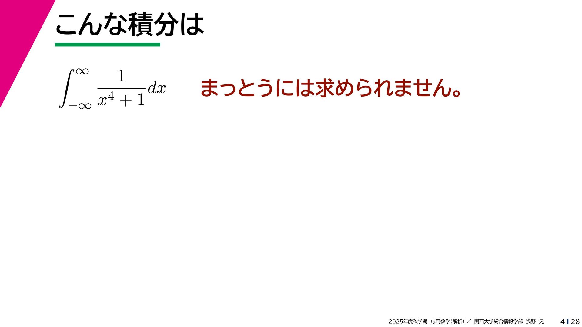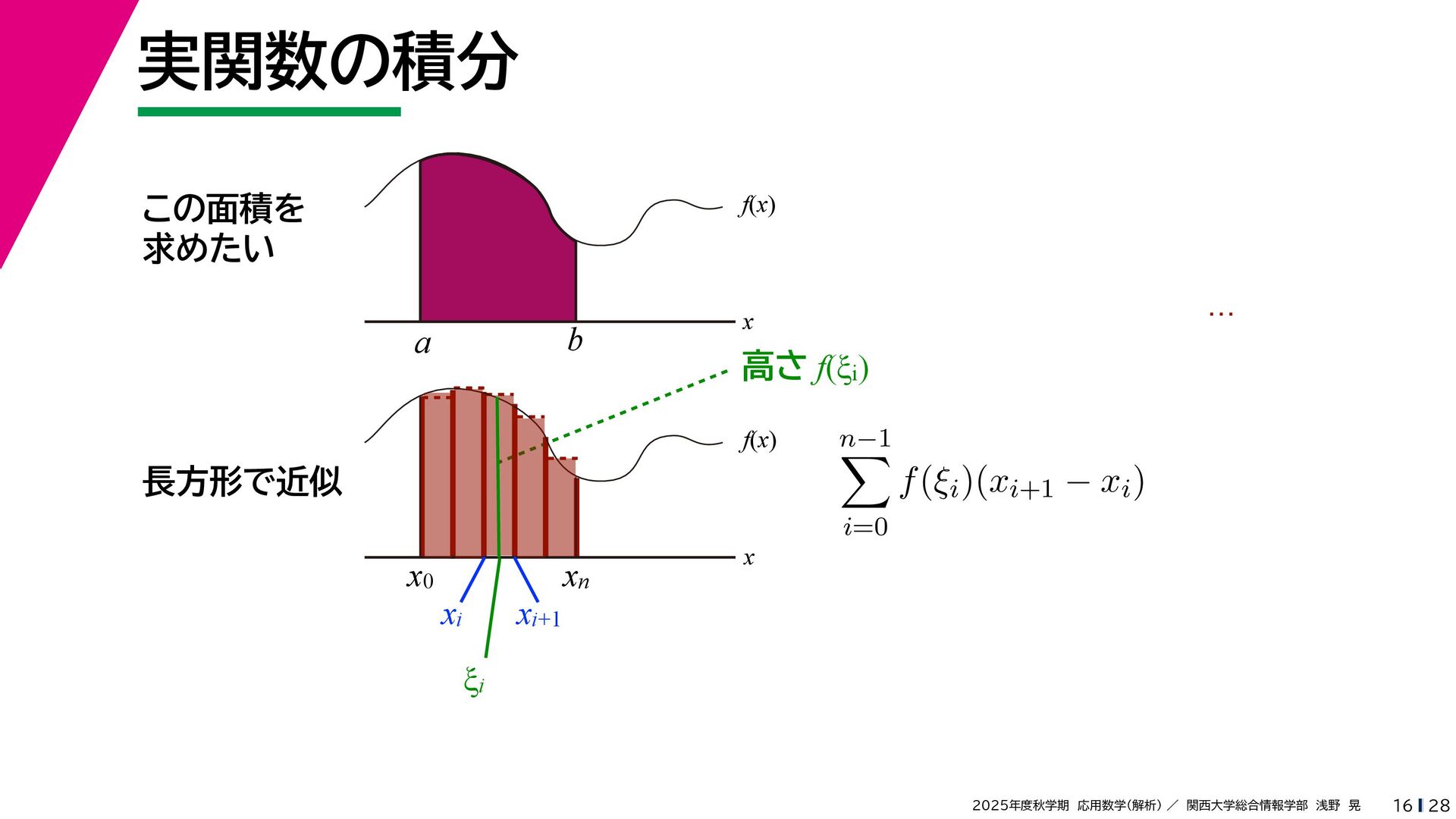 + yi (x + Δx) + yi x + (y + Δy)i この2通りの近づき方で極限値は等しいので を2通りの近づき方で表す f′ (z) f′(z) = lim ∆x→0 {u(x + ∆x, y) + iv(x + ∆x, y)} − {u(x, y) + iv(x, y)} ((x + ∆x) + yi) − (x + yi) = lim ∆x→0 u(x + ∆x, y) − u(x, y) ∆x + i lim ∆x→0 v(x + ∆x, y) − v(x, y) ∆x = ∂u ∂x + i ∂v ∂x f′(z) = lim ∆y→0 {u(x, y + ∆y) + iv(x, y + ∆y)} − {u(x, y) + iv(x, y)} (x + (y + ∆y)i) − (x + yi) = lim ∆y→0 u(x, y + ∆y) − u(x, y) i∆y + i lim ∆x→0 v(x, y + ∆y) − v(x, y) i∆y = −i lim ∆y→0 u(x, y + ∆y) − u(x, y) ∆y + lim ∆x→0 v(x, y + ∆y) − v(x, y) ∆y = ∂v ∂y − i ∂u ∂y これらが実部・虚部とも等しい