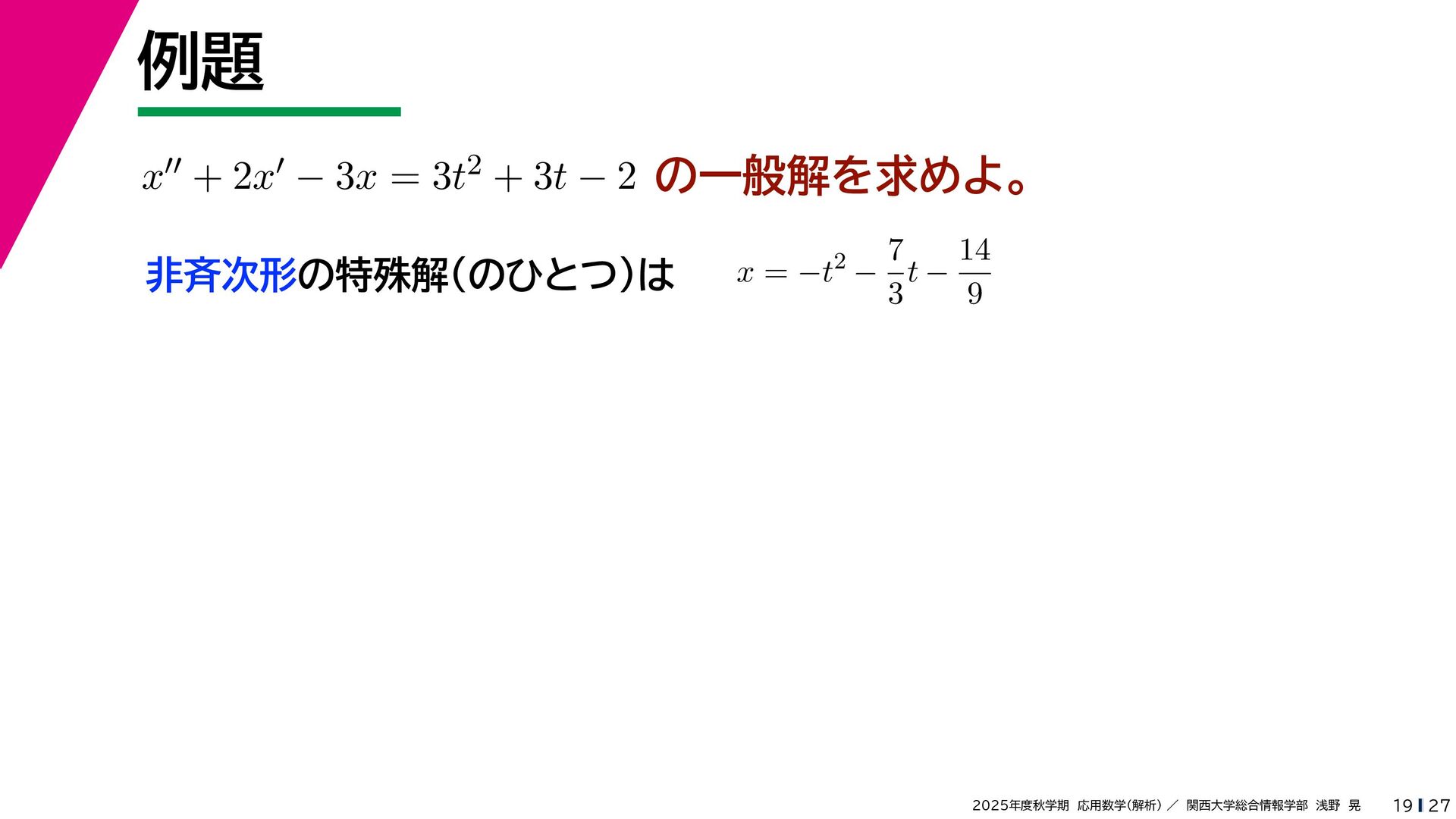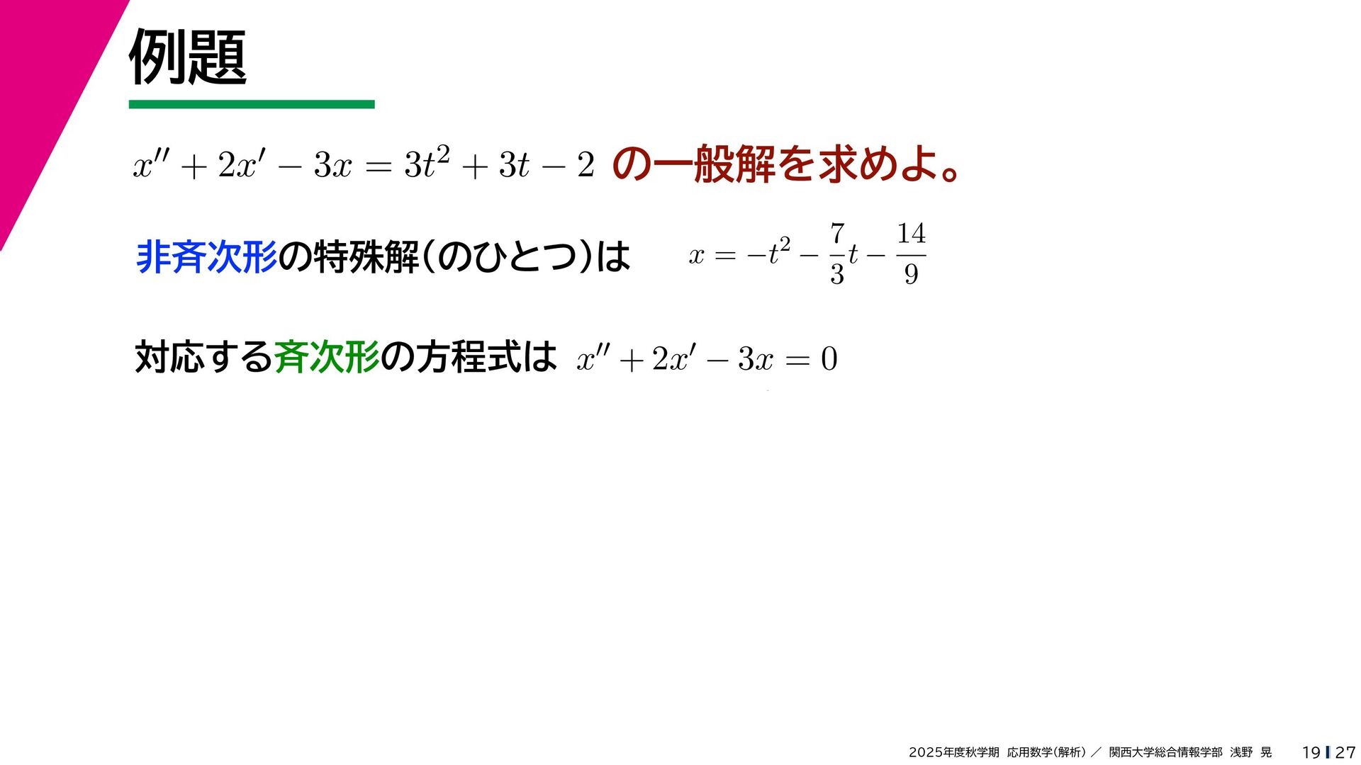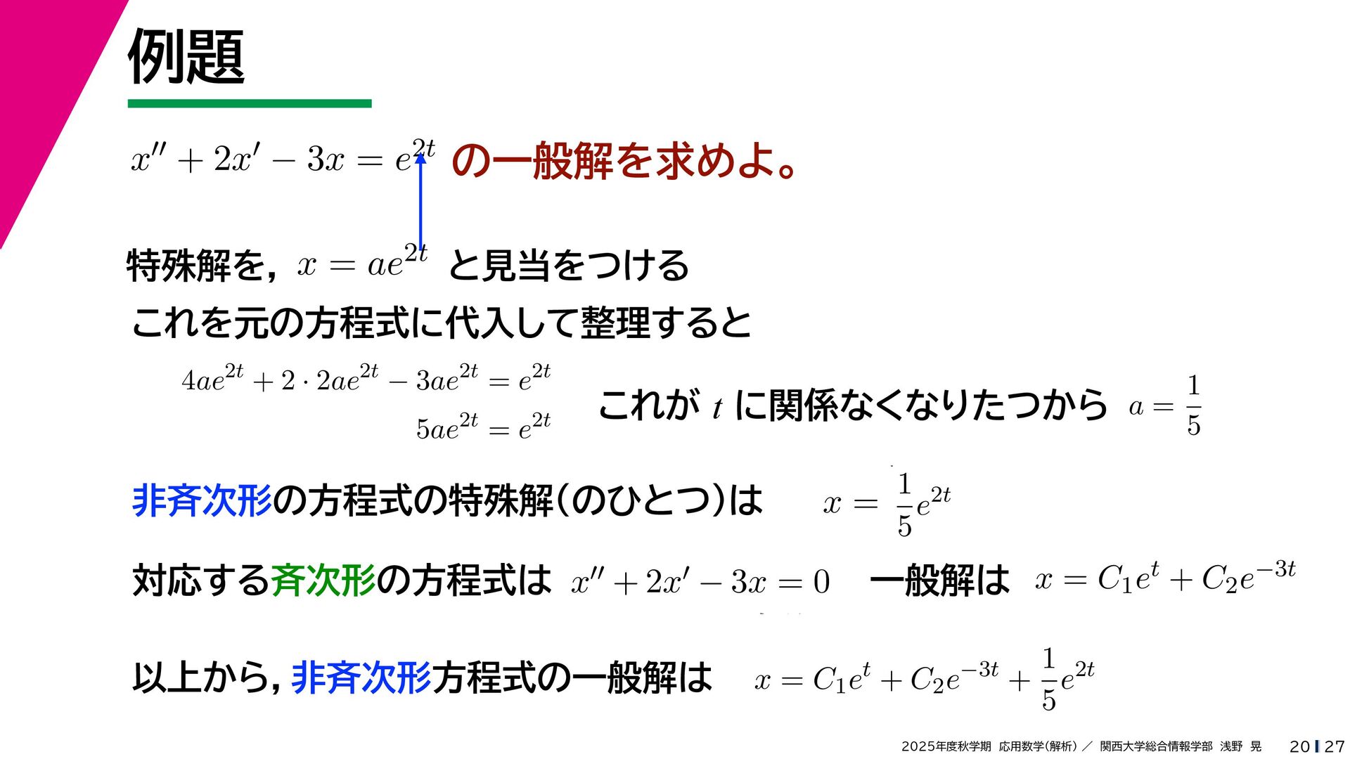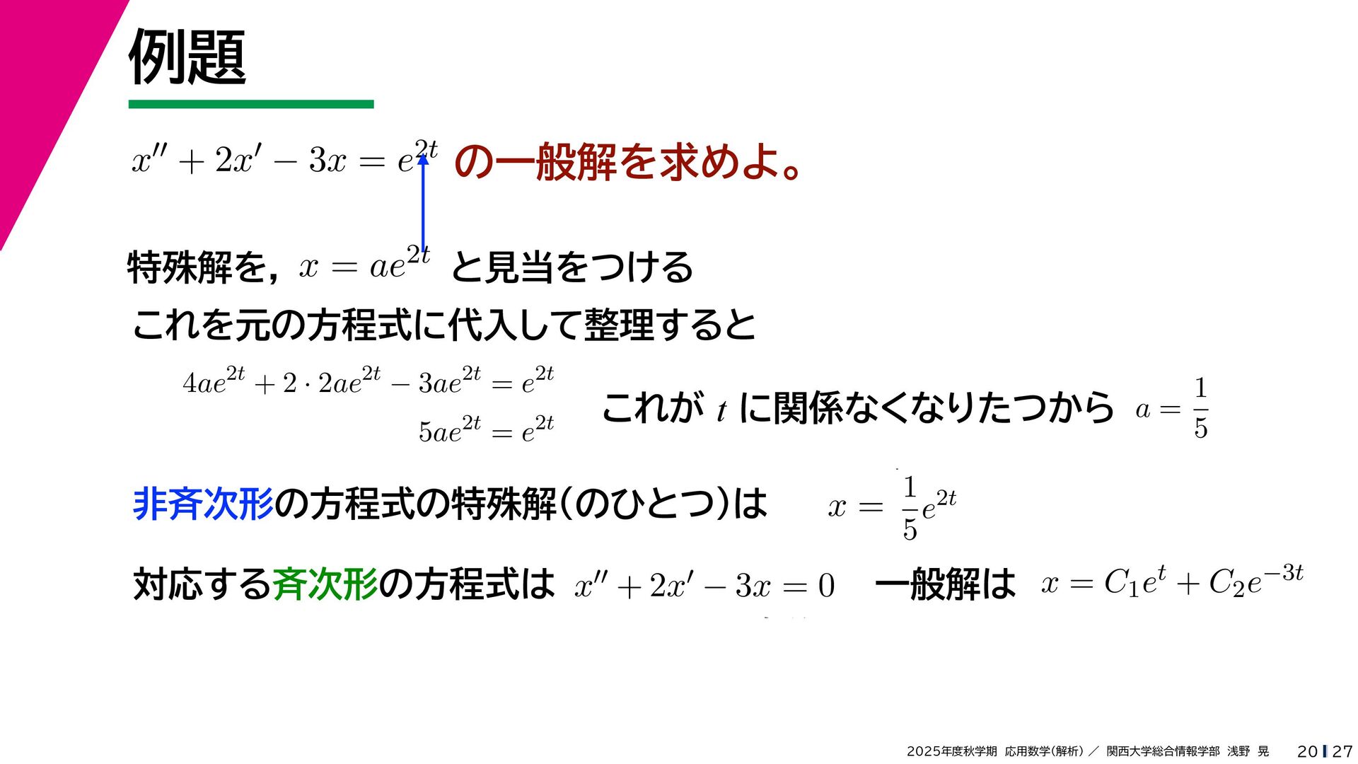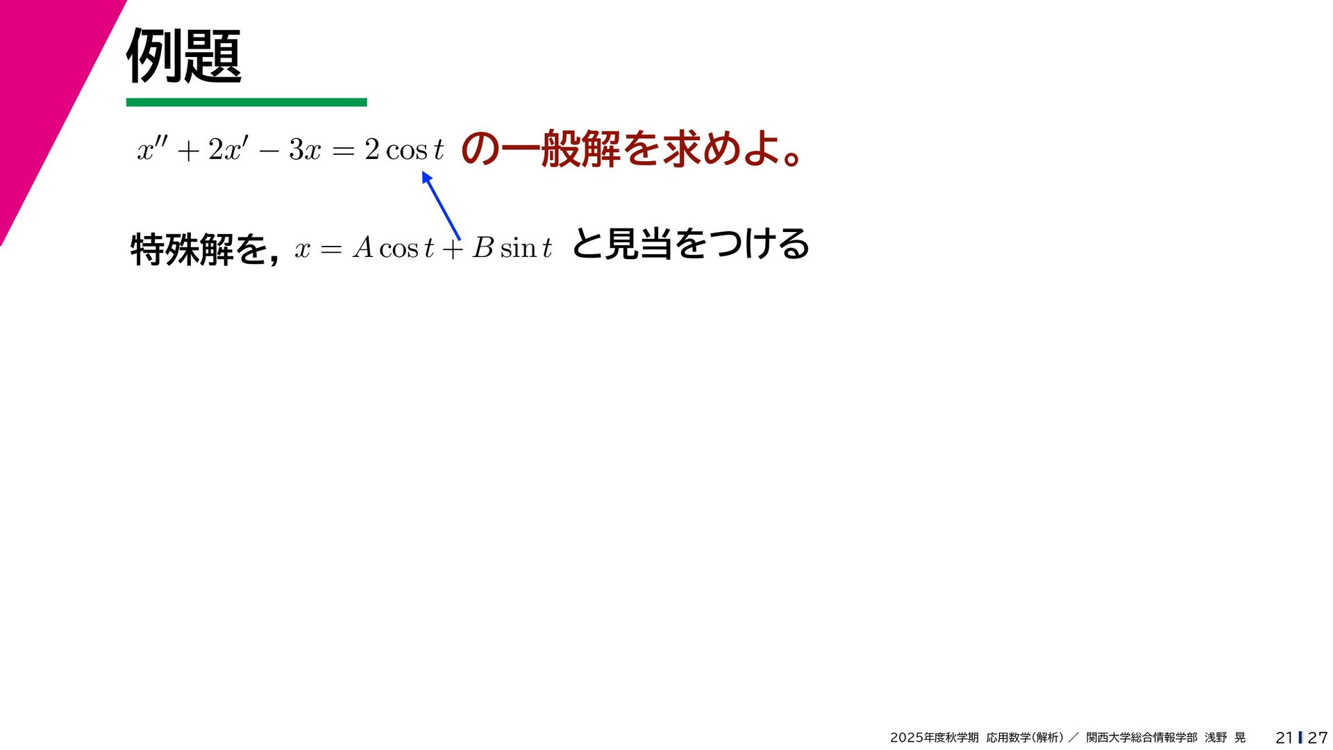 − 3x = 0 解 定数 一般解は x = C1et + C2e−3t x′′ + 2x′ − 3x = 2 cos t 特殊解を, と見当をつける x = A cos t + B sin t これを元の方程式に代入して整理すると (−4A + 2B − 2) cos t + (−2A − 4B) sin t = 0 cos, sinは独立(あとで説明) −4A + 2B − 2 = 0 −2A − 4B = 0 A = − 2 5 , B = 1 5 非斉次形の方程式の特殊解(のひとつ)は x = − 2 5 cos t + 1 5 sin t 以上から,非斉次形方程式の一般解は x = C1et + C2e−3t − 2 5 cos t + 1 5 sin t