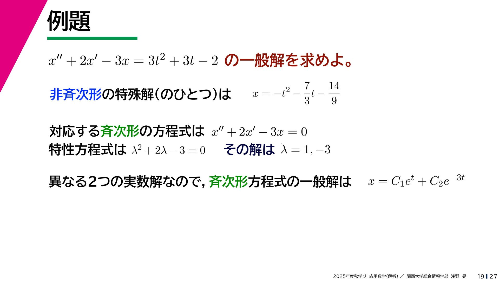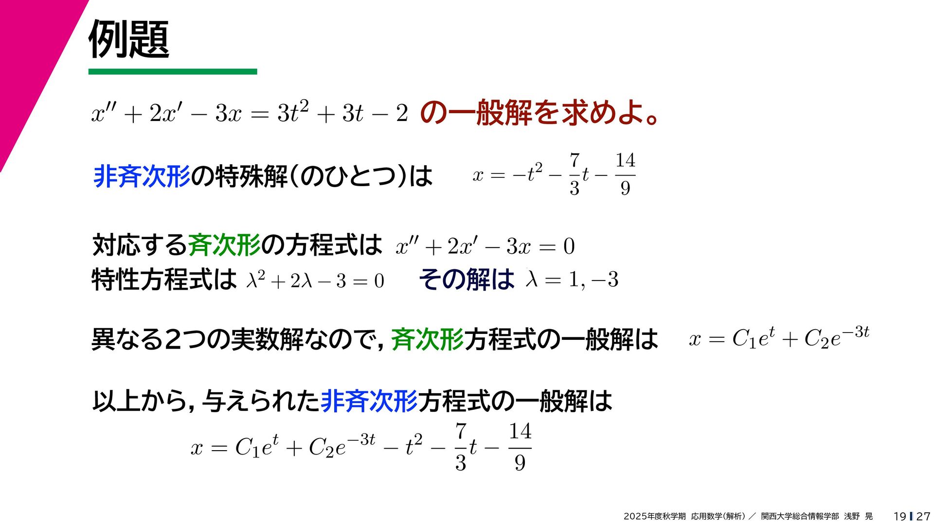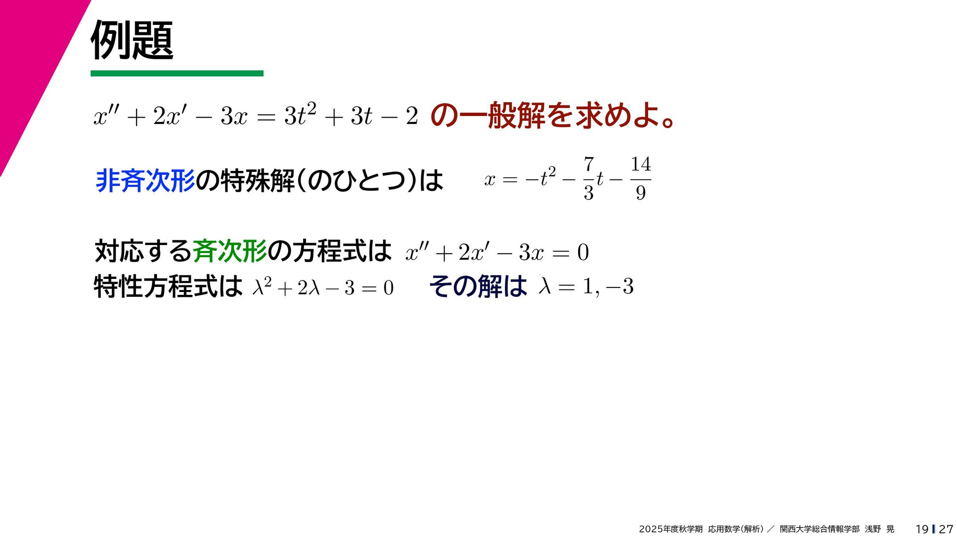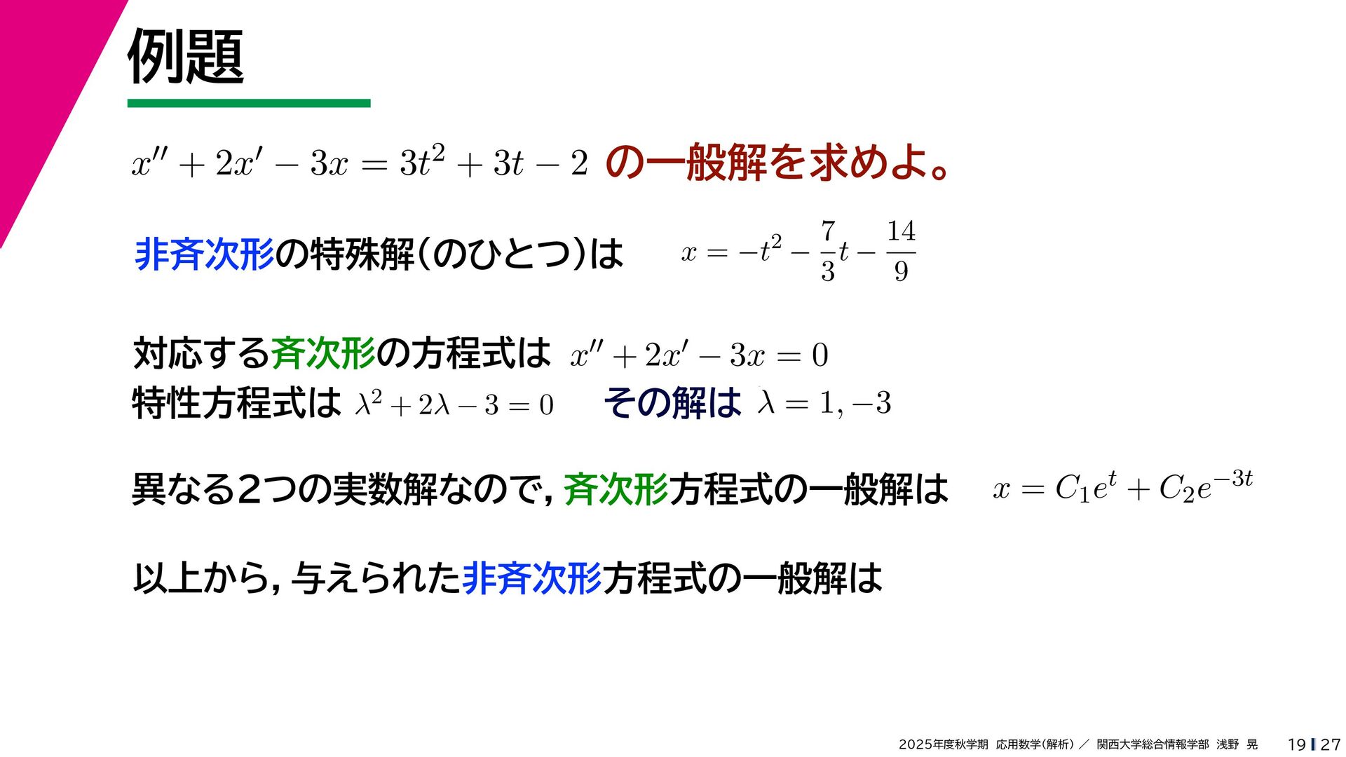 − 3x = 0 解 定数 一般解は x = C1et + C2e−3t x′′ + 2x′ − 3x = 2 cos t 特殊解を, と見当をつける x = A cos t + B sin t これを元の方程式に代入して整理すると (−4A + 2B − 2) cos t + (−2A − 4B) sin t = 0 cos, sinは独立(あとで説明) −4A + 2B − 2 = 0 −2A − 4B = 0 A = − 2 5 , B = 1 5 非斉次形の方程式の特殊解(のひとつ)は x = − 2 5 cos t + 1 5 sin t 以上から,非斉次形方程式の一般解は x = C1et + C2e−3t − 2 5 cos t + 1 5 sin t
