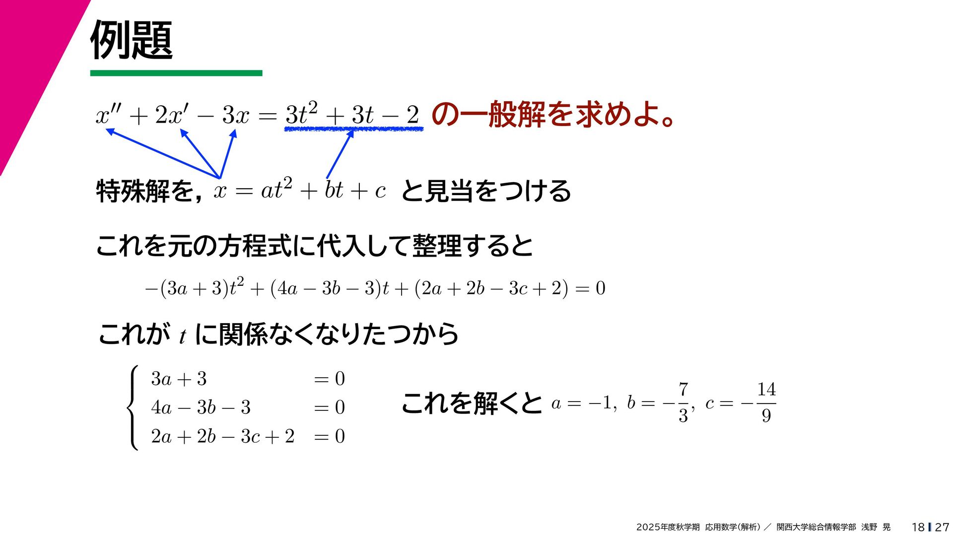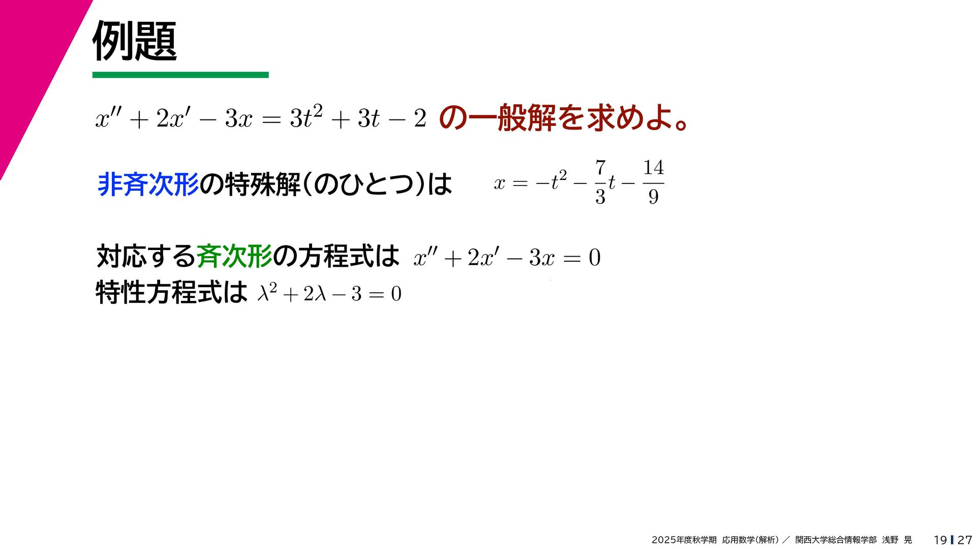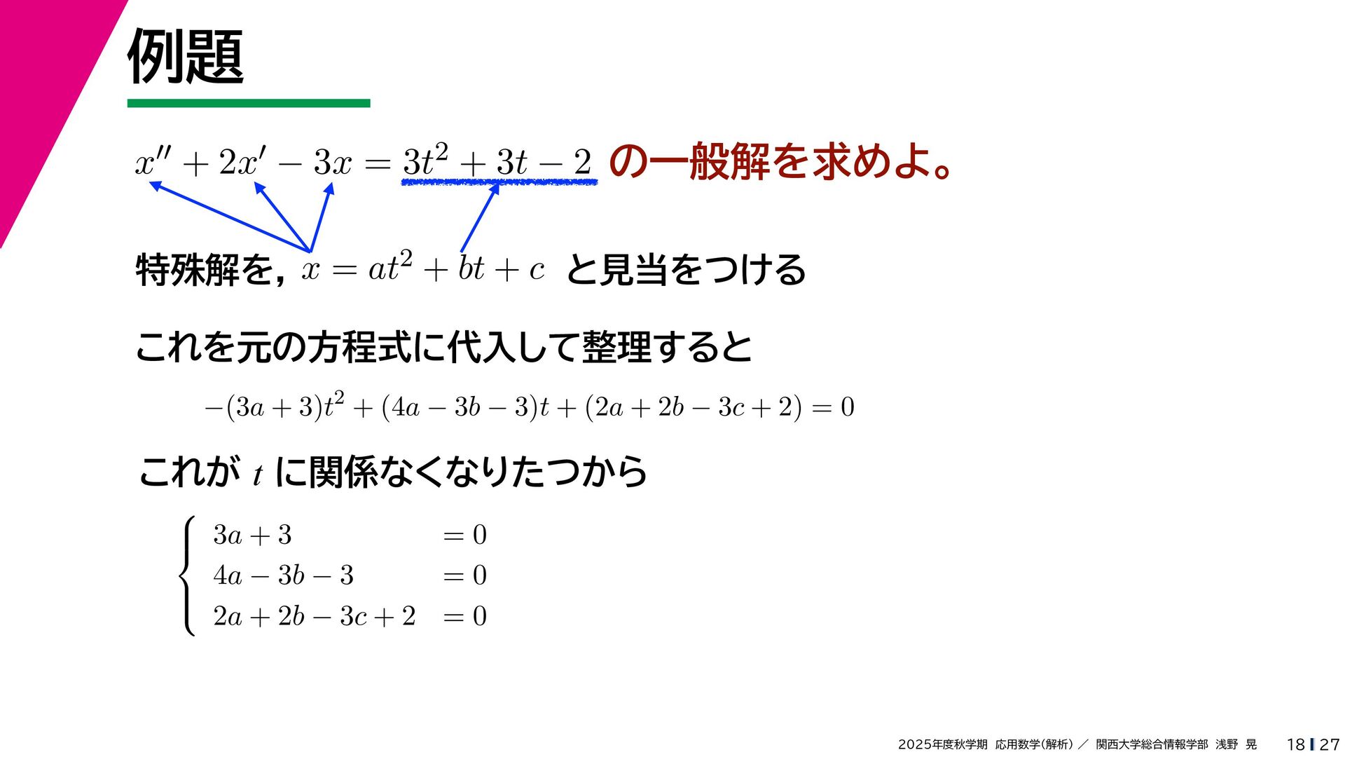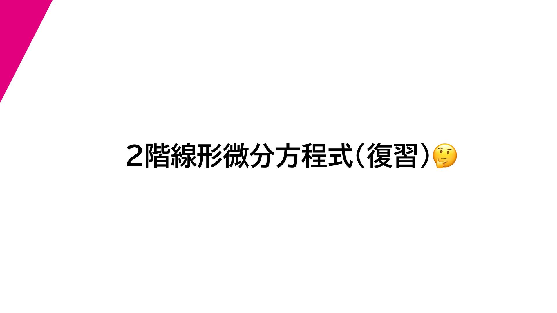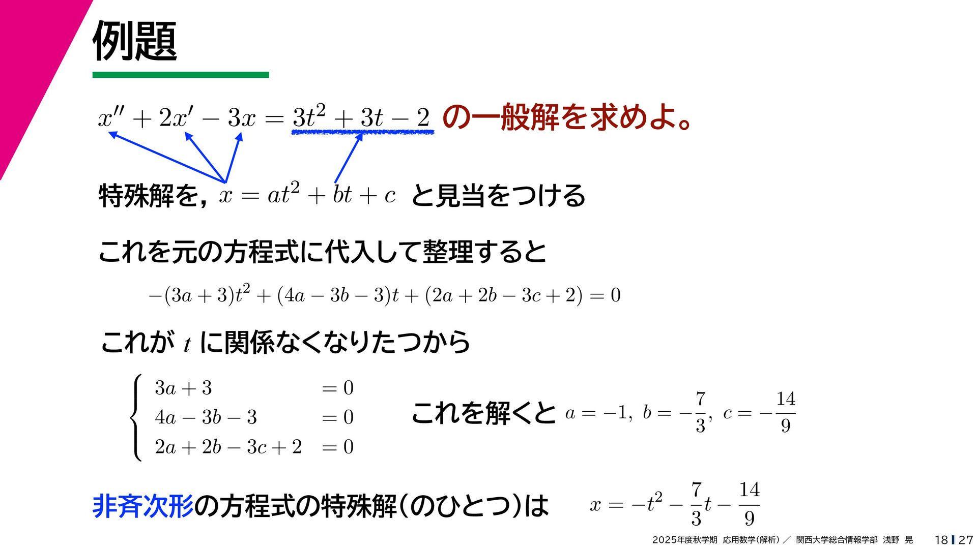 − 3x = 0 解 定数 一般解は x = C1et + C2e−3t x′′ + 2x′ − 3x = 2 cos t 特殊解を, と見当をつける x = A cos t + B sin t これを元の方程式に代入して整理すると (−4A + 2B − 2) cos t + (−2A − 4B) sin t = 0 cos, sinは独立(あとで説明) −4A + 2B − 2 = 0 −2A − 4B = 0 A = − 2 5 , B = 1 5 非斉次形の方程式の特殊解(のひとつ)は x = − 2 5 cos t + 1 5 sin t 以上から,非斉次形方程式の一般解は x = C1et + C2e−3t − 2 5 cos t + 1 5 sin t