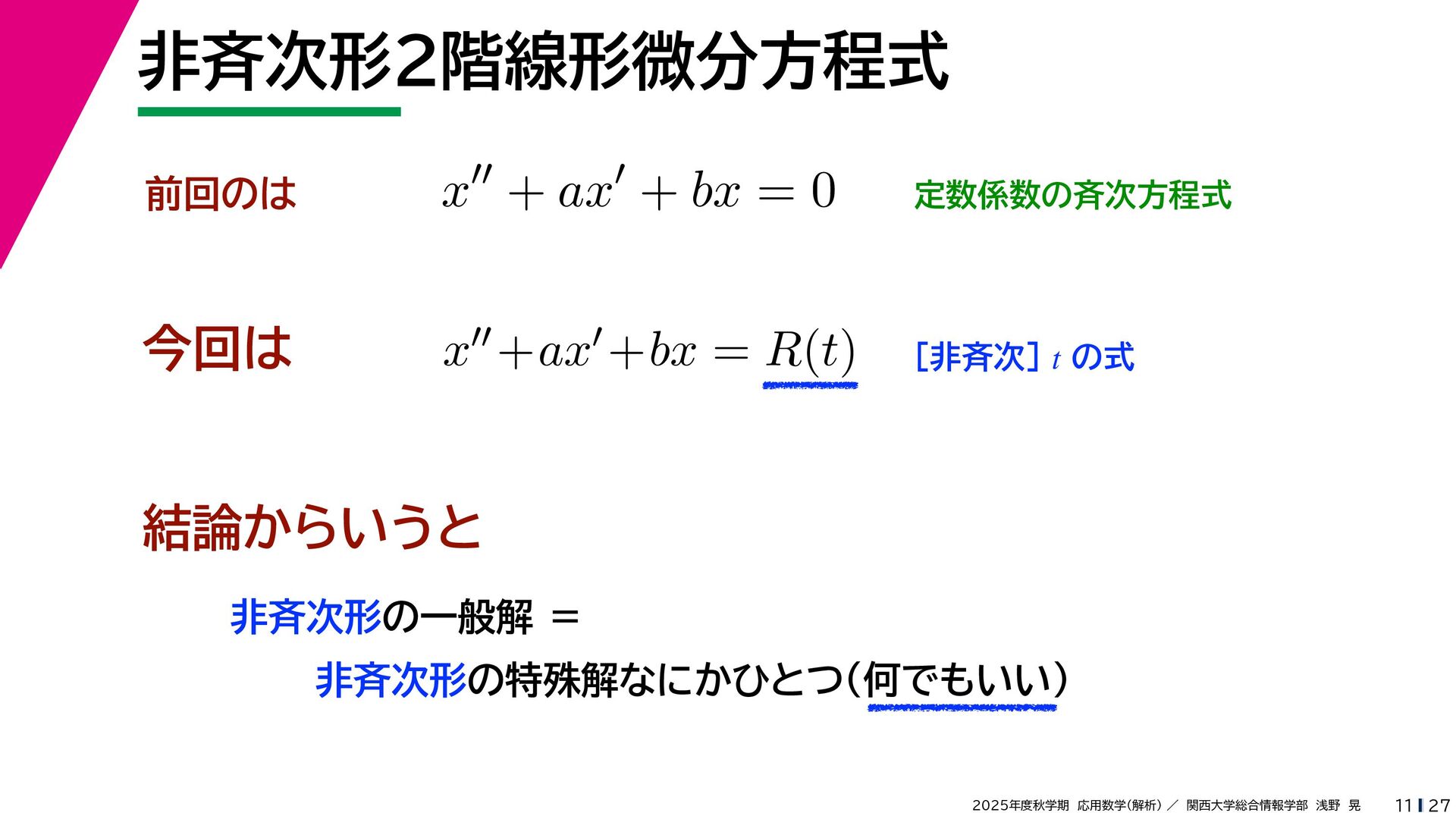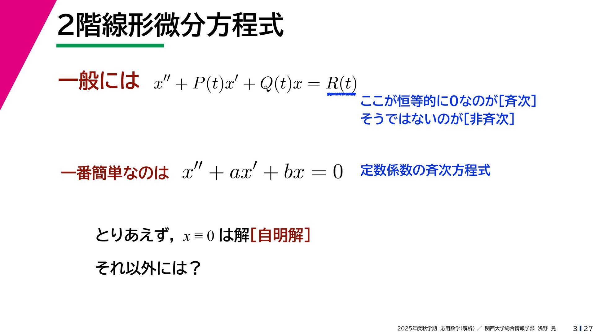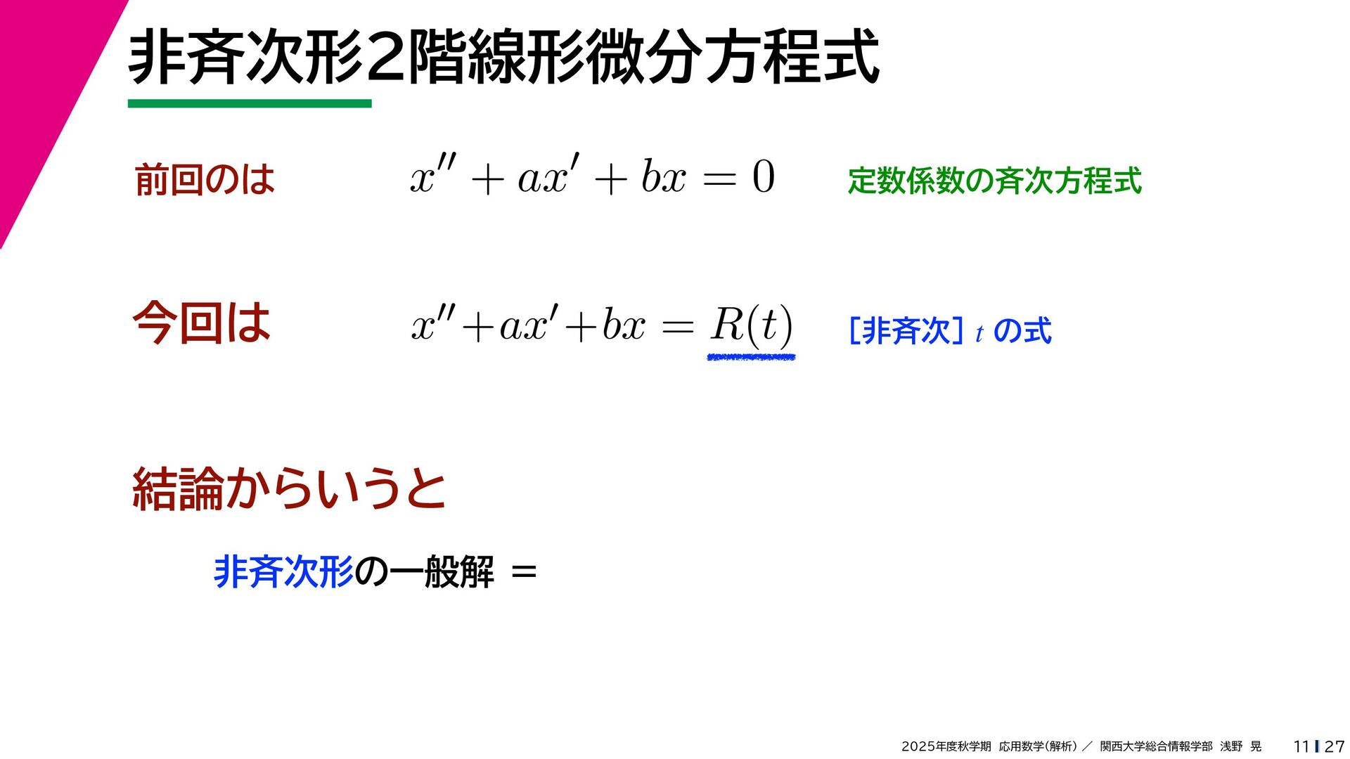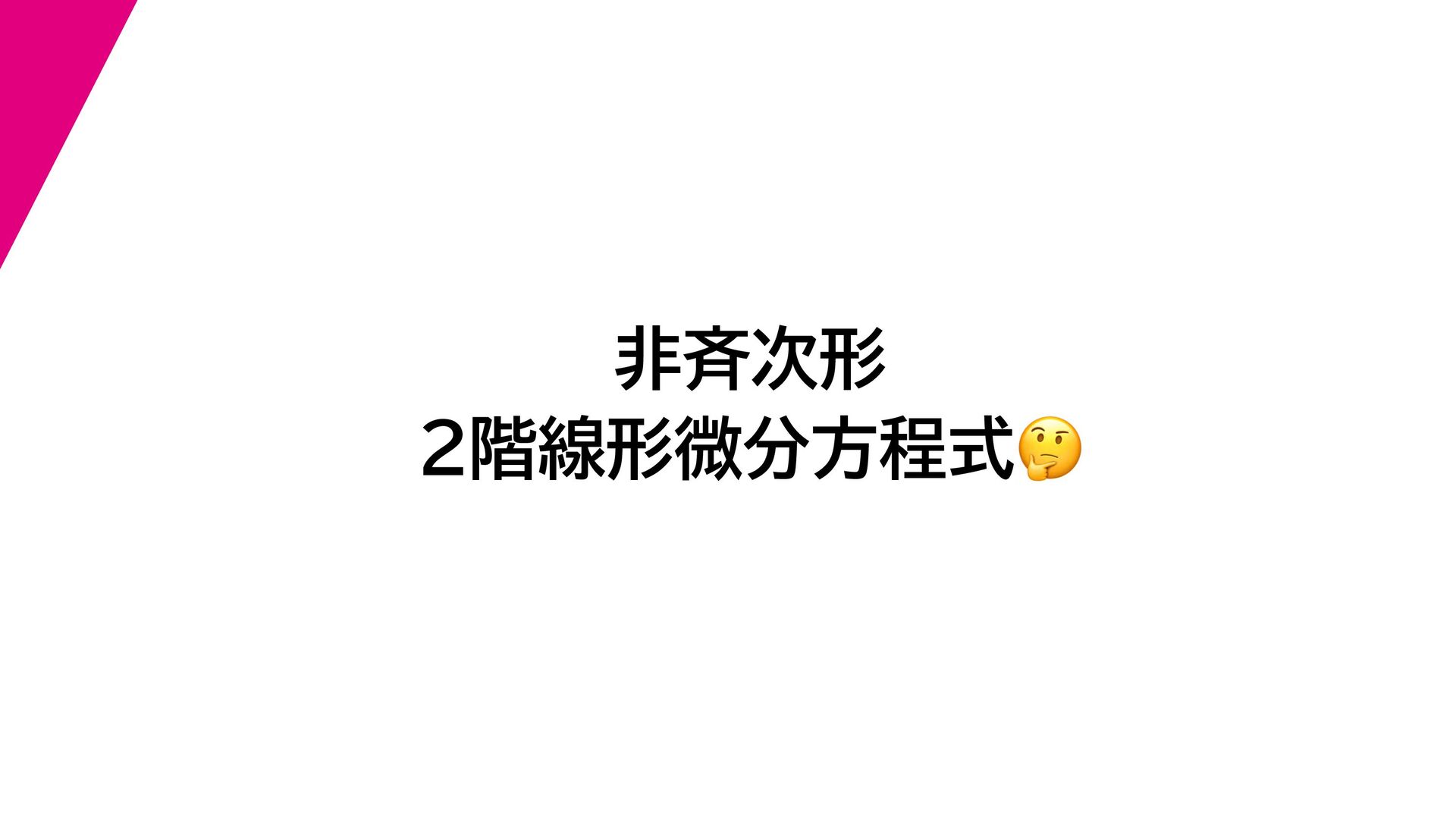 − 3x = 0 解 定数 一般解は x = C1et + C2e−3t x′′ + 2x′ − 3x = 2 cos t 特殊解を, と見当をつける x = A cos t + B sin t これを元の方程式に代入して整理すると (−4A + 2B − 2) cos t + (−2A − 4B) sin t = 0 cos, sinは独立(あとで説明) −4A + 2B − 2 = 0 −2A − 4B = 0 A = − 2 5 , B = 1 5 非斉次形の方程式の特殊解(のひとつ)は x = − 2 5 cos t + 1 5 sin t 以上から,非斉次形方程式の一般解は x = C1et + C2e−3t − 2 5 cos t + 1 5 sin t