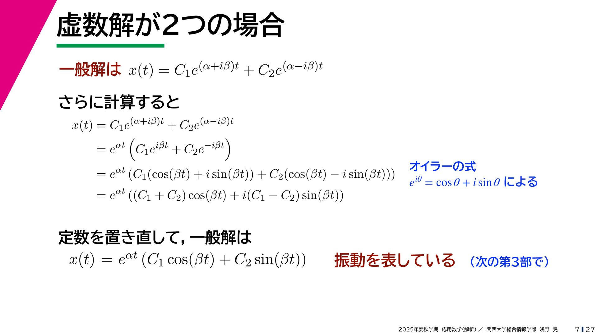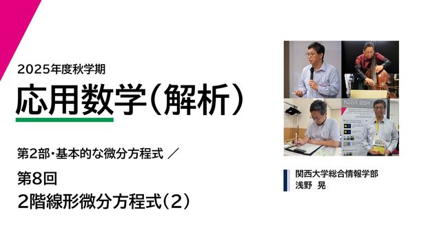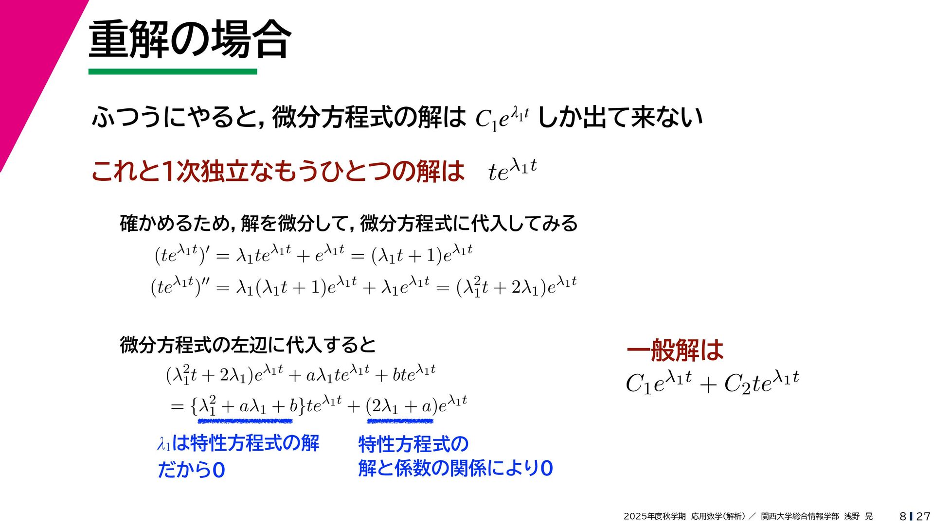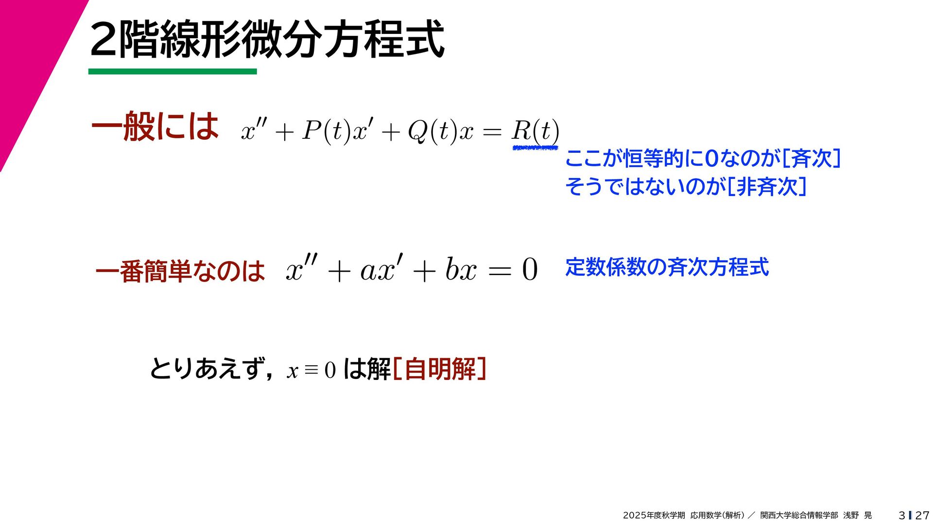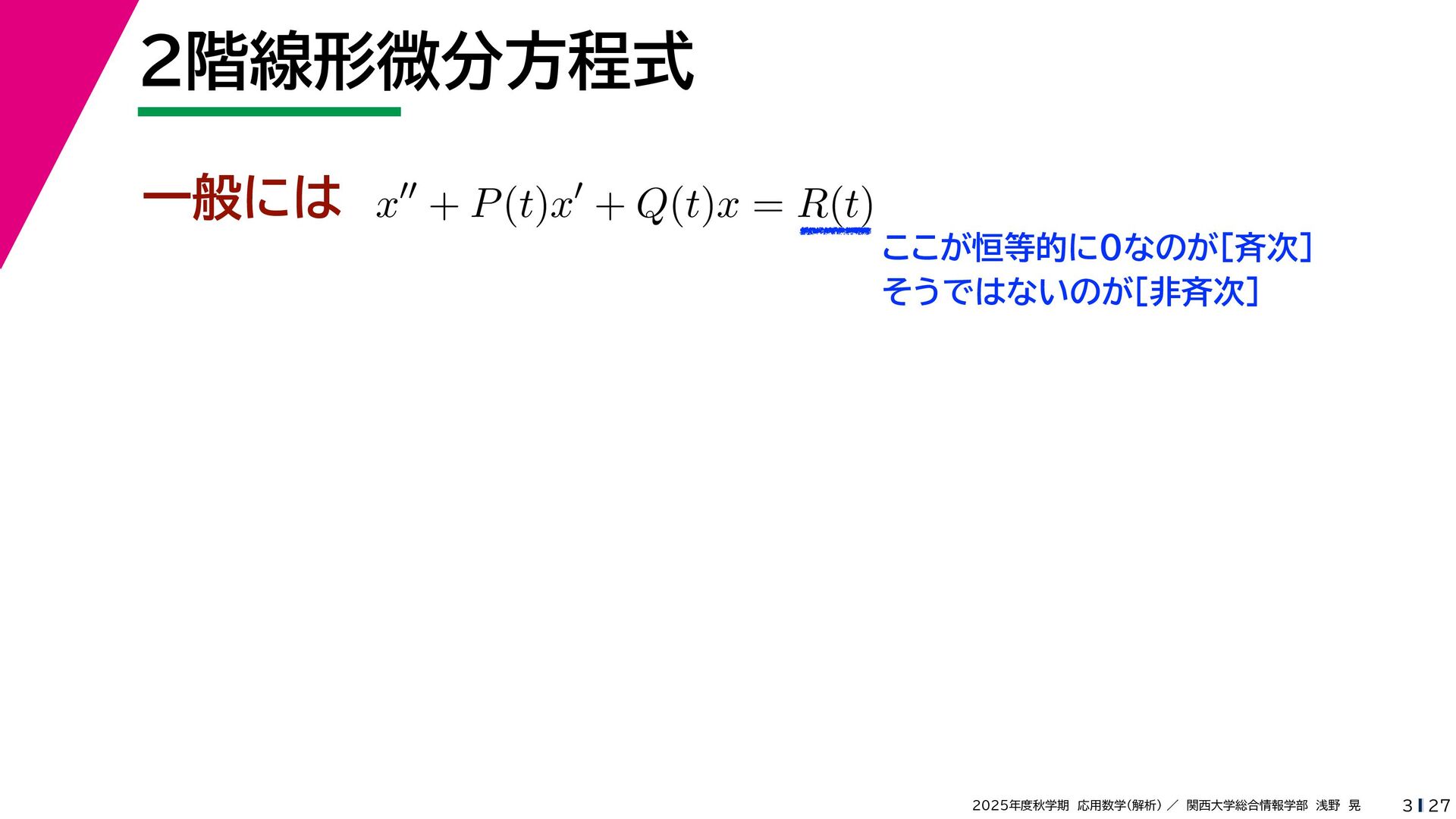 − 3x = 0 解 定数 一般解は x = C1et + C2e−3t x′′ + 2x′ − 3x = 2 cos t 特殊解を, と見当をつける x = A cos t + B sin t これを元の方程式に代入して整理すると (−4A + 2B − 2) cos t + (−2A − 4B) sin t = 0 cos, sinは独立(あとで説明) −4A + 2B − 2 = 0 −2A − 4B = 0 A = − 2 5 , B = 1 5 非斉次形の方程式の特殊解(のひとつ)は x = − 2 5 cos t + 1 5 sin t 以上から,非斉次形方程式の一般解は x = C1et + C2e−3t − 2 5 cos t + 1 5 sin t