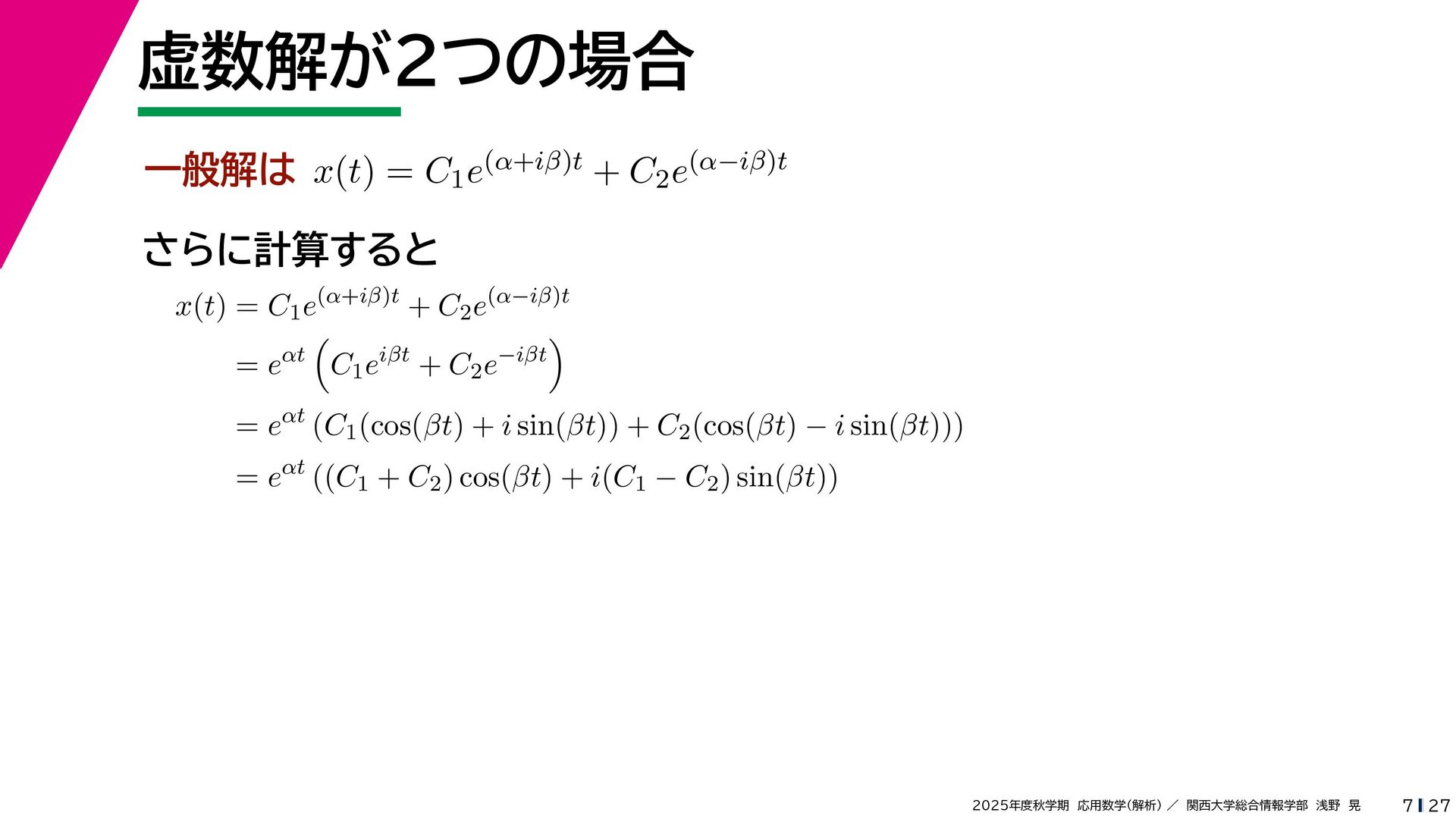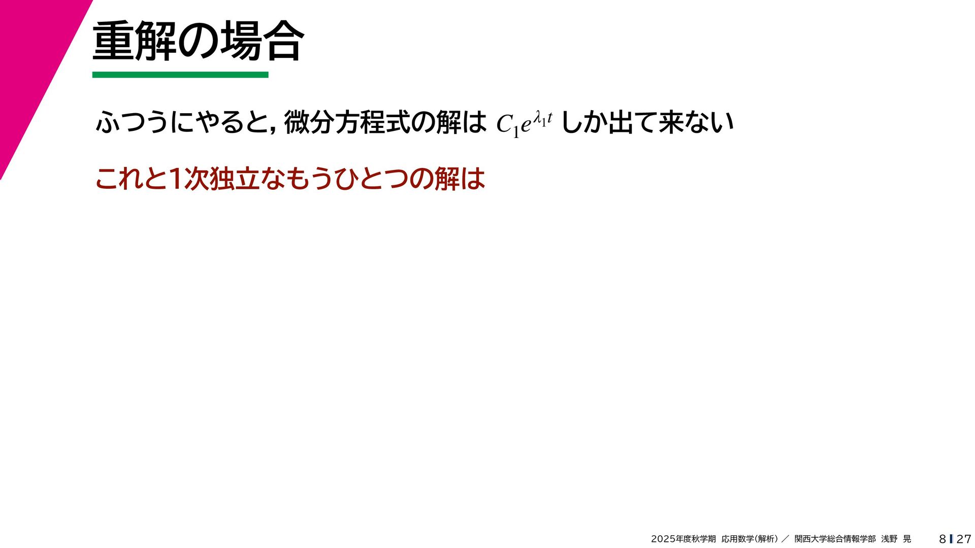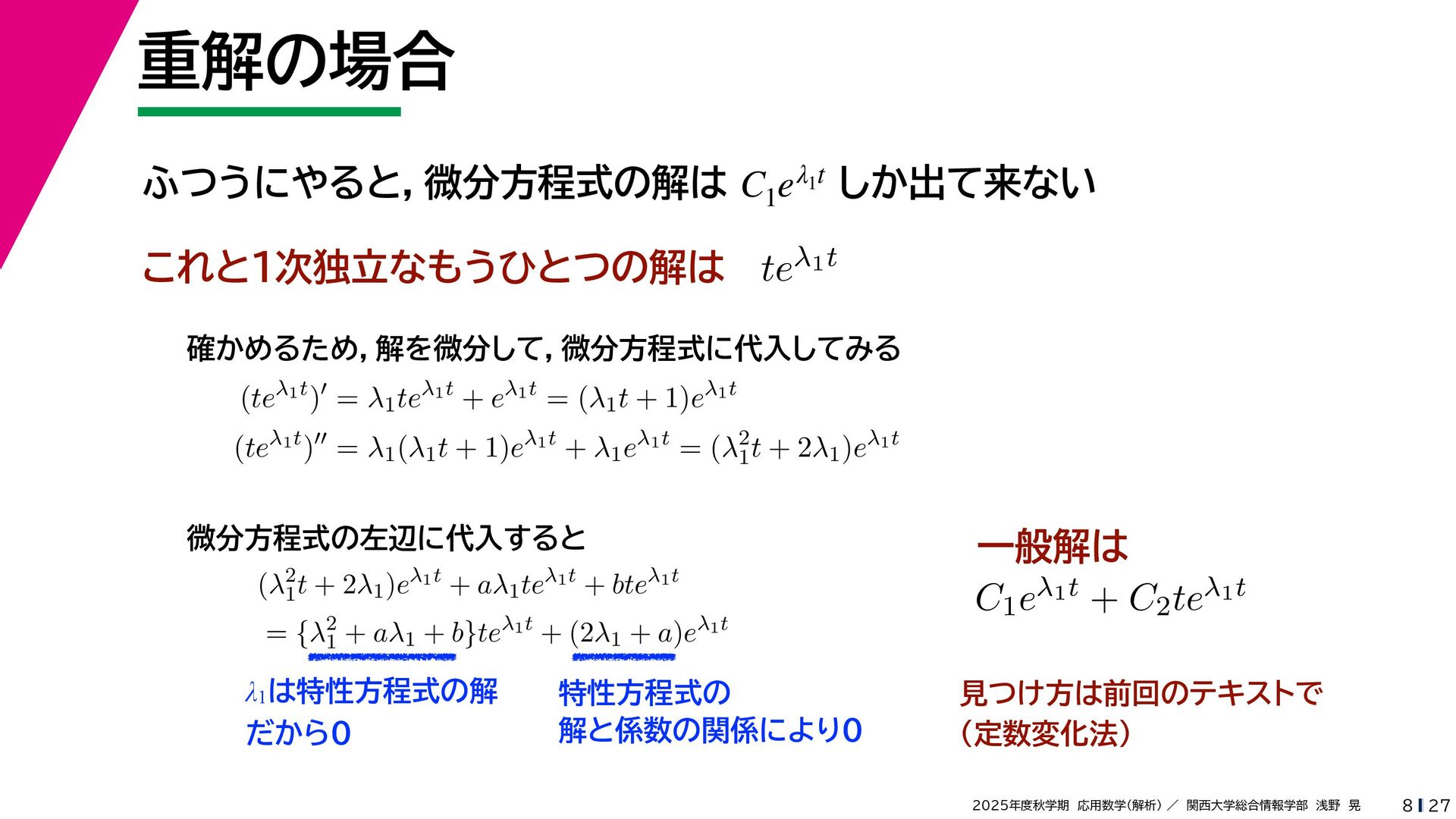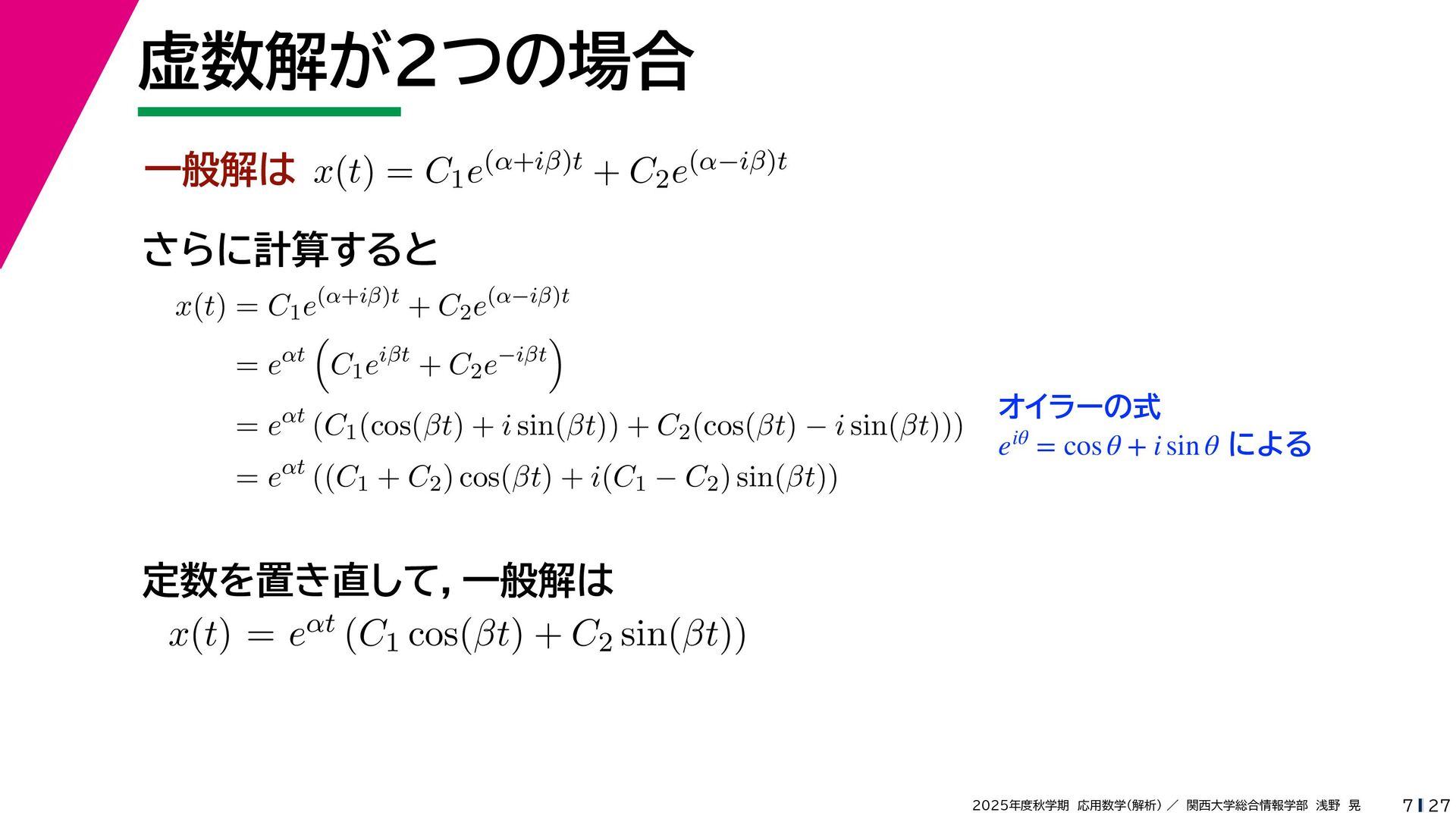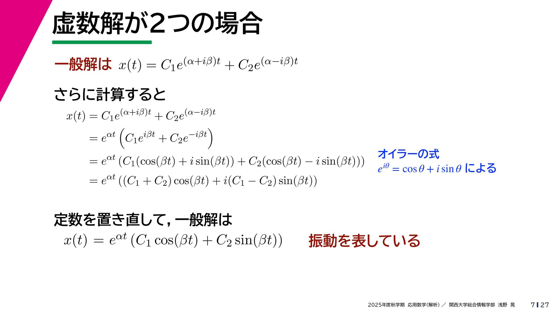 − 3x = 0 解 定数 一般解は x = C1et + C2e−3t x′′ + 2x′ − 3x = 2 cos t 特殊解を, と見当をつける x = A cos t + B sin t これを元の方程式に代入して整理すると (−4A + 2B − 2) cos t + (−2A − 4B) sin t = 0 cos, sinは独立(あとで説明) −4A + 2B − 2 = 0 −2A − 4B = 0 A = − 2 5 , B = 1 5 非斉次形の方程式の特殊解(のひとつ)は x = − 2 5 cos t + 1 5 sin t 以上から,非斉次形方程式の一般解は x = C1et + C2e−3t − 2 5 cos t + 1 5 sin t