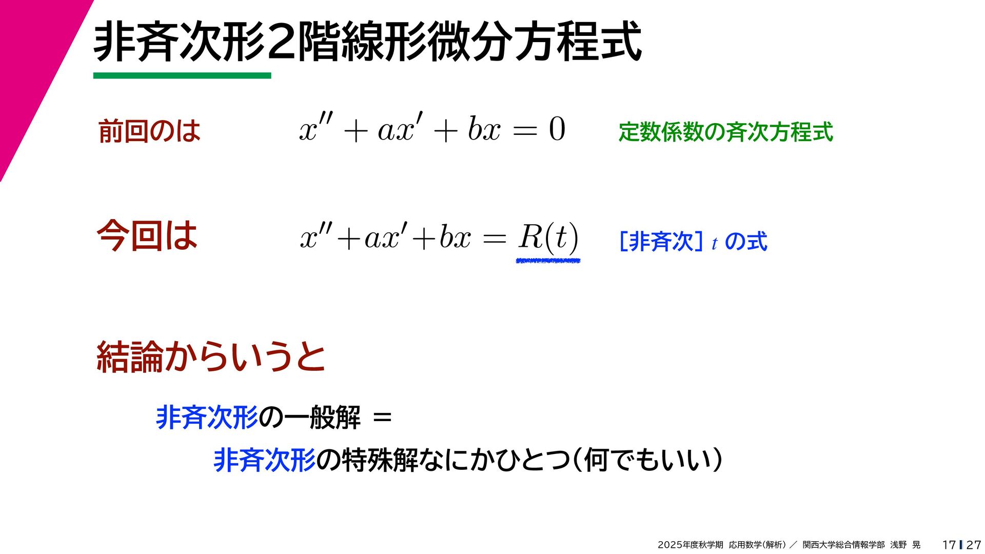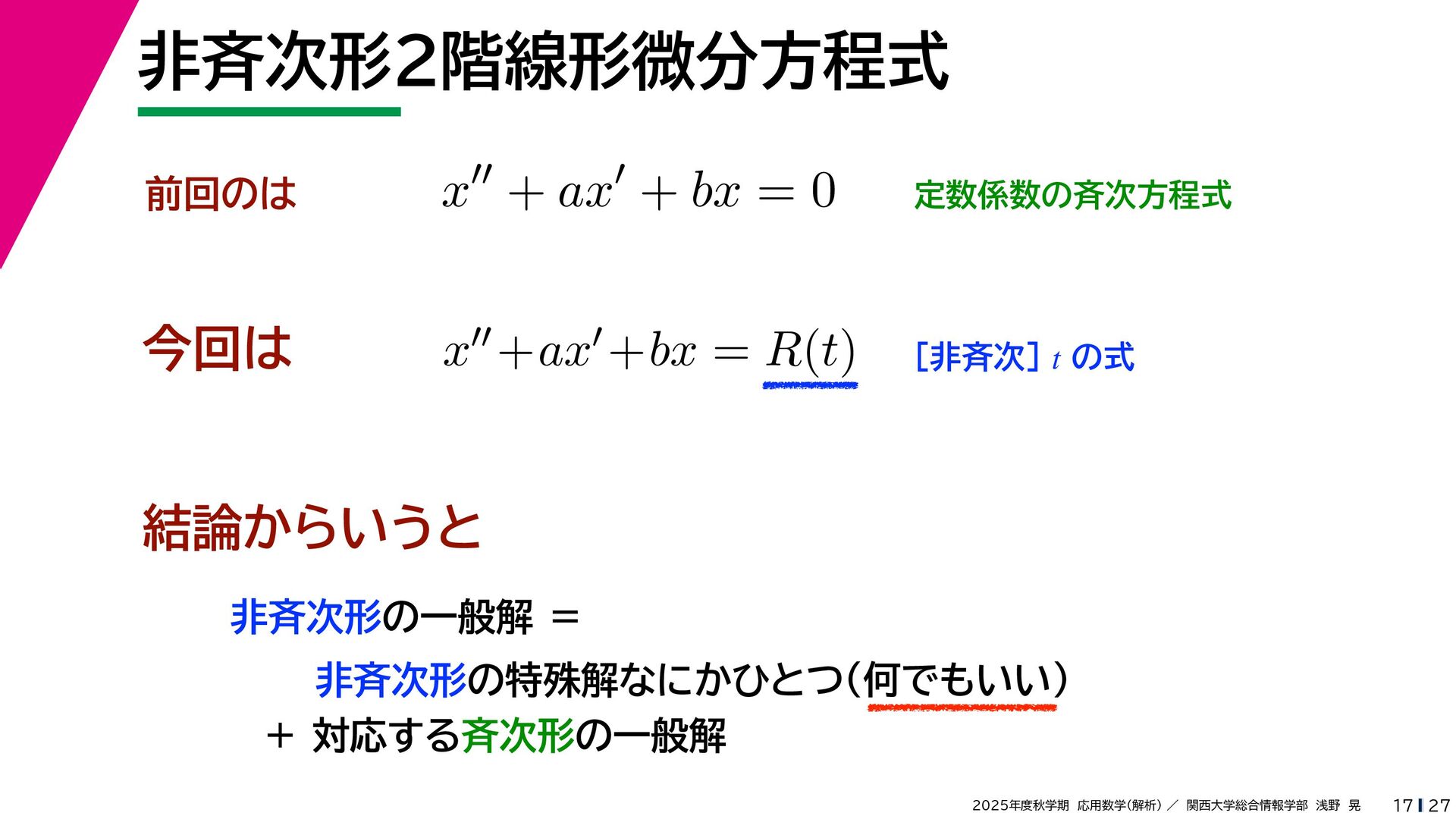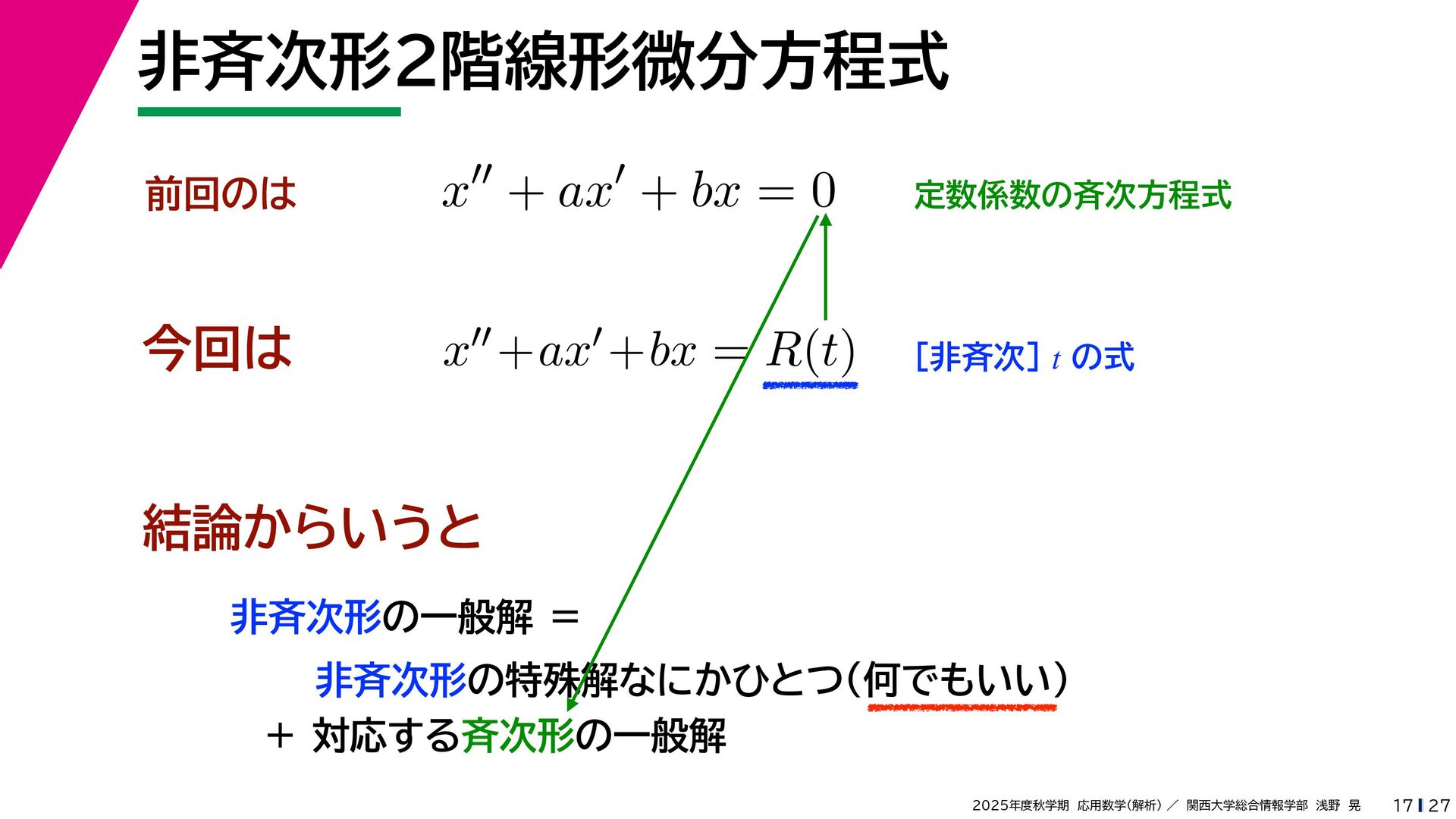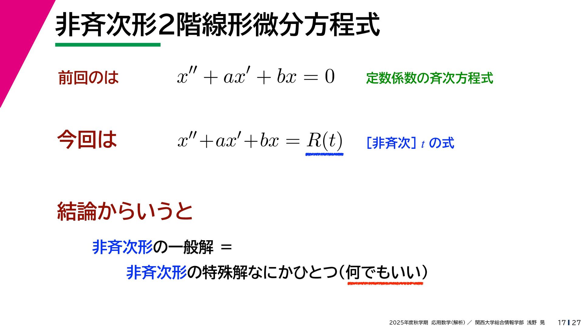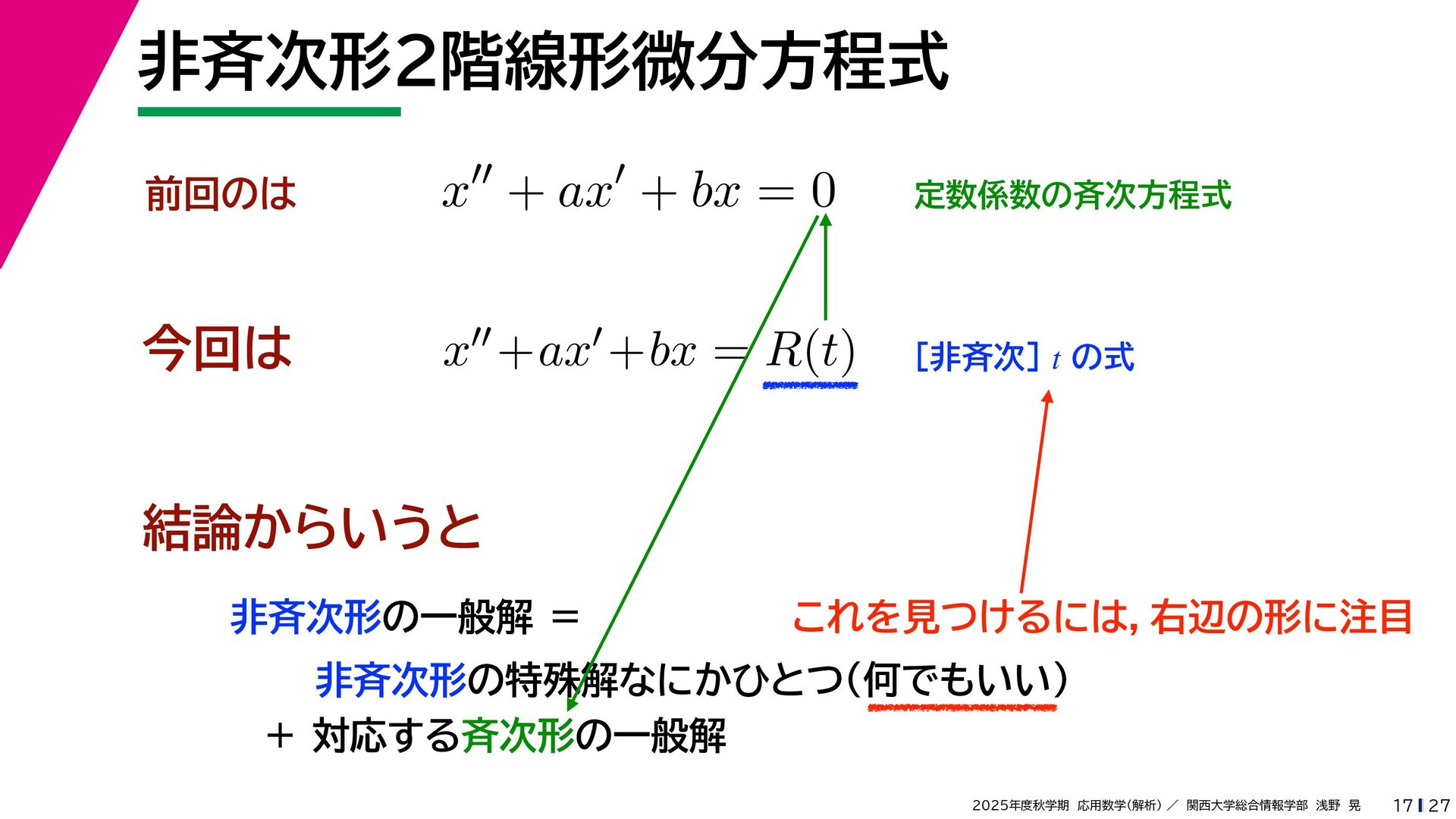 A cos 2t , なので, を元の方程式に代入すると x′ = − 2A sin 2t x′ ′ = − 4A cos 2t x′ , x′ ′ これが t に関係なくなりたつから, A = − 1 3 非斉次形の方程式の特殊解(のひとつ)は x = − 1 3 cos 2t x′′ + x = cos 2t このように「勘」をはたらかせる −4A cos 2t + A cos 2t = cos 2t (−4A + A − 1)cos 2t = 0 あとは,対応する斉次形の方程式 の一般解を求めてください。 x′ ′ + x = 0