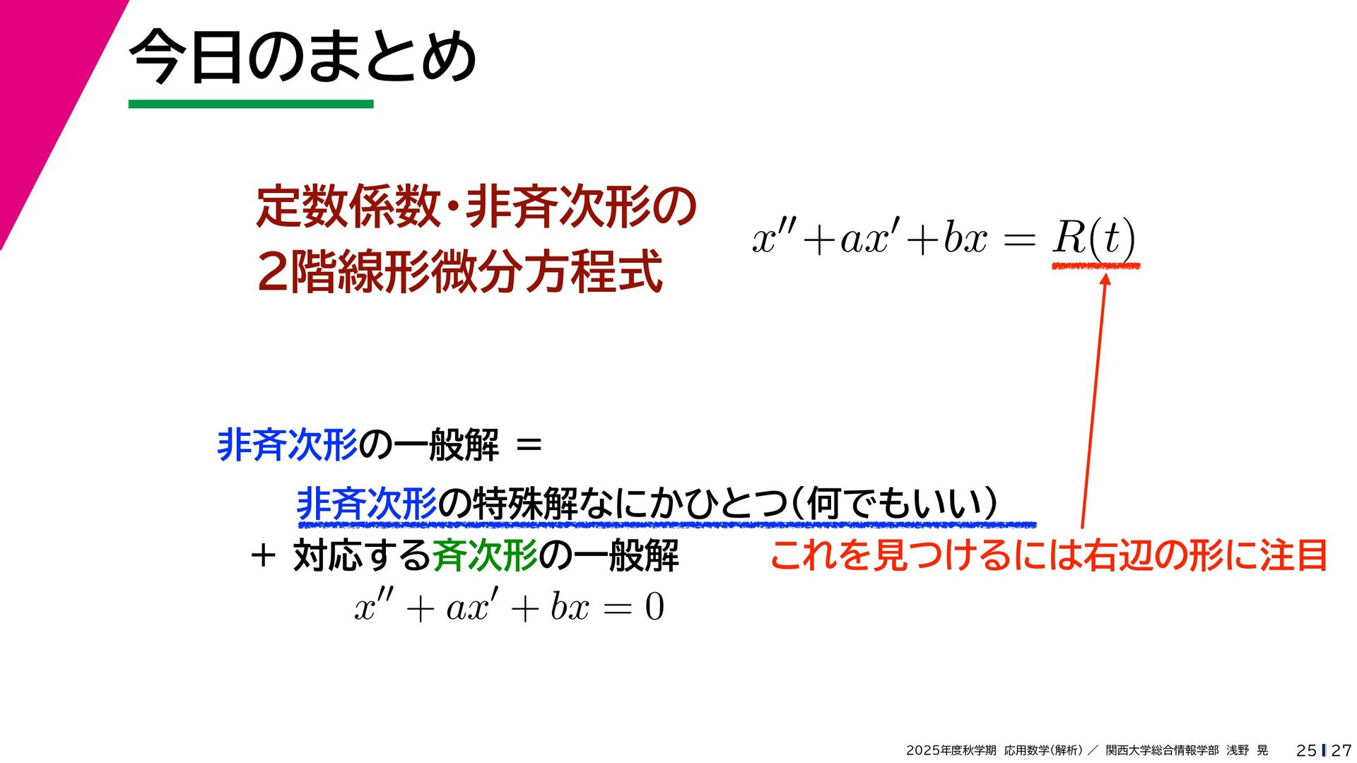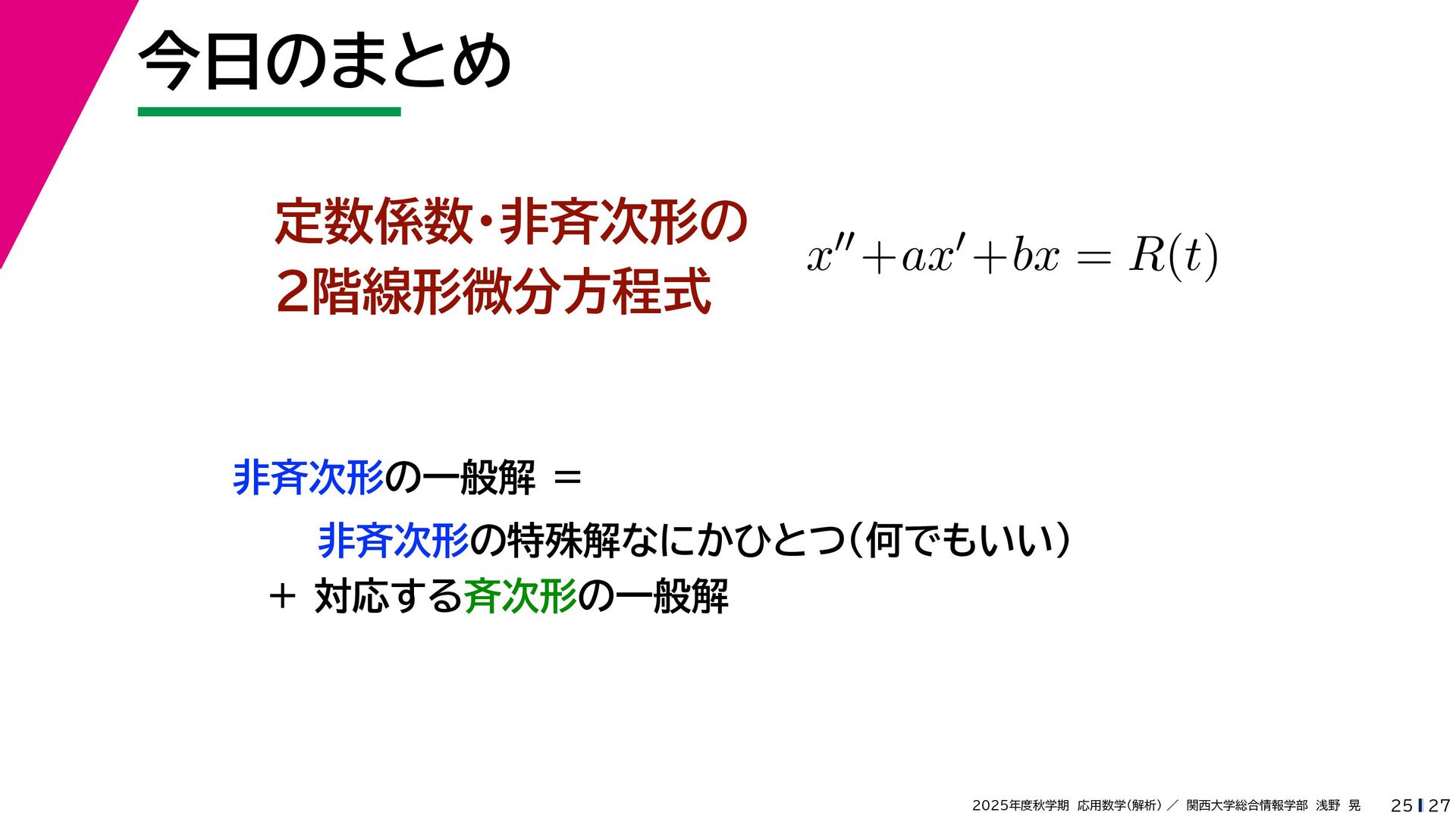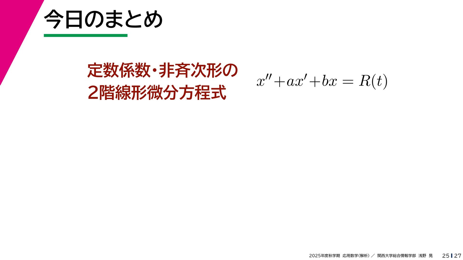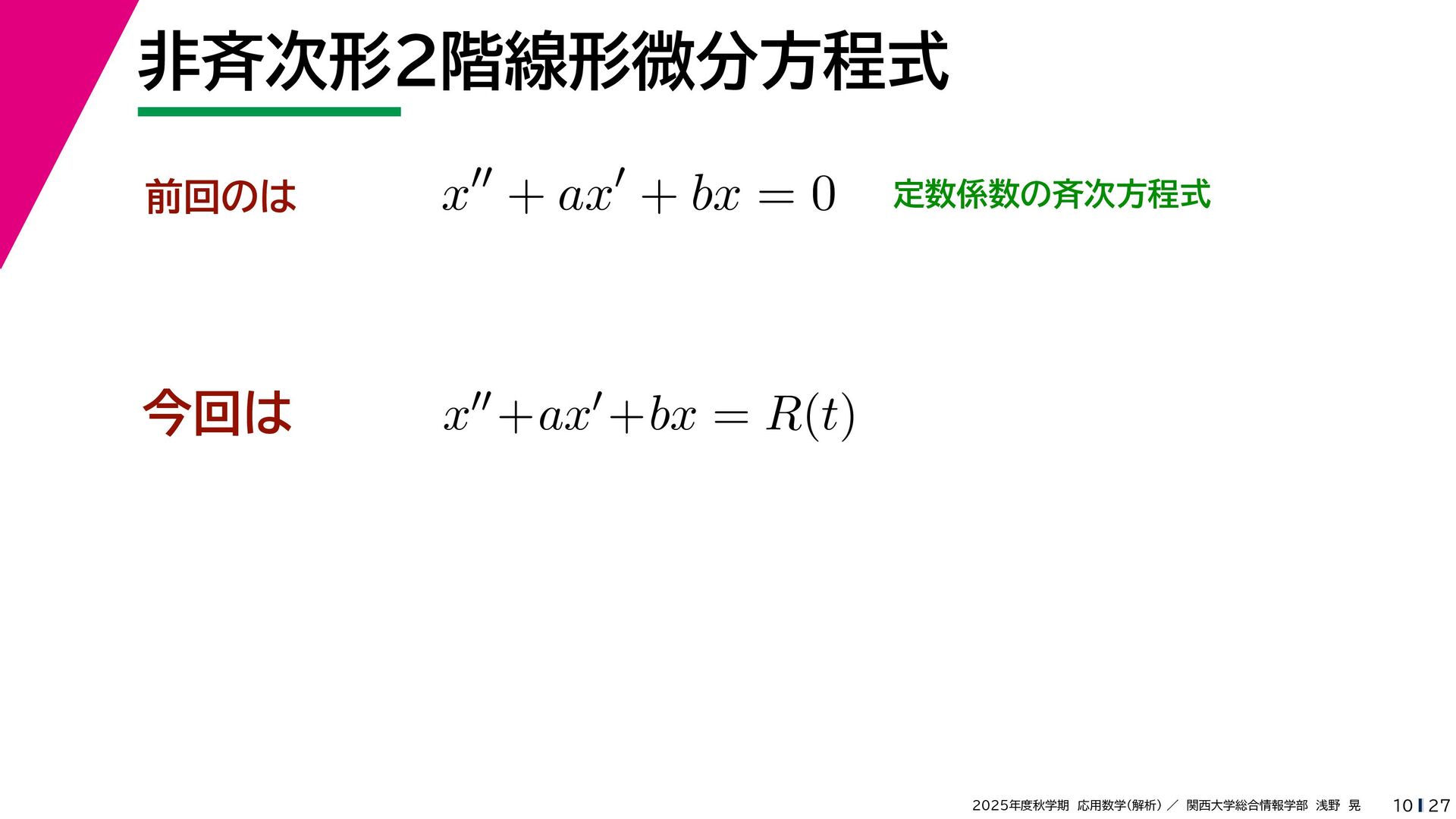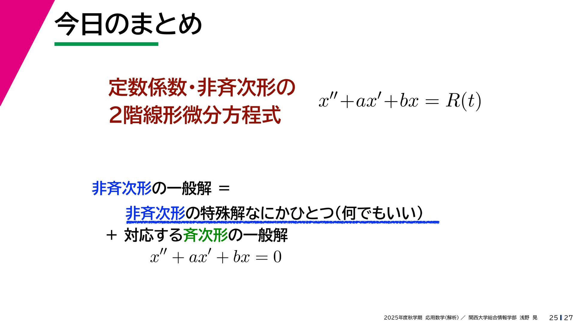 A cos 2t , なので, を元の方程式に代入すると x′ = − 2A sin 2t x′ ′ = − 4A cos 2t x′ , x′ ′ これが t に関係なくなりたつから, A = − 1 3 非斉次形の方程式の特殊解(のひとつ)は x = − 1 3 cos 2t x′′ + x = cos 2t このように「勘」をはたらかせる −4A cos 2t + A cos 2t = cos 2t (−4A + A − 1)cos 2t = 0 あとは,対応する斉次形の方程式 の一般解を求めてください。 x′ ′ + x = 0