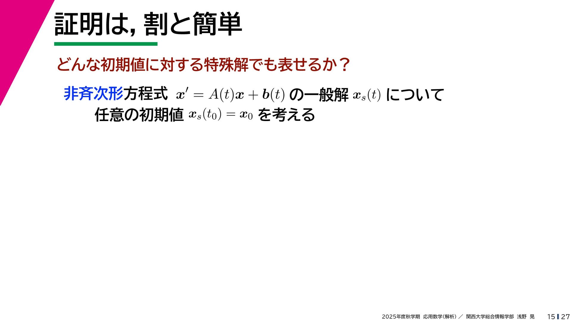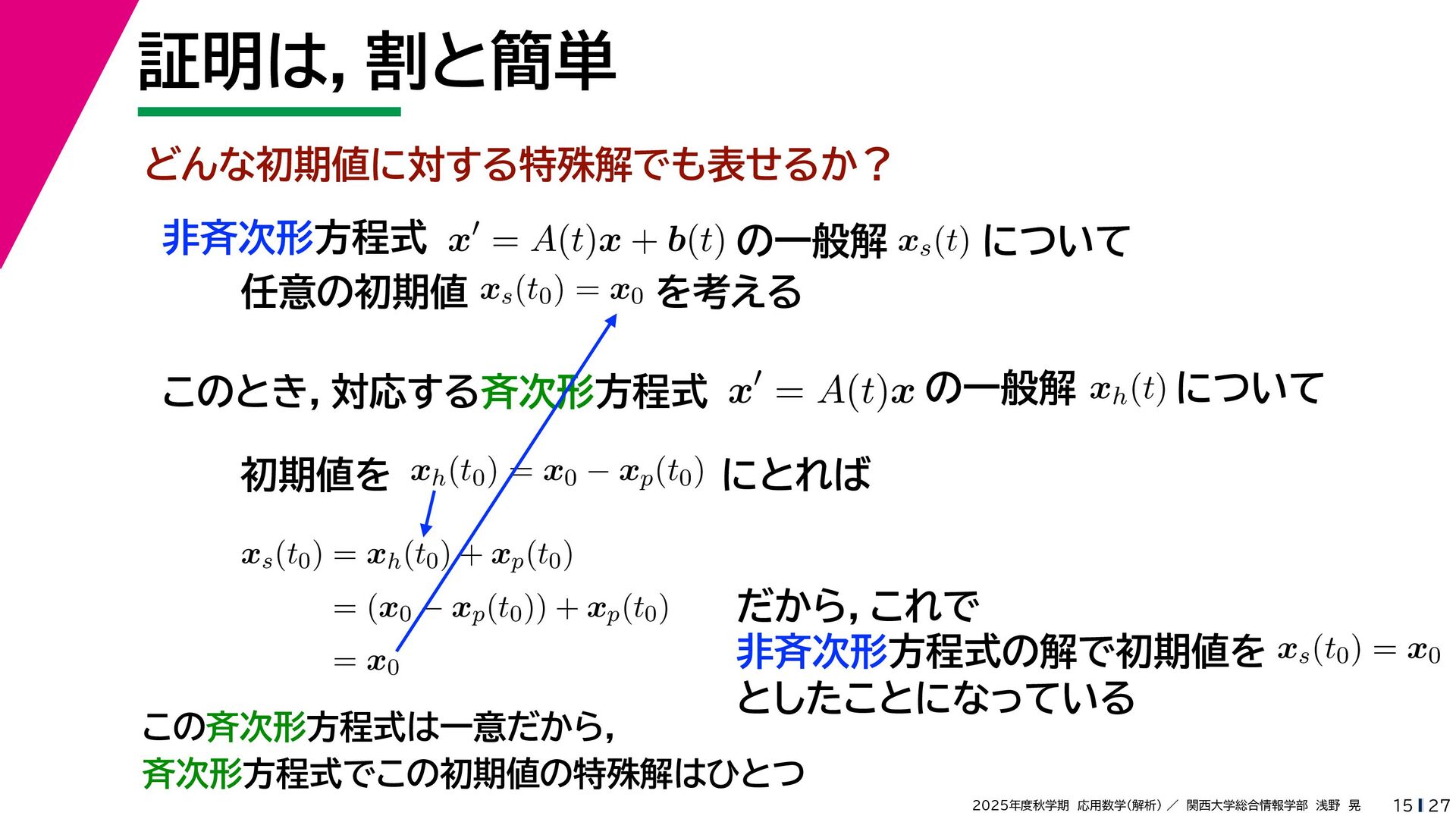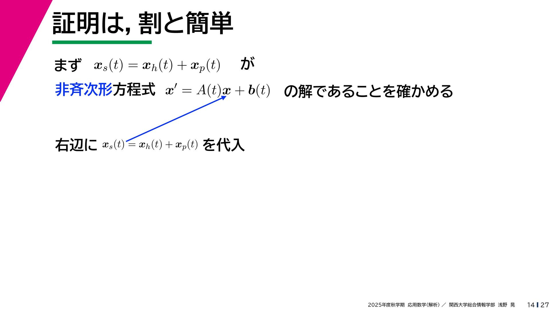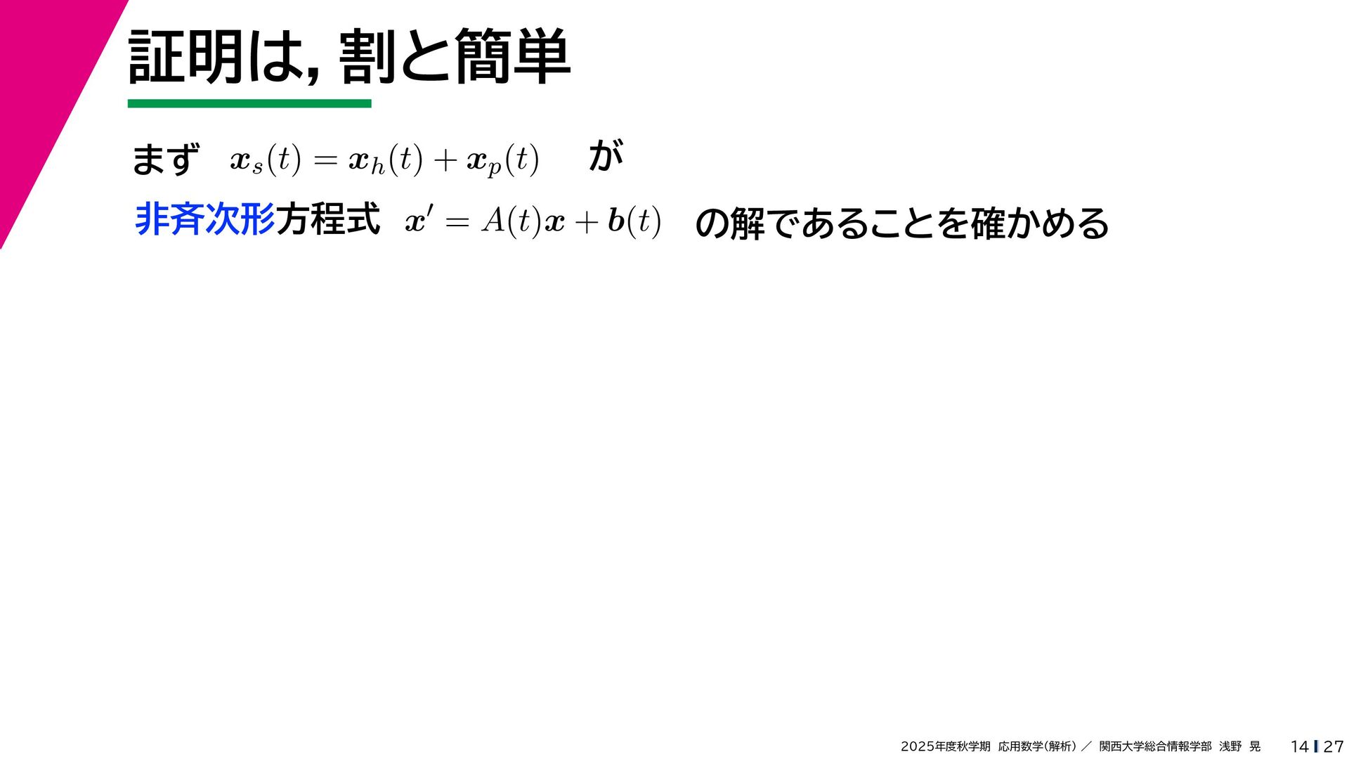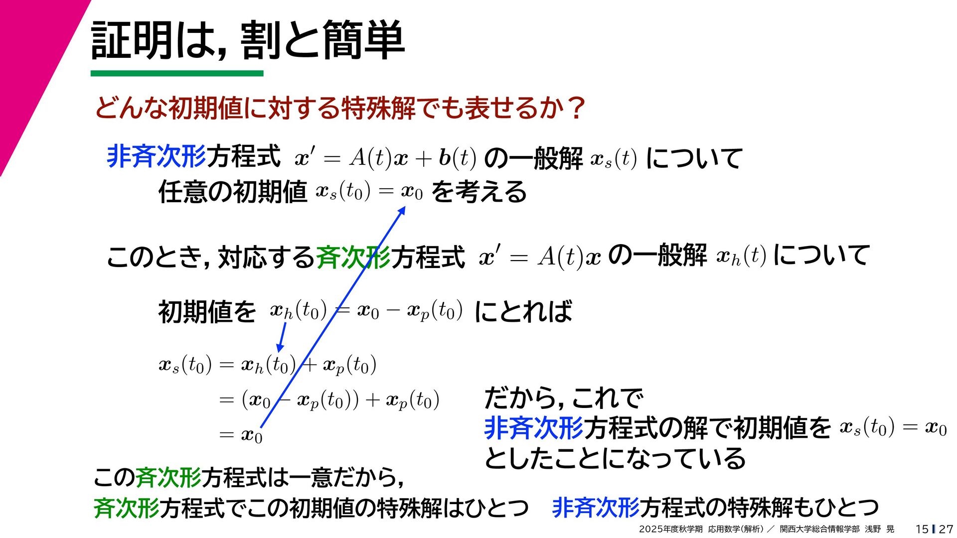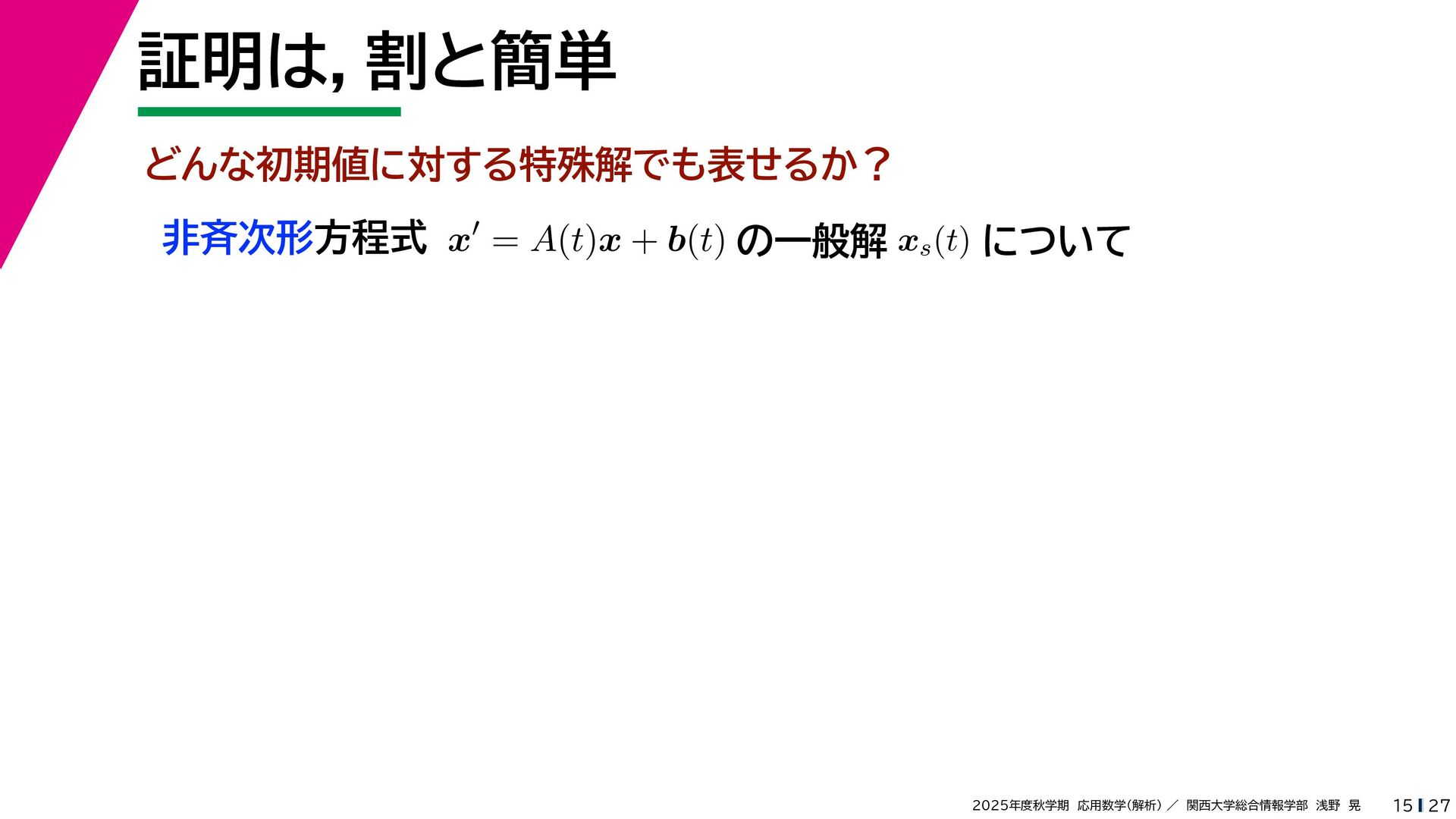 A cos 2t , なので, を元の方程式に代入すると x′ = − 2A sin 2t x′ ′ = − 4A cos 2t x′ , x′ ′ これが t に関係なくなりたつから, A = − 1 3 非斉次形の方程式の特殊解(のひとつ)は x = − 1 3 cos 2t x′′ + x = cos 2t このように「勘」をはたらかせる −4A cos 2t + A cos 2t = cos 2t (−4A + A − 1)cos 2t = 0 あとは,対応する斉次形の方程式 の一般解を求めてください。 x′ ′ + x = 0