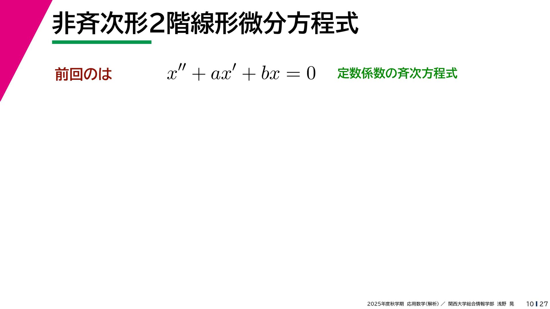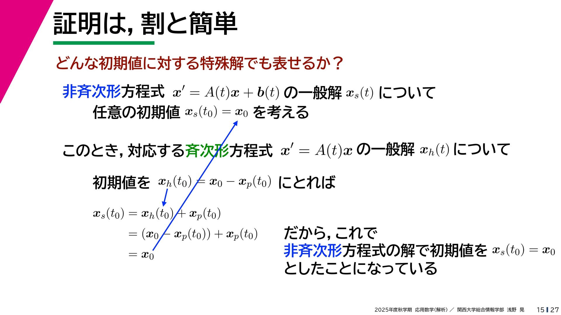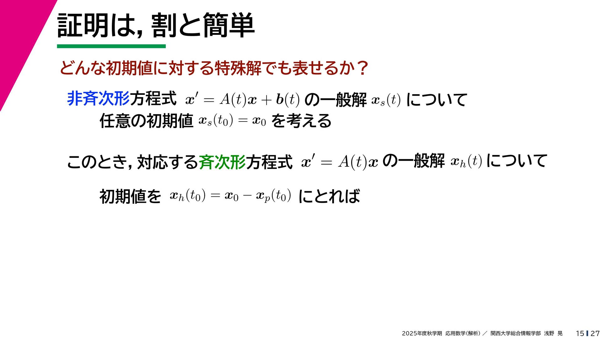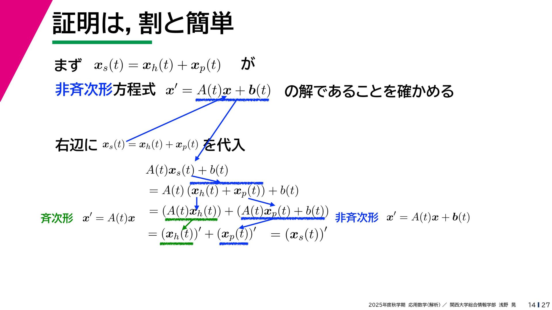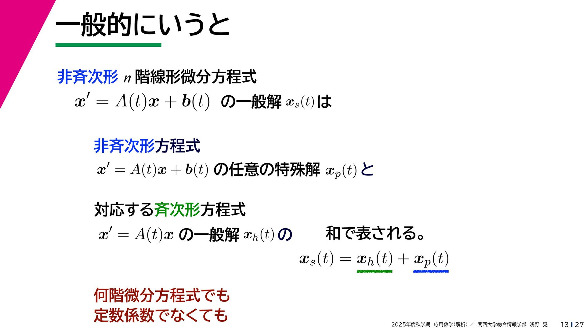A cos 2t , なので, を元の方程式に代入すると x′ = − 2A sin 2t x′ ′ = − 4A cos 2t x′ , x′ ′ これが t に関係なくなりたつから, A = − 1 3 非斉次形の方程式の特殊解(のひとつ)は x = − 1 3 cos 2t x′′ + x = cos 2t このように「勘」をはたらかせる −4A cos 2t + A cos 2t = cos 2t (−4A + A − 1)cos 2t = 0 あとは,対応する斉次形の方程式 の一般解を求めてください。 x′ ′ + x = 0
