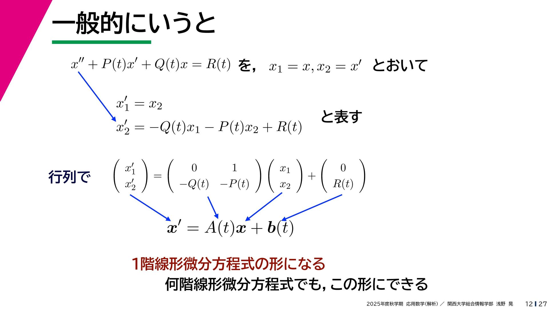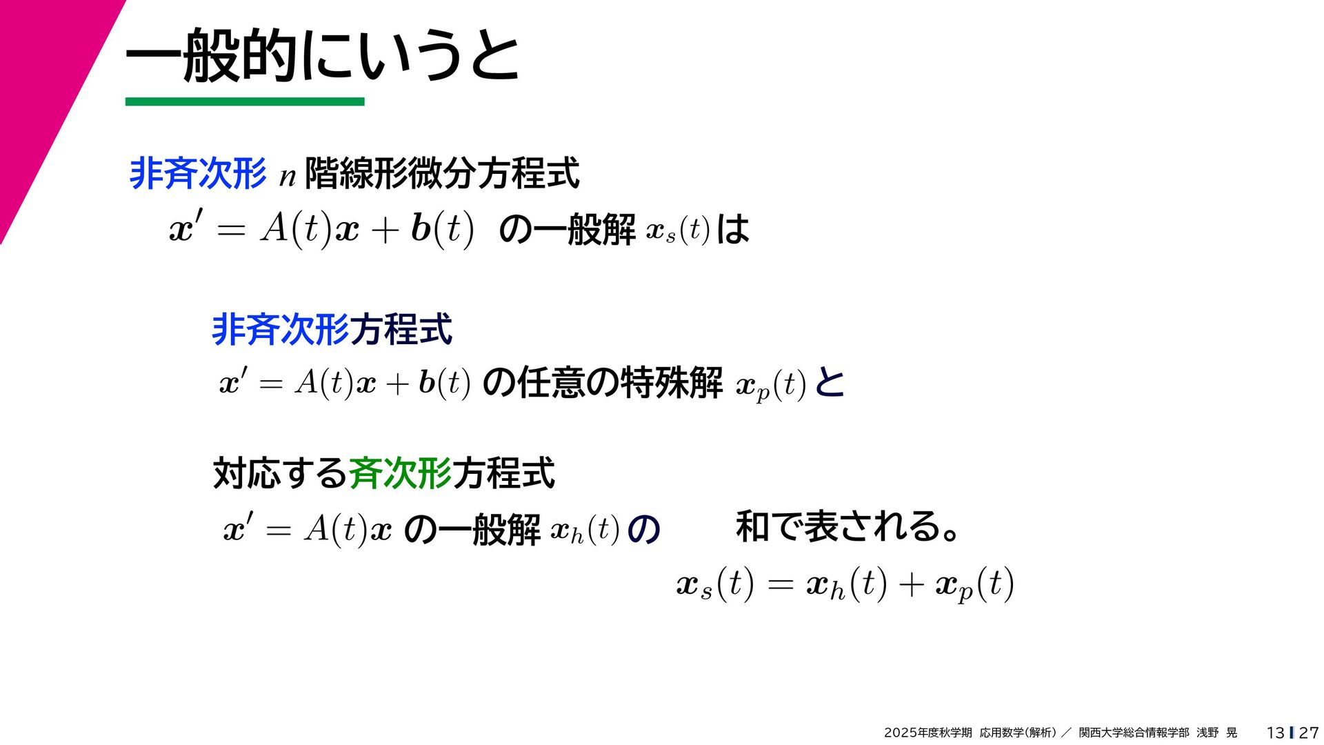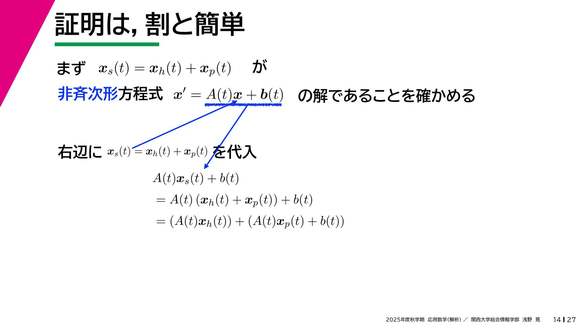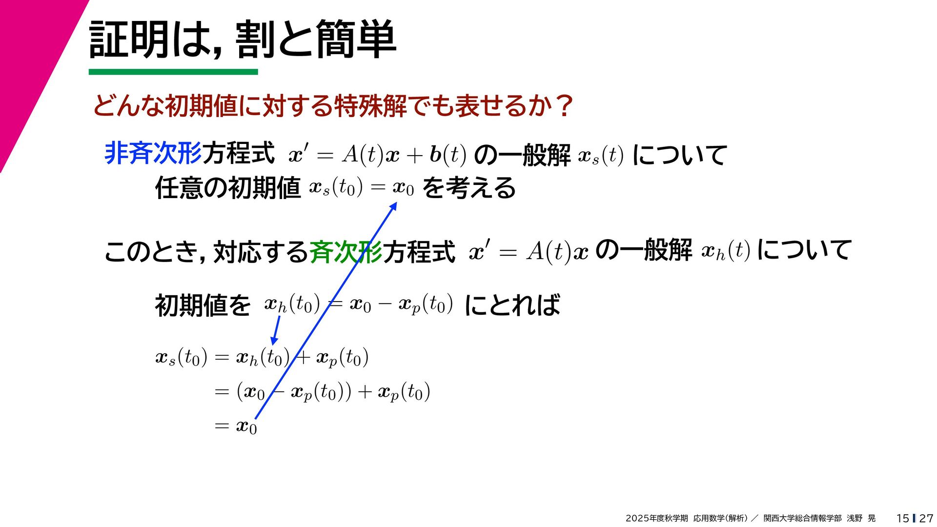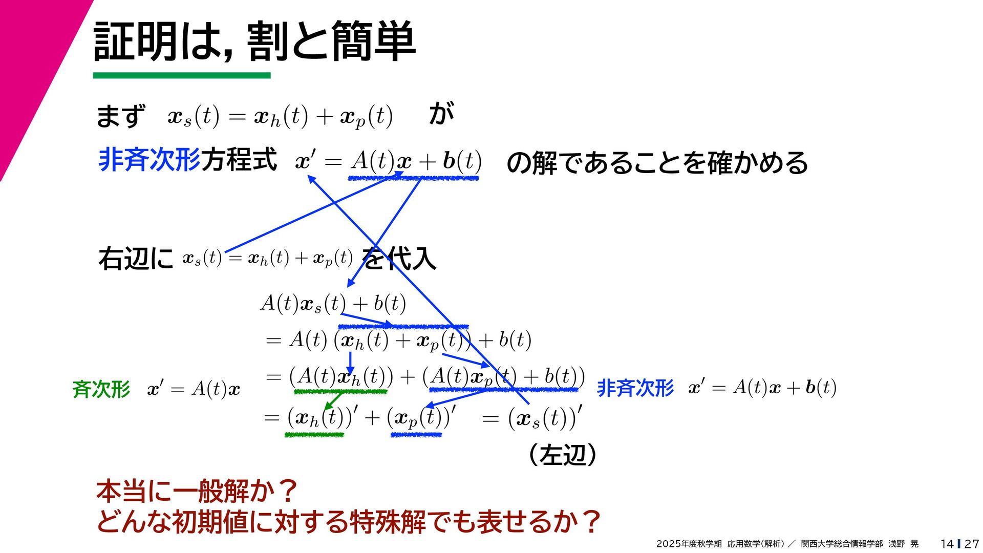 A cos 2t , なので, を元の方程式に代入すると x′ = − 2A sin 2t x′ ′ = − 4A cos 2t x′ , x′ ′ これが t に関係なくなりたつから, A = − 1 3 非斉次形の方程式の特殊解(のひとつ)は x = − 1 3 cos 2t x′′ + x = cos 2t このように「勘」をはたらかせる −4A cos 2t + A cos 2t = cos 2t (−4A + A − 1)cos 2t = 0 あとは,対応する斉次形の方程式 の一般解を求めてください。 x′ ′ + x = 0