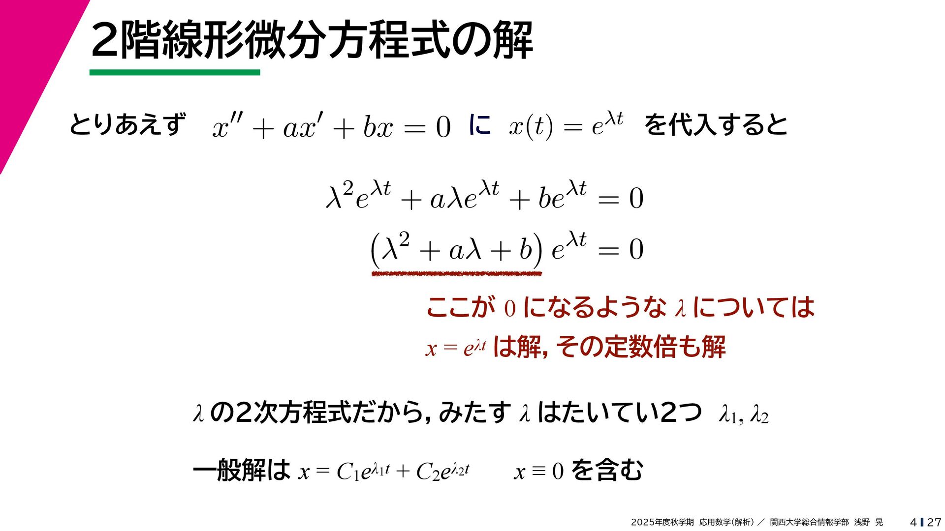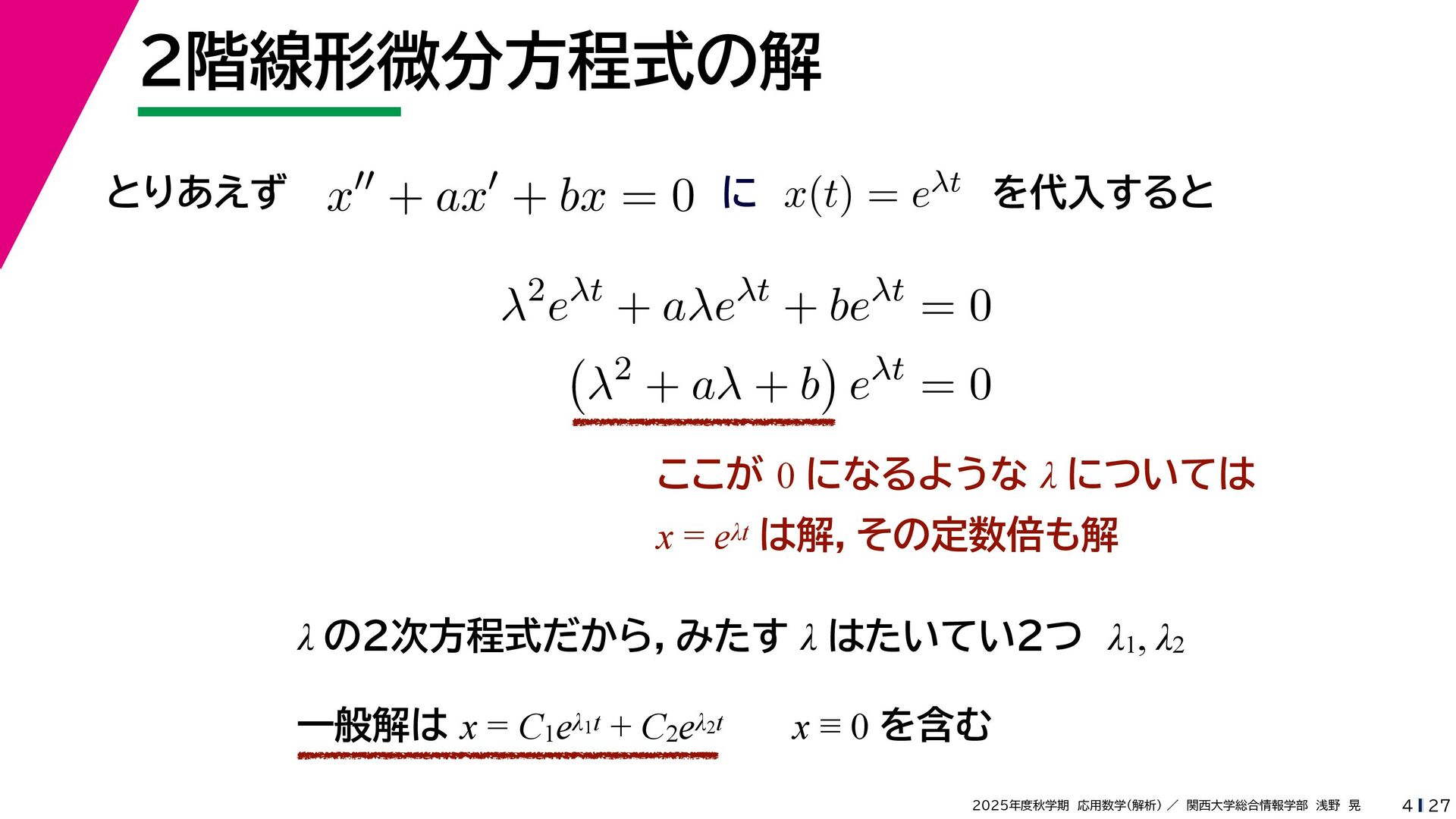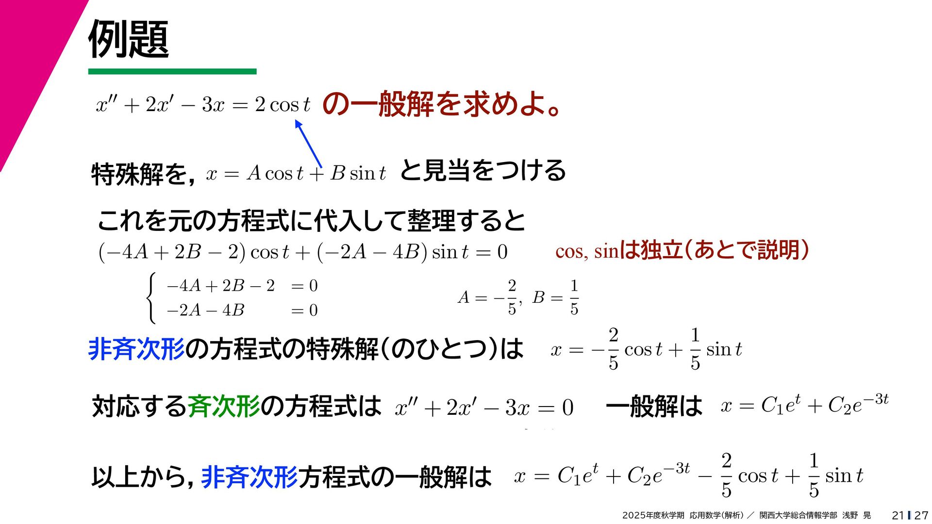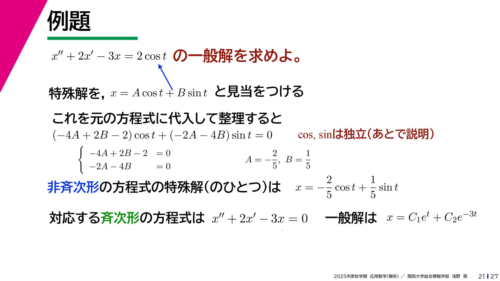 − 3x = 0 解 定数 一般解は x = C1et + C2e−3t x′′ + 2x′ − 3x = 2 cos t 特殊解を, と見当をつける x = A cos t + B sin t これを元の方程式に代入して整理すると (−4A + 2B − 2) cos t + (−2A − 4B) sin t = 0 cos, sinは独立(あとで説明) −4A + 2B − 2 = 0 −2A − 4B = 0 A = − 2 5 , B = 1 5 非斉次形の方程式の特殊解(のひとつ)は x = − 2 5 cos t + 1 5 sin t