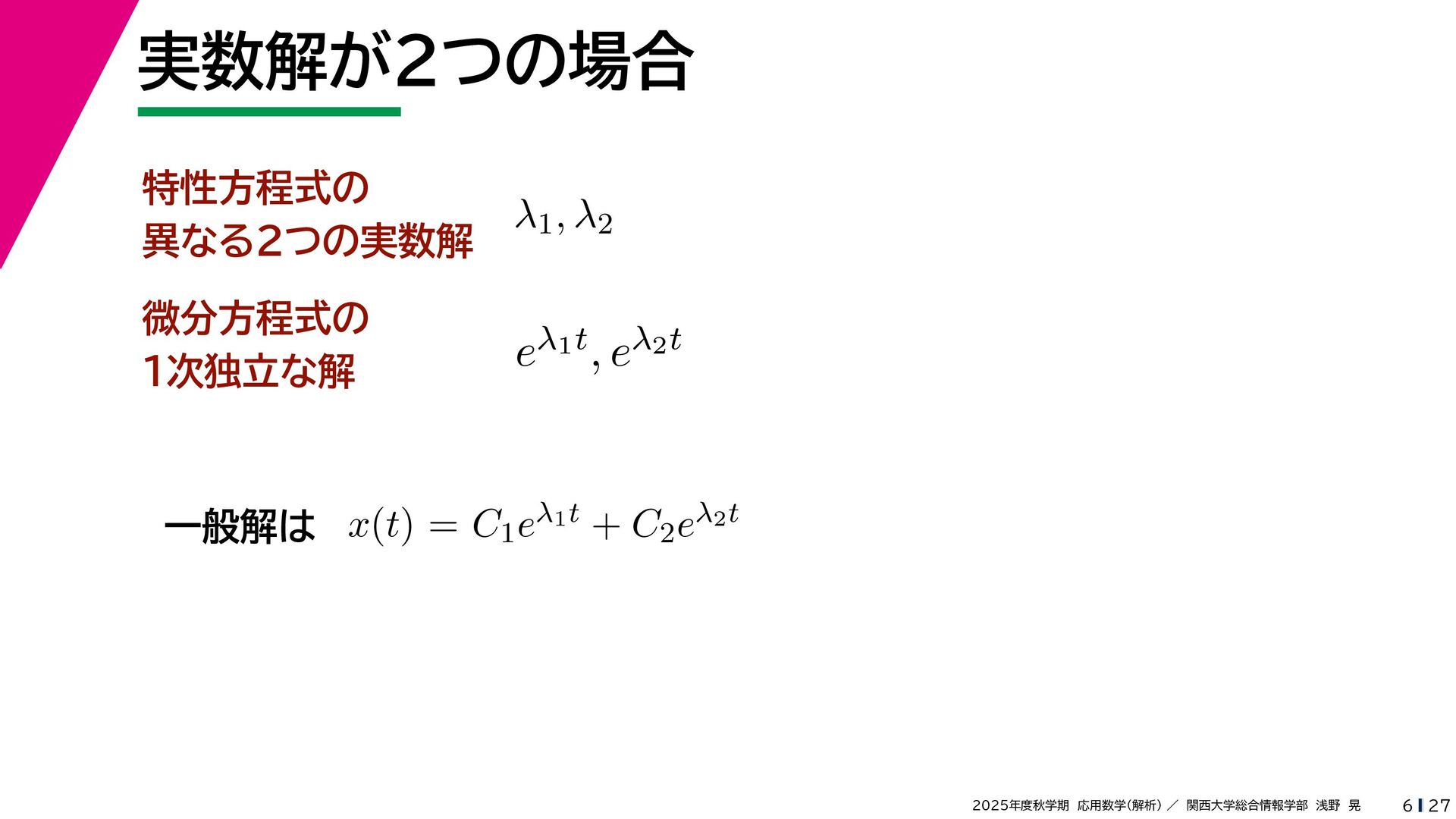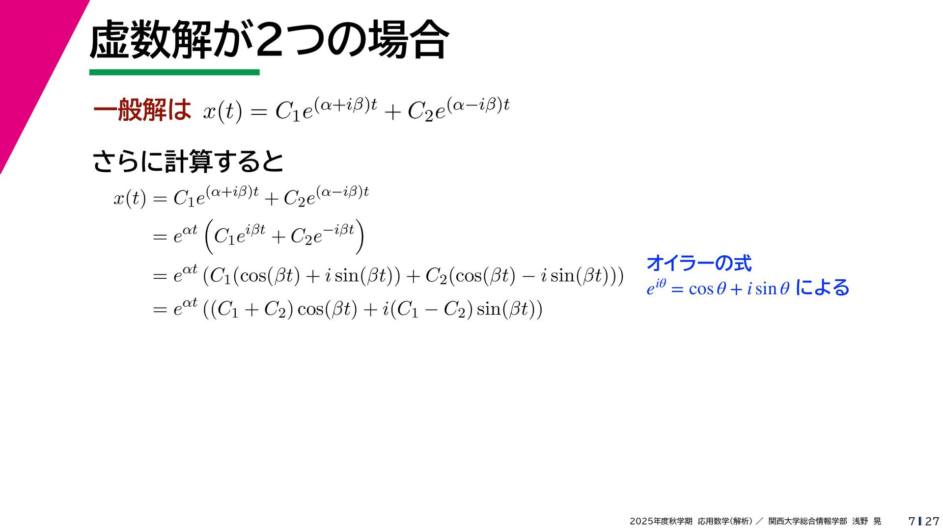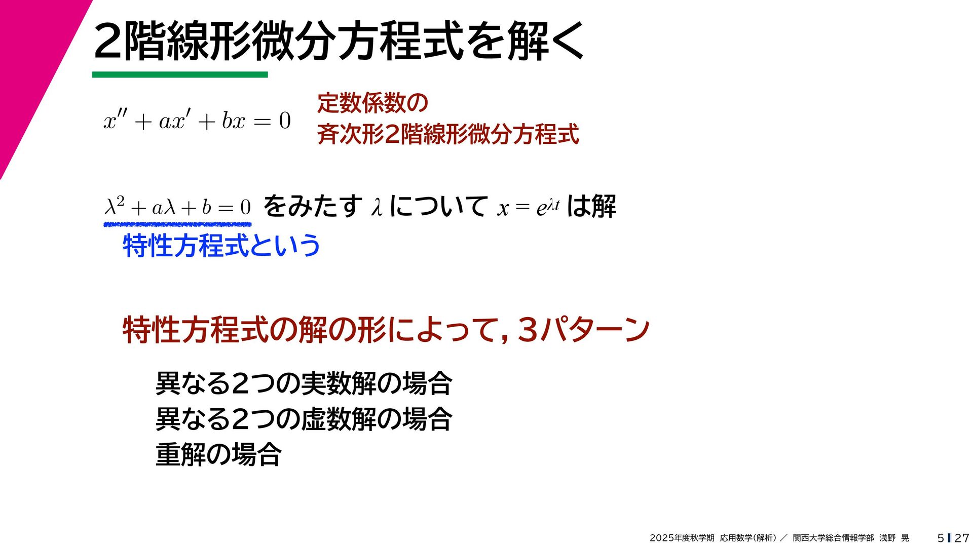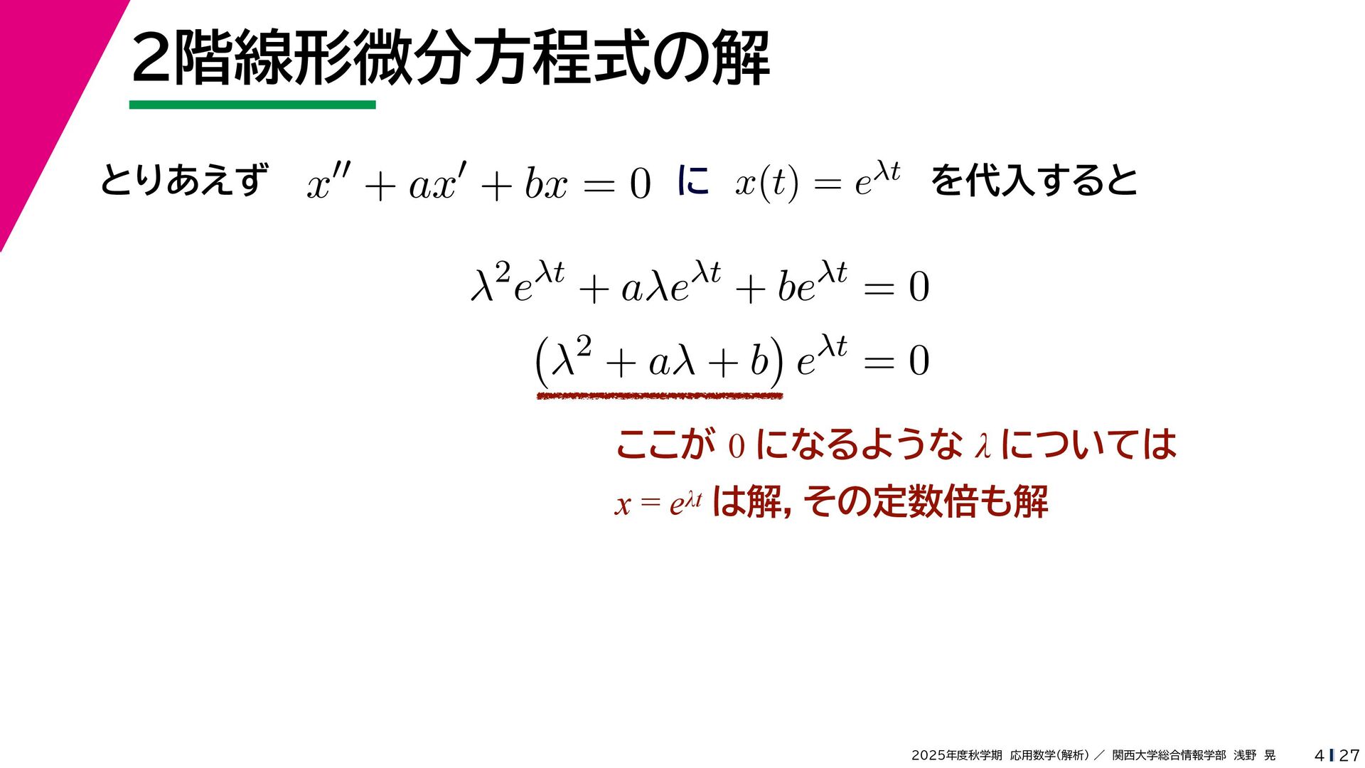 − 3x = 0 解 定数 一般解は x = C1et + C2e−3t x′′ + 2x′ − 3x = 2 cos t 特殊解を, と見当をつける x = A cos t + B sin t これを元の方程式に代入して整理すると (−4A + 2B − 2) cos t + (−2A − 4B) sin t = 0 cos, sinは独立(あとで説明) −4A + 2B − 2 = 0 −2A − 4B = 0 A = − 2 5 , B = 1 5 非斉次形の方程式の特殊解(のひとつ)は x = − 2 5 cos t + 1 5 sin t