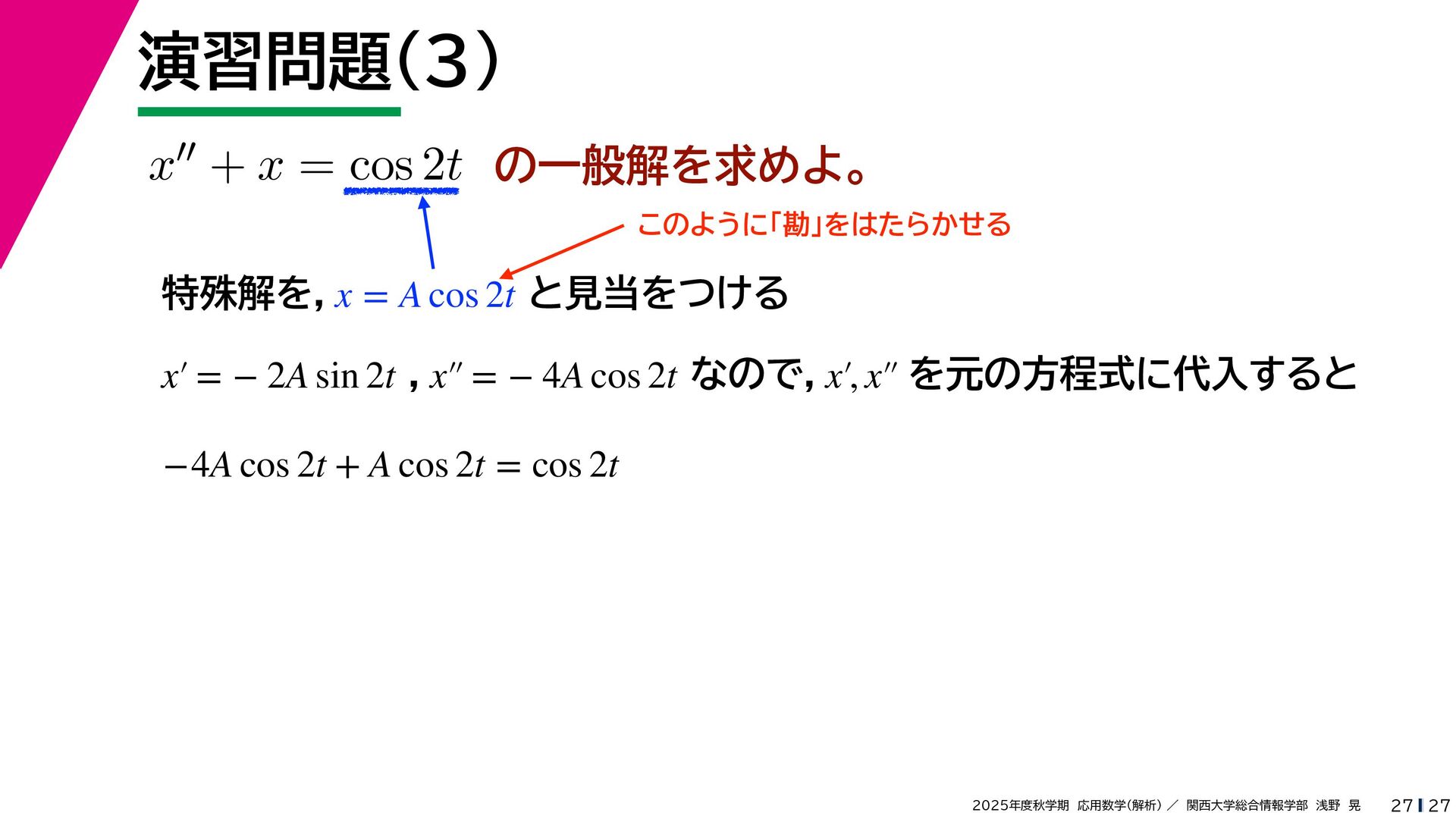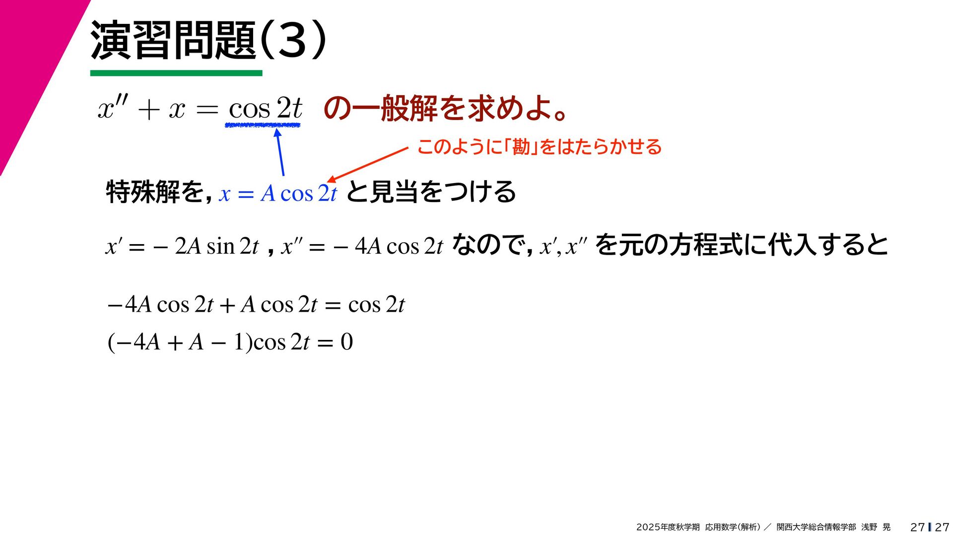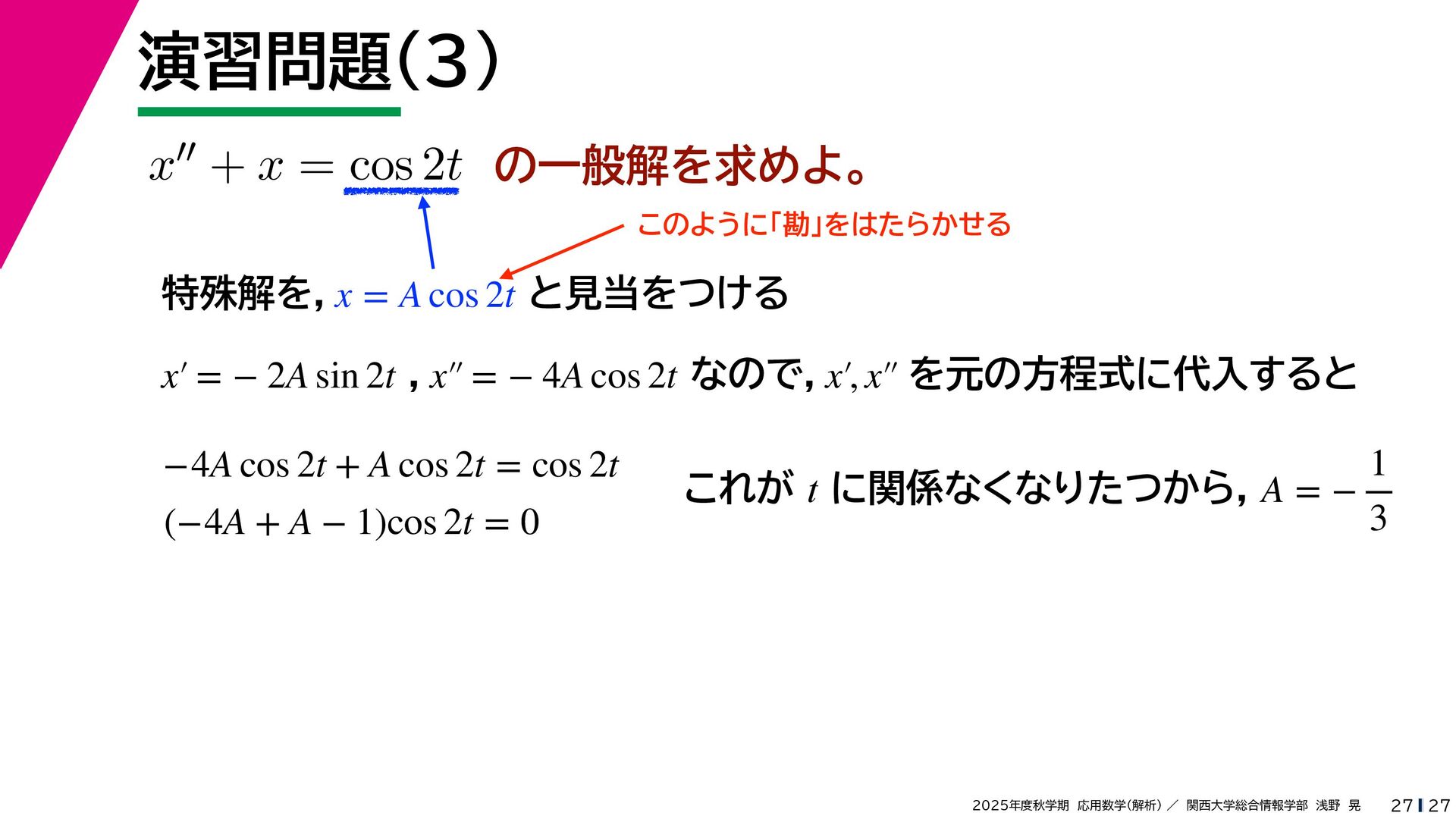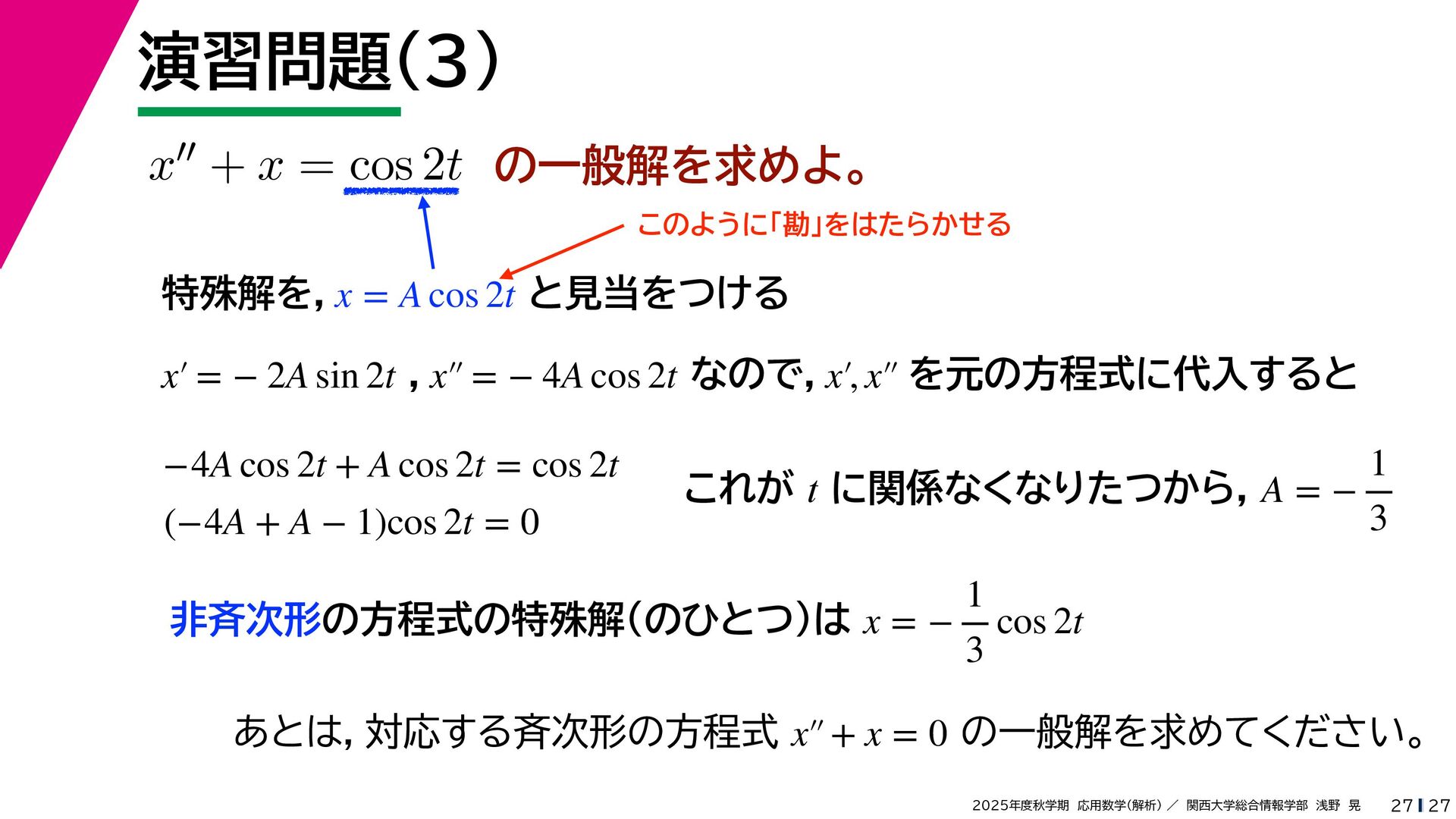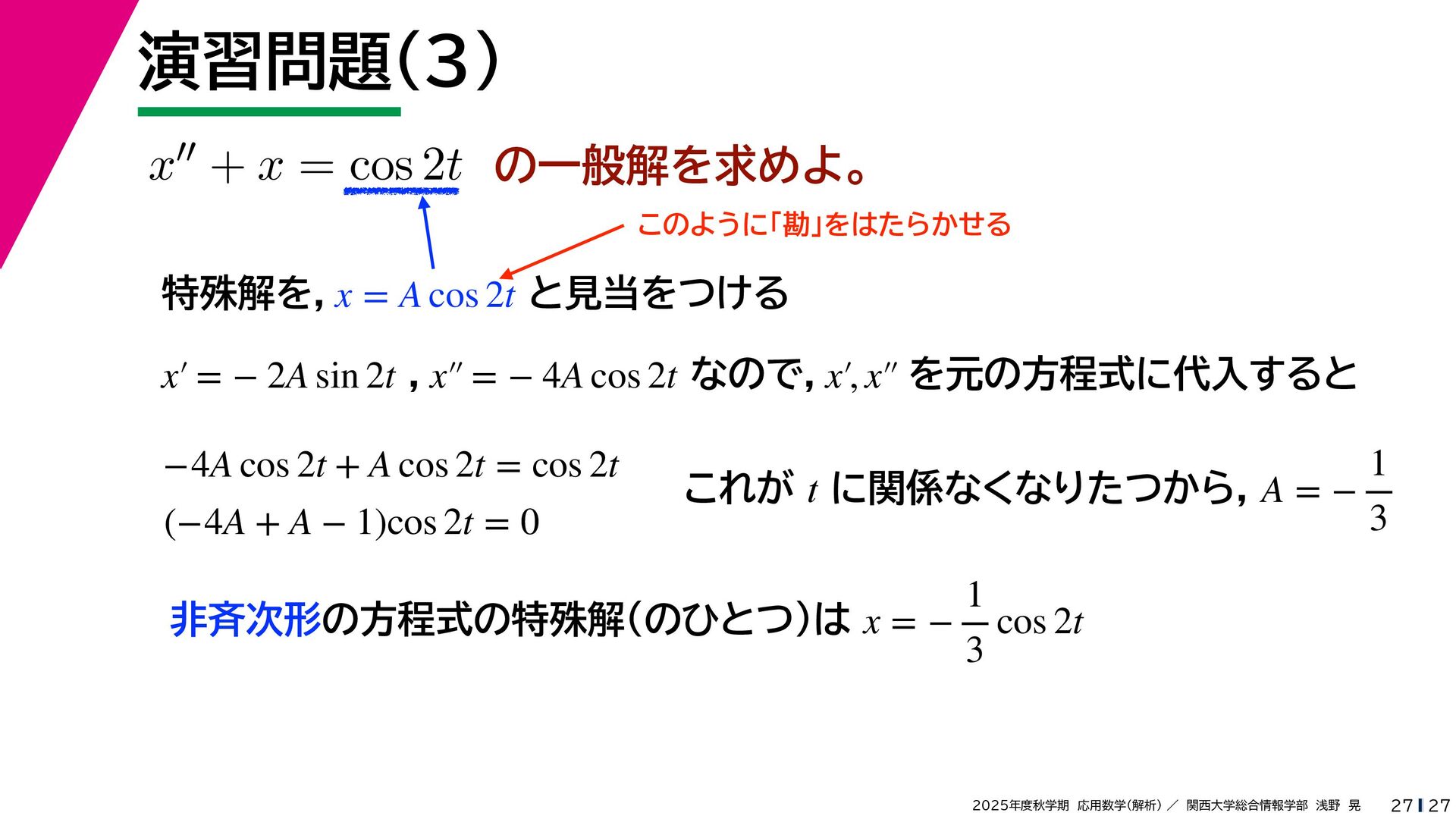 A cos 2t , なので, を元の方程式に代入すると x′ = − 2A sin 2t x′ ′ = − 4A cos 2t x′ , x′ ′ これが t に関係なくなりたつから, A = − 1 3 x′′ + x = cos 2t このように「勘」をはたらかせる −4A cos 2t + A cos 2t = cos 2t (−4A + A − 1)cos 2t = 0