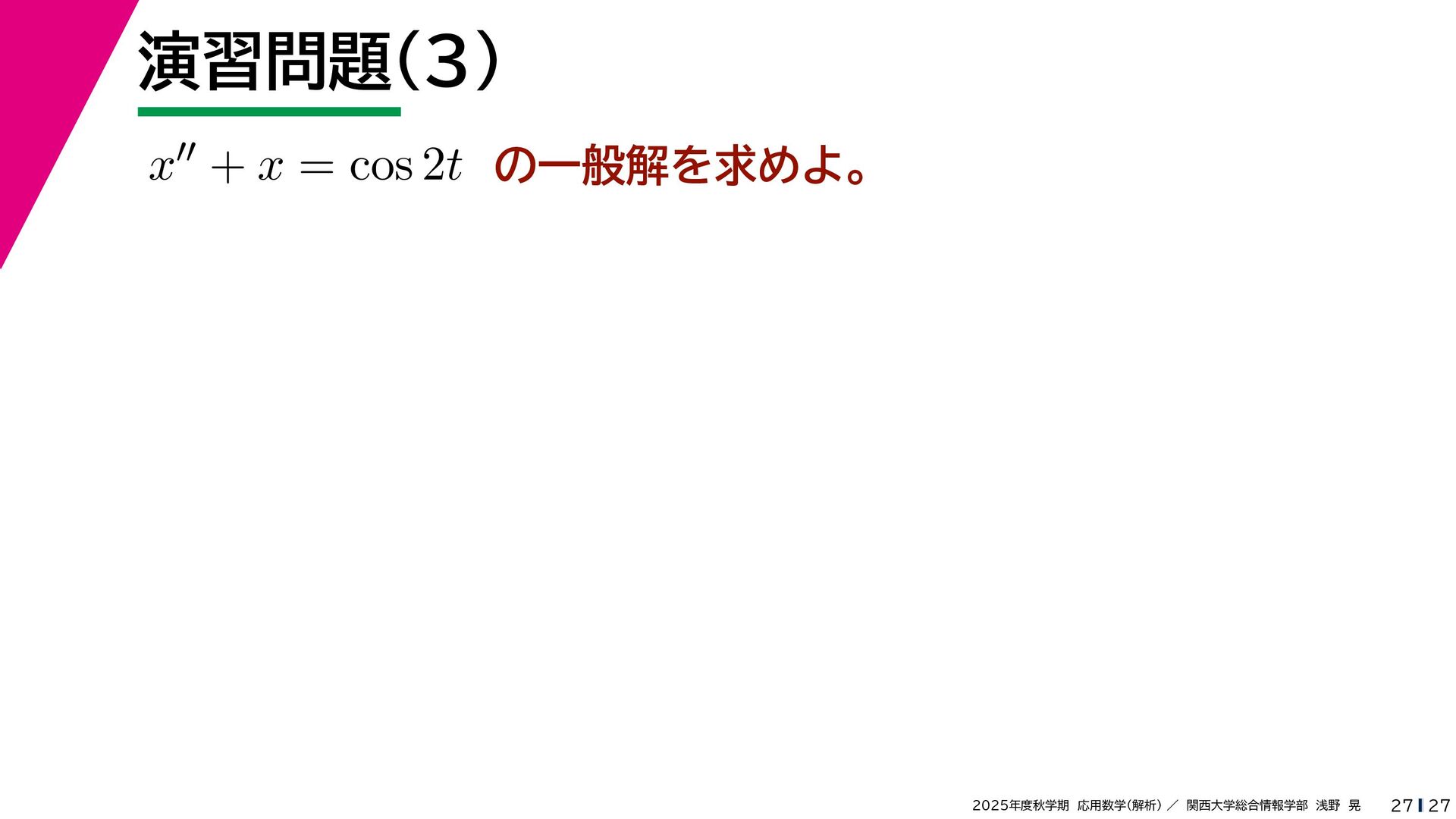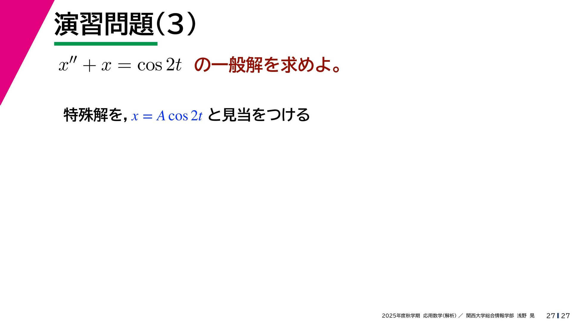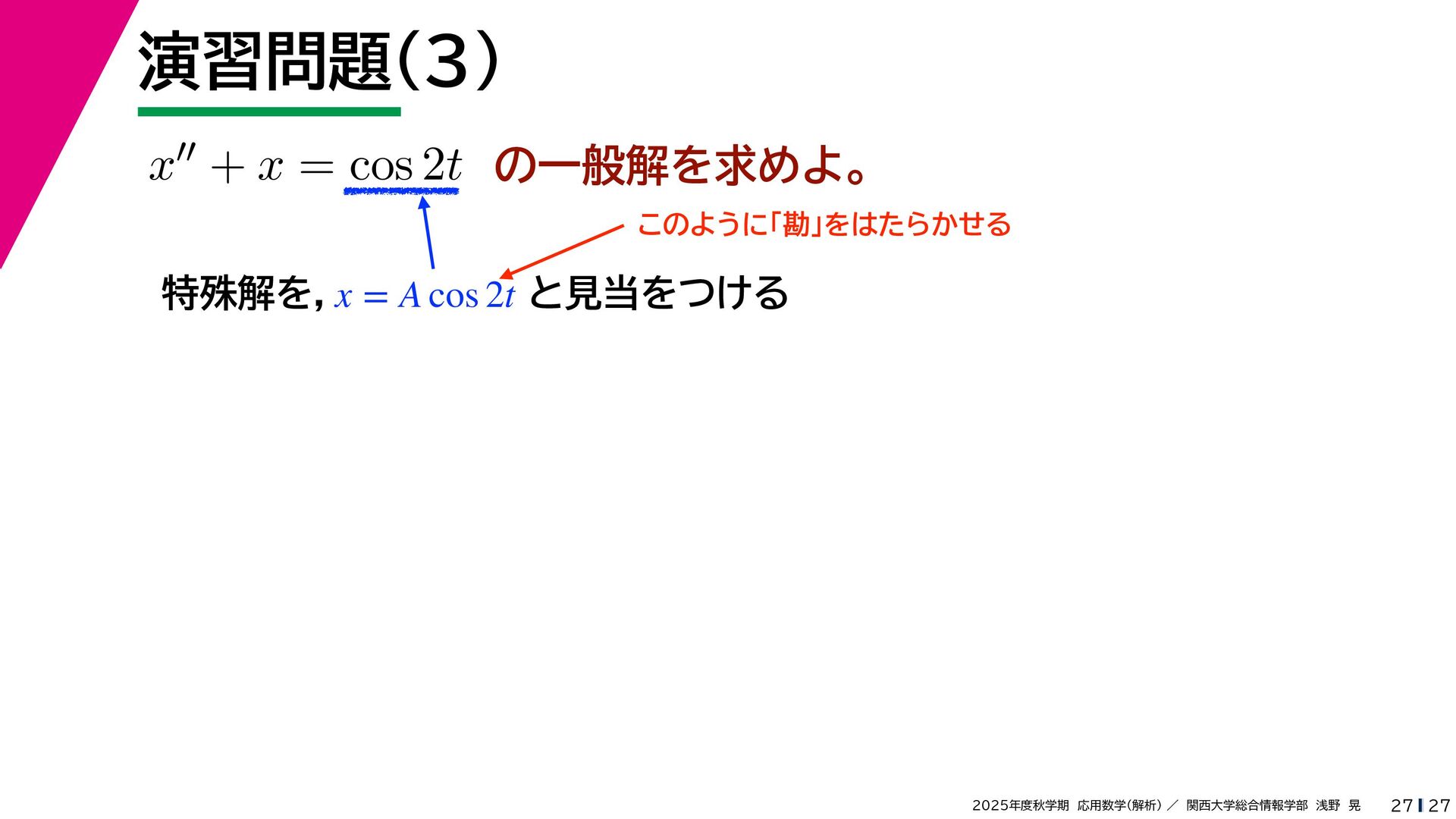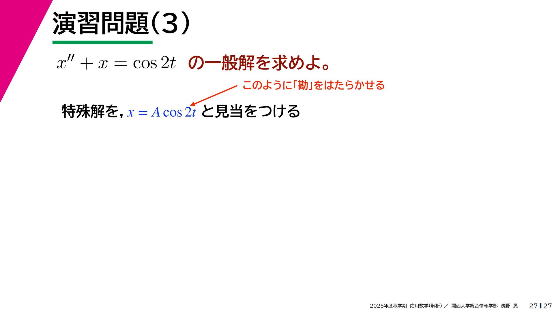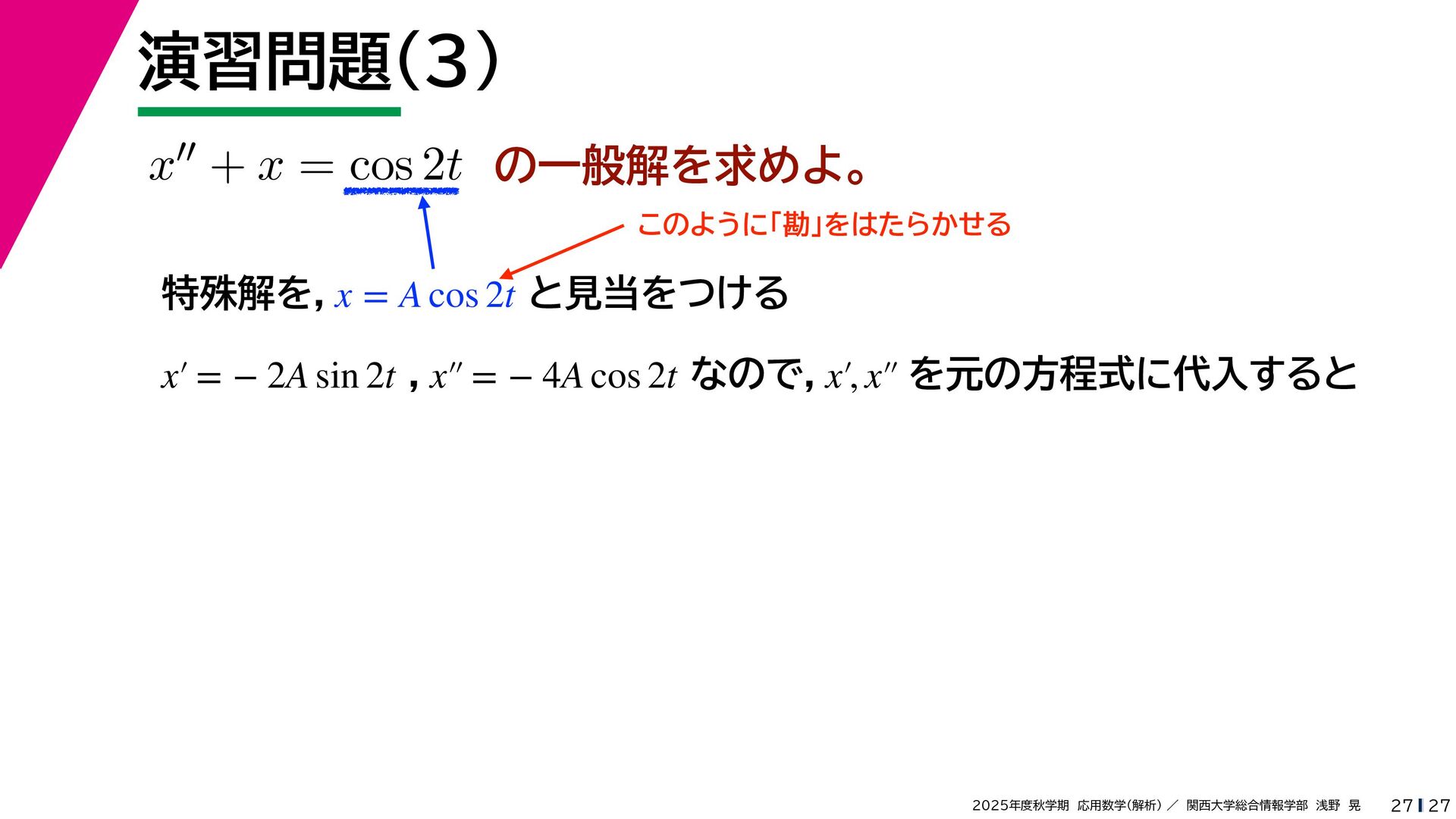 A cos 2t , なので, を元の方程式に代入すると x′ = − 2A sin 2t x′ ′ = − 4A cos 2t x′ , x′ ′ これが t に関係なくなりたつから, A = − 1 3 x′′ + x = cos 2t このように「勘」をはたらかせる −4A cos 2t + A cos 2t = cos 2t (−4A + A − 1)cos 2t = 0
