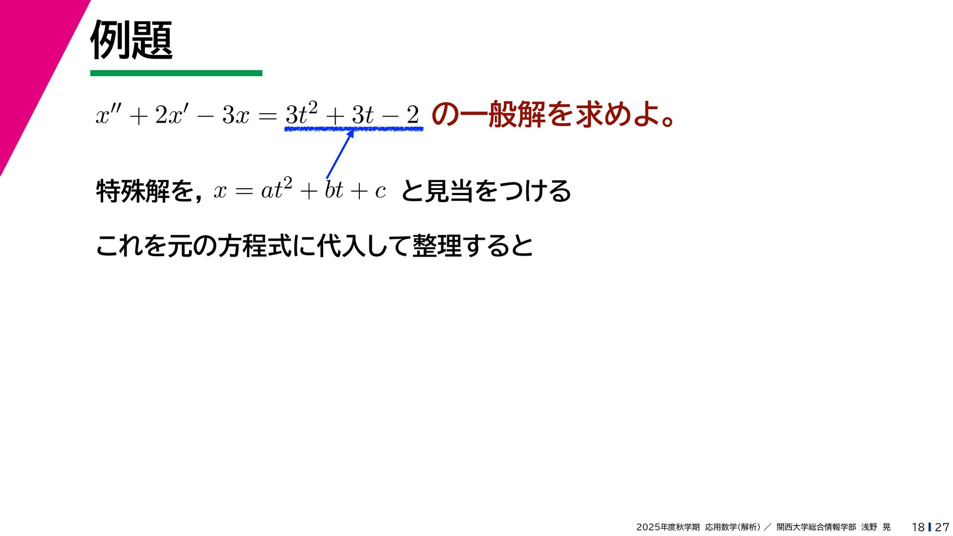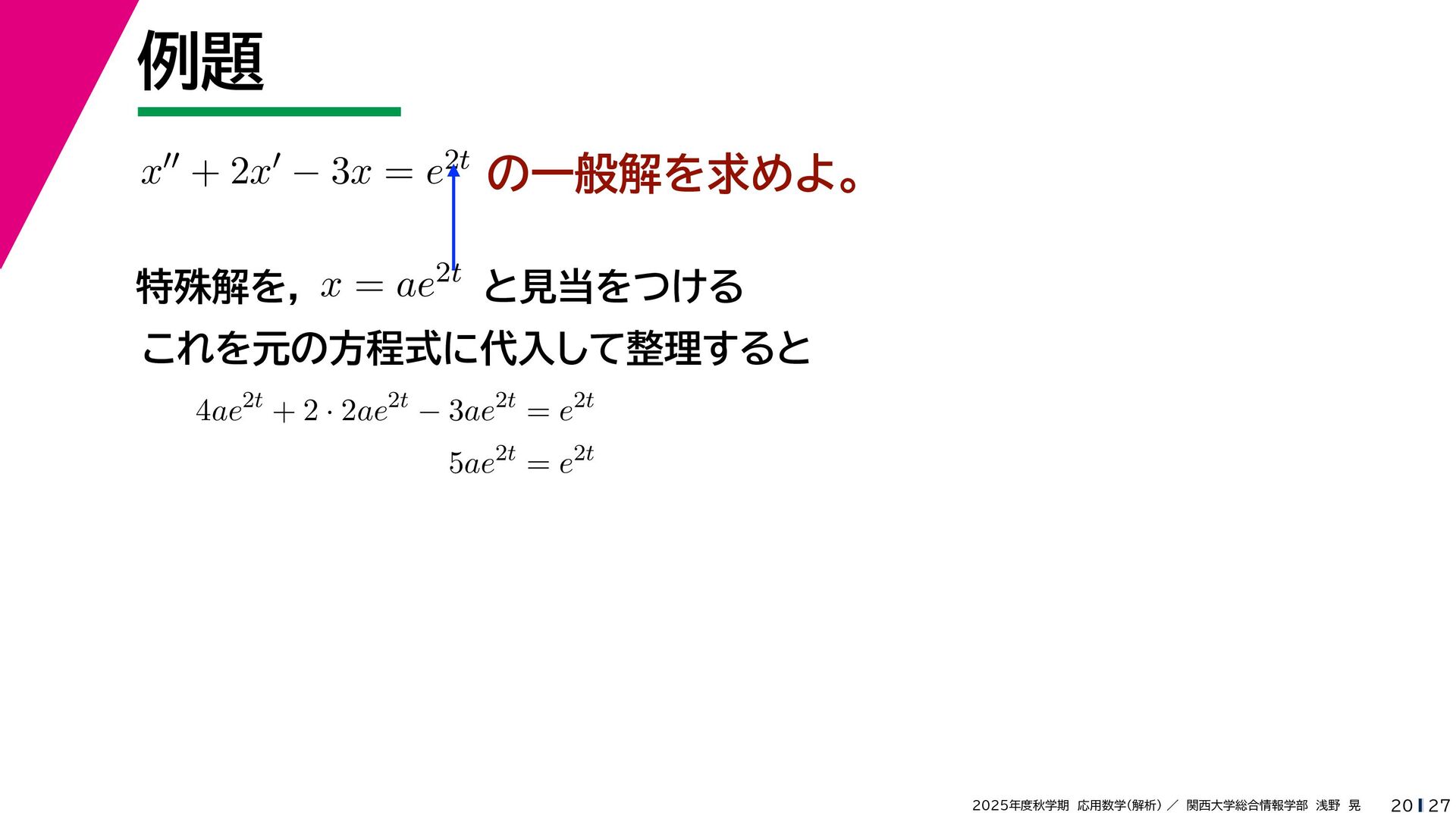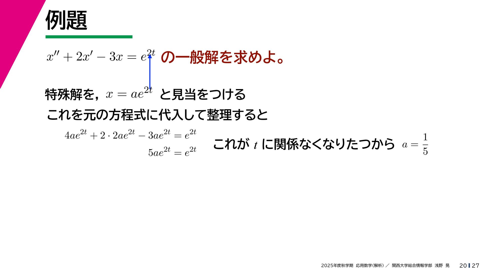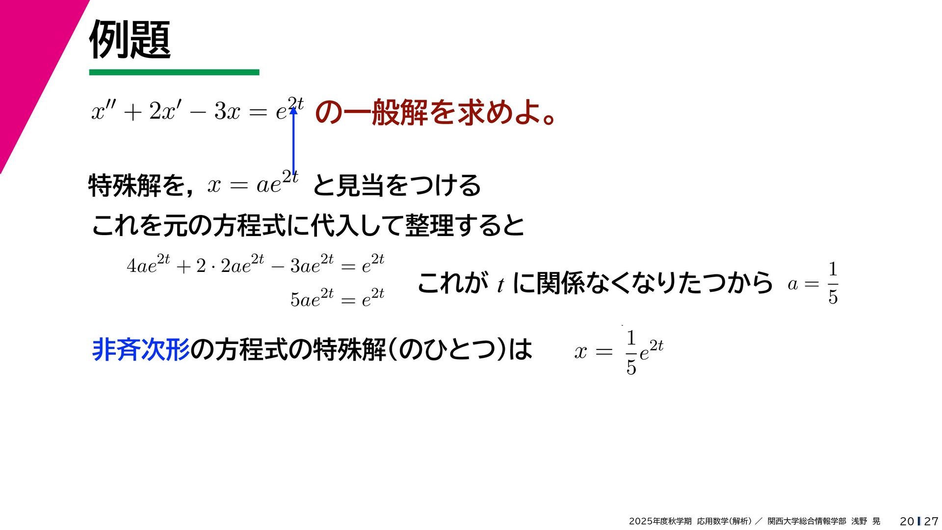 A cos 2t , なので, を元の方程式に代入すると x′ = − 2A sin 2t x′ ′ = − 4A cos 2t x′ , x′ ′ これが t に関係なくなりたつから, A = − 1 3 x′′ + x = cos 2t このように「勘」をはたらかせる −4A cos 2t + A cos 2t = cos 2t (−4A + A − 1)cos 2t = 0