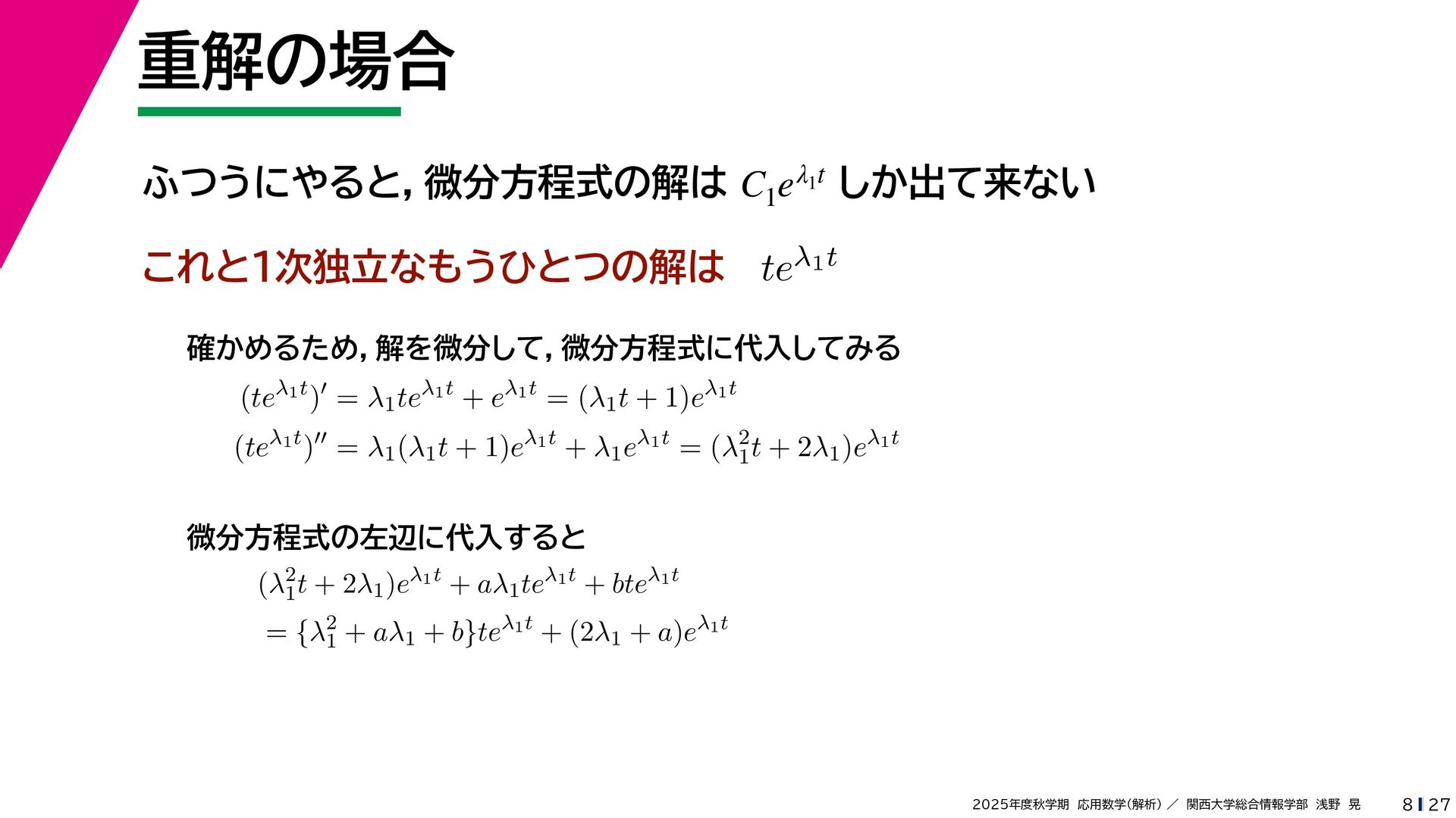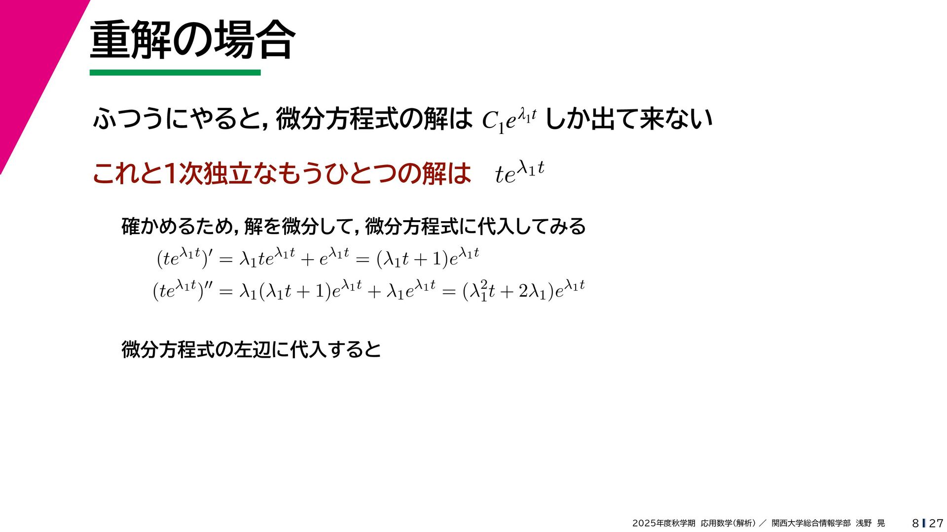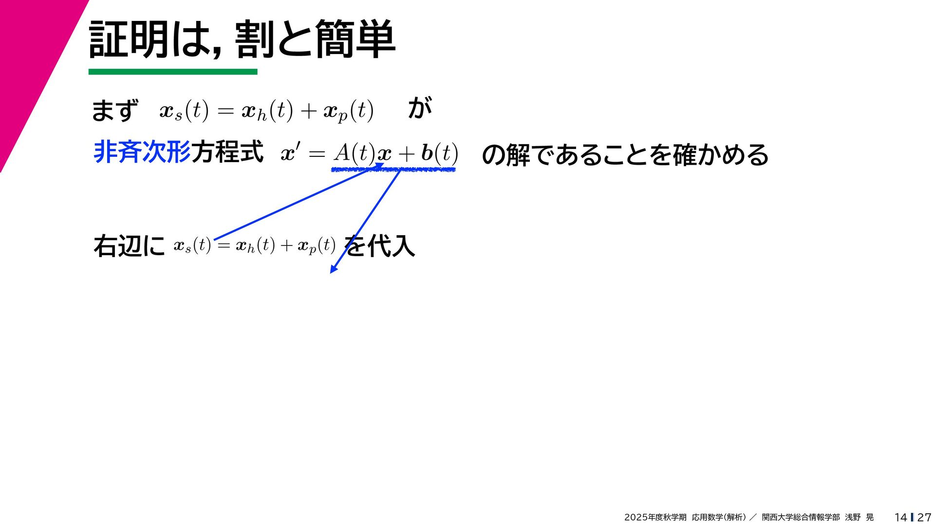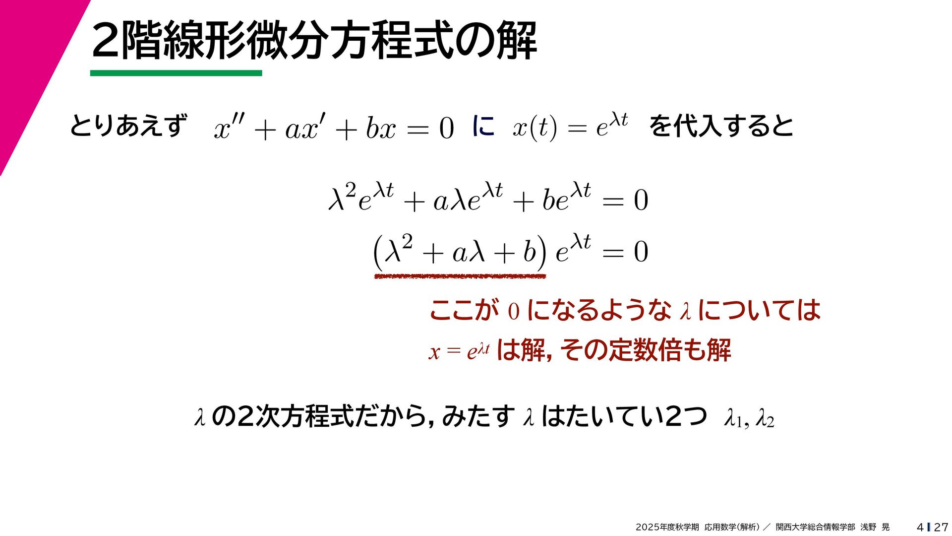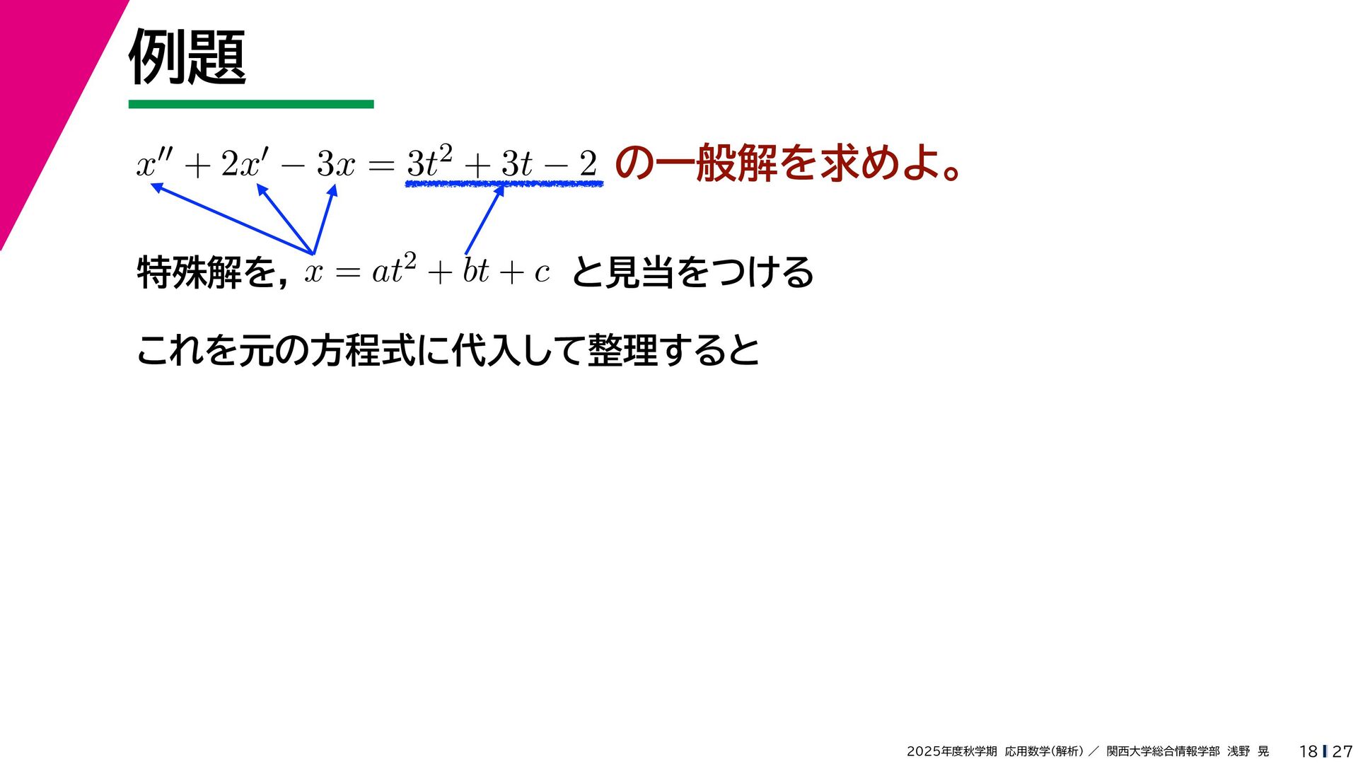 A cos 2t , なので, を元の方程式に代入すると x′ = − 2A sin 2t x′ ′ = − 4A cos 2t x′ , x′ ′ これが t に関係なくなりたつから, A = − 1 3 x′′ + x = cos 2t このように「勘」をはたらかせる −4A cos 2t + A cos 2t = cos 2t (−4A + A − 1)cos 2t = 0