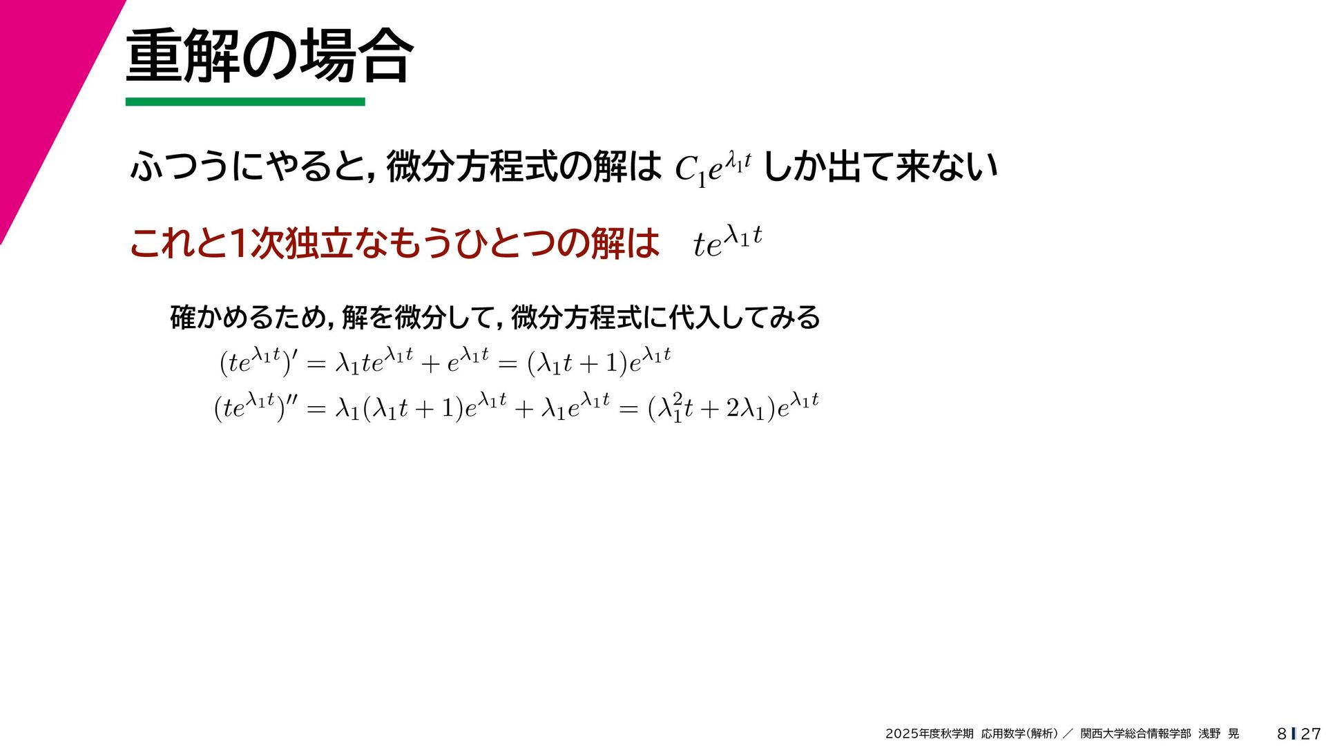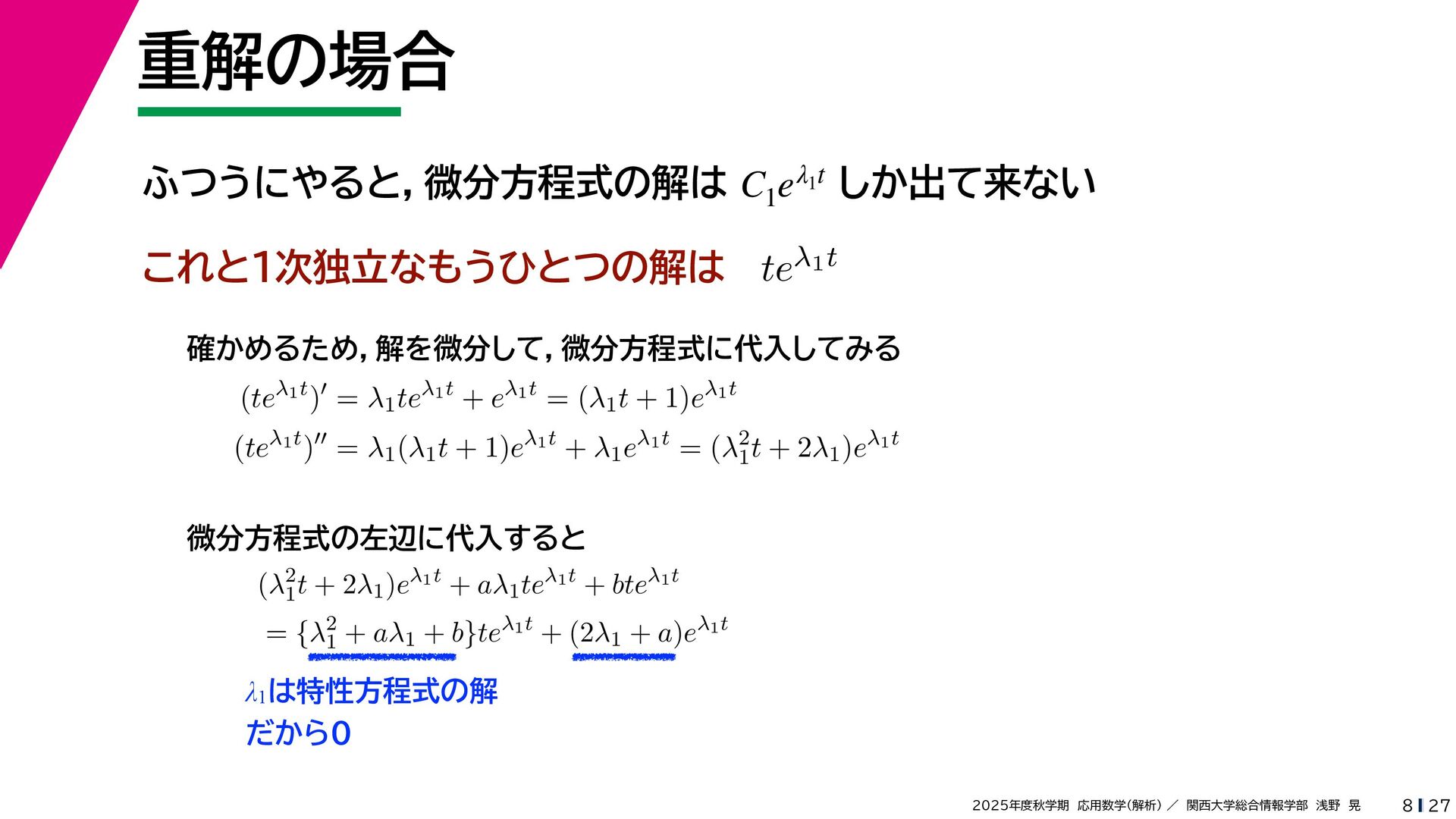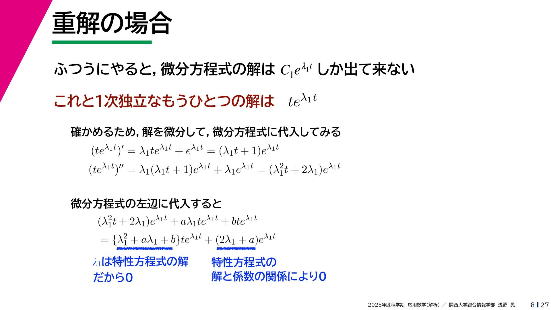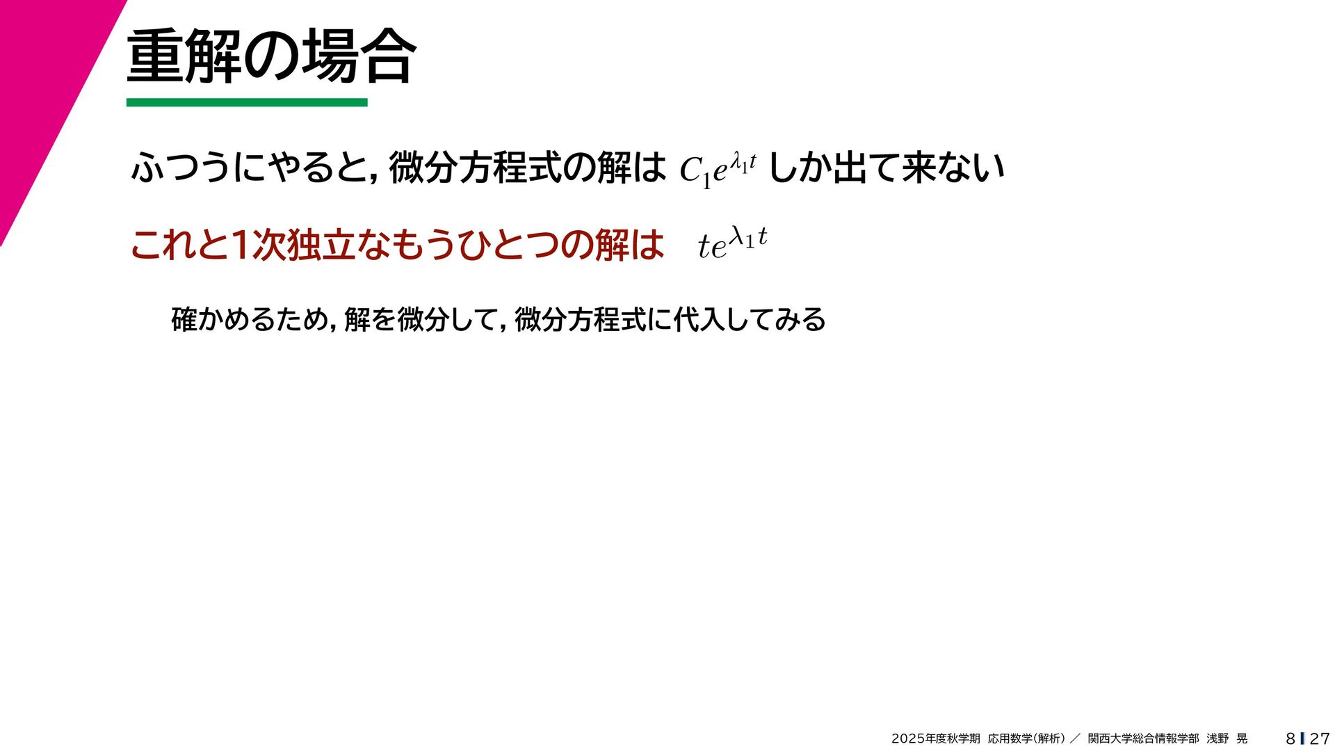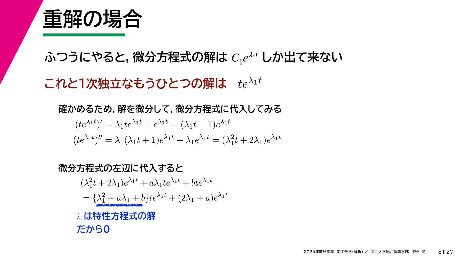 A cos 2t , なので, を元の方程式に代入すると x′ = − 2A sin 2t x′ ′ = − 4A cos 2t x′ , x′ ′ これが t に関係なくなりたつから, A = − 1 3 x′′ + x = cos 2t このように「勘」をはたらかせる −4A cos 2t + A cos 2t = cos 2t (−4A + A − 1)cos 2t = 0