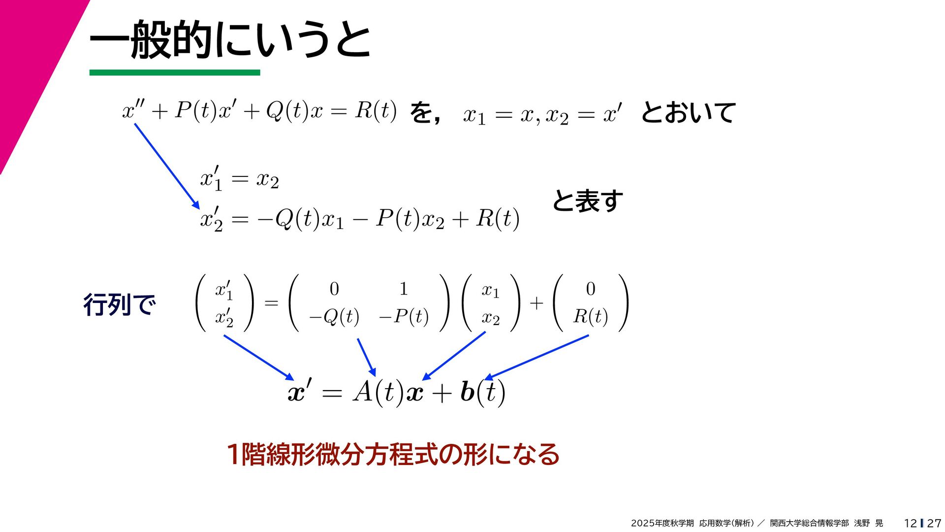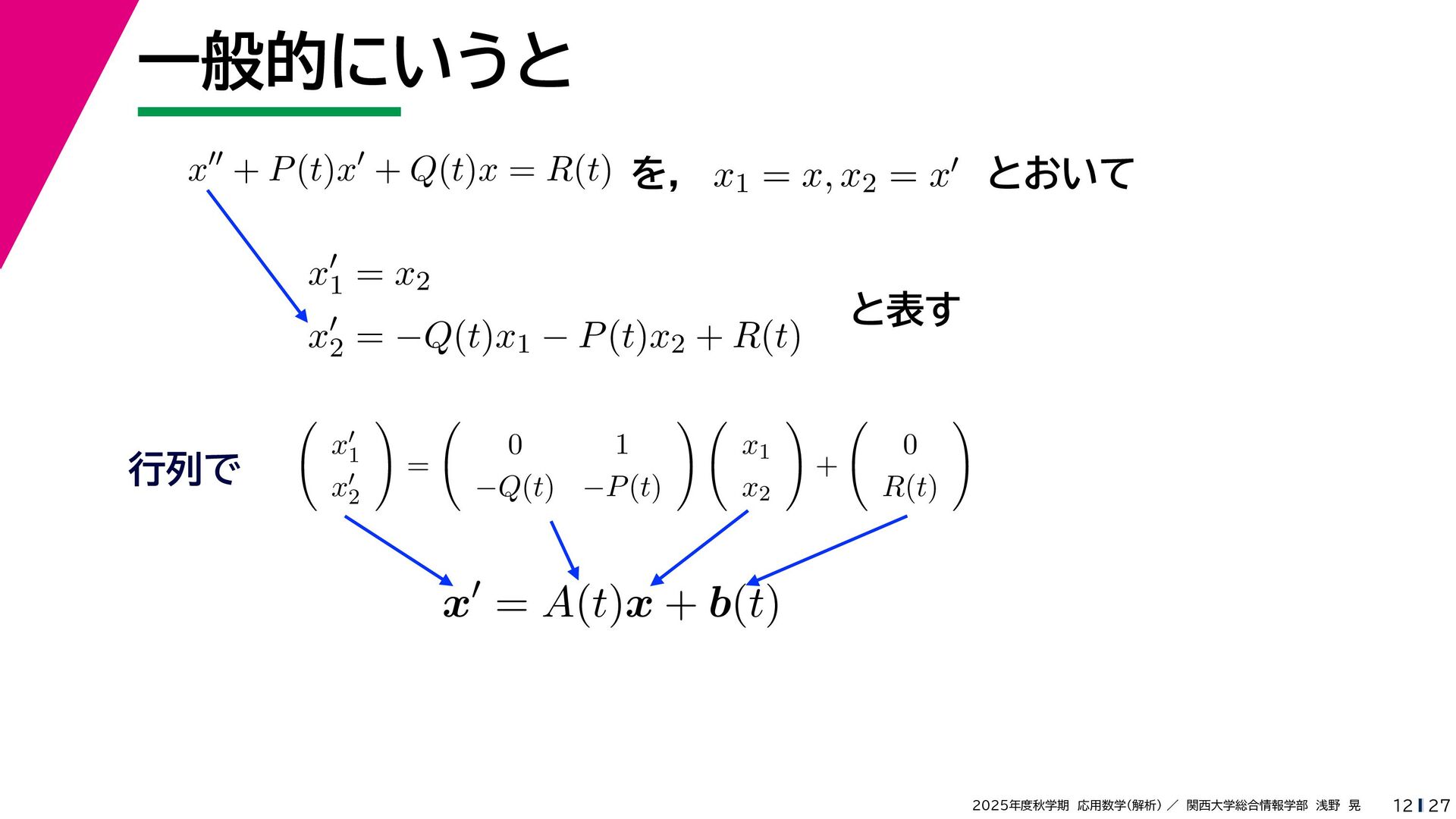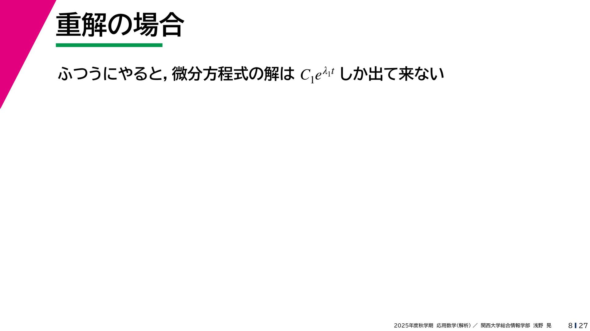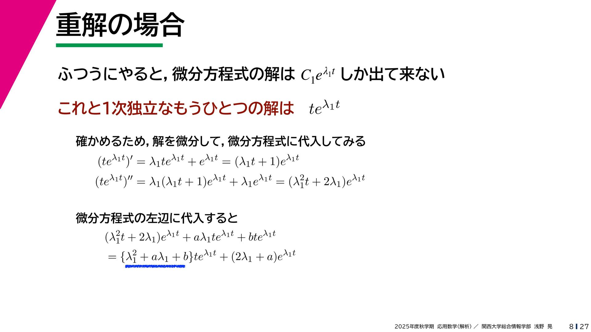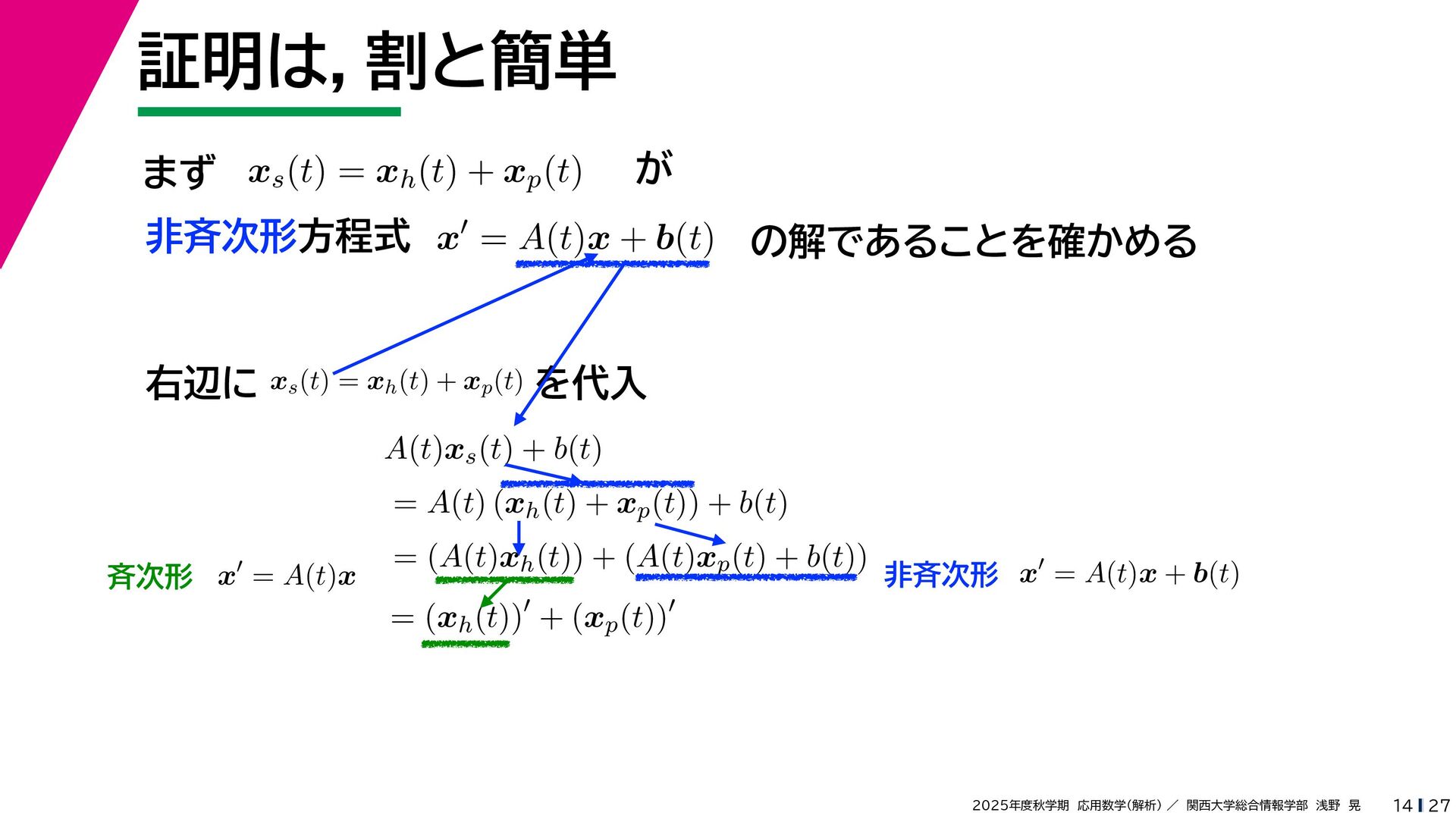 A cos 2t , なので, を元の方程式に代入すると x′ = − 2A sin 2t x′ ′ = − 4A cos 2t x′ , x′ ′ これが t に関係なくなりたつから, A = − 1 3 x′′ + x = cos 2t このように「勘」をはたらかせる −4A cos 2t + A cos 2t = cos 2t (−4A + A − 1)cos 2t = 0