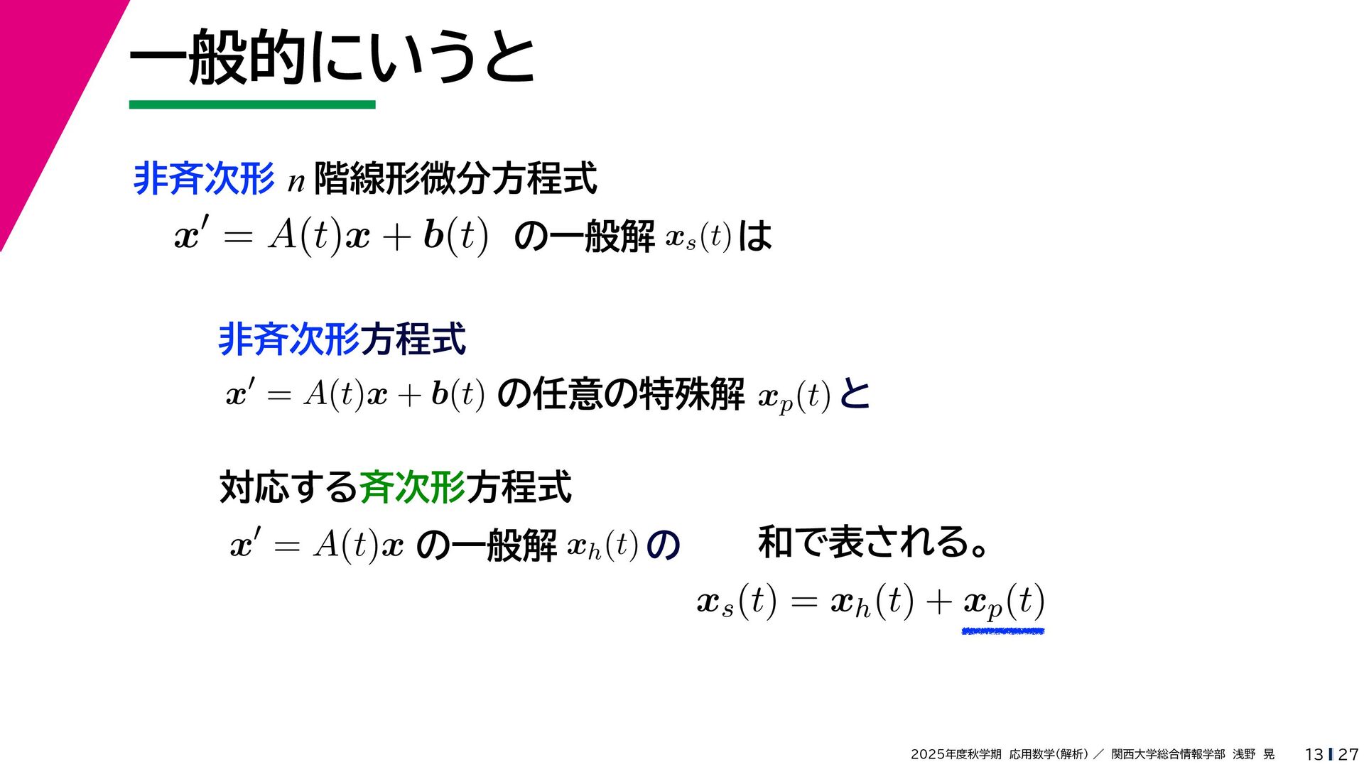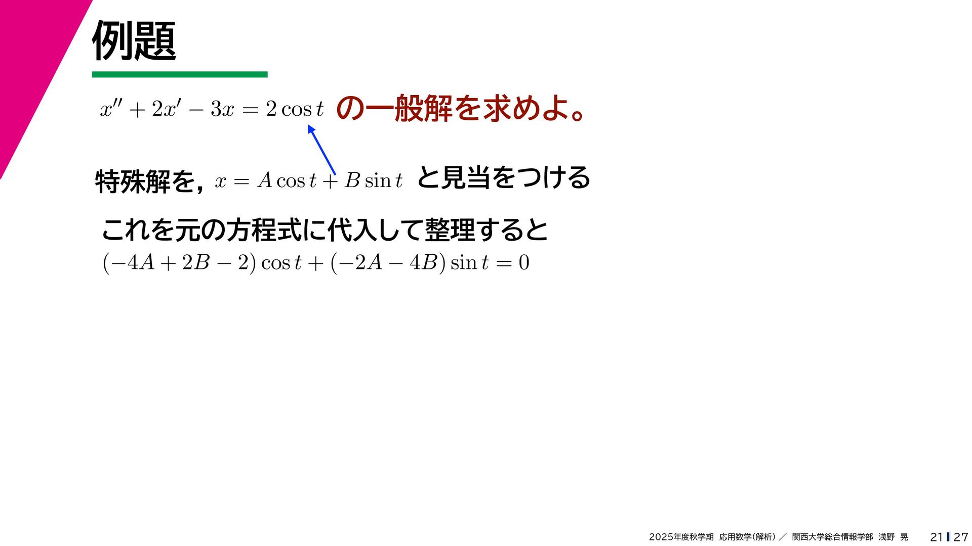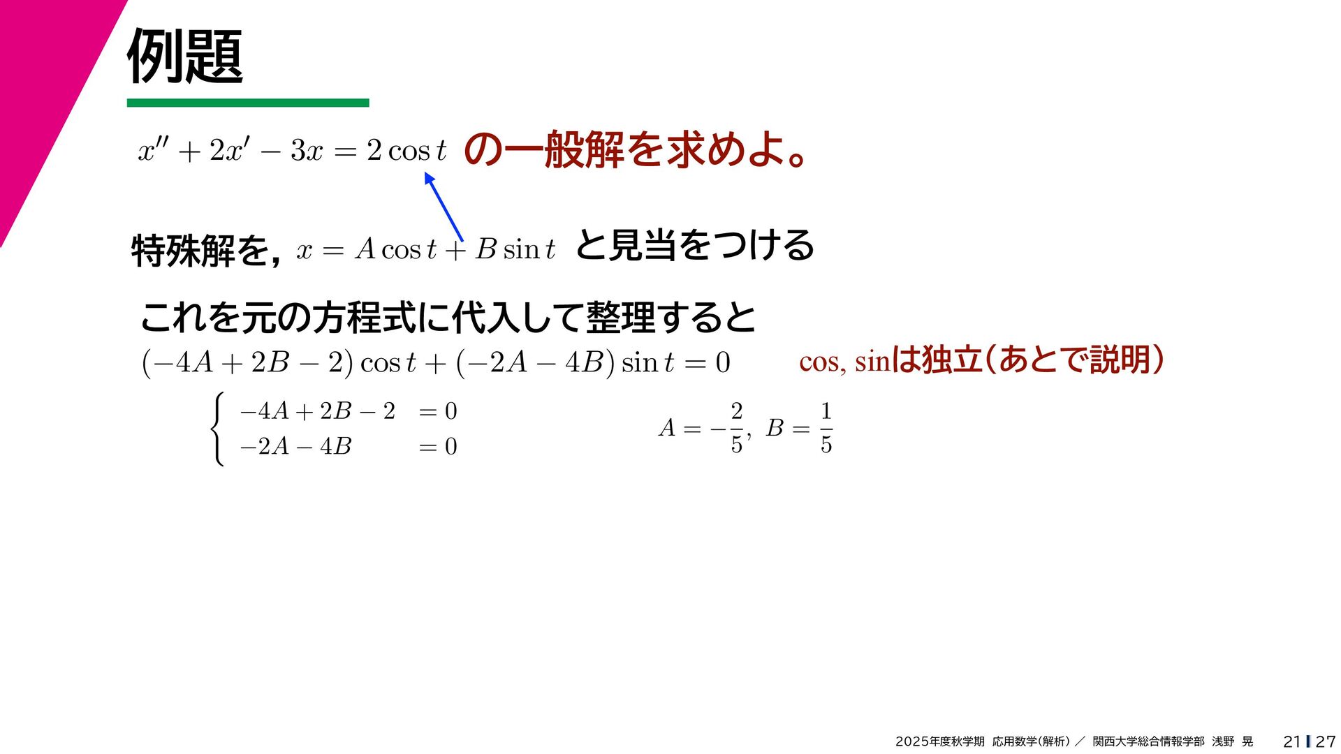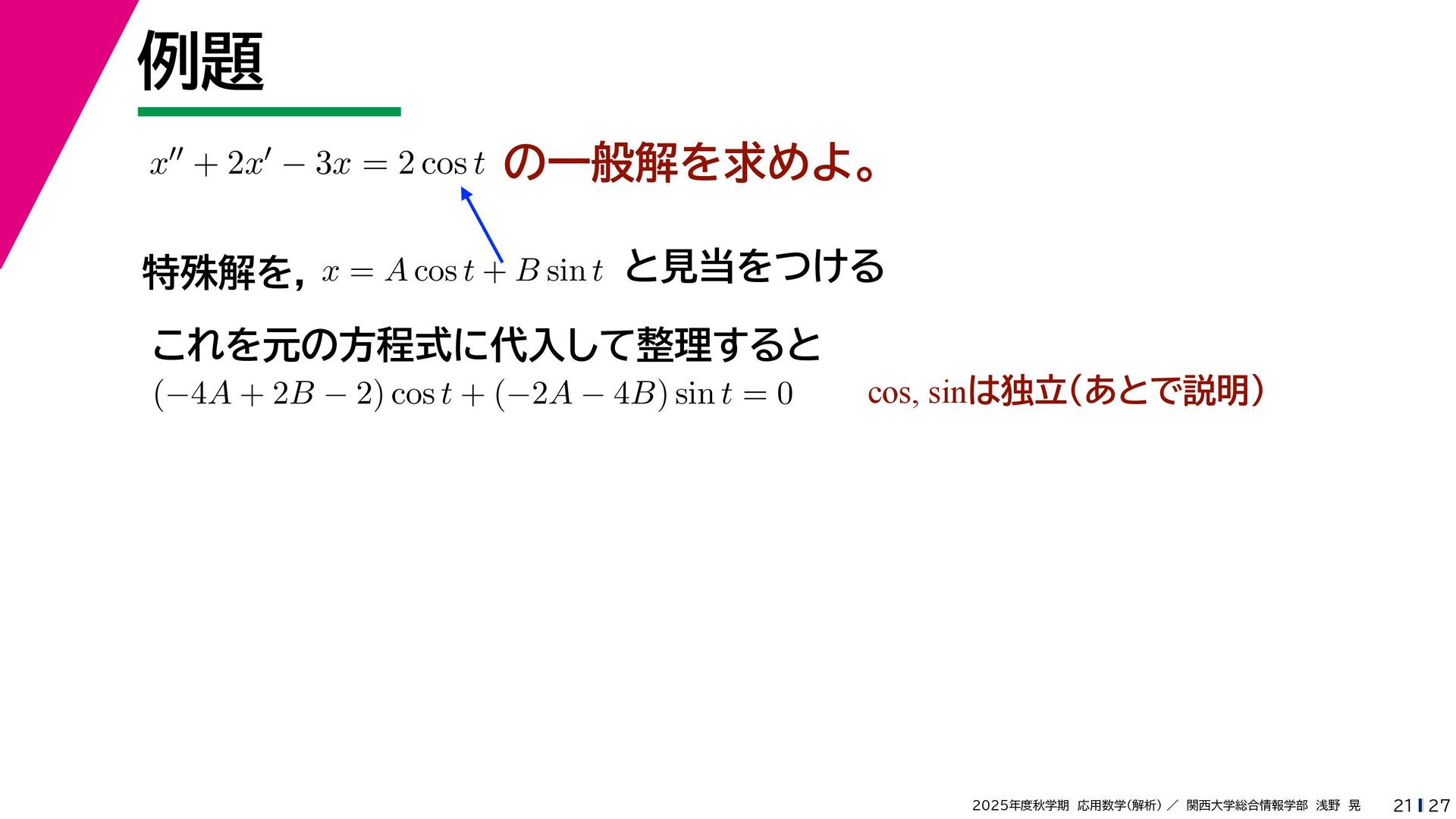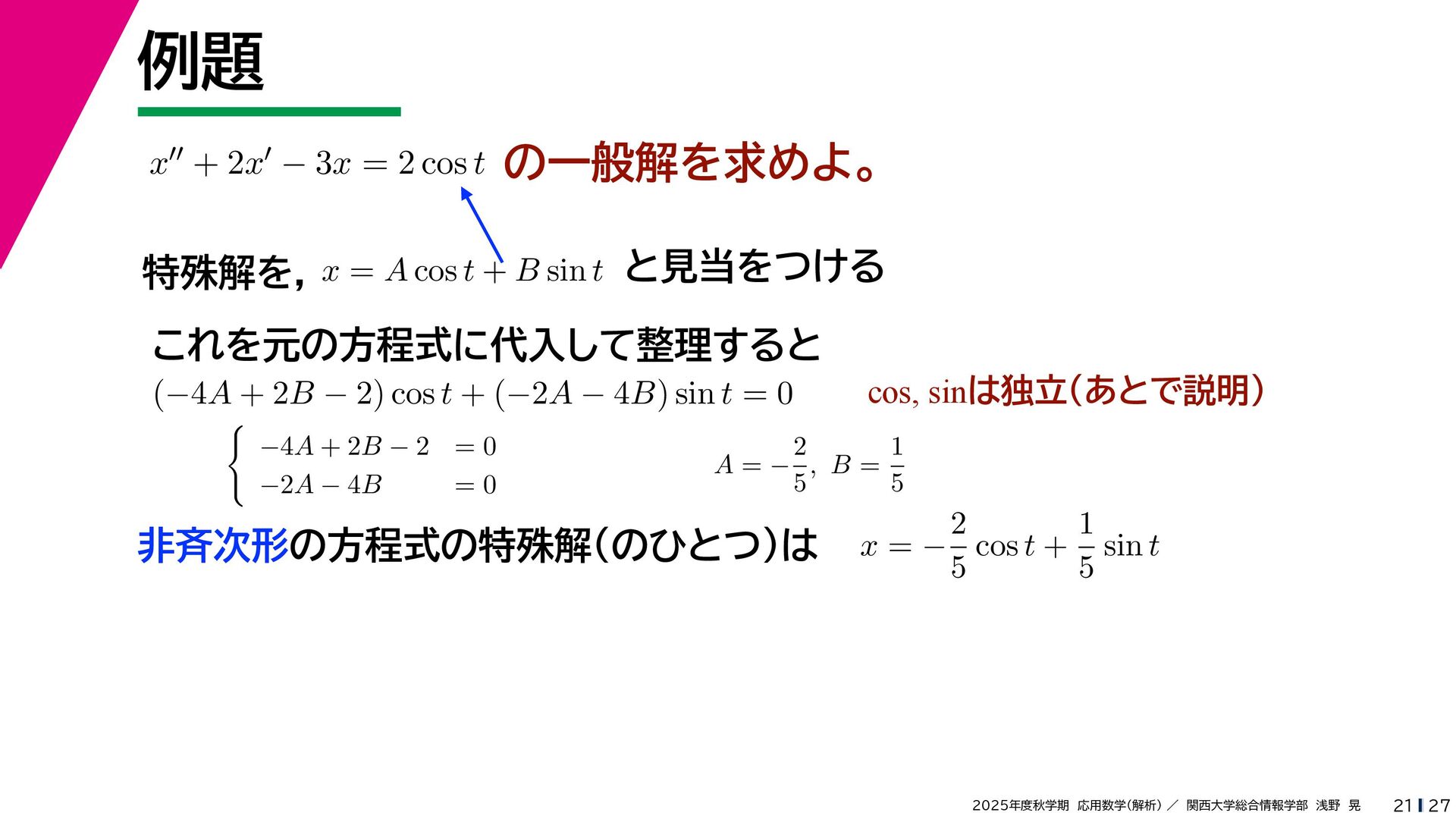 3x = 2 cos t 特殊解を, と見当をつける x = A cos t + B sin t これを元の方程式に代入して整理すると (−4A + 2B − 2) cos t + (−2A − 4B) sin t = 0 cos, sinは独立(あとで説明) −4A + 2B − 2 = 0 −2A − 4B = 0 A = − 2 5 , B = 1 5 非斉次形の方程式の特殊解(のひとつ)は x = − 2 5 cos t + 1 5 sin t