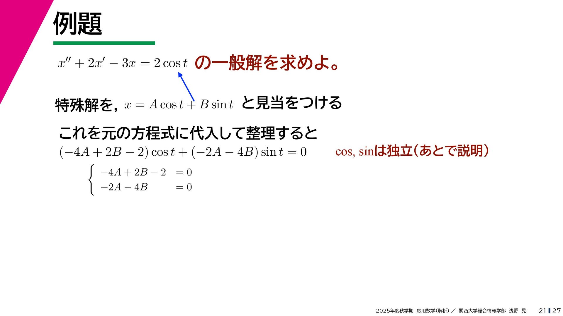 3x = 2 cos t 特殊解を, と見当をつける x = A cos t + B sin t これを元の方程式に代入して整理すると (−4A + 2B − 2) cos t + (−2A − 4B) sin t = 0 cos, sinは独立(あとで説明) −4A + 2B − 2 = 0 −2A − 4B = 0