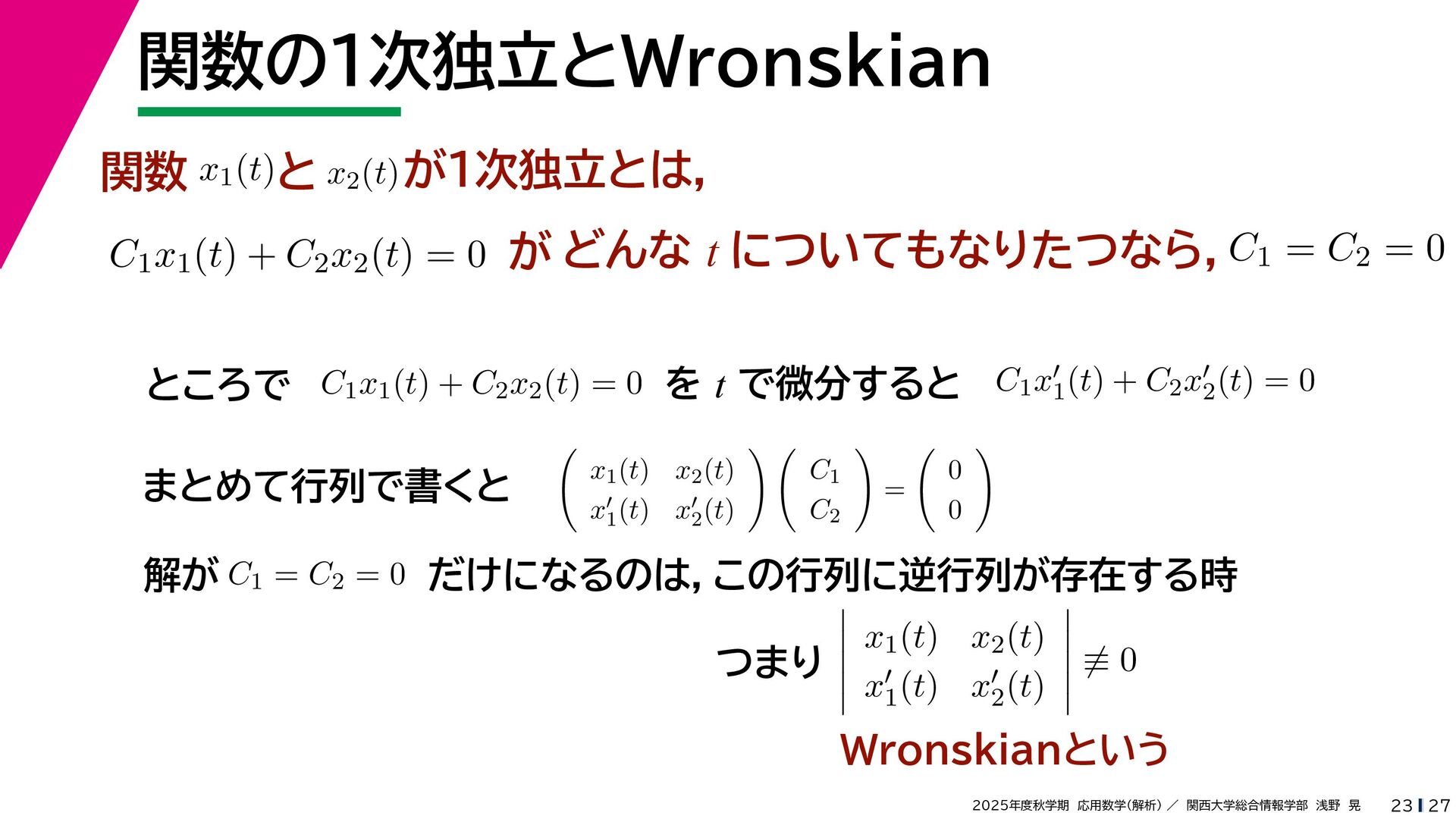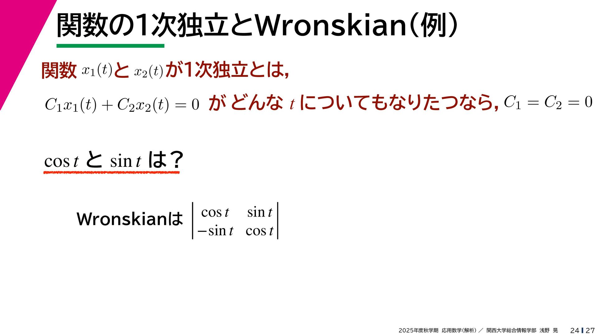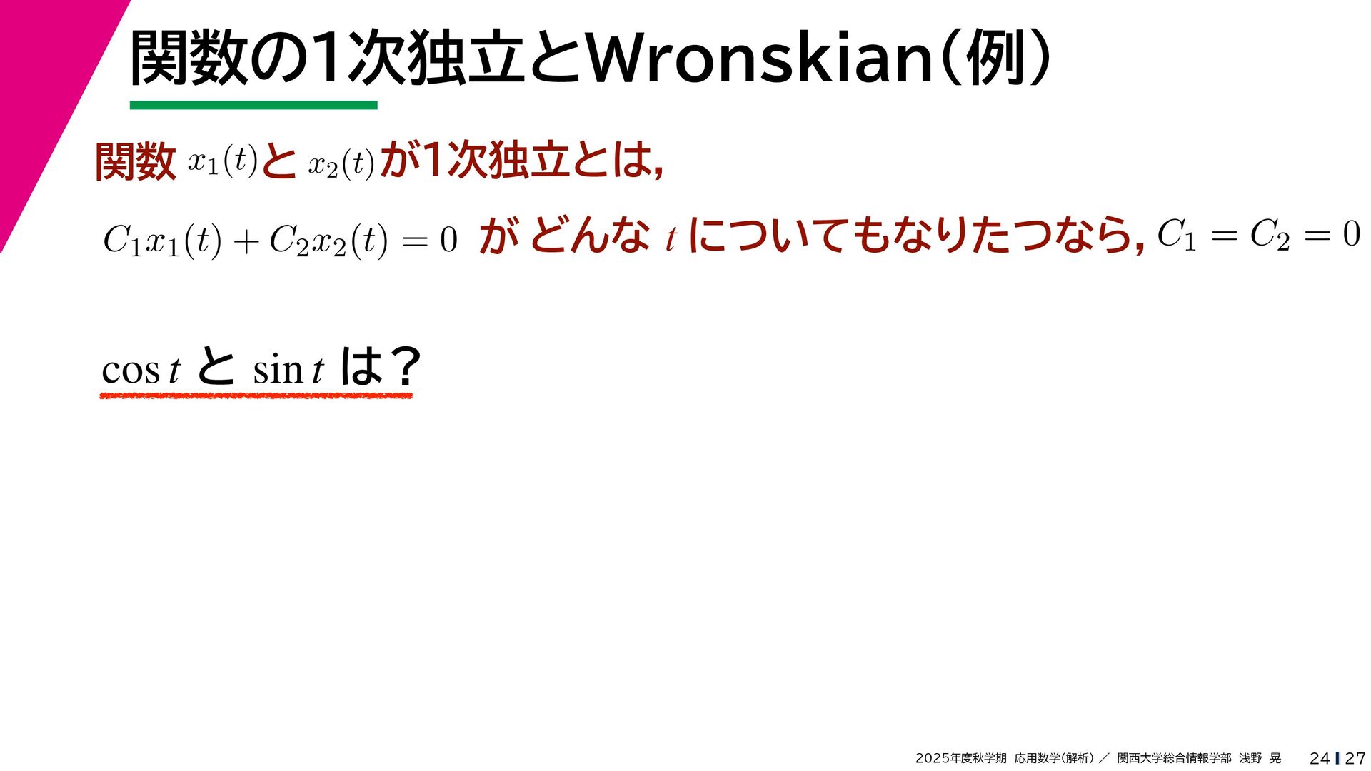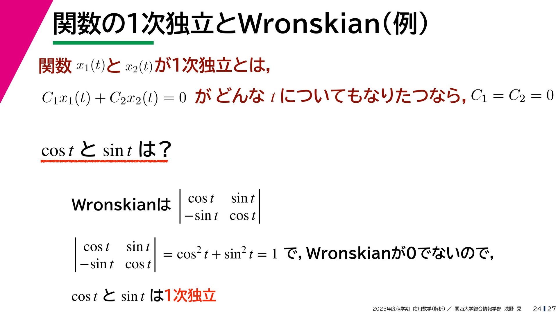 x2(t) が1次独立とは, C1x1(t) + C2x2(t) = 0 が どんな t についてもなりたつなら,C1 = C2 = 0 と は? cos t sin t Wronskianは cos t sin t −sin t cos t で,Wronskianが0でないので, と は1次独立 cos t sin t −sin t cos t = cos2 t + sin2 t = 1 cos t sin t