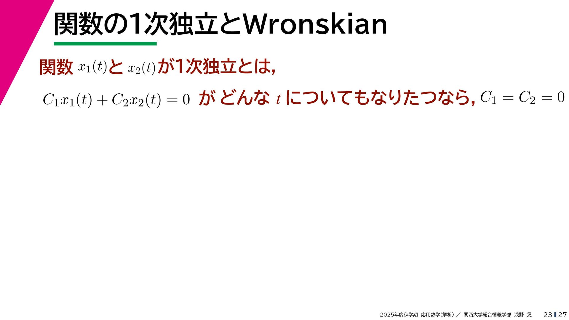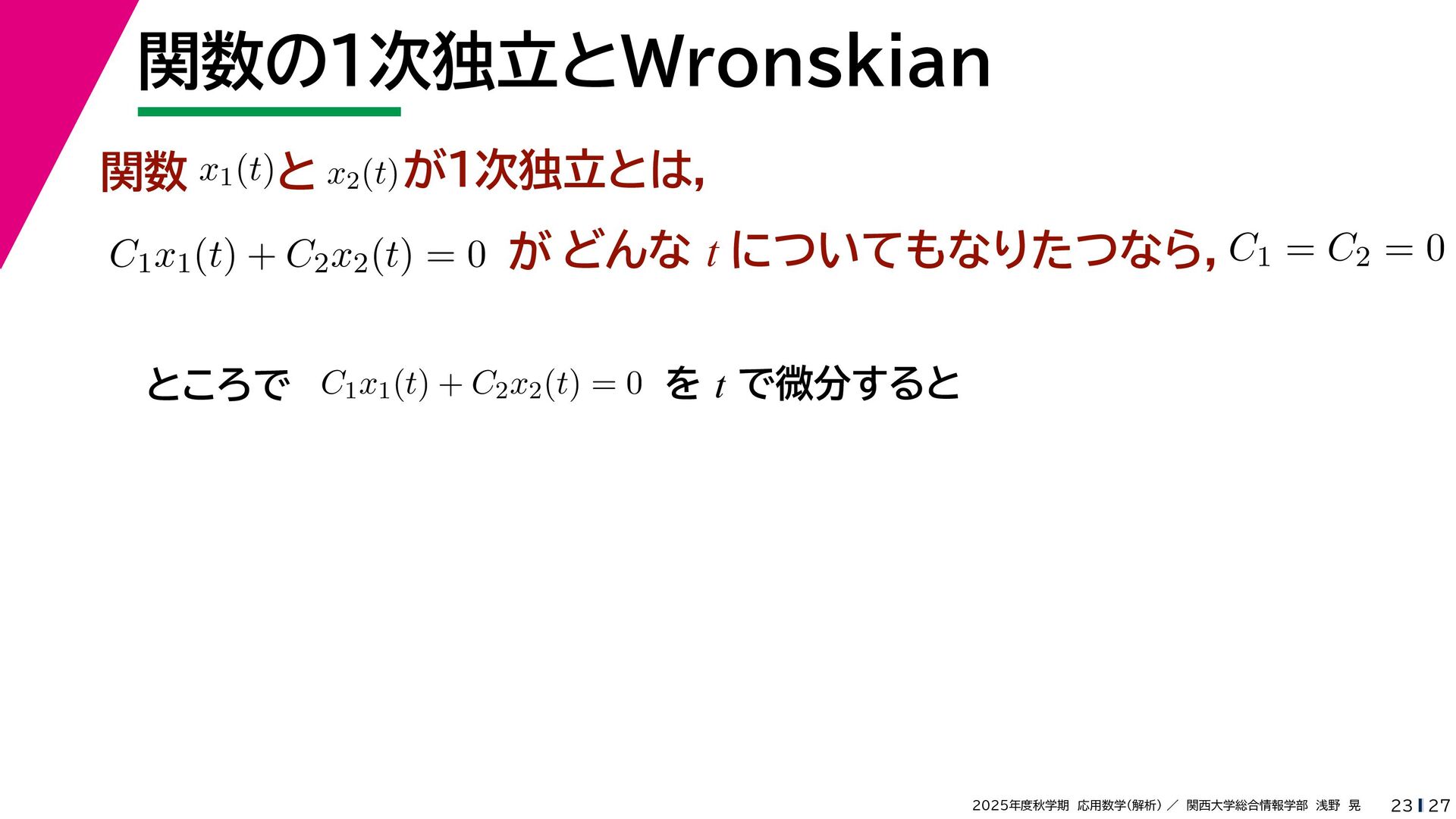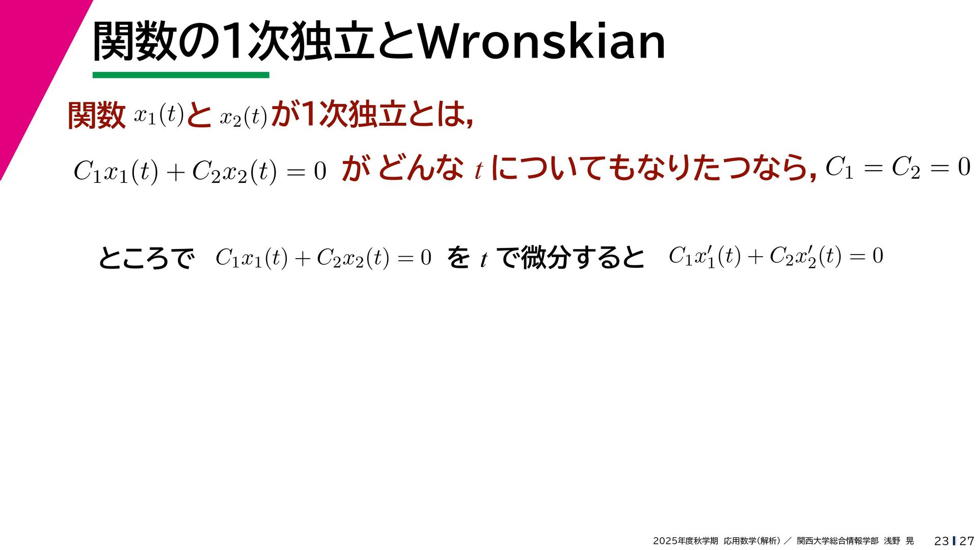 x2(t) が1次独立とは, C1x1(t) + C2x2(t) = 0 が どんな t についてもなりたつなら,C1 = C2 = 0 と は? cos t sin t Wronskianは cos t sin t −sin t cos t で,Wronskianが0でないので, と は1次独立 cos t sin t −sin t cos t = cos2 t + sin2 t = 1 cos t sin t