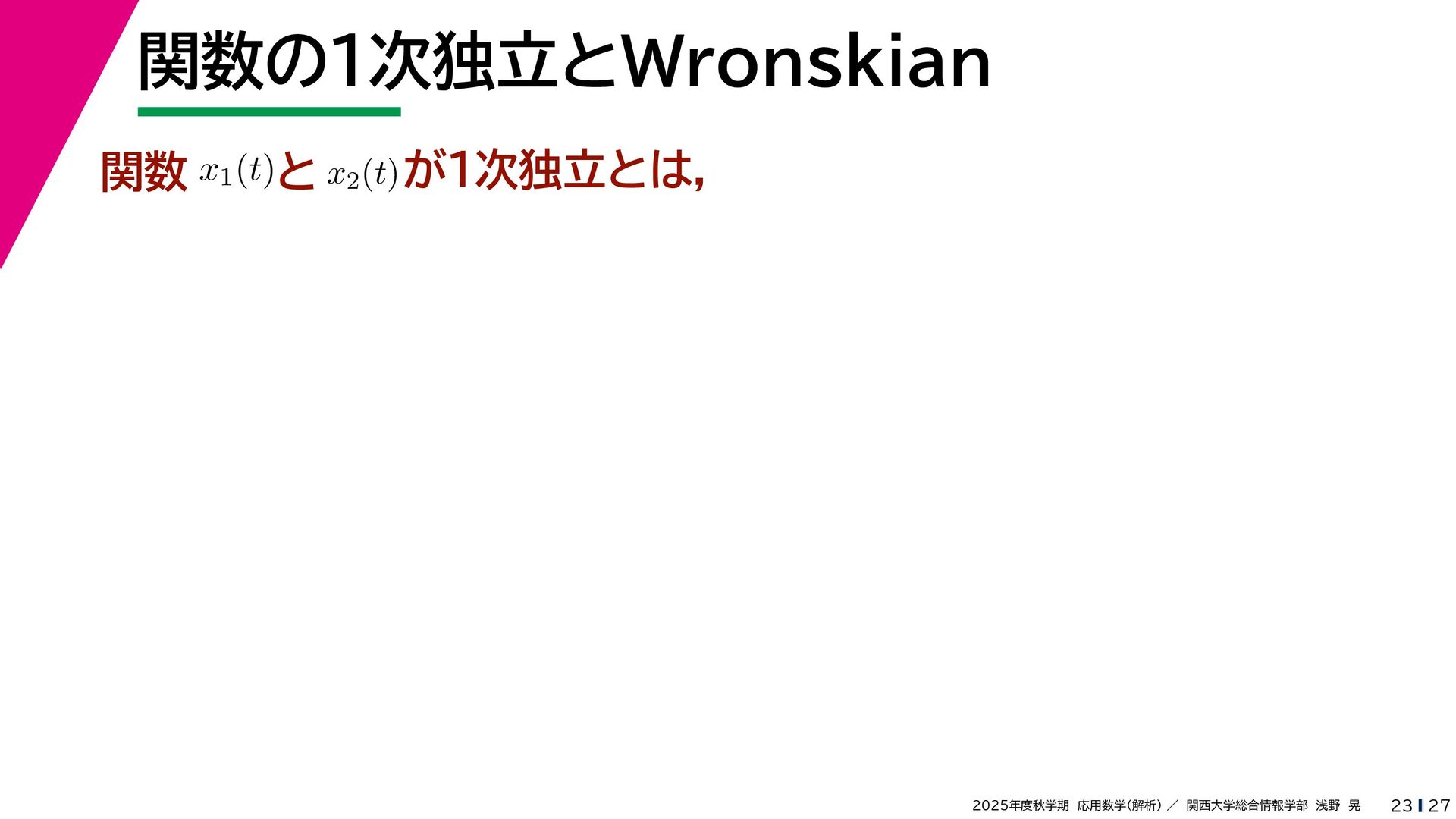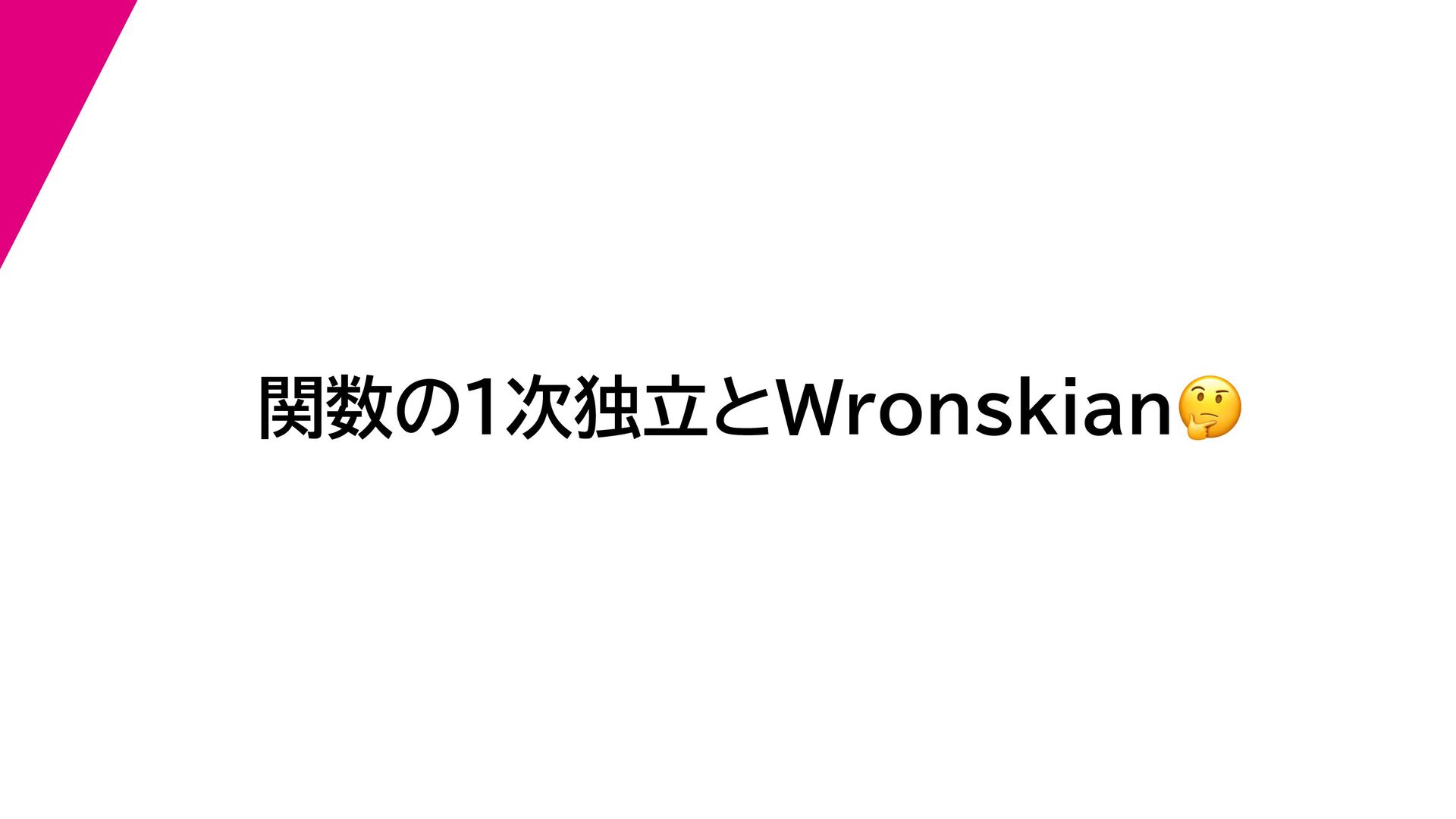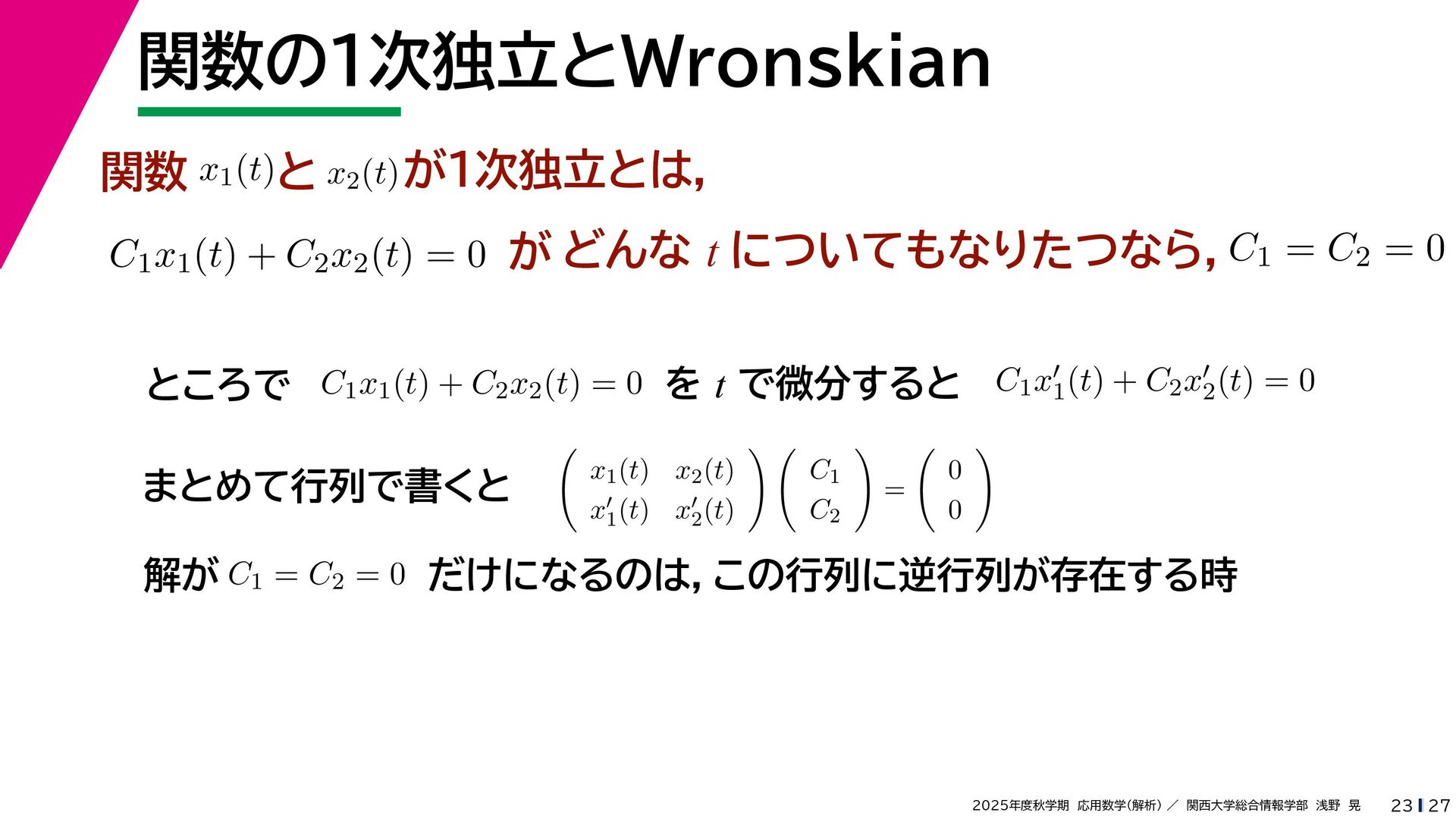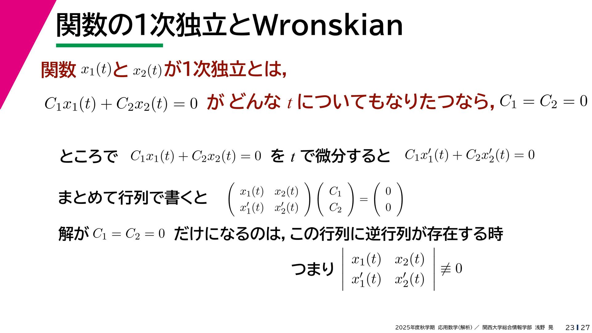 x2(t) が1次独立とは, C1x1(t) + C2x2(t) = 0 が どんな t についてもなりたつなら,C1 = C2 = 0 と は? cos t sin t Wronskianは cos t sin t −sin t cos t で,Wronskianが0でないので, と は1次独立 cos t sin t −sin t cos t = cos2 t + sin2 t = 1 cos t sin t