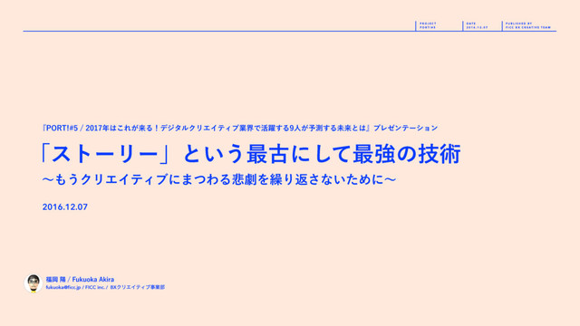 T I V E T E A M P U B L I S H E D B Y P O R T ! # 5 D A T E 2 0 1 6 . 1 2 . 0 7 P R O J E C T fukuoka@ficc.jp / FICC inc. / BXΫϦΤΠςΟϒࣄۀ෦ Ԭཅ'VLVPLB"LJSB ʙ͏ΫϦΤΠςΟϒʹ·ͭΘΔ൵ܶΛ܁Γฦ͞ͳ͍ͨΊʹʙ ʮετʔϦʔʯͱ͍͏࠷ݹʹͯ͠࠷ڧͷٕज़ 2016.12.07 ʰ1035͜Ε͕དྷΔʂσδλϧΫϦΤΠςΟϒۀքͰ׆༂͢Δਓ͕༧ଌ͢ΔະདྷͱʱϓϨθϯςʔγϣϯ