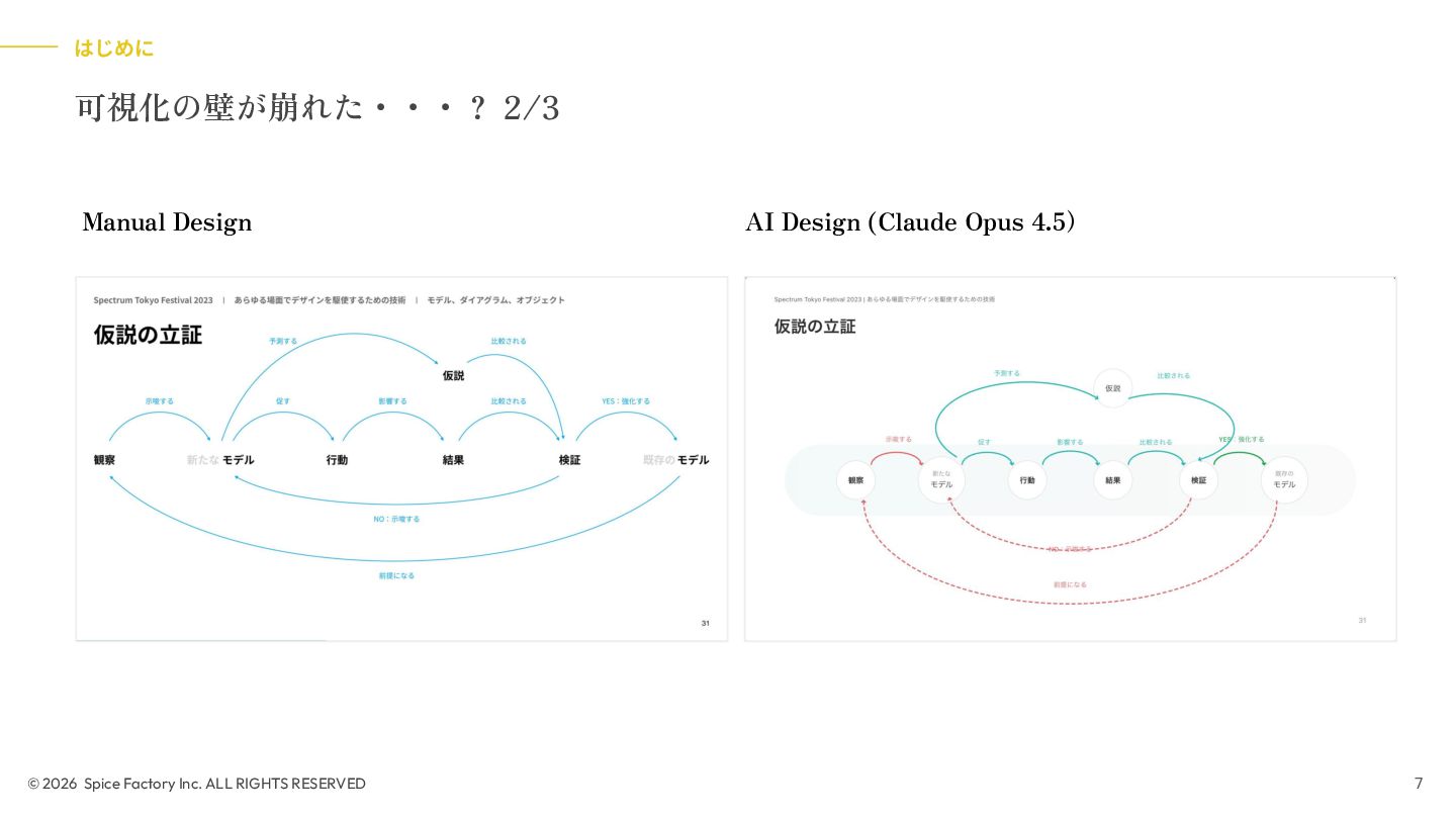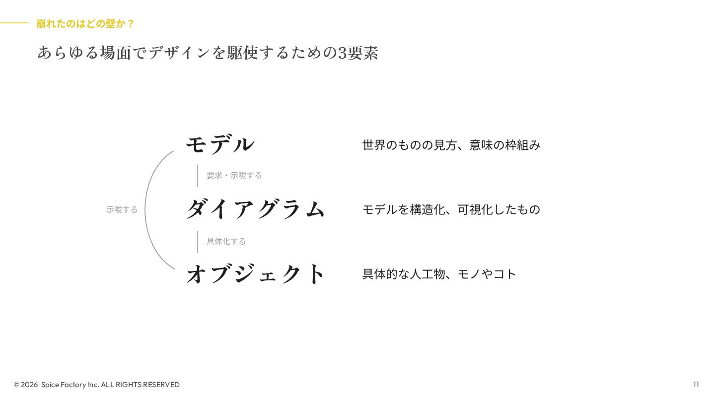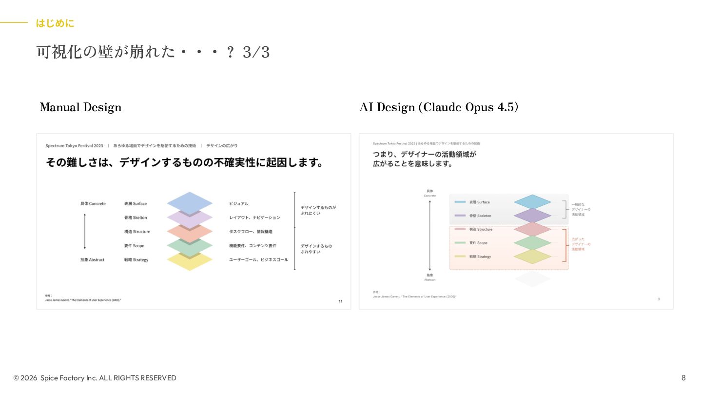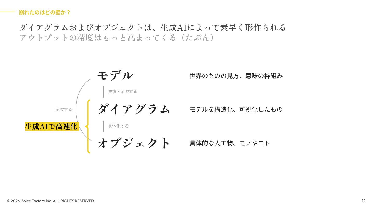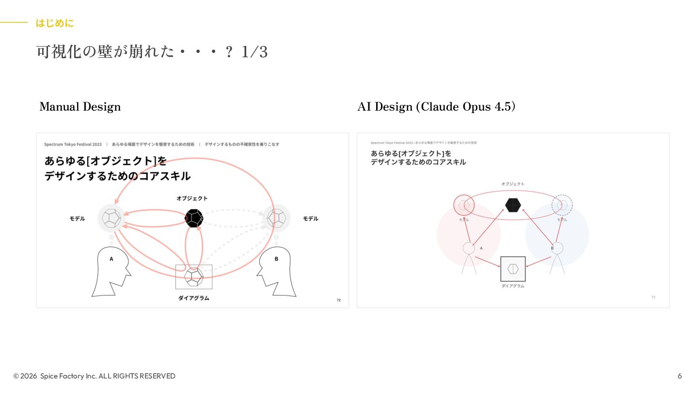 2023年の登壇では、「あらゆる場面でデザインを駆使するための技術」として、デザインを Model/Diagram/Object の連関として捉え直し、専門領域を超えて活用する視座を提示しました。今回の話はその“続編”として、AIが可視化の壁を打ち破る瞬間から始まります。数分でモックが生成される世界で、デザイナーと非デザイナーの間にあったDiagramやObjectを中心とした「可視化」という壁が解体されつつあります。